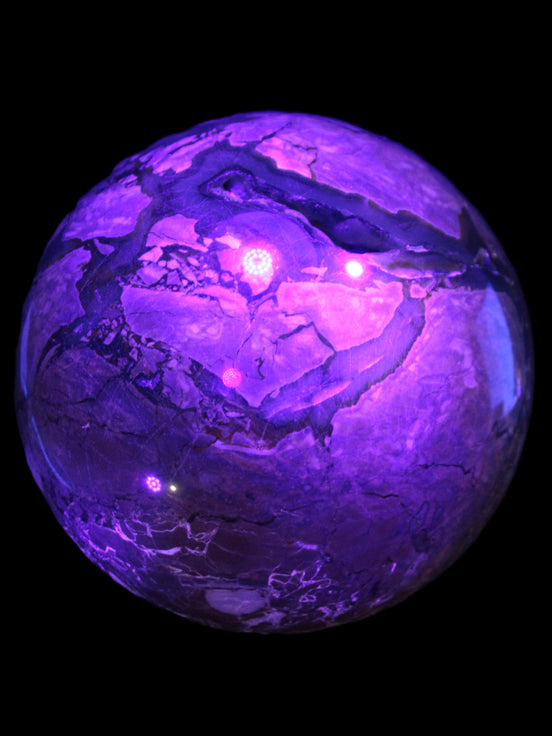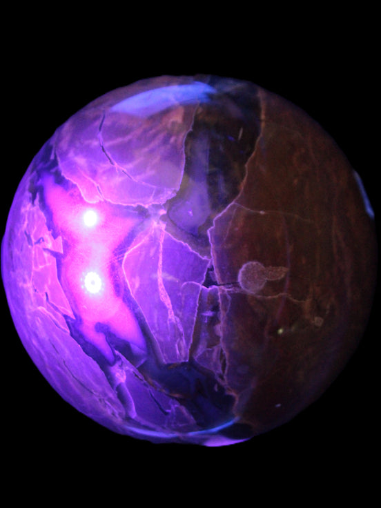 Volcano Agate sphere 119mm 2167g in sunlight - Rocks and Things Store Volcano Agate sphere 119mm 2167g in UV light - Rocks and Things Store