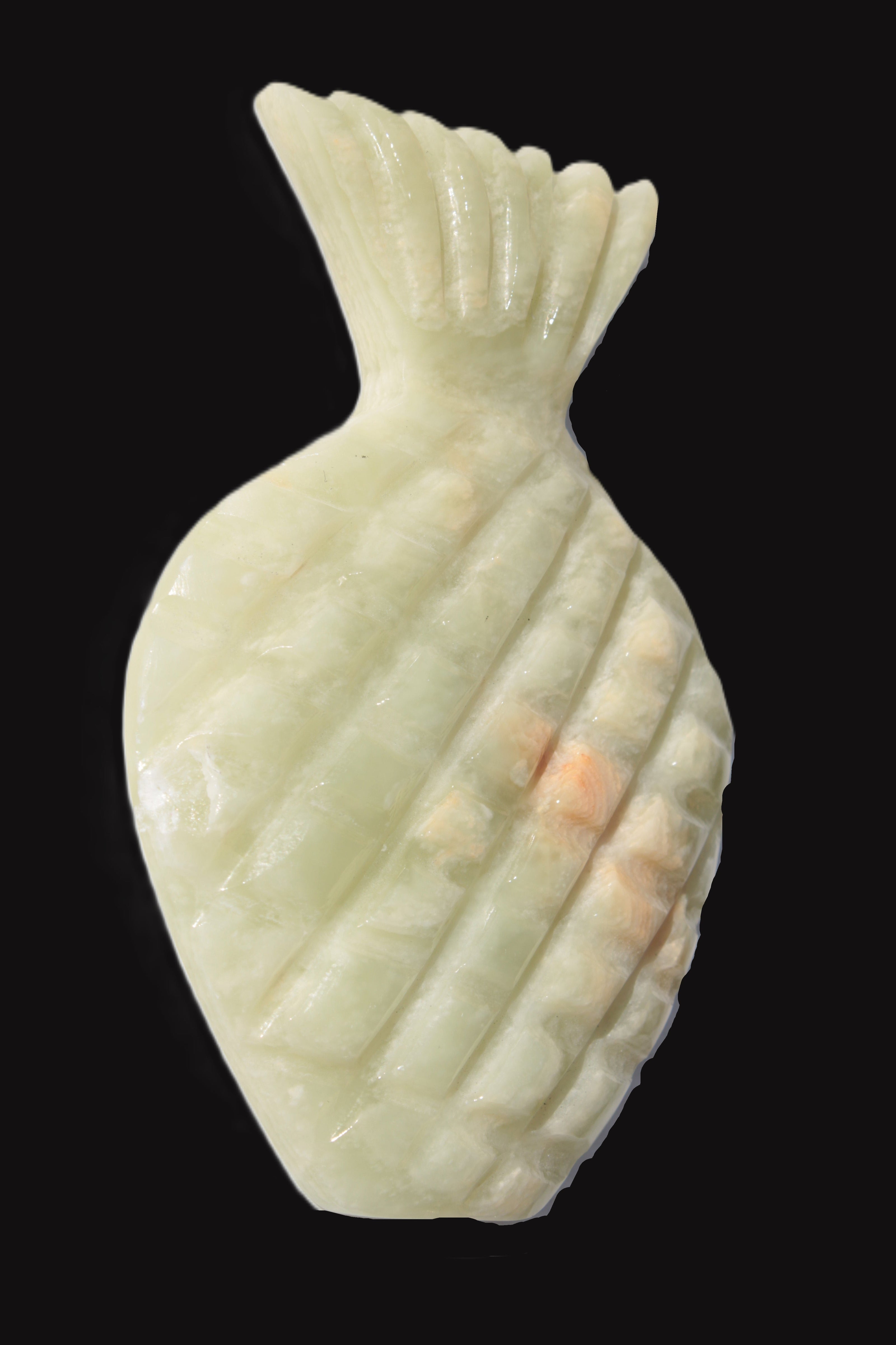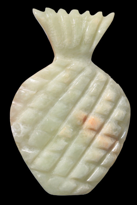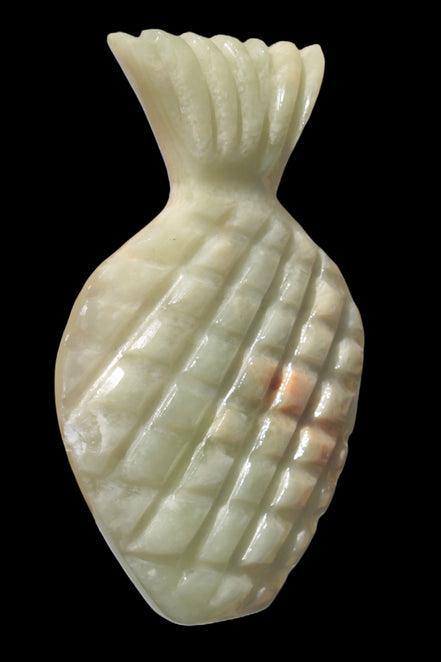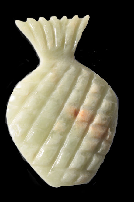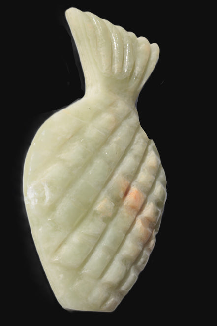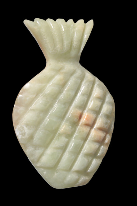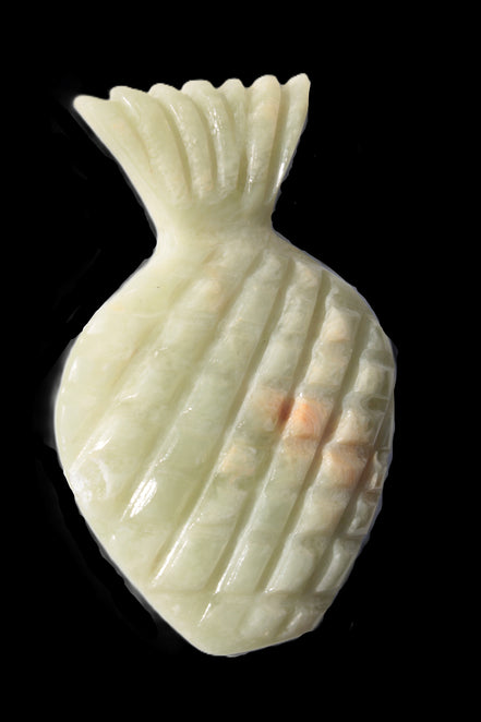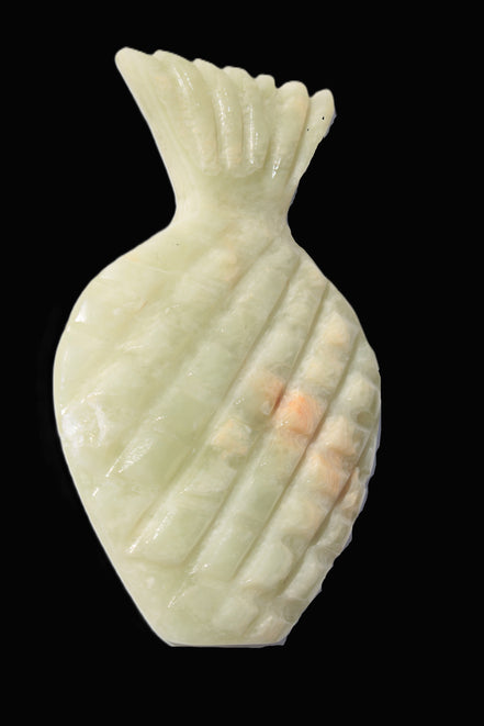 This Afghan Jade hand-carved pineapple was carefully crafted by our partner in Karachi, Lawrence Handicrafts. Afghan Jade is a form of Serpentine (Bowenite) named after the country adjacent to Pakistan where this stone was mined. Serpentine is the name given to a group of magnesium-based asbestos and silicate minerals found in the larger Serpentinite family of minerals. Afghan Jade is translucent to opaque, varying in colour from white, light to dark green and can also occur with yellow, black or pink. Serpentine means ‘snake stone’. It provides powerful healing energy and is linked to our Kundalini energy. When dormant, Kundalini energy lies coiled at the base of the spine. Its release is transformative.