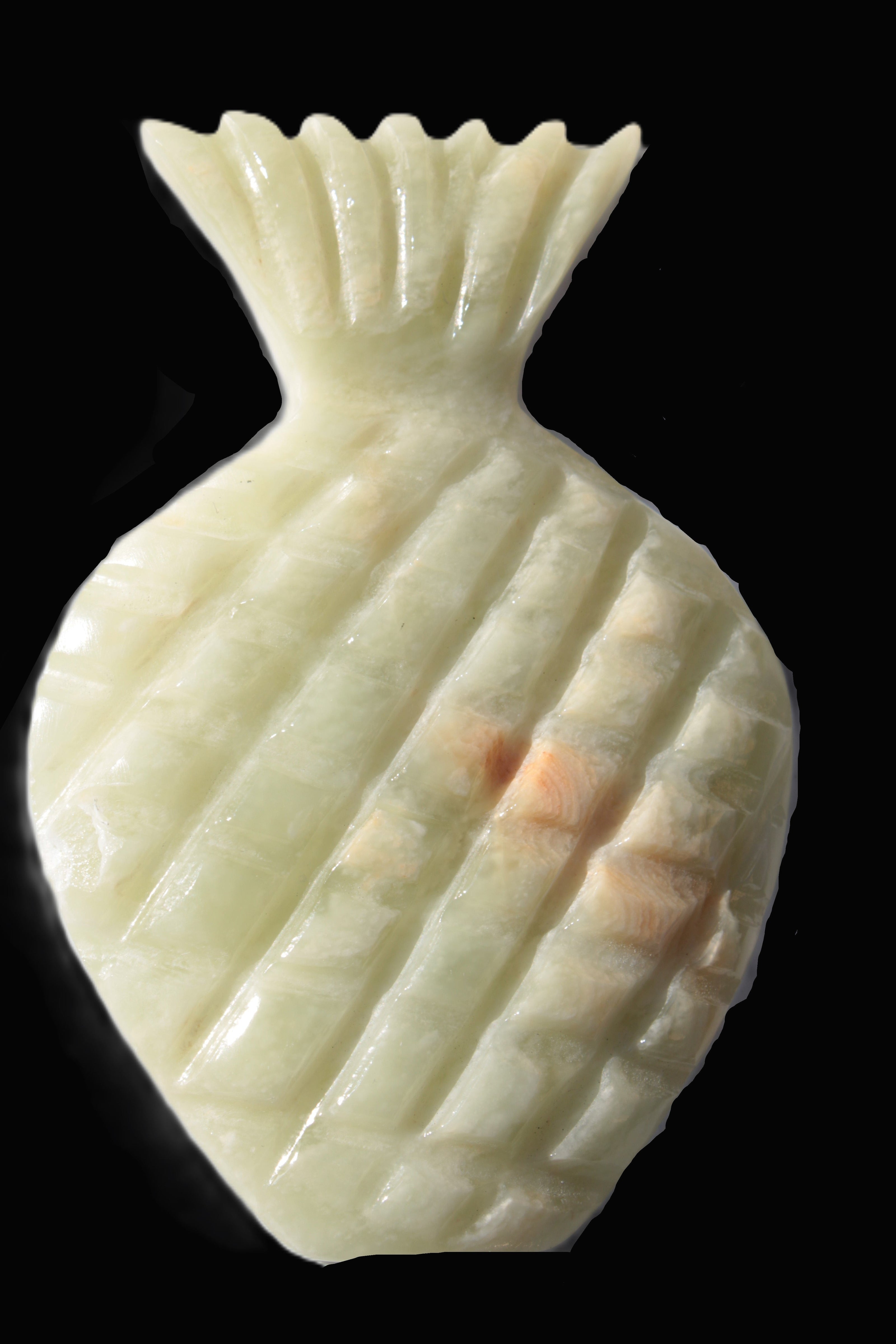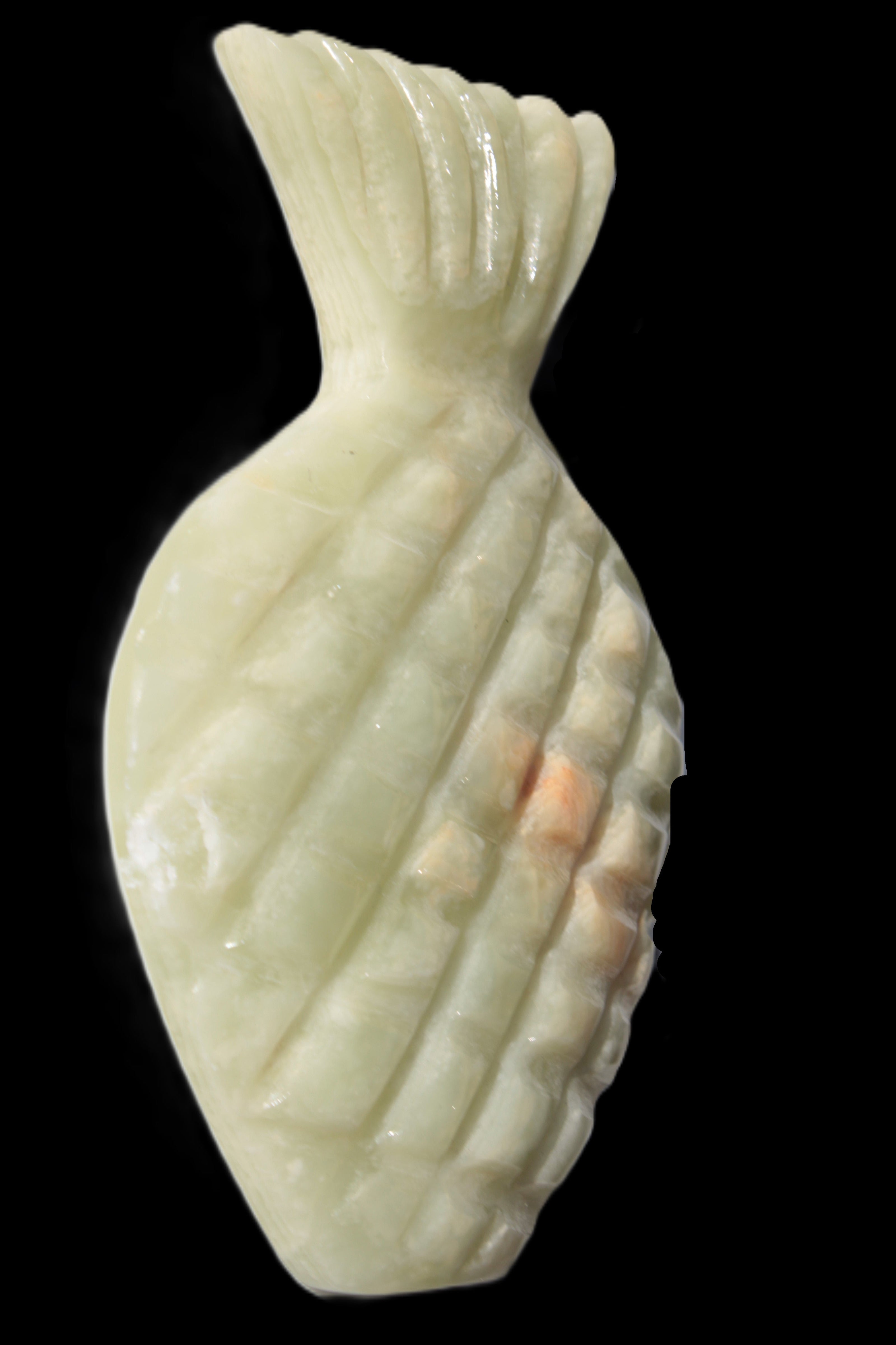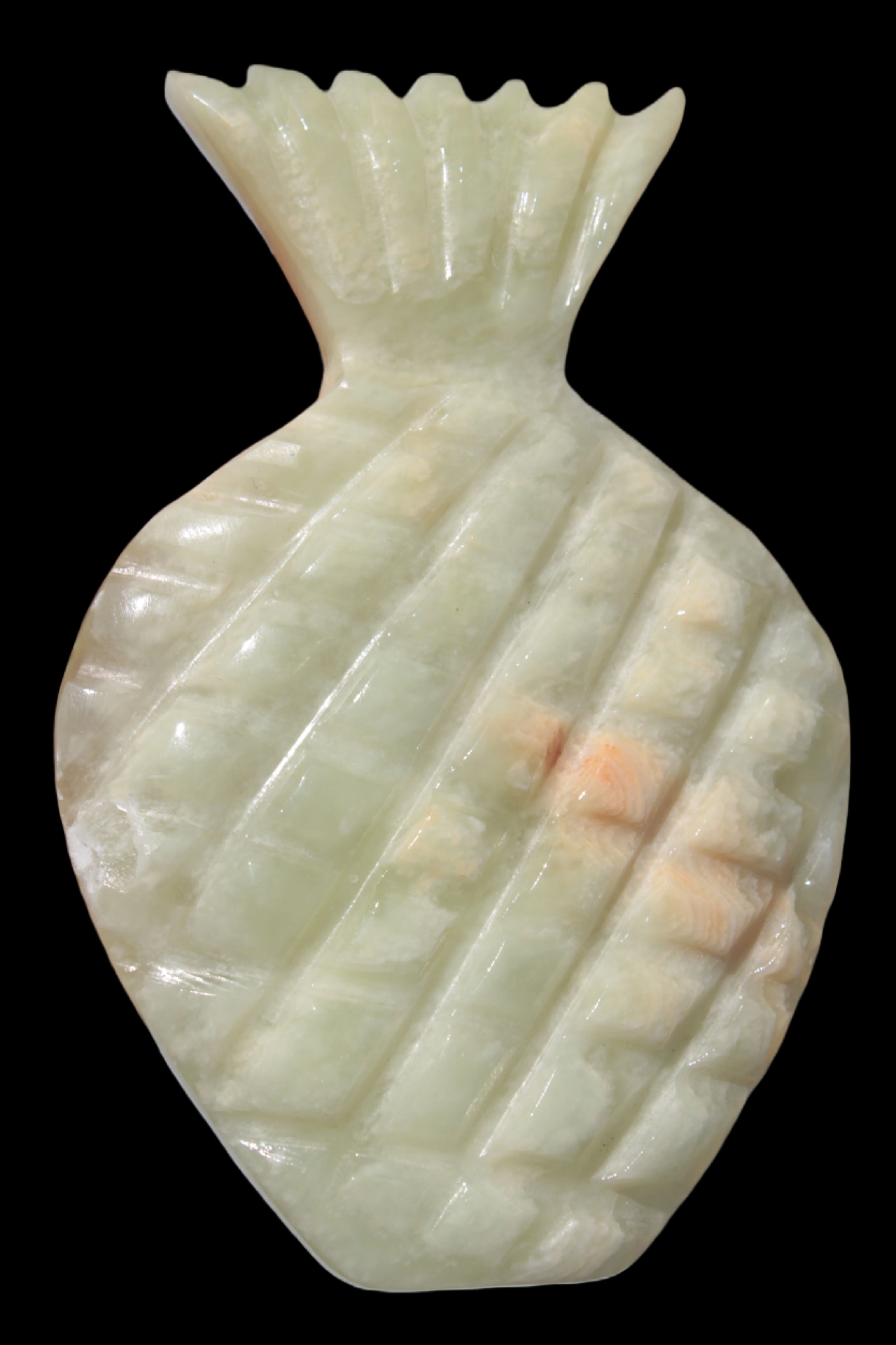 This Afghan Jade hand-carved pineapple was carefully crafted by our partner in Karachi, Lawrence Handicrafts. Afghan Jade is a form of Serpentine (Bowenite) named after the country adjacent to Pakistan where this stone was mined. Serpentine is the name given to a group of magnesium-based asbestos and silicate minerals found in the larger Serpentinite family of minerals. Afghan Jade is translucent to opaque, varying in colour from white, light to dark green and can also occur with yellow, black or pink. Serpentine means ‘snake stone’. It provides powerful healing energy and is linked to our Kundalini energy. When dormant, Kundalini energy lies coiled at the base of the spine. Its release is transformative.
