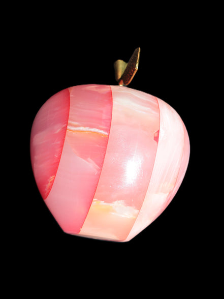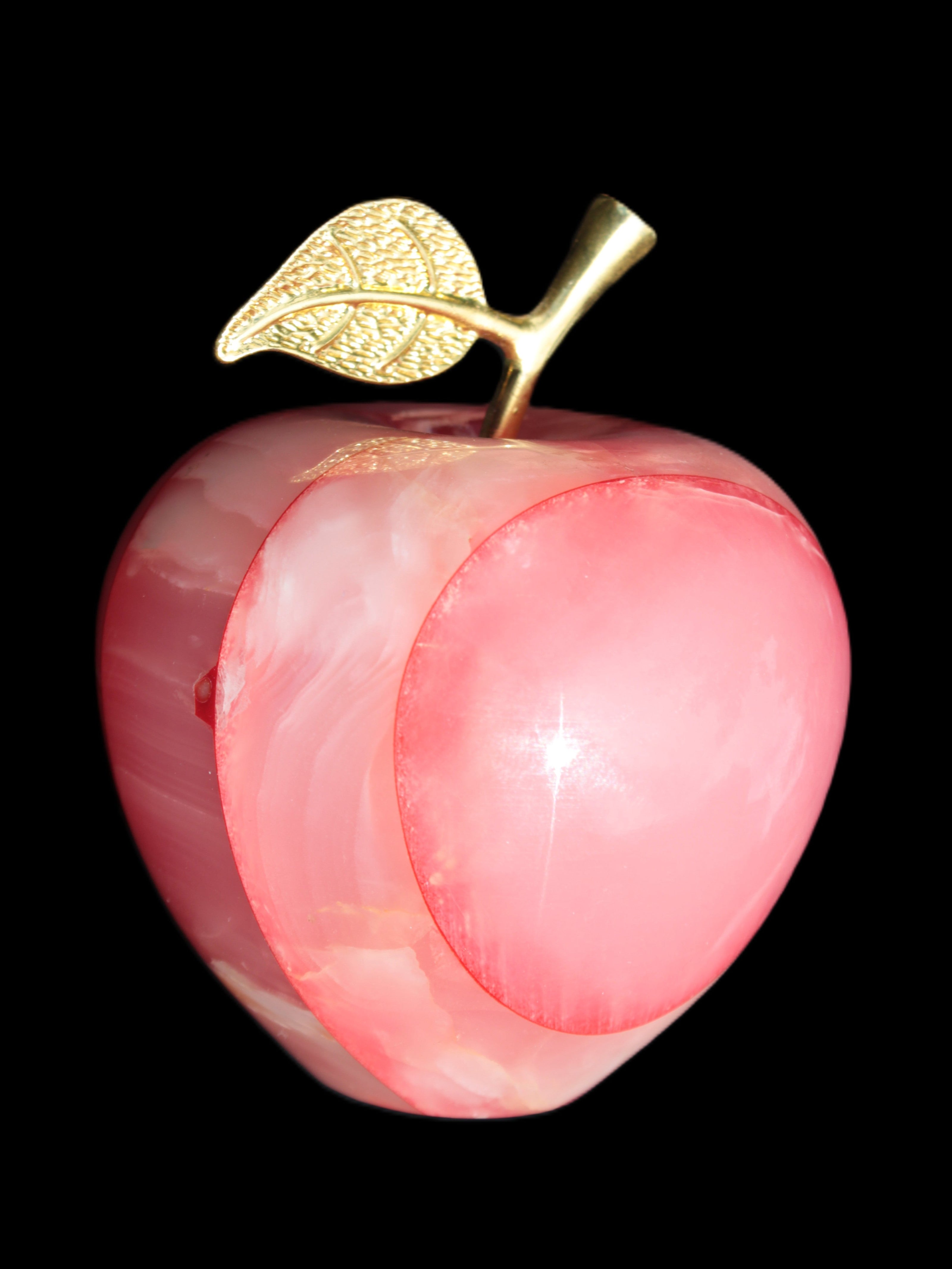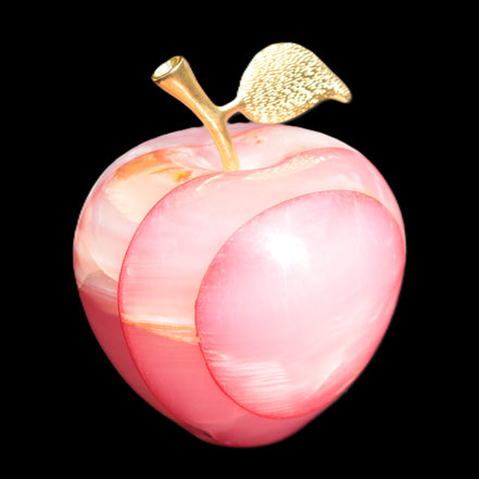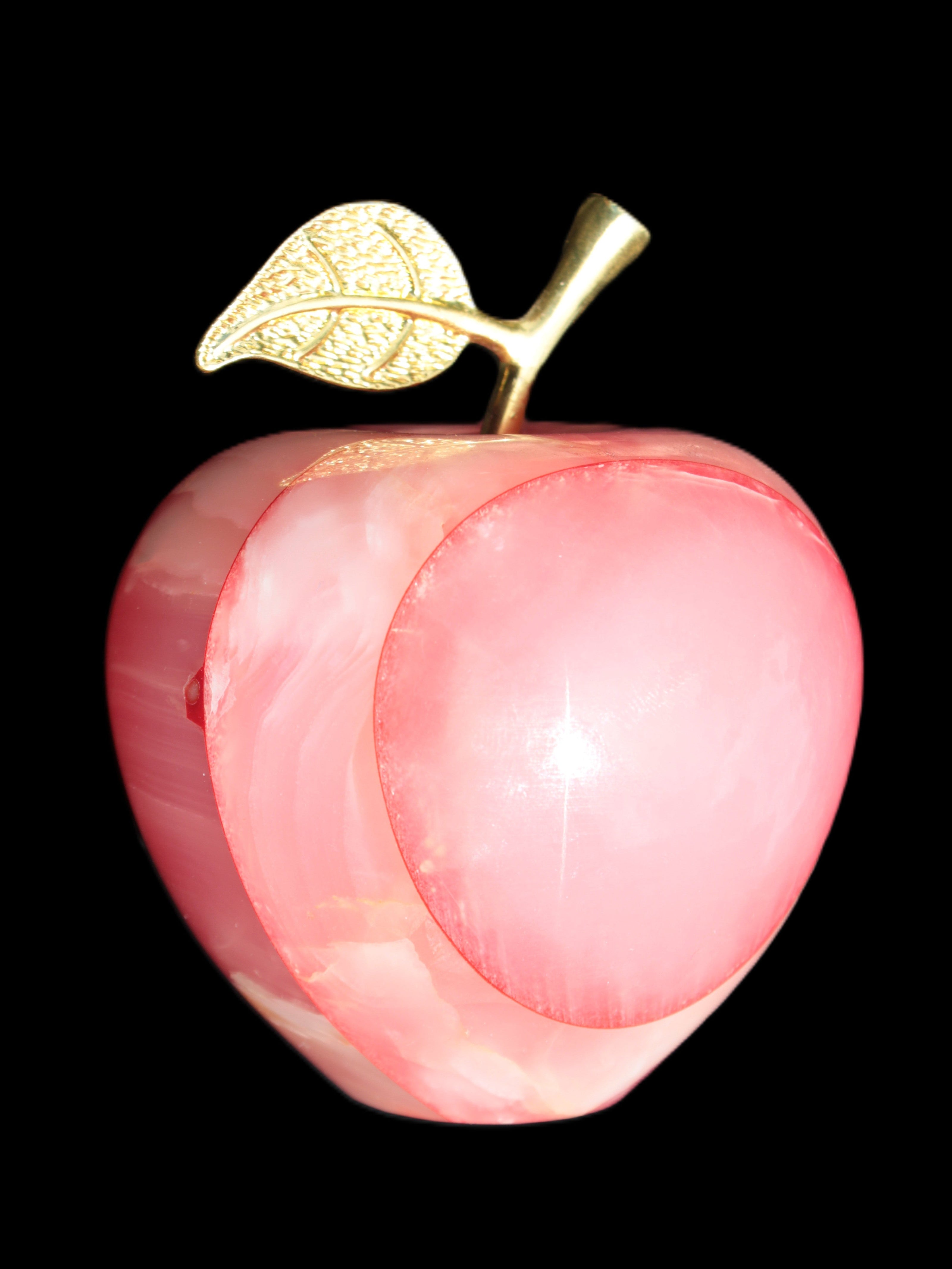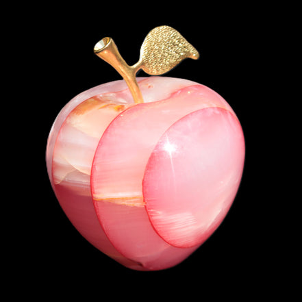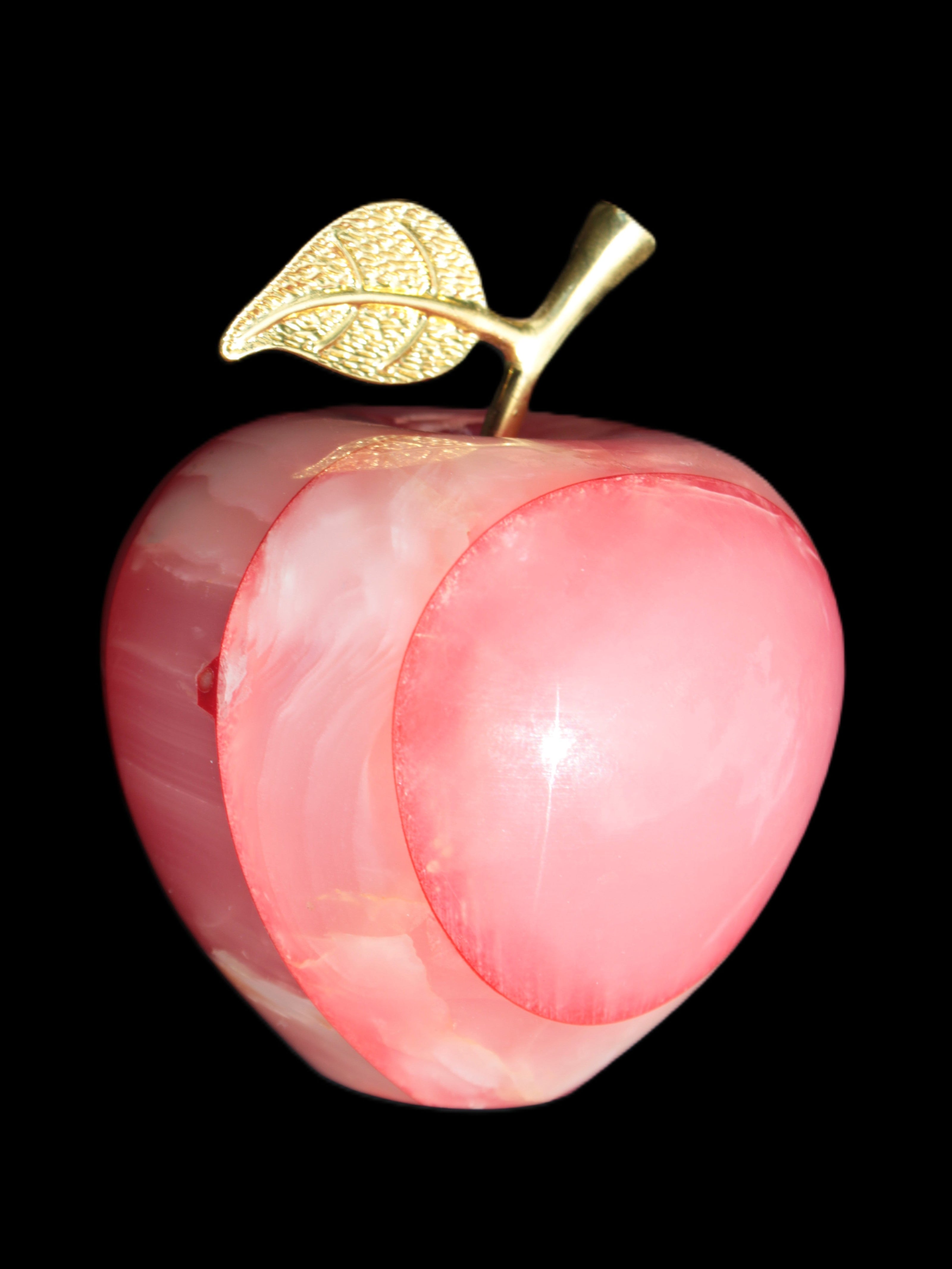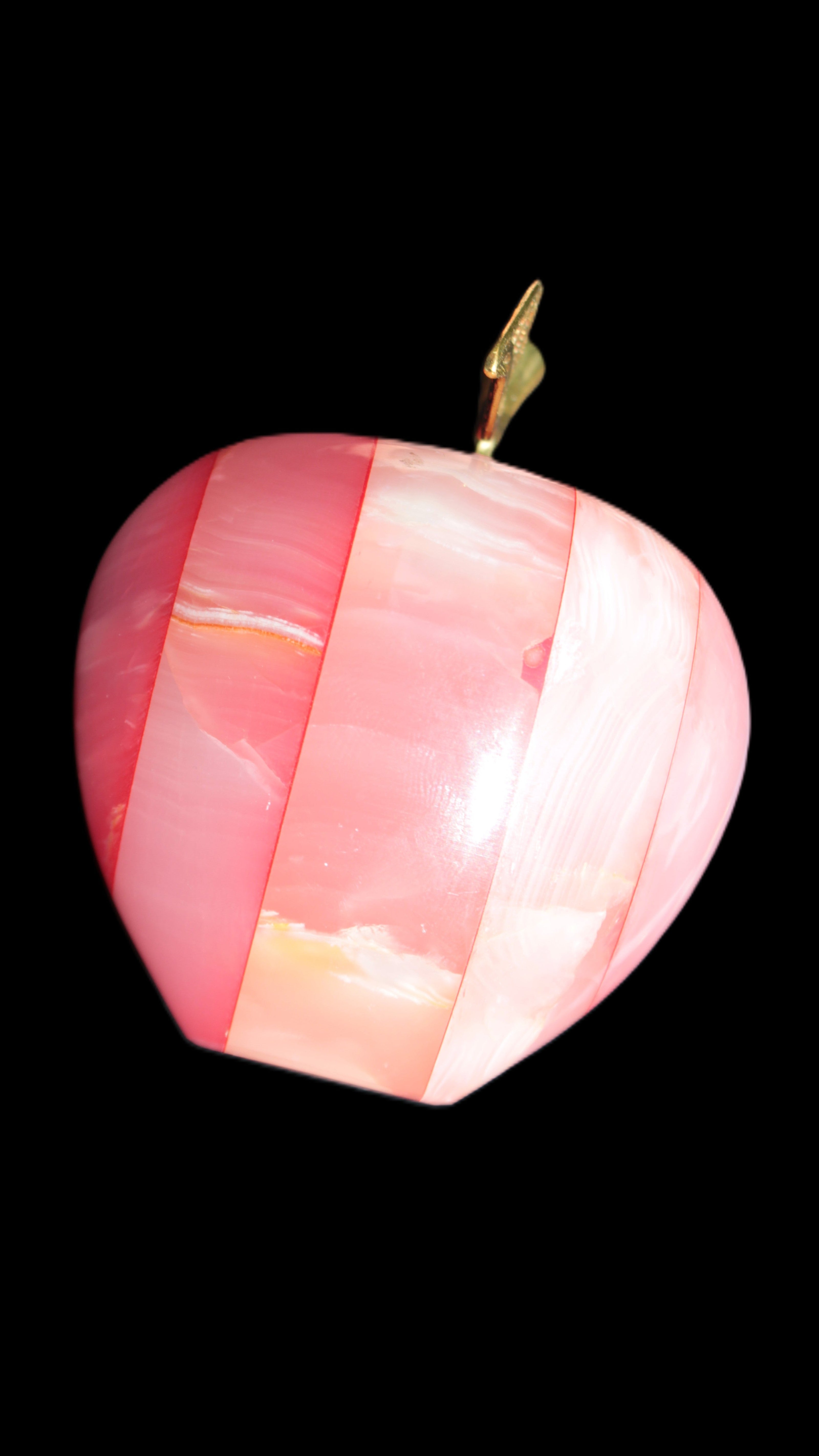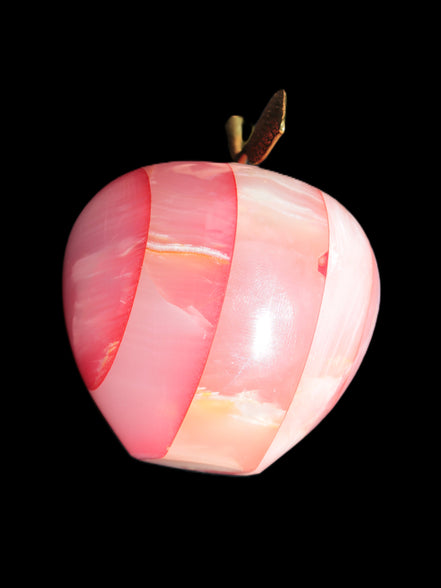 This Afghan Jade Onyx hand-carved Apple 71*85mm weighs 559g. It has been sculpted from the translucent Serpentine stone found in Pakistan. This stone is often referred to as Onyx, even though it is not agate. Our partner in Karachi used glued and dyed slices of this stone to carefully style this beautiful stone apple.