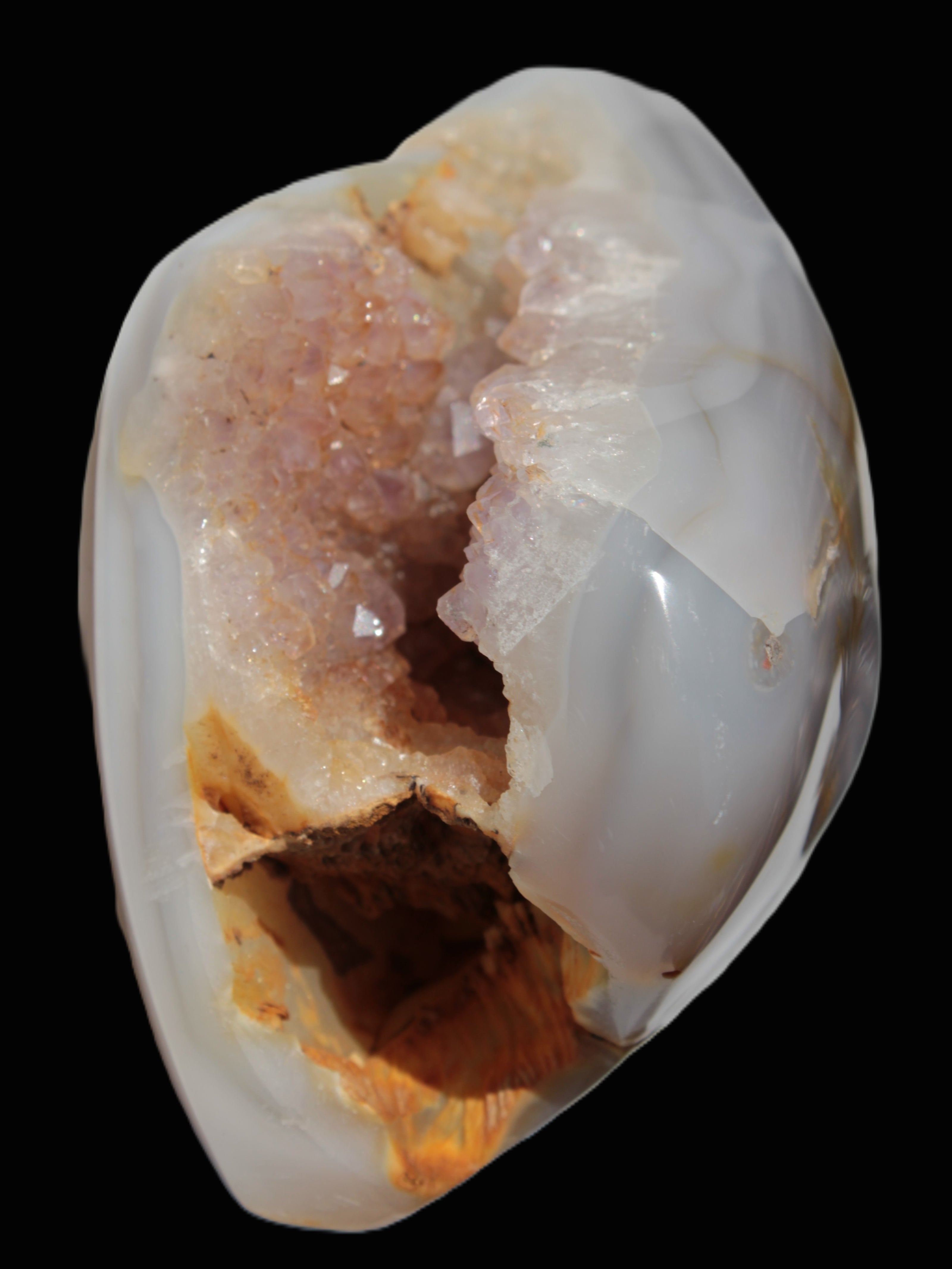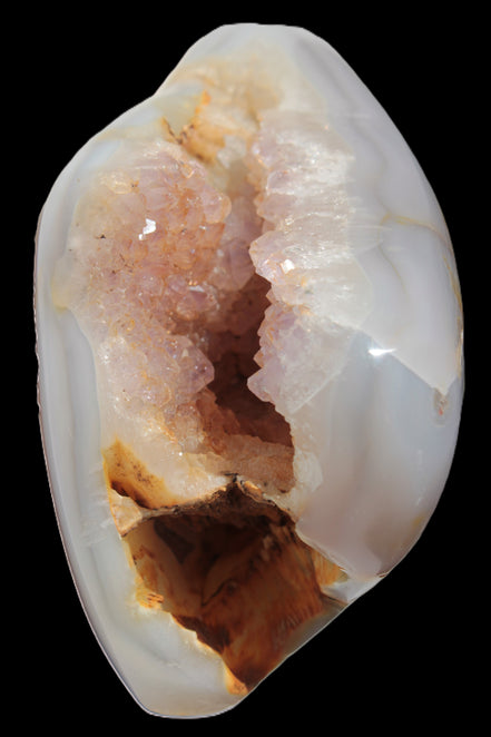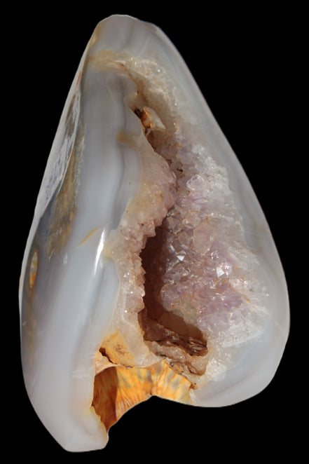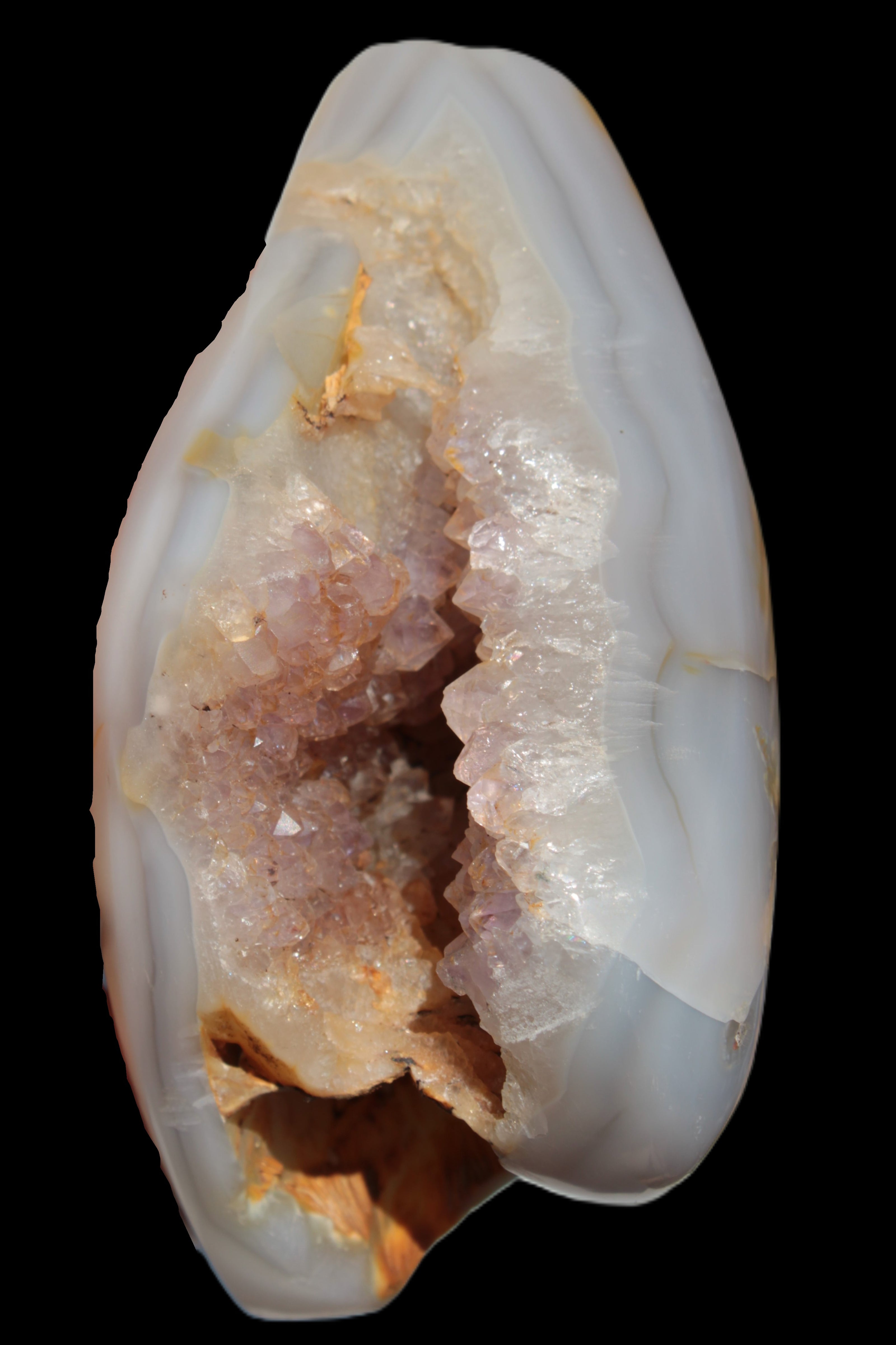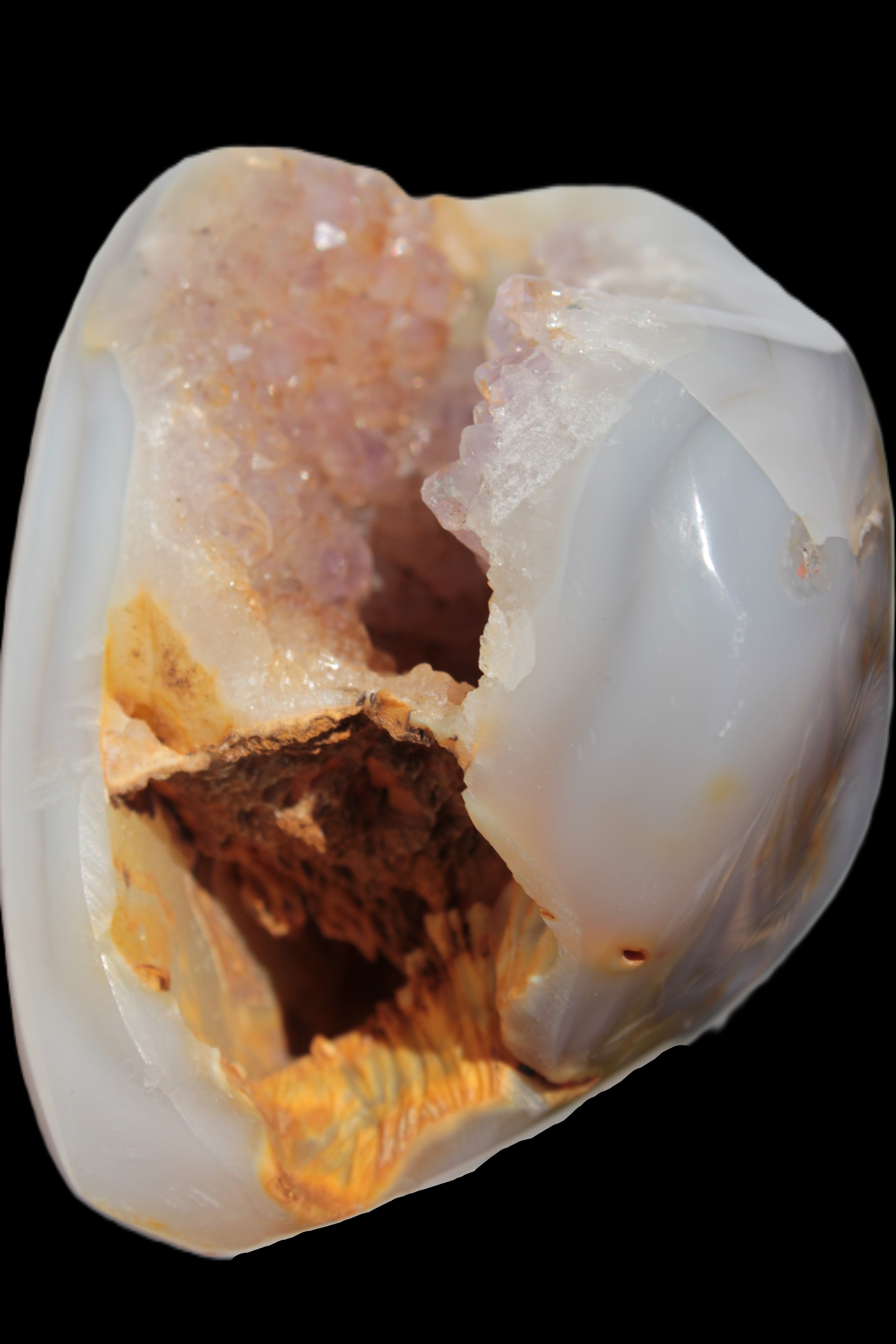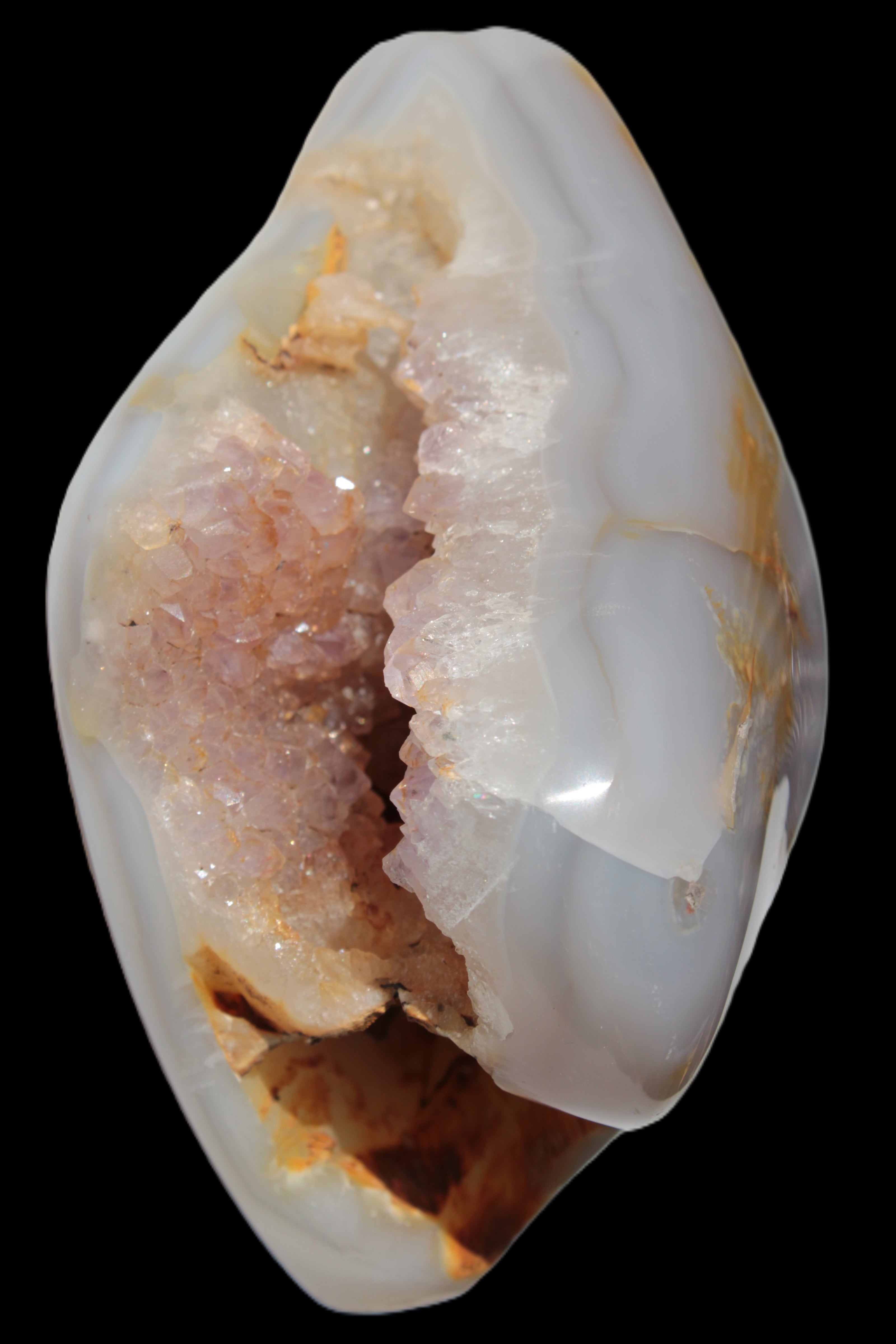 This interesting item is an Agate crystal cave geode 464g. Geodes grow within a host formation from solution. When opened there is a hollow surrounded by crystals pointing inward. Agate and other members of the quartz family commonly form geodes.