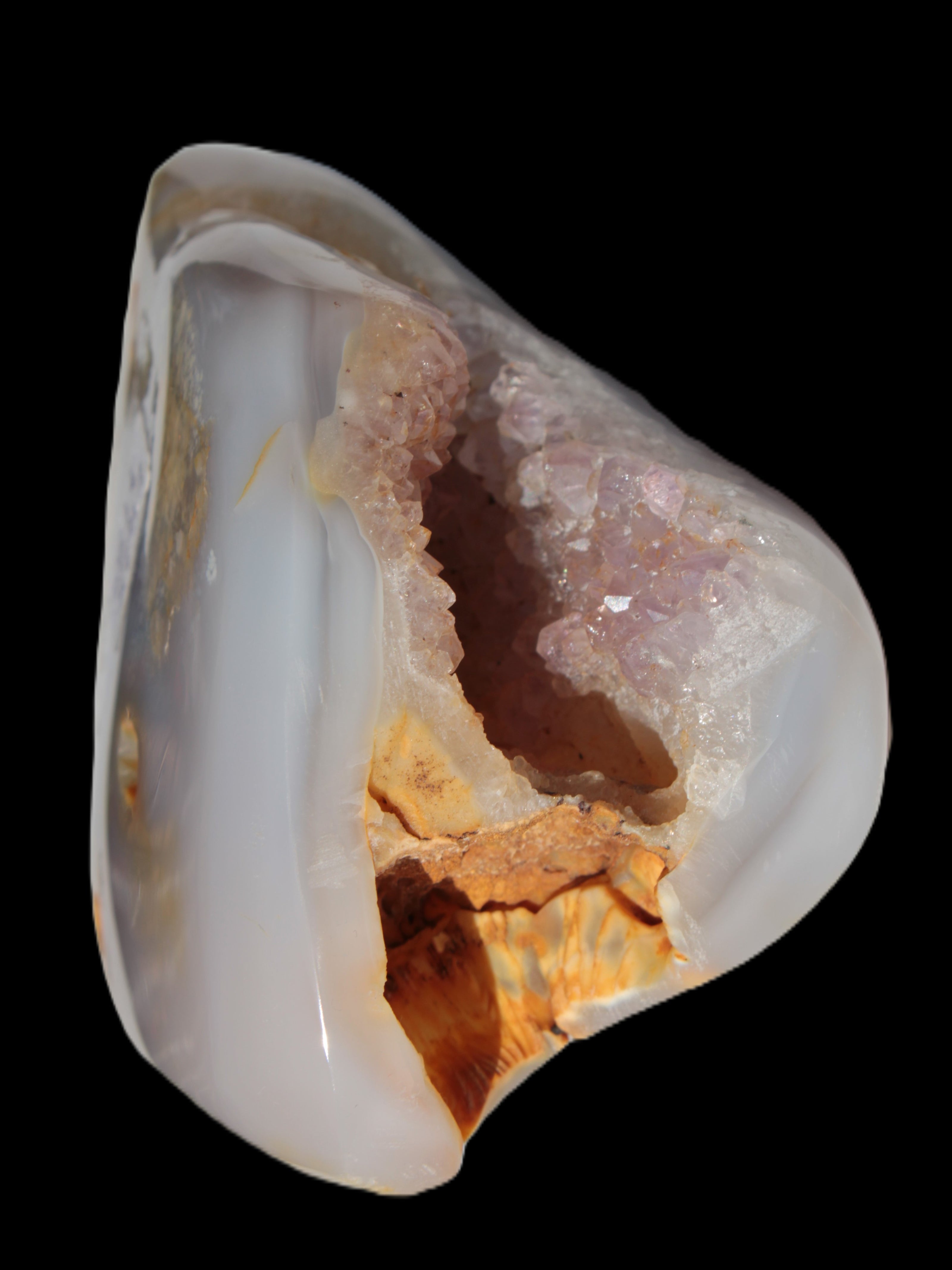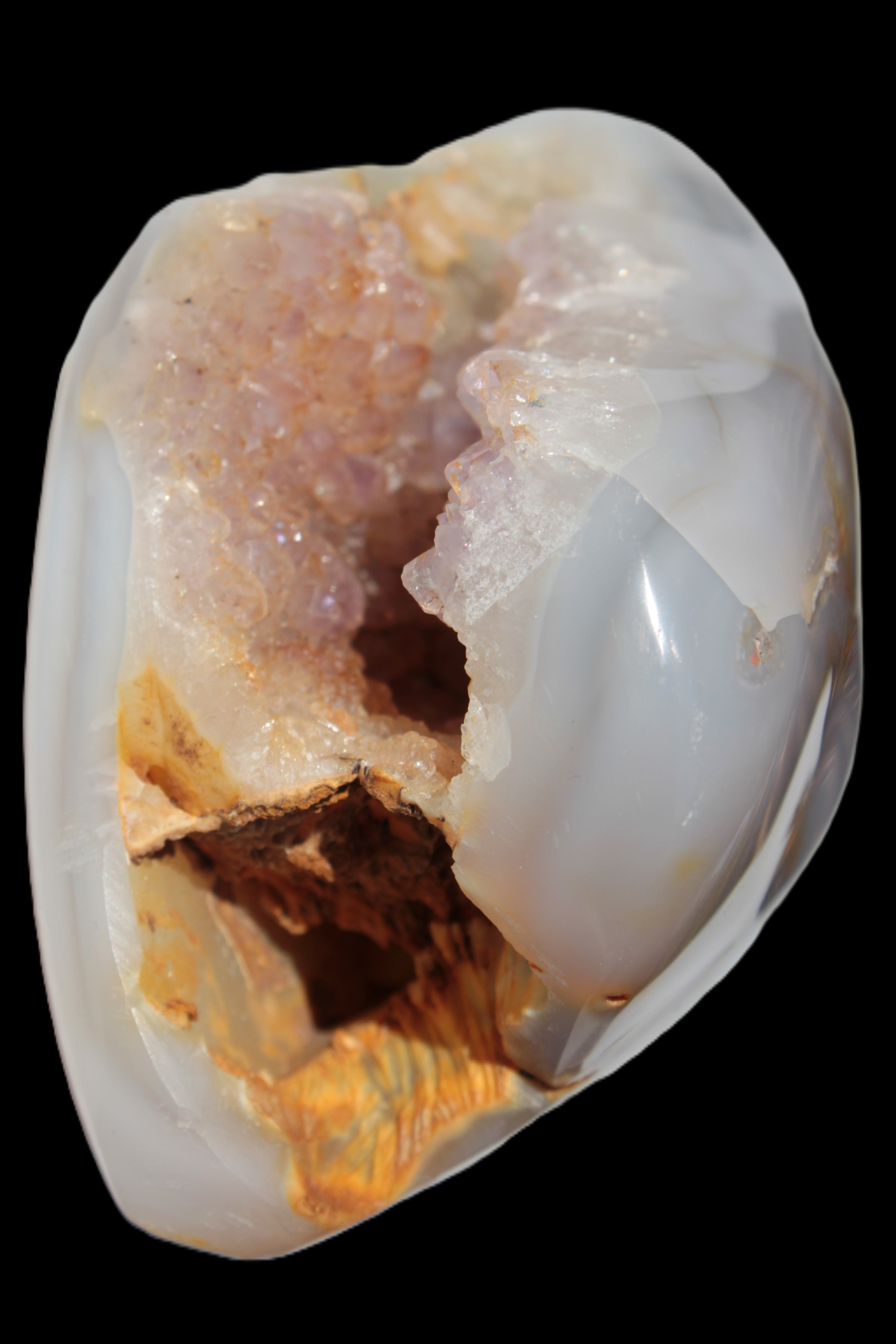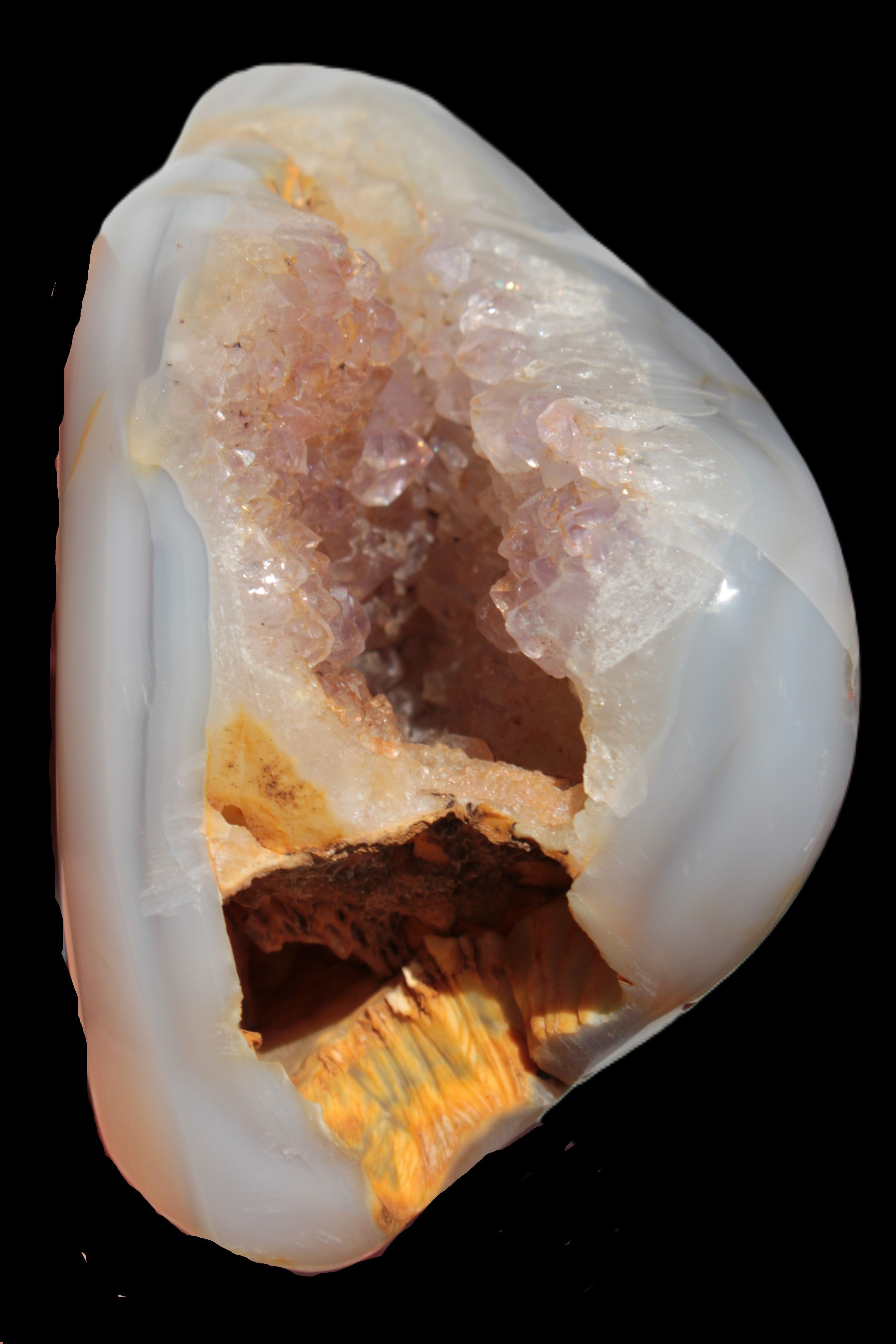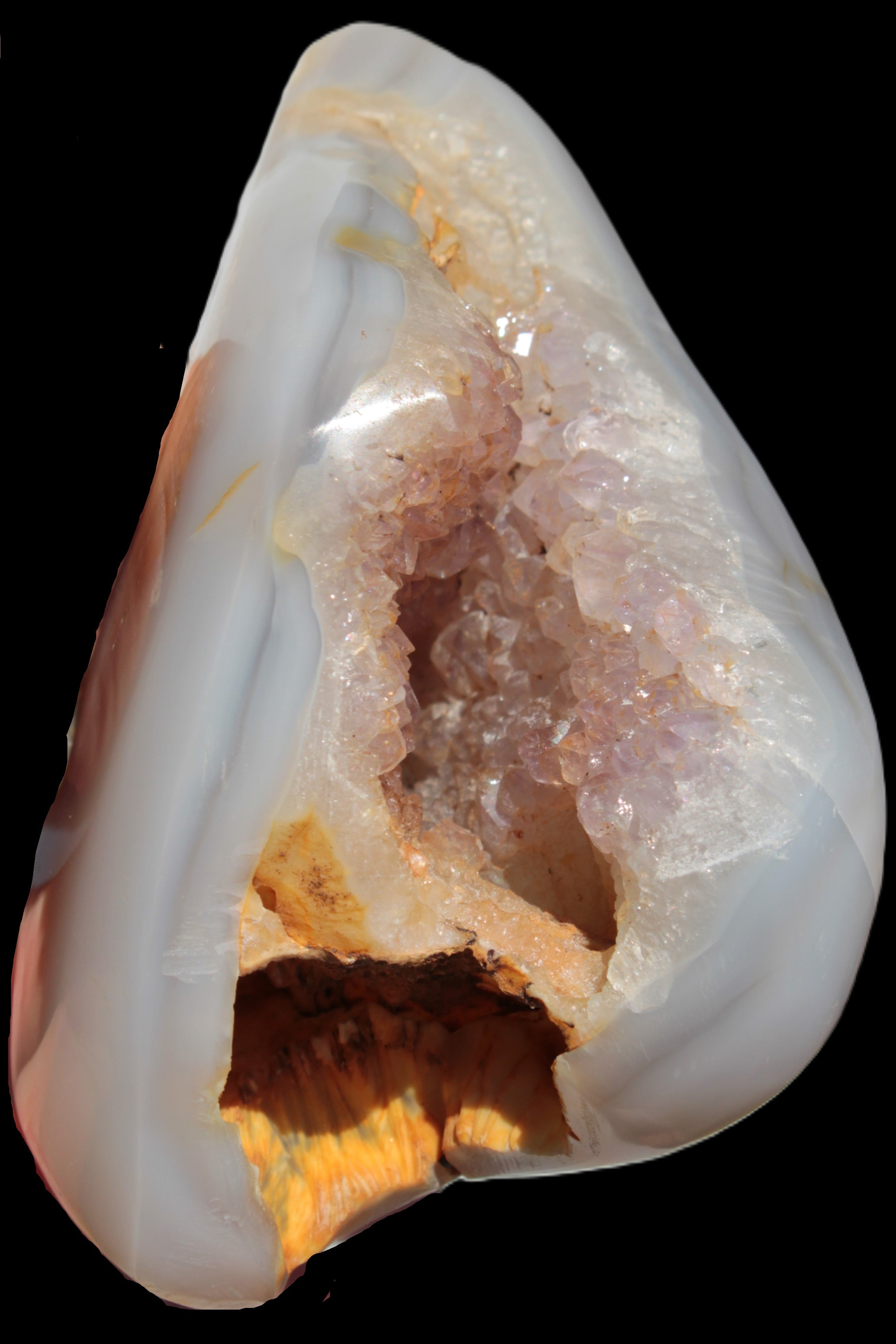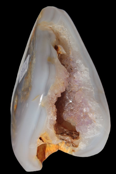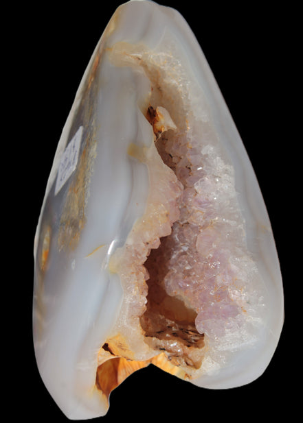 This interesting item is an Agate crystal cave geode 464g. Geodes grow within a host formation from solution. When opened there is a hollow surrounded by crystals pointing inward. Agate and other members of the quartz family commonly form geodes.