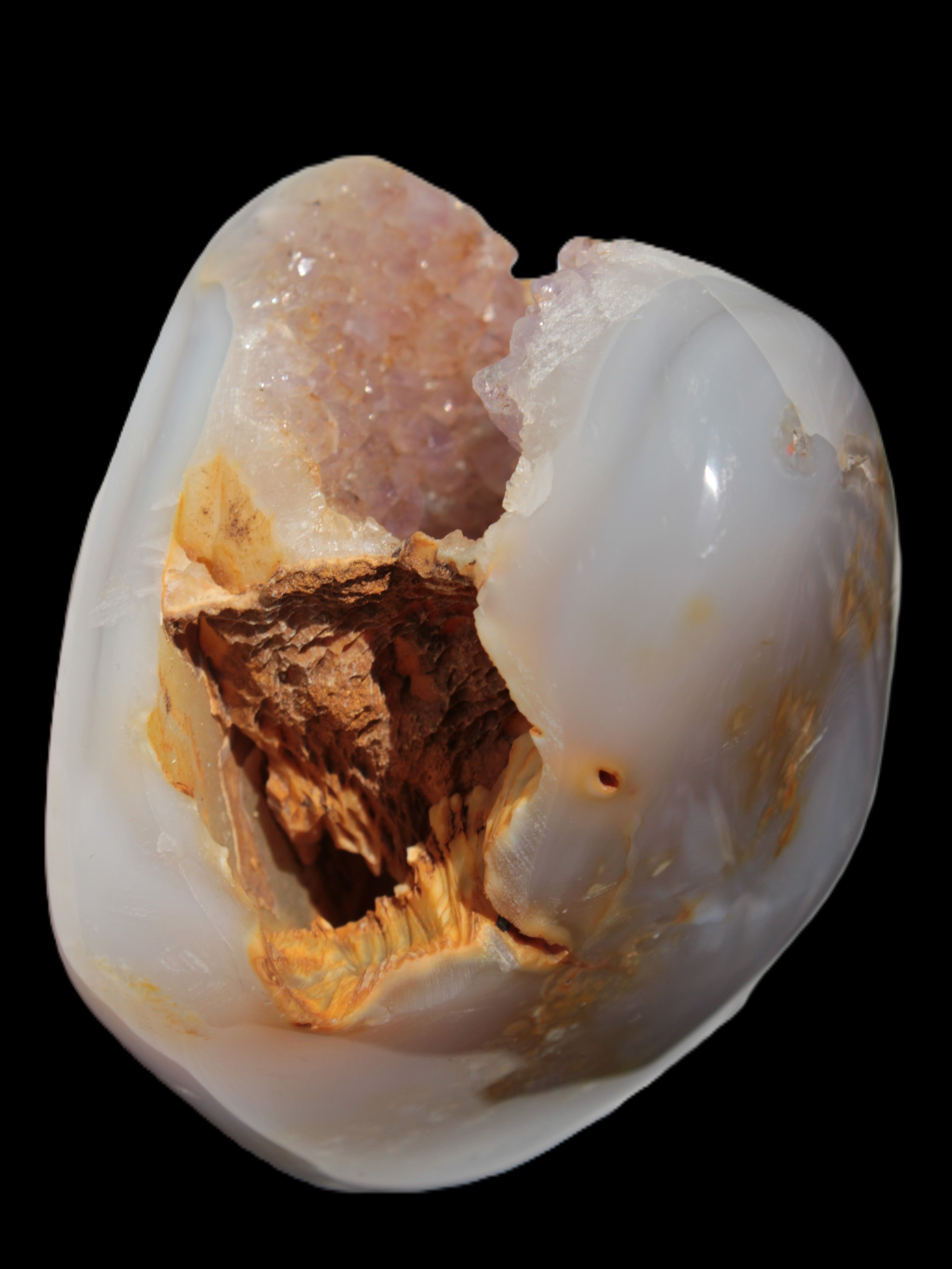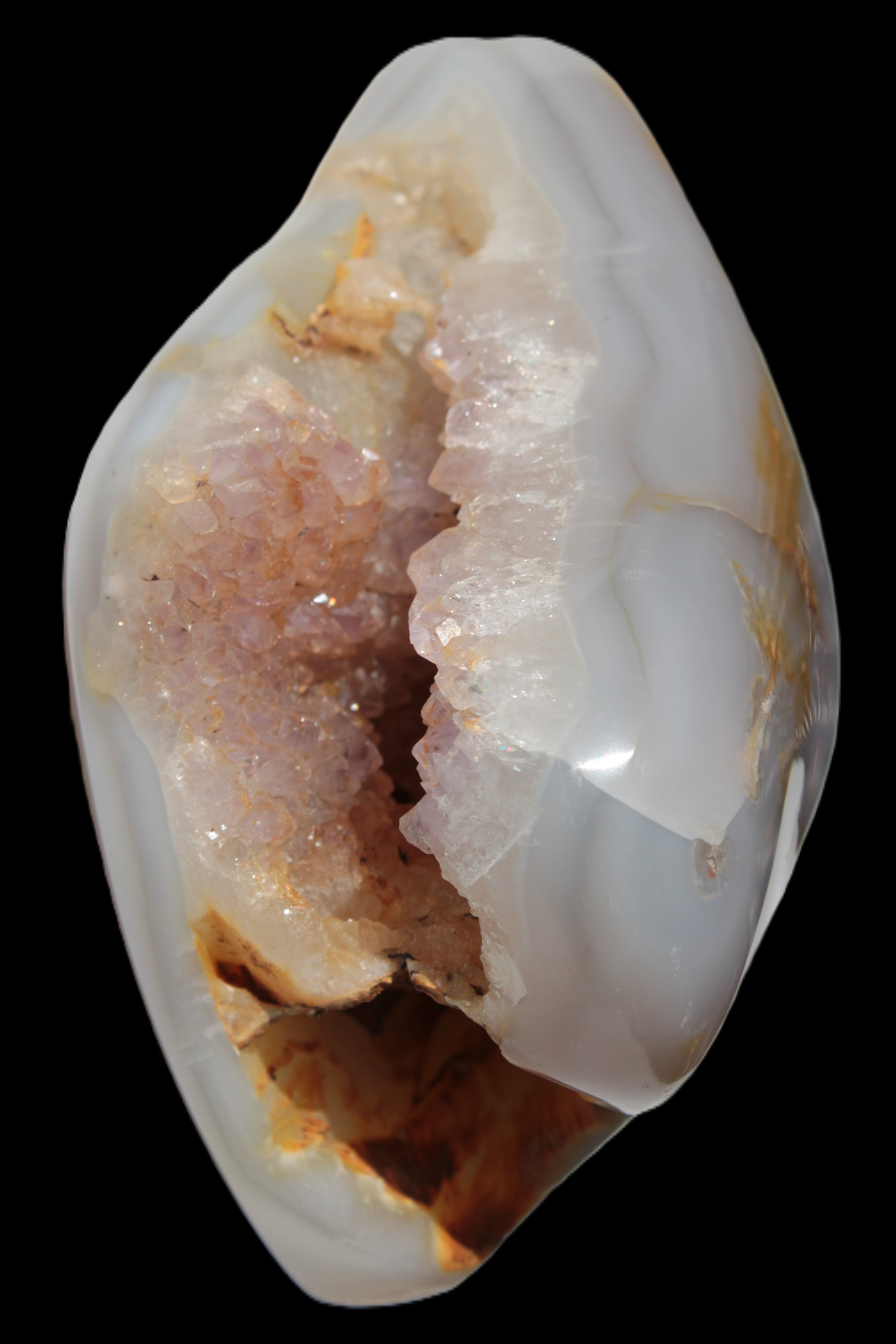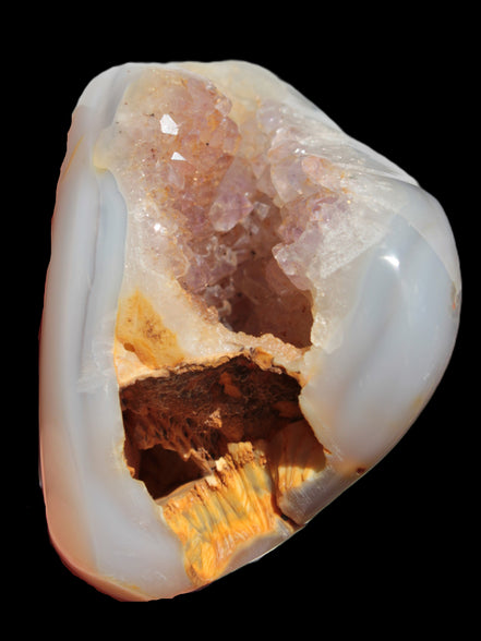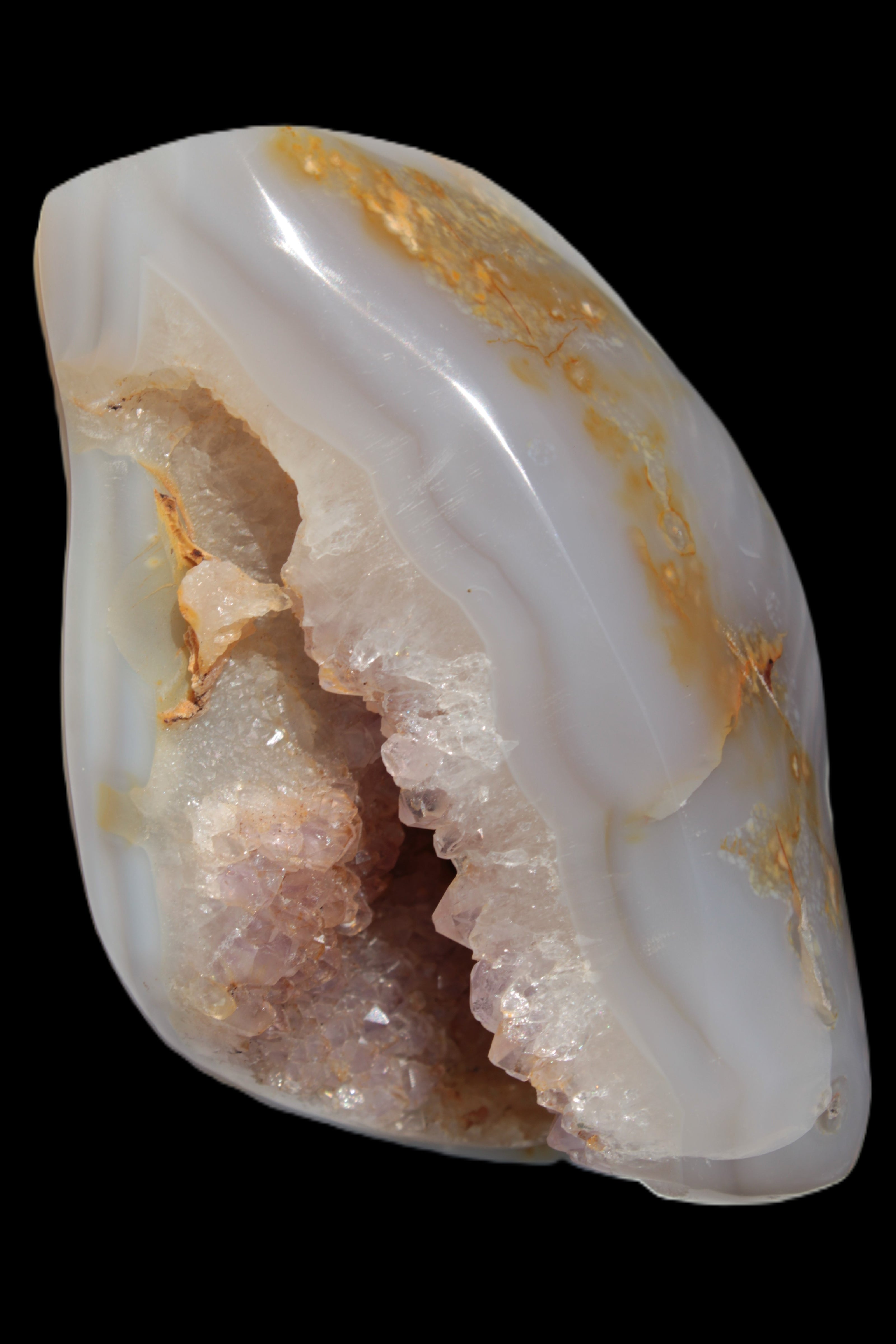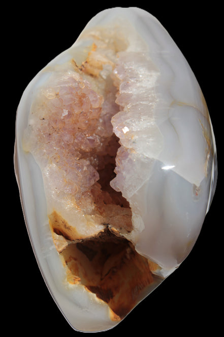 This interesting item is an Agate crystal cave geode 464g. Geodes grow within a host formation from solution. When opened there is a hollow surrounded by crystals pointing inward. Agate and other members of the quartz family commonly form geodes.