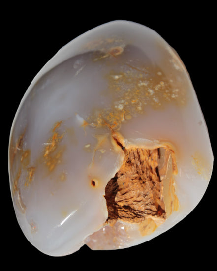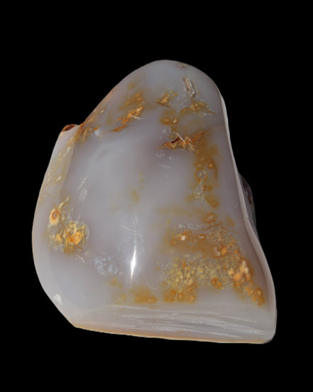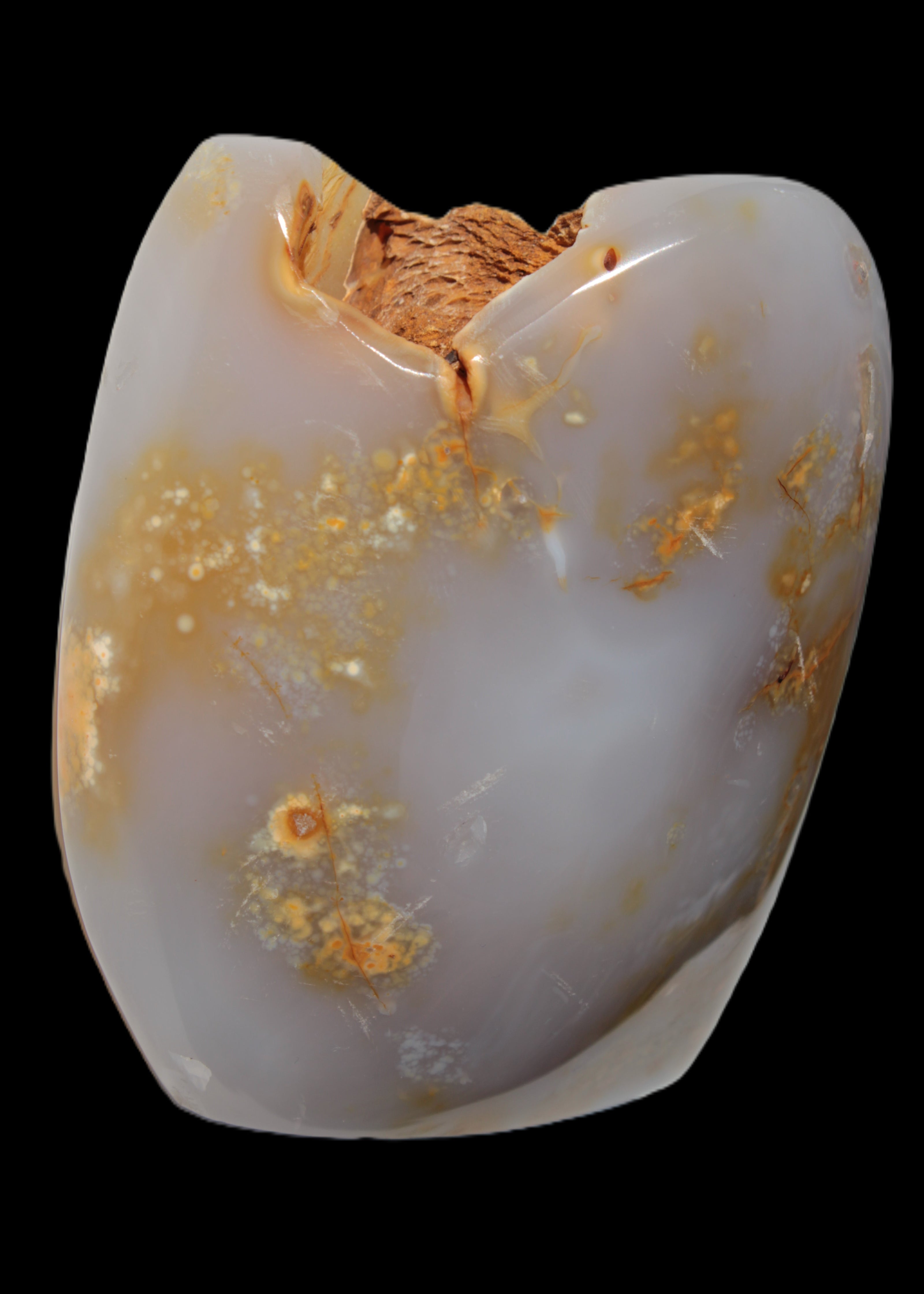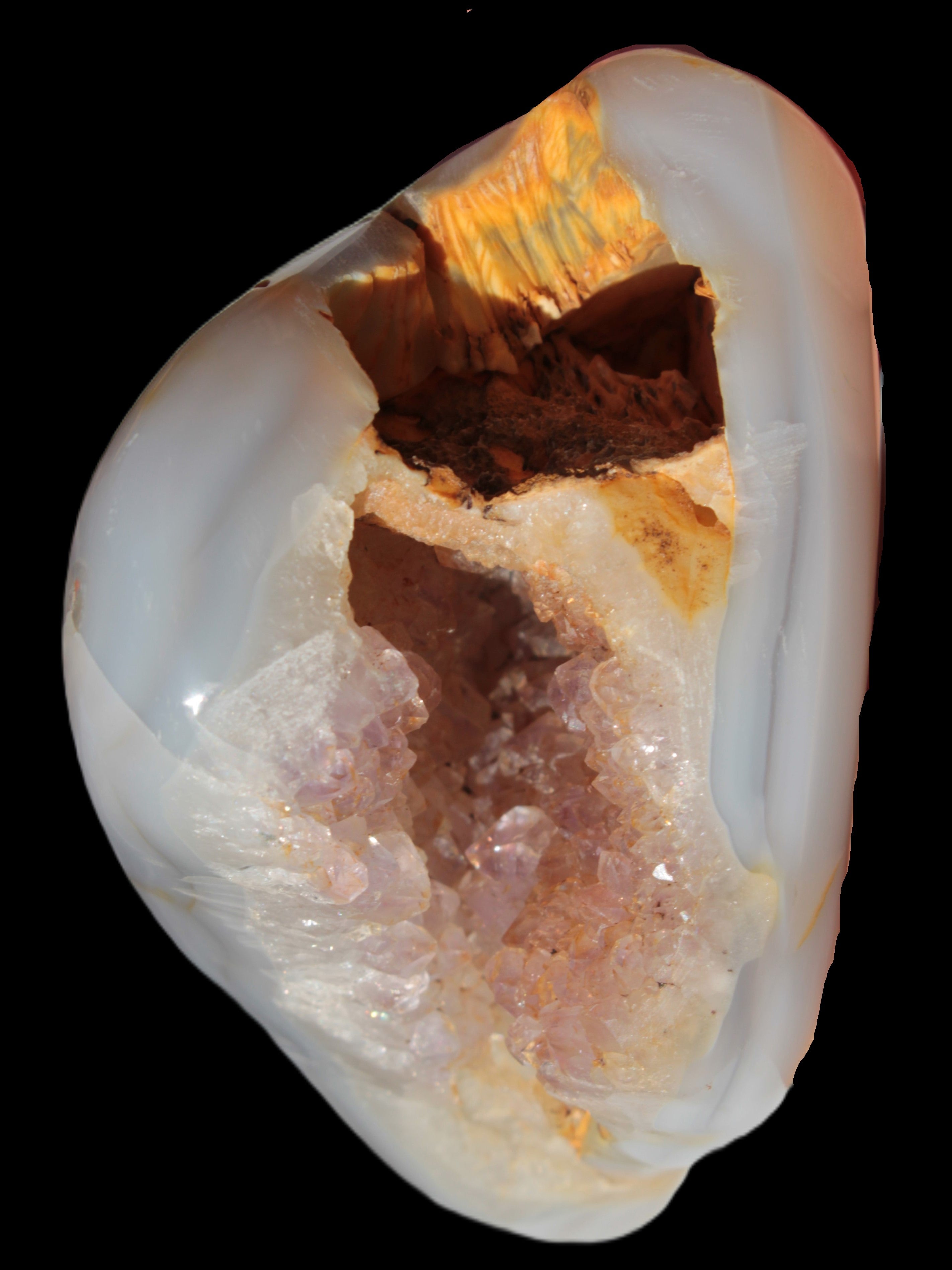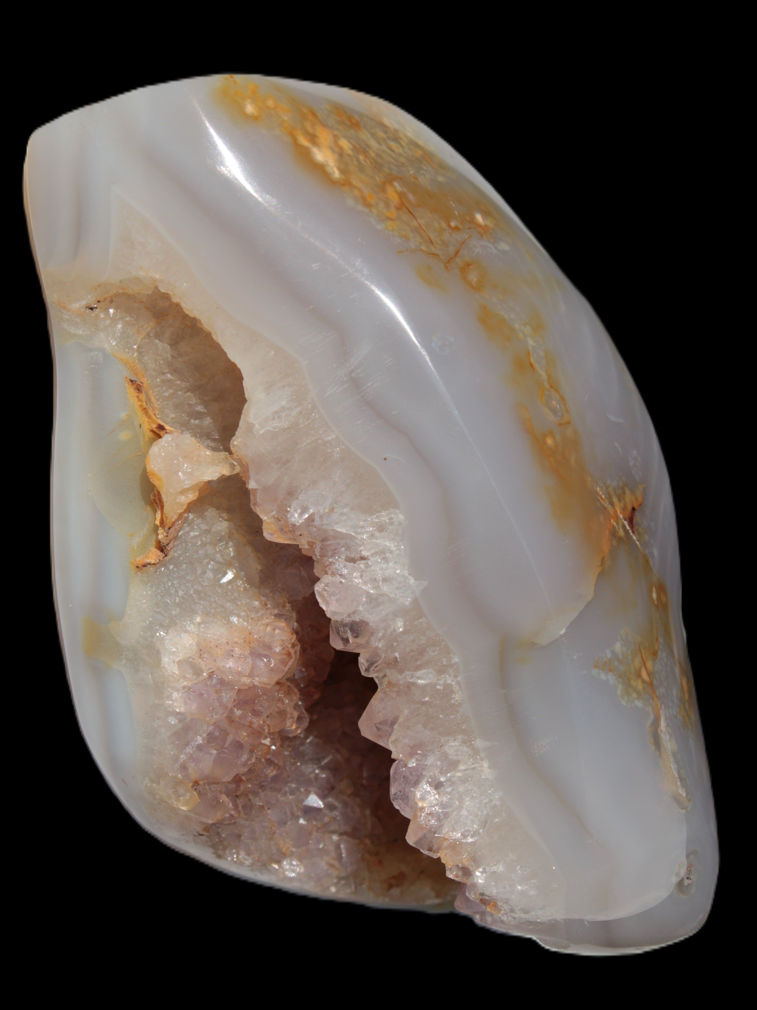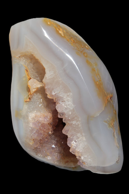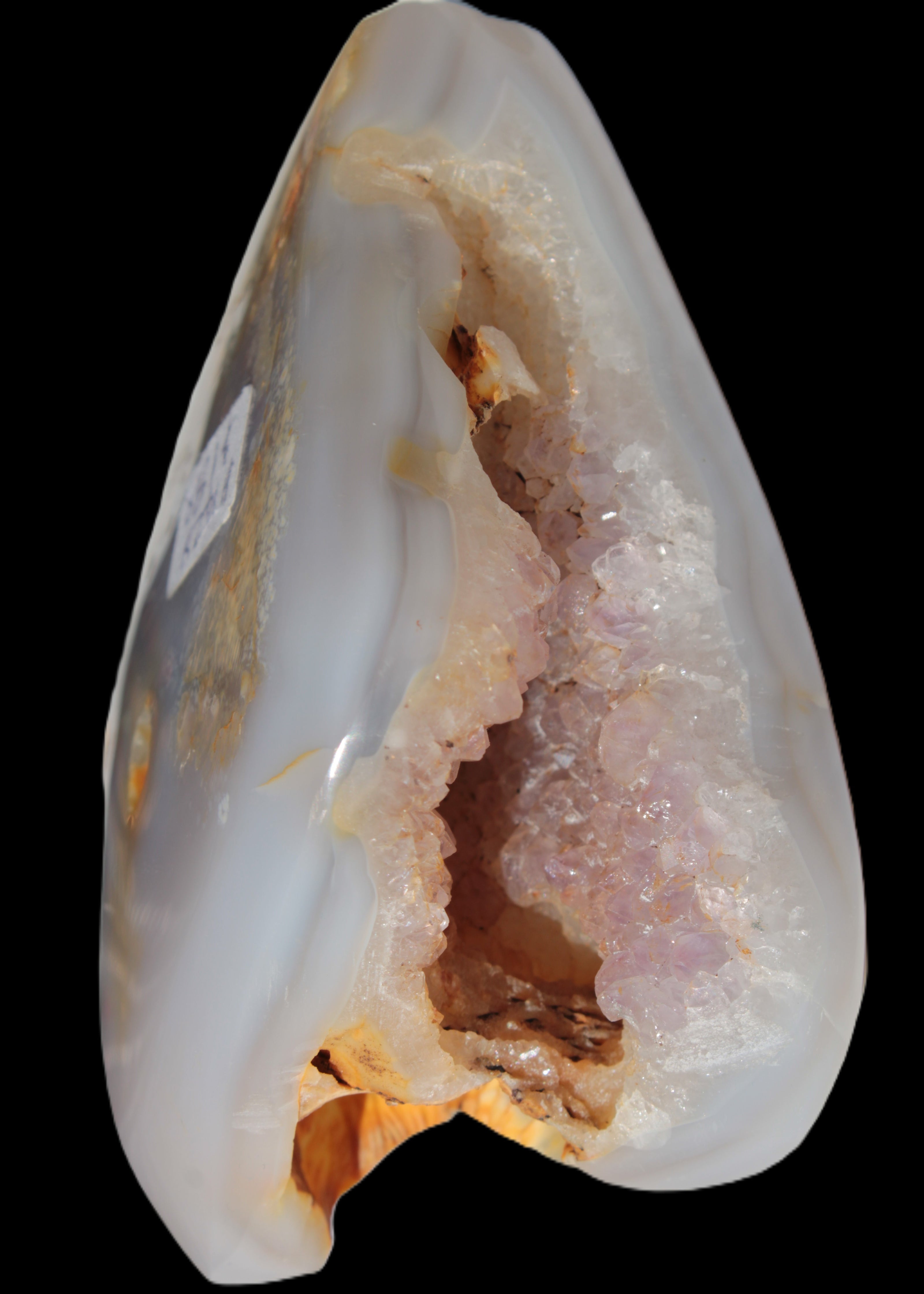 This interesting item is an Agate crystal cave geode 464g. Geodes grow within a host formation from solution. When opened there is a hollow surrounded by crystals pointing inward. Agate and other members of the quartz family commonly form geodes.