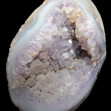 This soft lilac Amethyst Agate geode slice weighs 404g It has a beautiful Blue Lace Agate edge. Amethyst is a good all-purpose stone as it is powerful and protective. Amethyst is one of the first stones you should get, because it has a lot of uses. Amethyst is known as the ‘Traveller’s Stone’. It provides protection when away from home. Amethyst encourages inner strength. It is a stress reliever. The powerful Amethyst energies transmute negative energy into love energy.