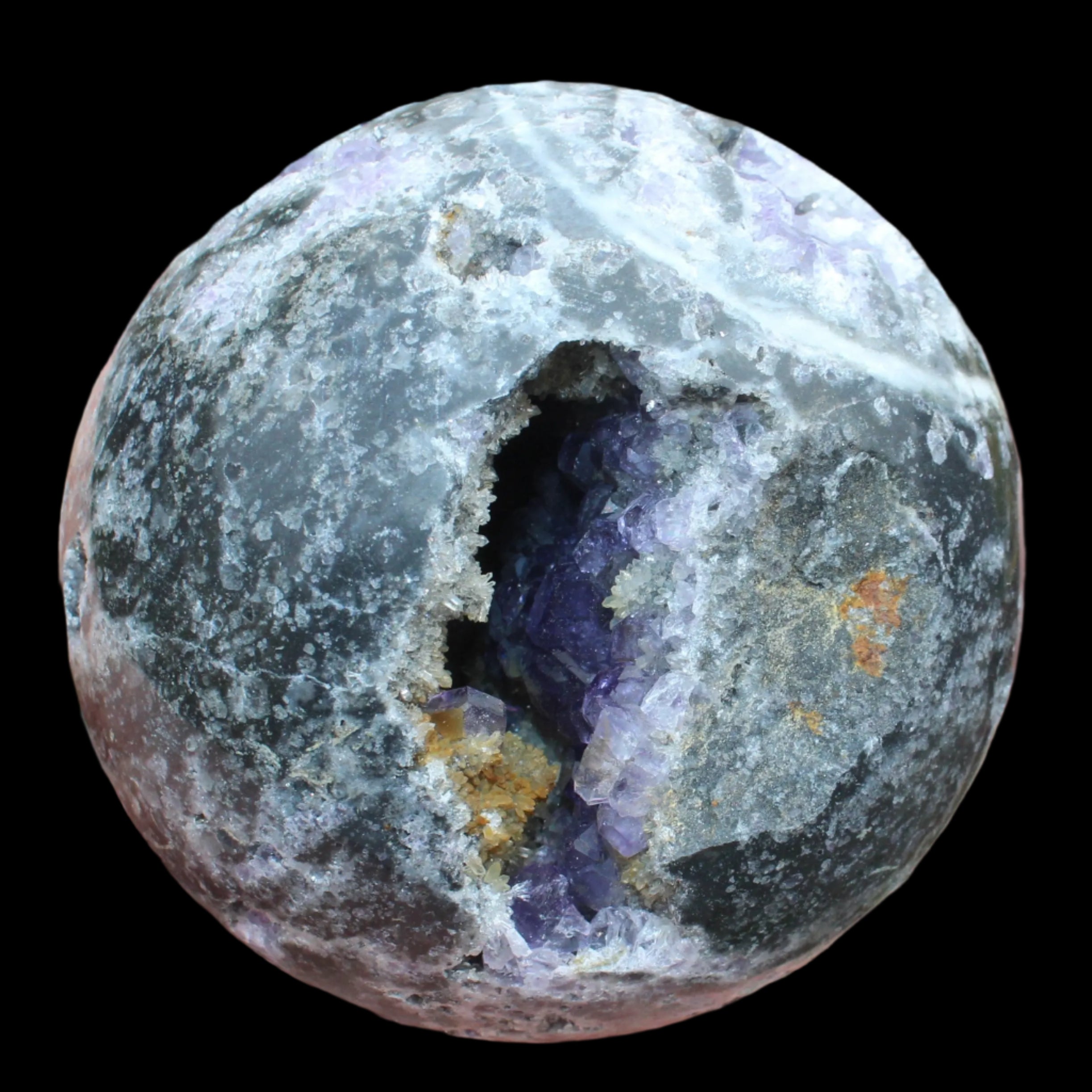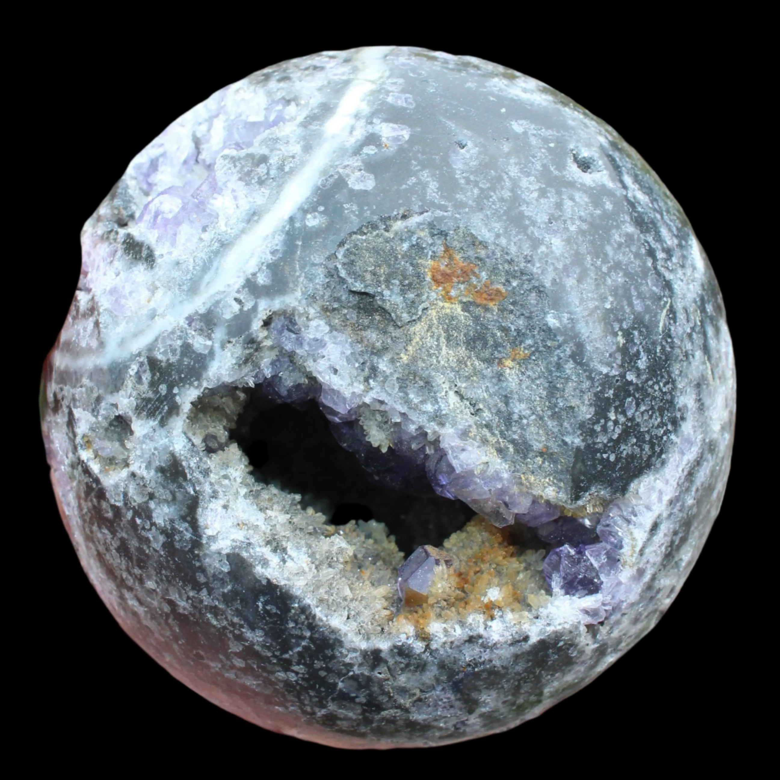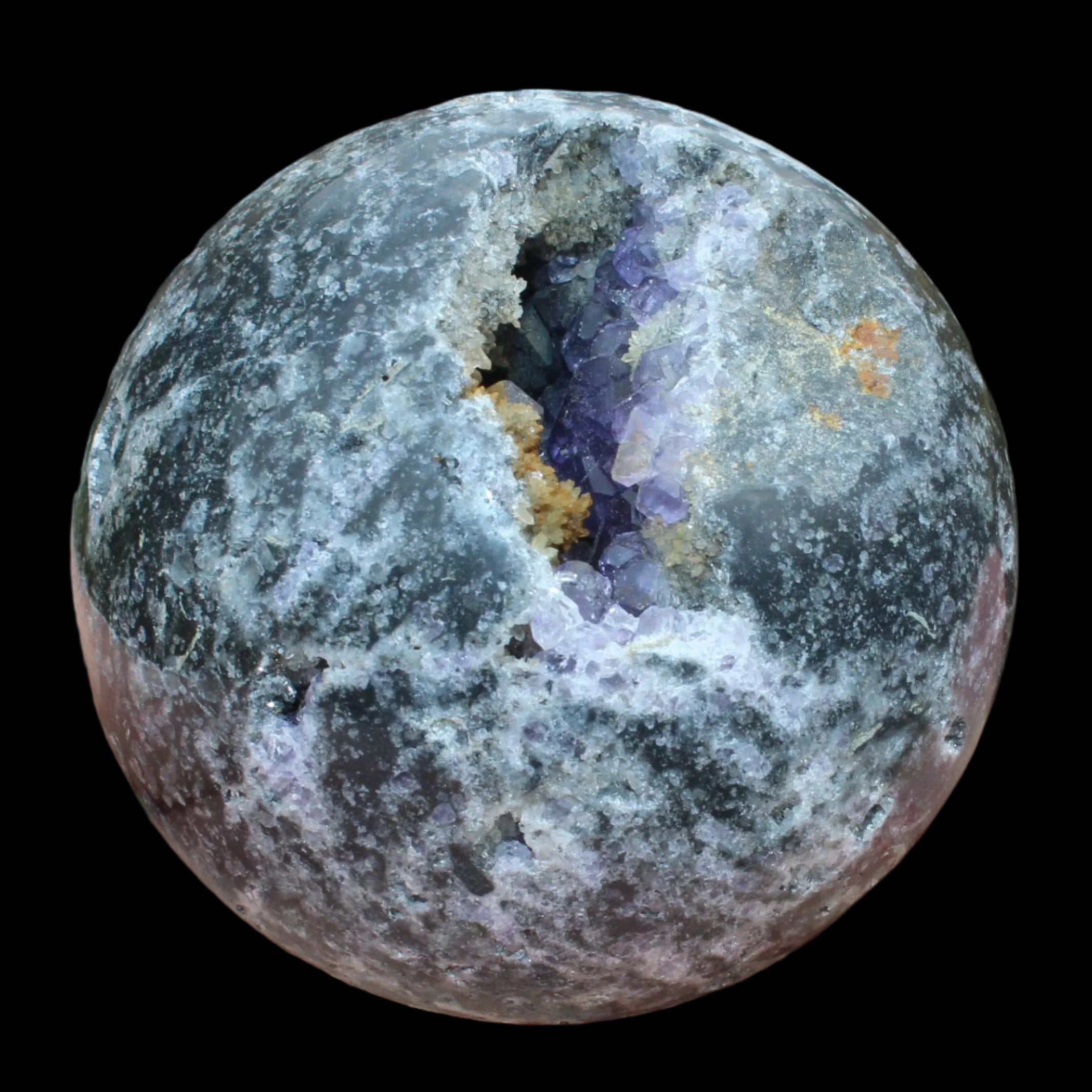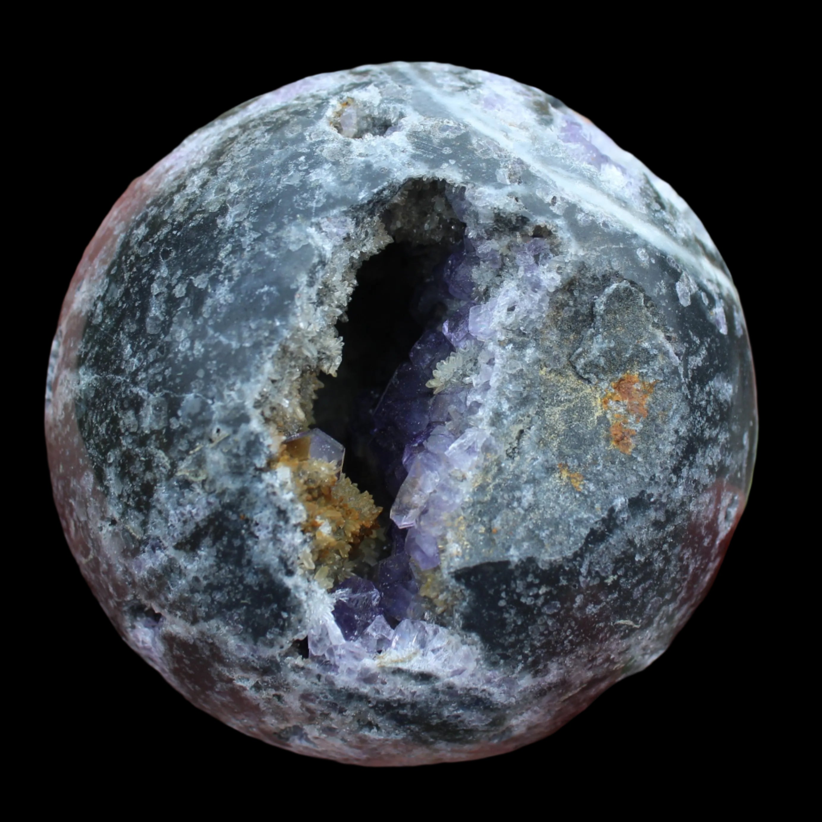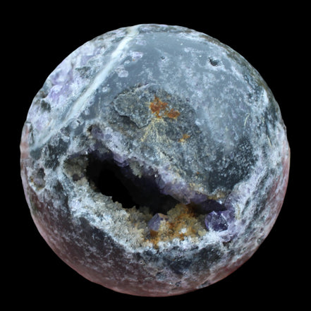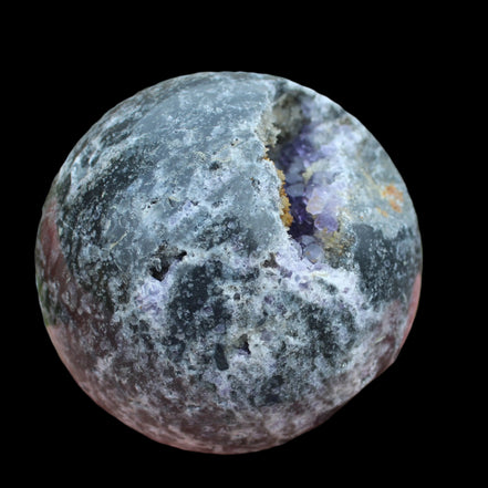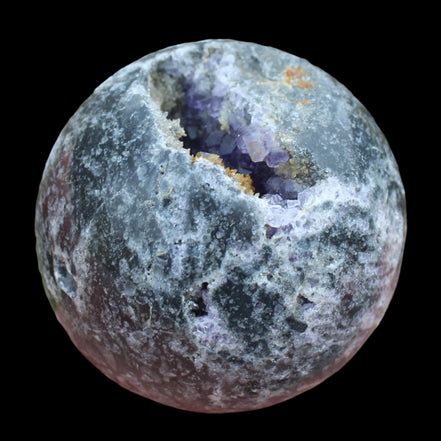 This beautiful Amethyst Sphalerite sphere 713g is a sale item. It is not a perfect sphere as it has a geode cave within. Sphalerite is a zinc sulphide mineral that commonly forms with other minerals including Calcite, Dolomite, Fluorite, Galena Pyrite and Quartz. It has a range of crystal forms including botryoidal, cubic, tetrahedral and dodecahedral. It is found all over the world and is the most common ore for the extraction of Zinc.