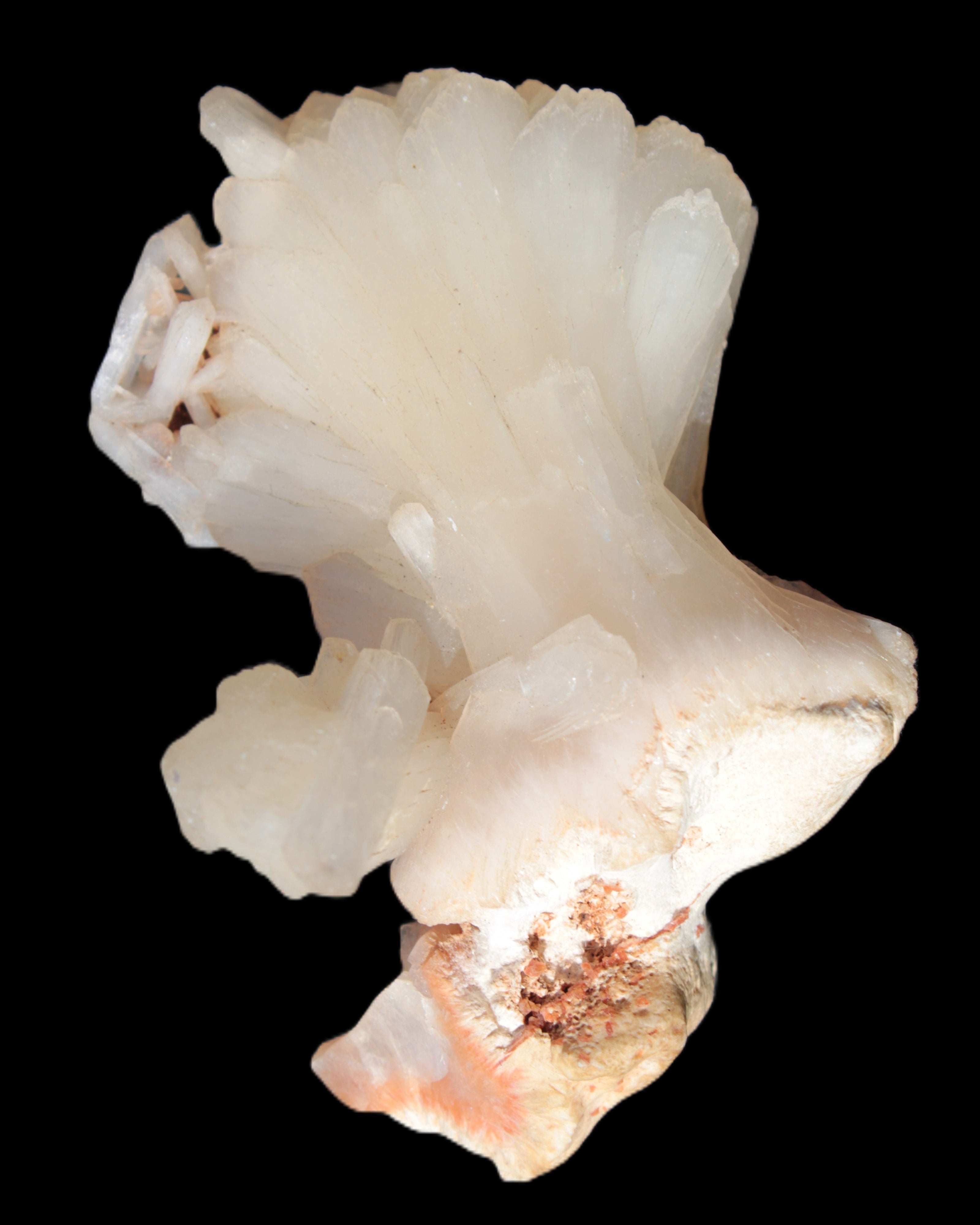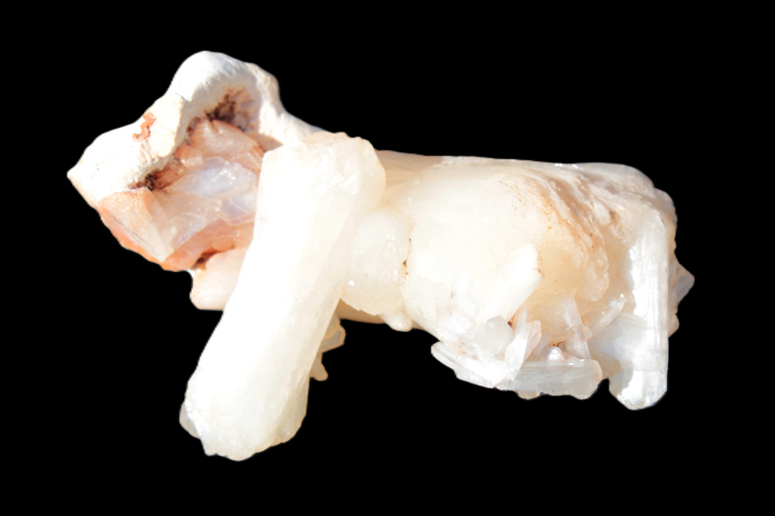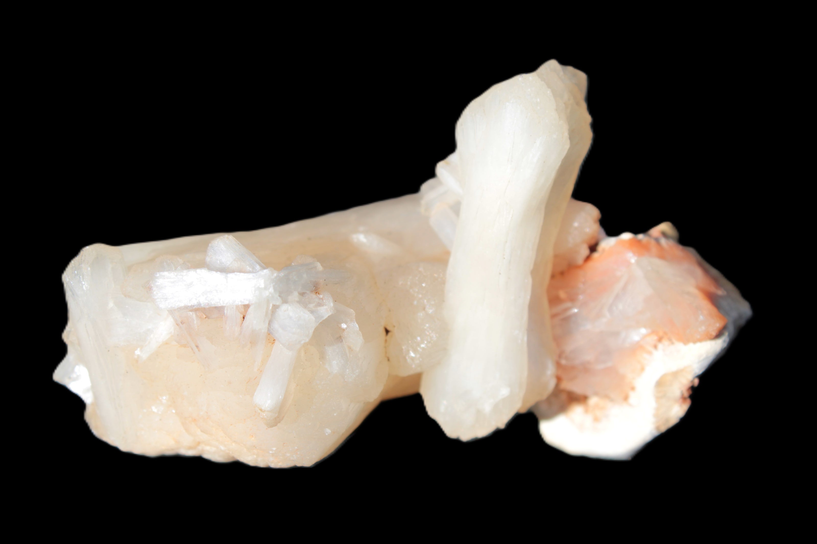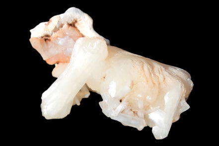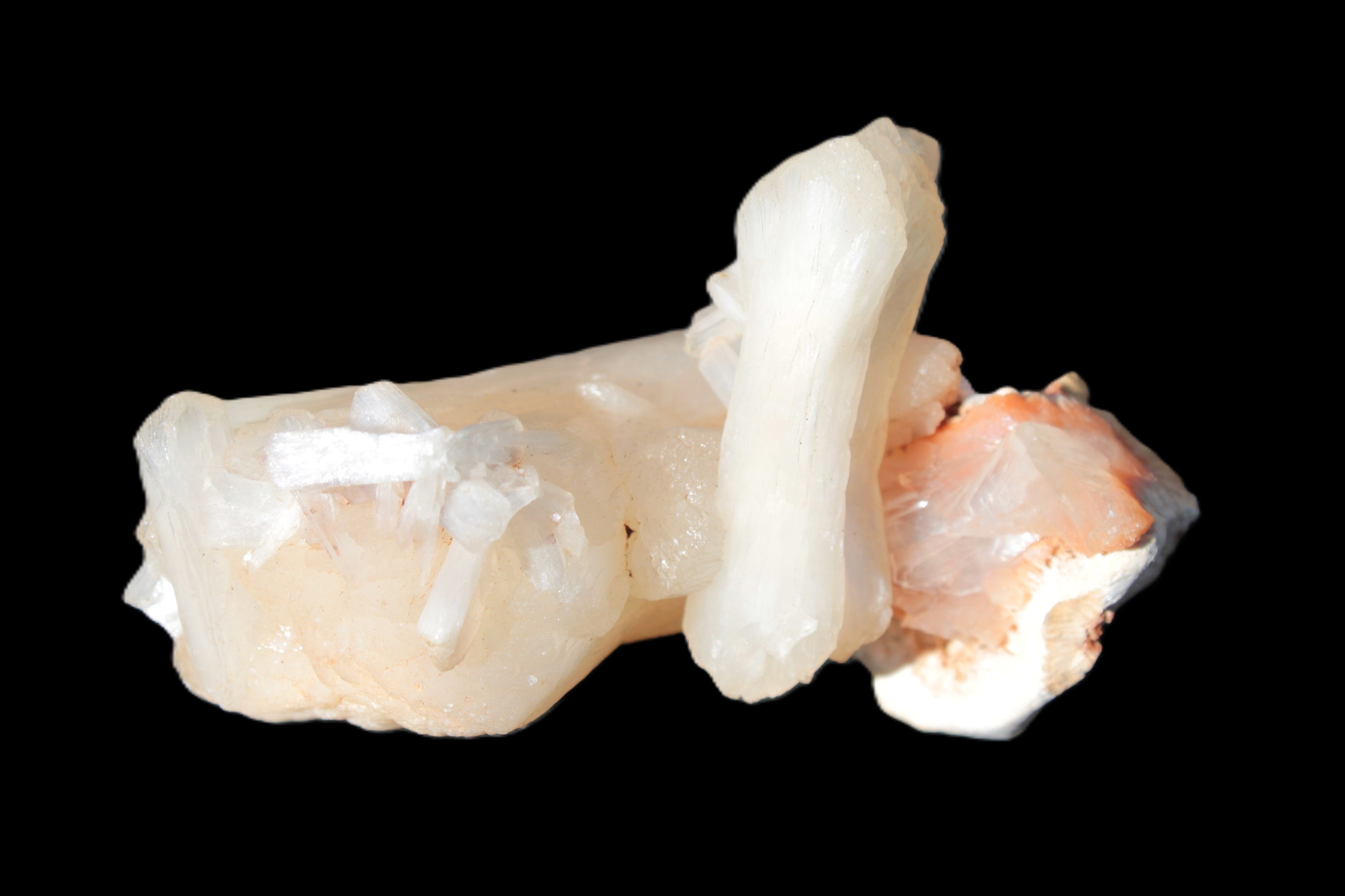 This Apophyllite and Calcite Zeolite is amazing. It wears a bowtie. Zeolites like this form in basalt vesicles, which is a cavity formed by escaping gases as the molten rock flows and cools. The reaction to UV light suggests the base is red Calcite, rather than Heulandite. The Bowtie may be Stilbite. Both of these minerals are also Zeolite minerals. Zeolites have incredible chemical and energetic properties. This makes prized in both manufacturing and metaphysical applications.