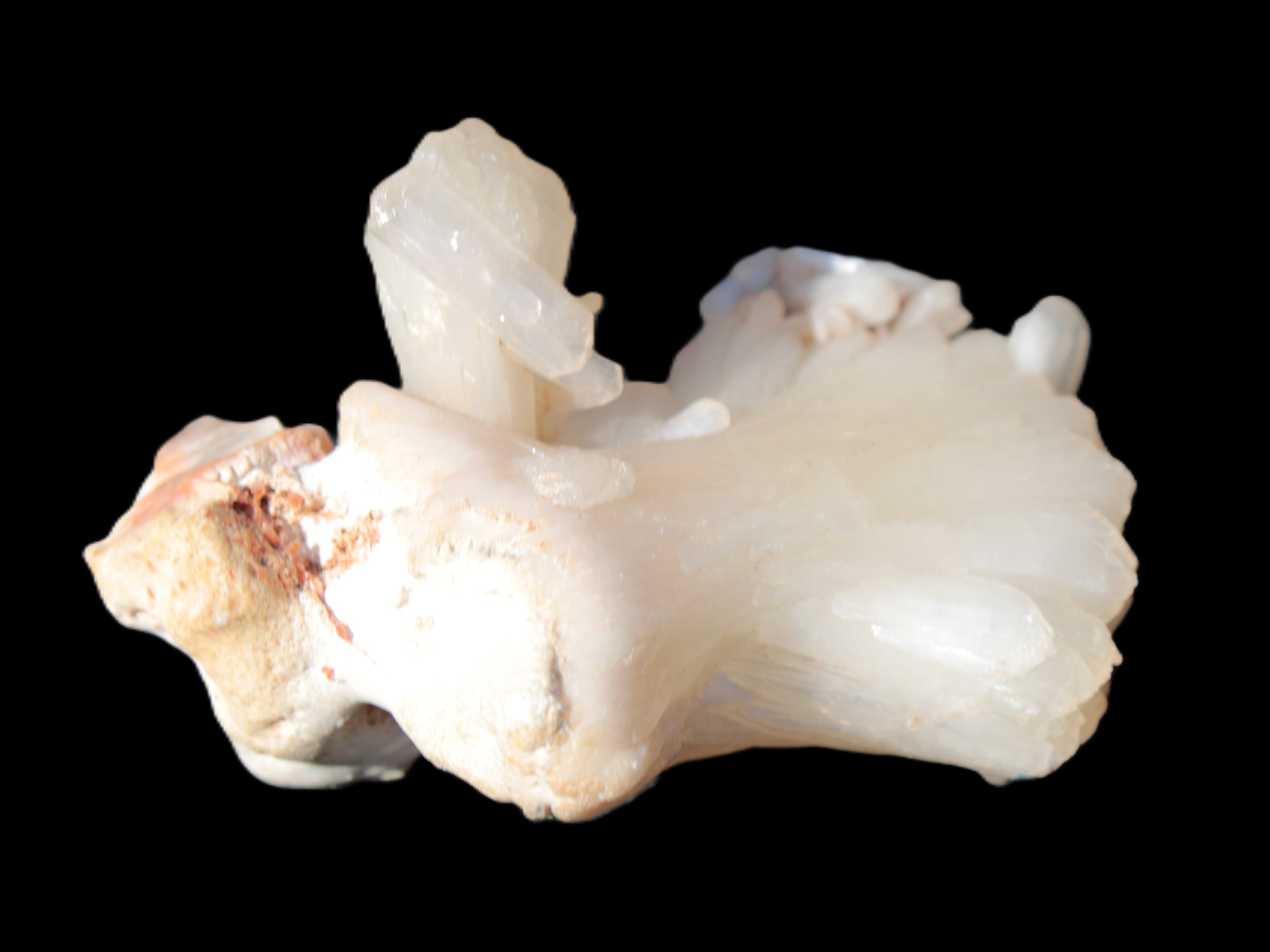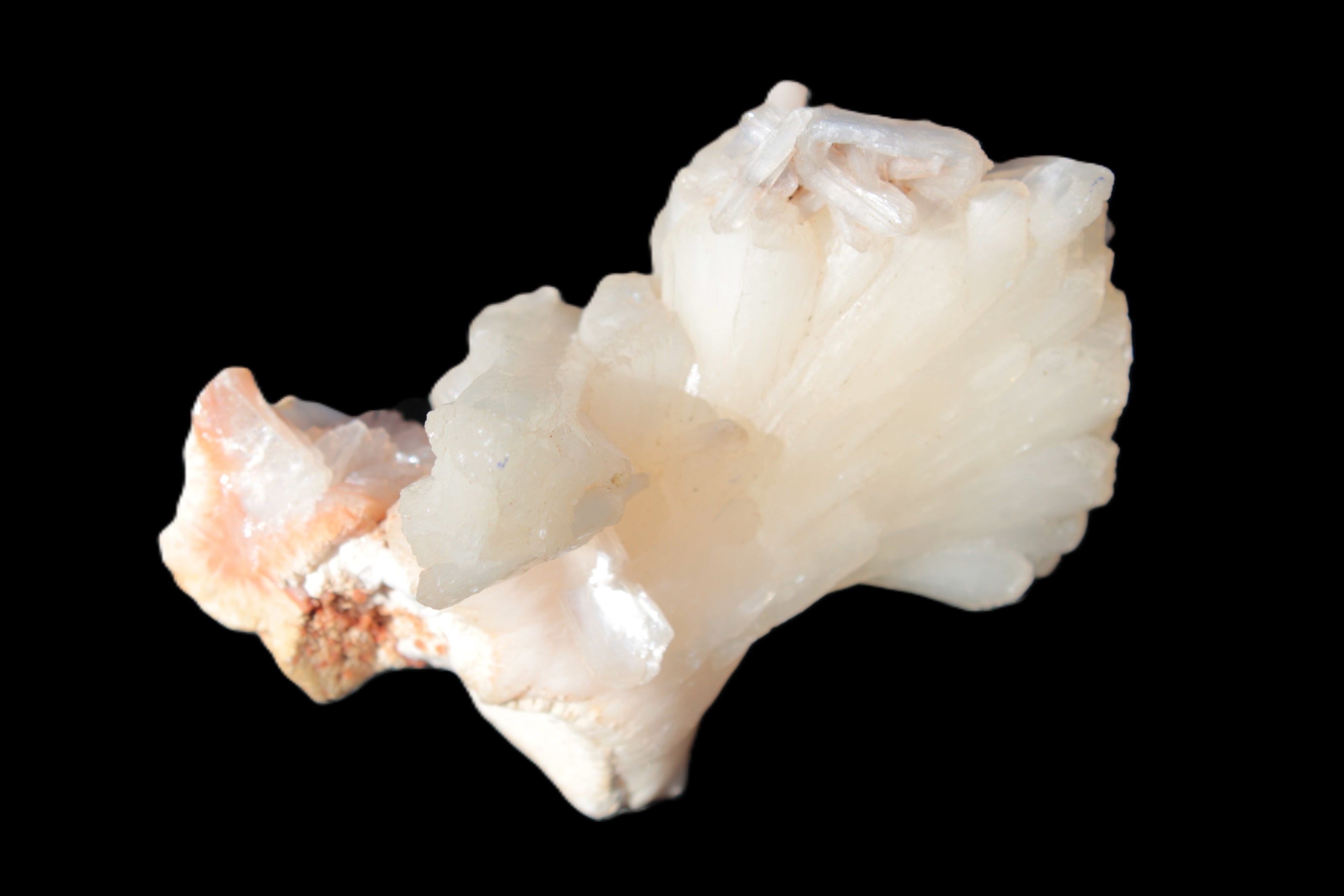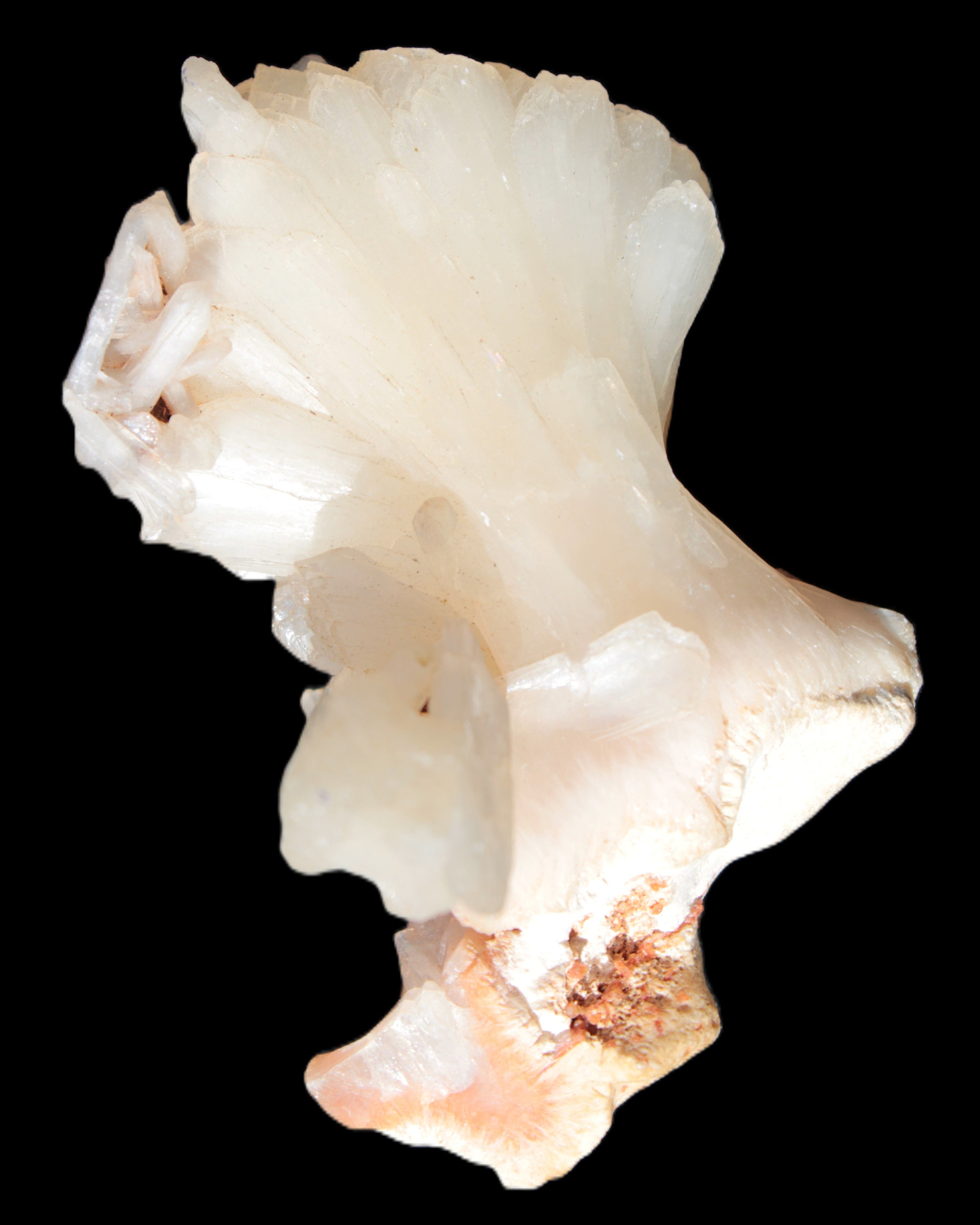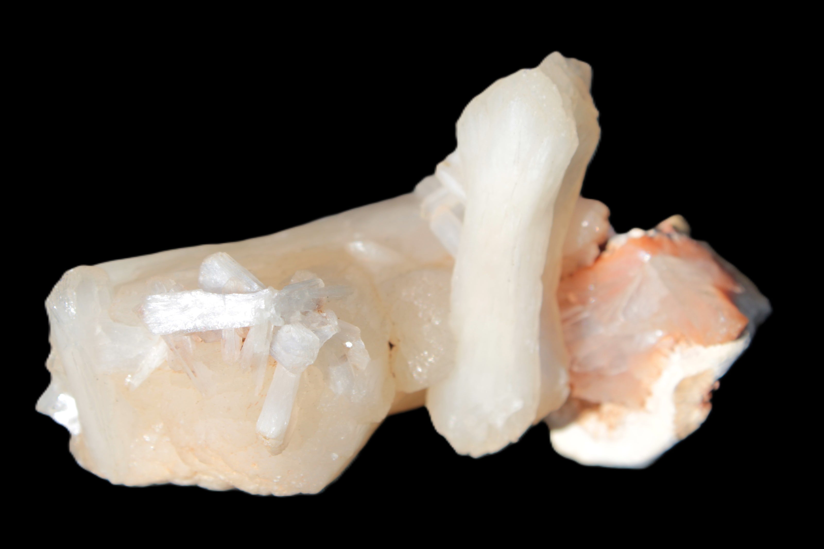This Apophyllite and Calcite Zeolite is amazing. It wears a bowtie. Zeolites like this form in basalt vesicles, which is a cavity formed by escaping gases as the molten rock flows and cools. The reaction to UV light suggests the base is red Calcite, rather than Heulandite. The Bowtie may be Stilbite. Both of these minerals are also Zeolite minerals. Zeolites have incredible chemical and energetic properties. This makes prized in both manufacturing and metaphysical applications.