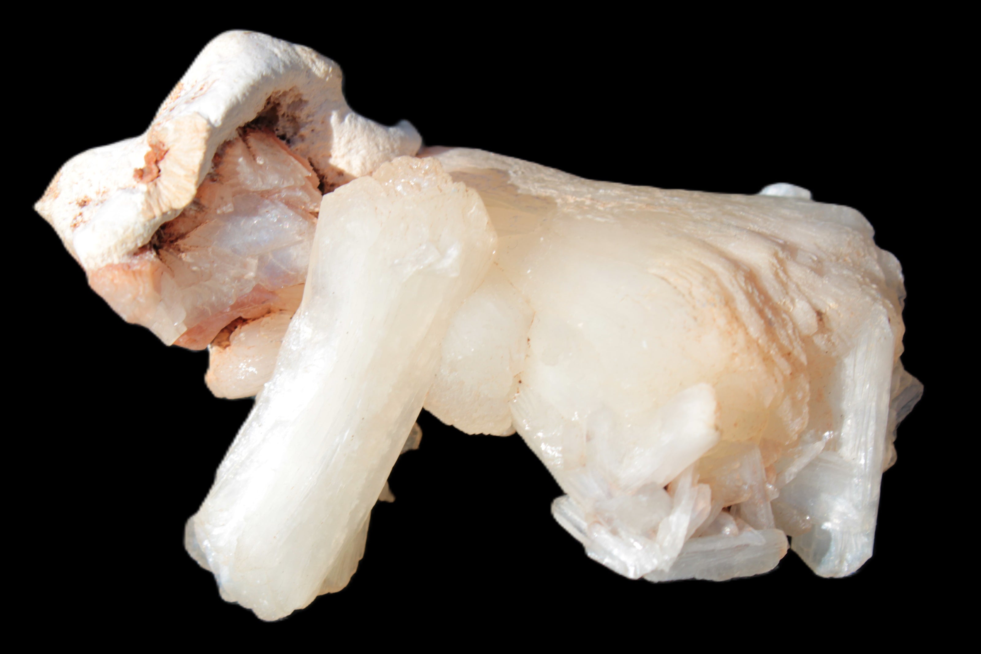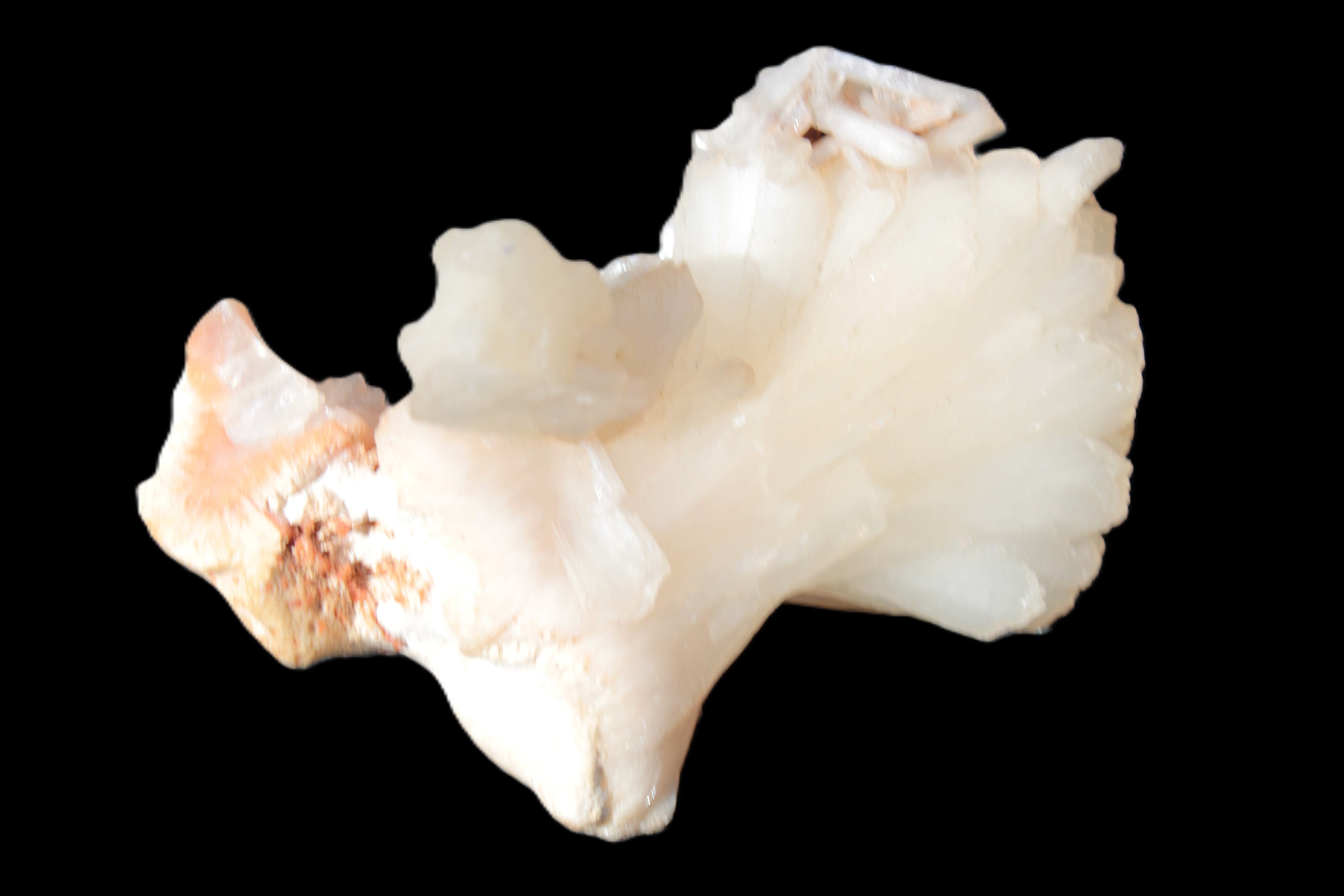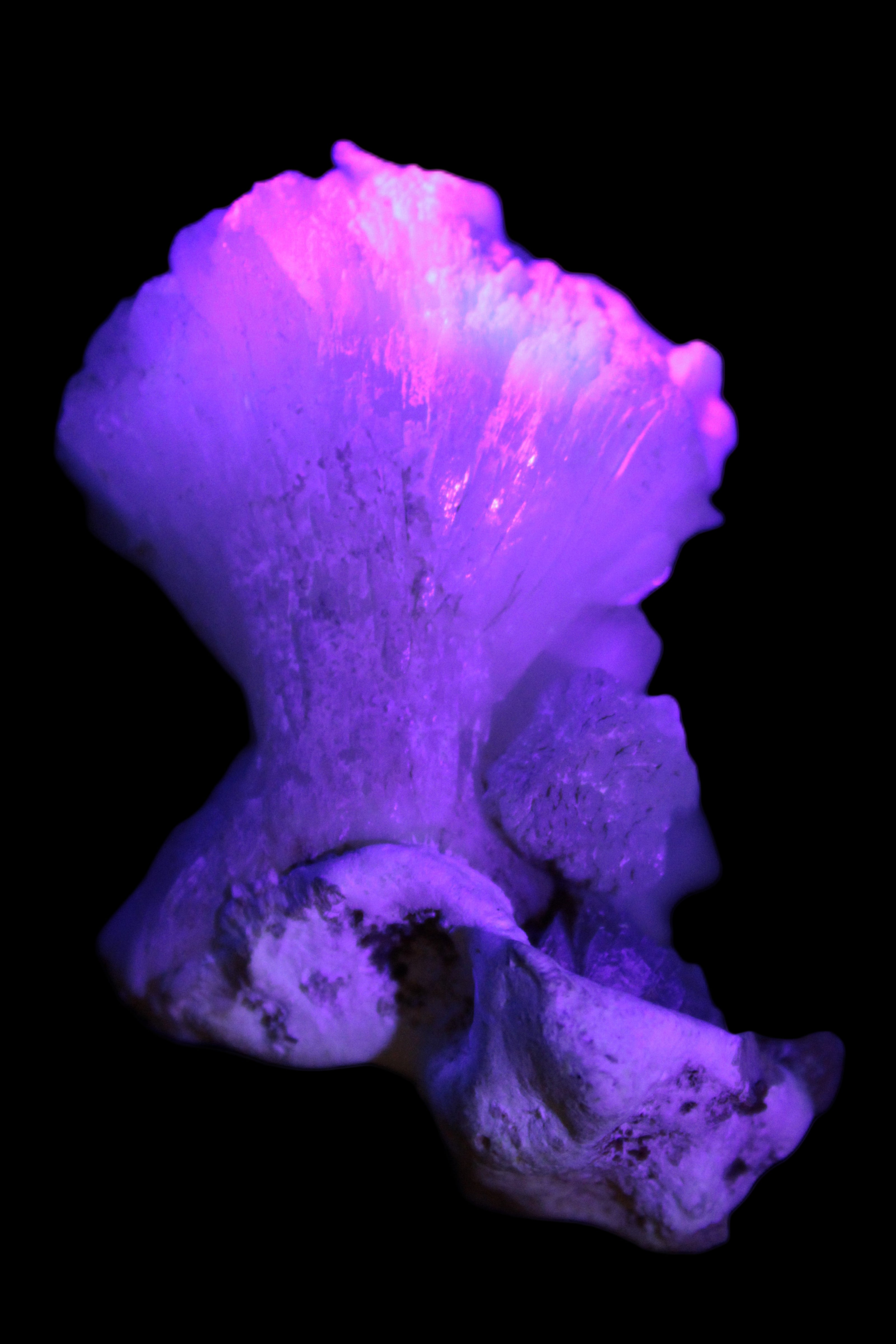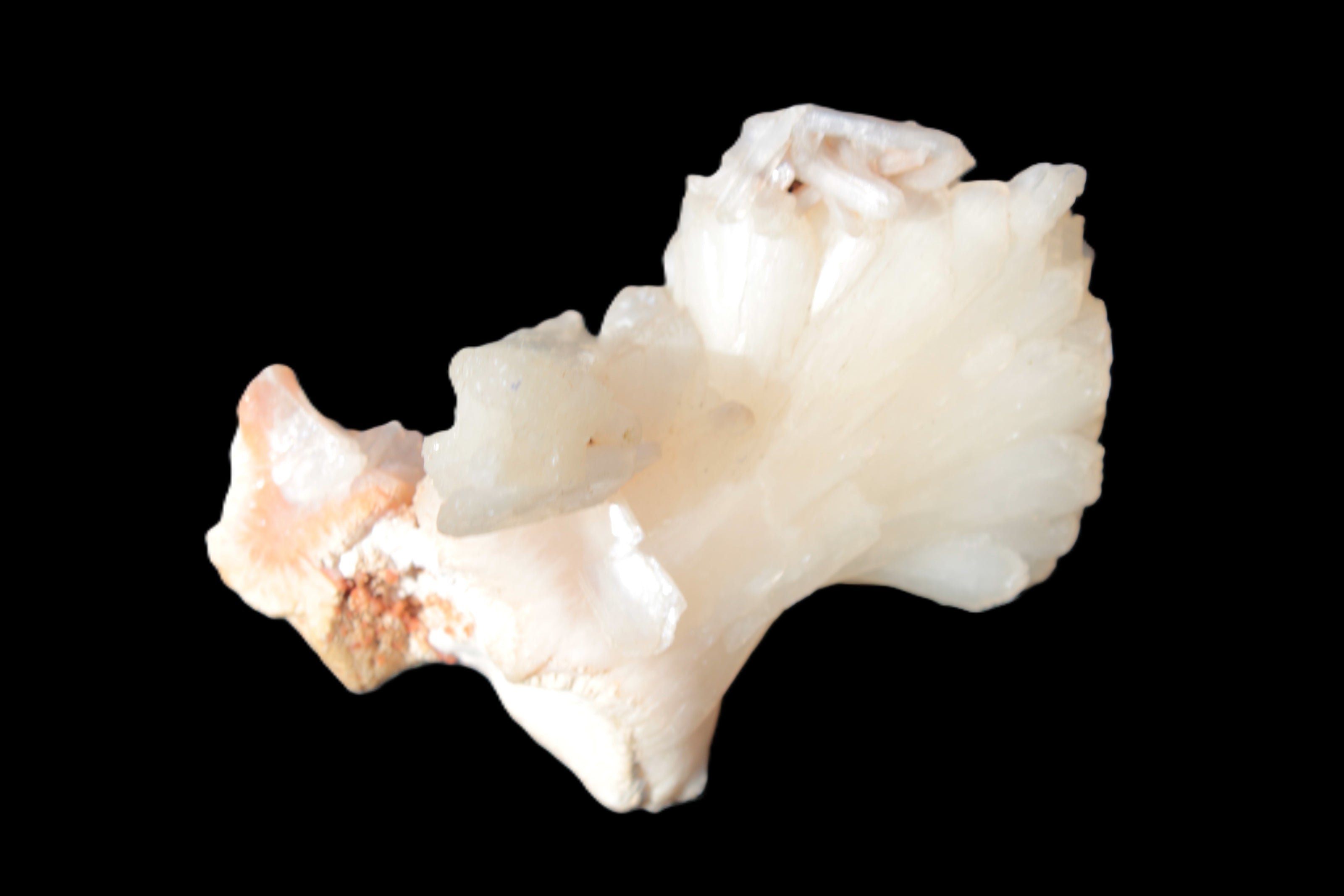 This Apophyllite and Calcite Zeolite is amazing. It wears a bowtie. Zeolites like this form in basalt vesicles, which is a cavity formed by escaping gases as the molten rock flows and cools. The reaction to UV light suggests the base is red Calcite, rather than Heulandite. The Bowtie may be Stilbite. Both of these minerals are also Zeolite minerals. Zeolites have incredible chemical and energetic properties. This makes prized in both manufacturing and metaphysical applications.