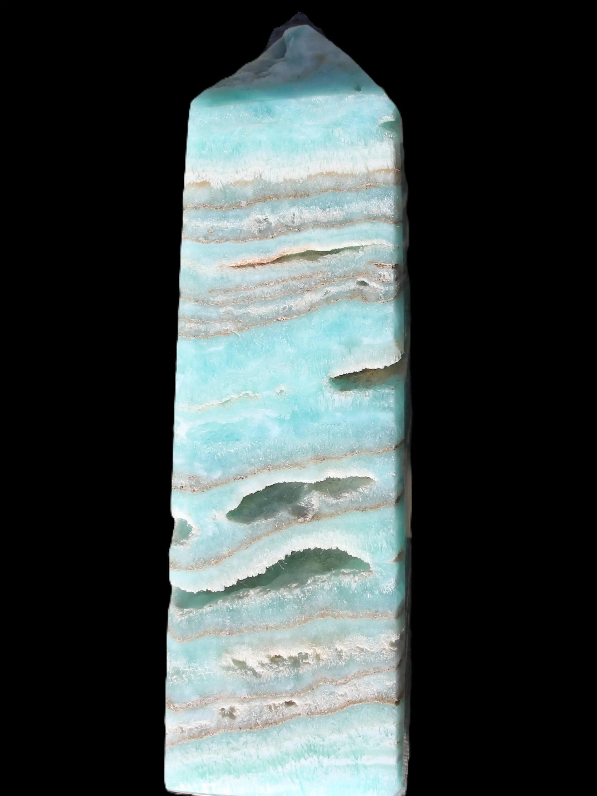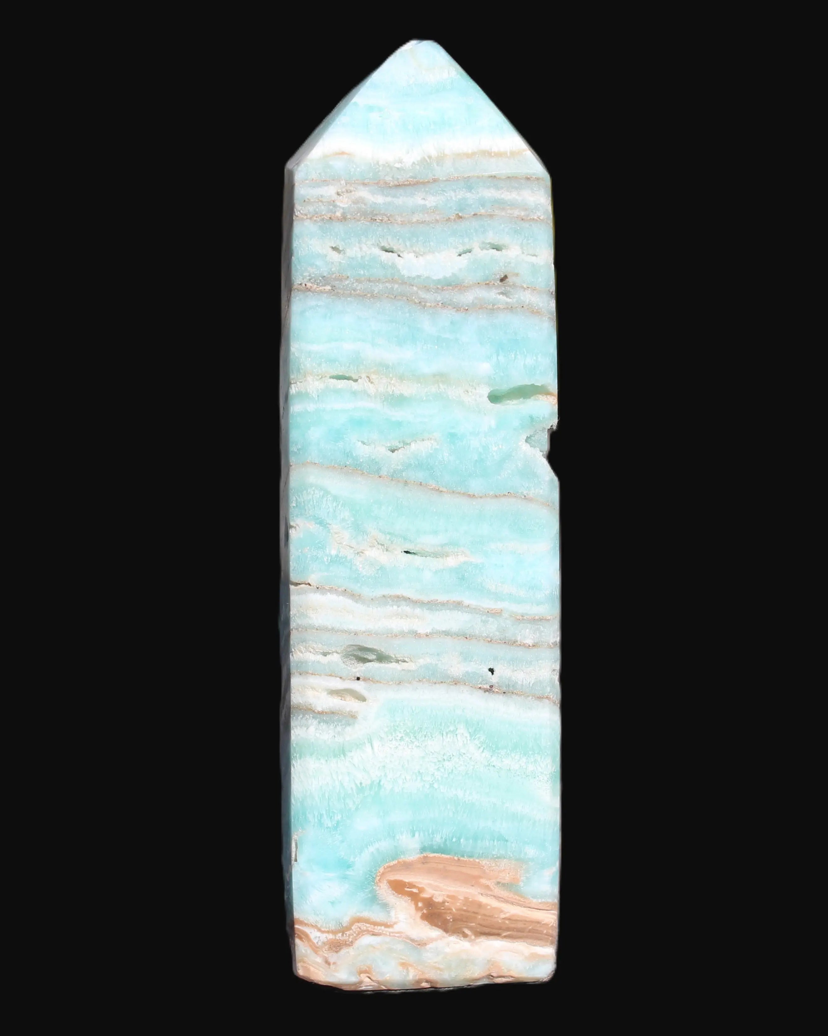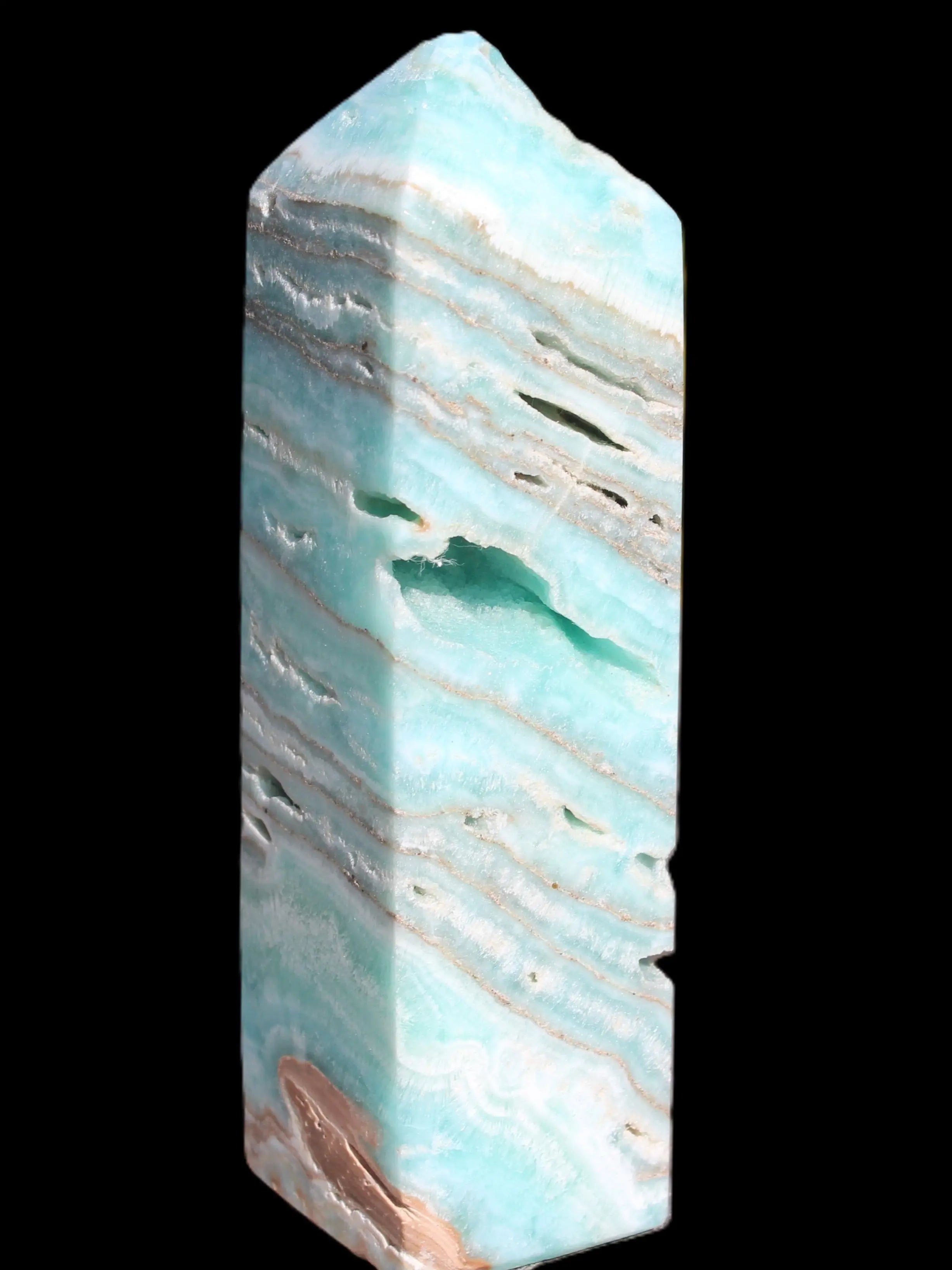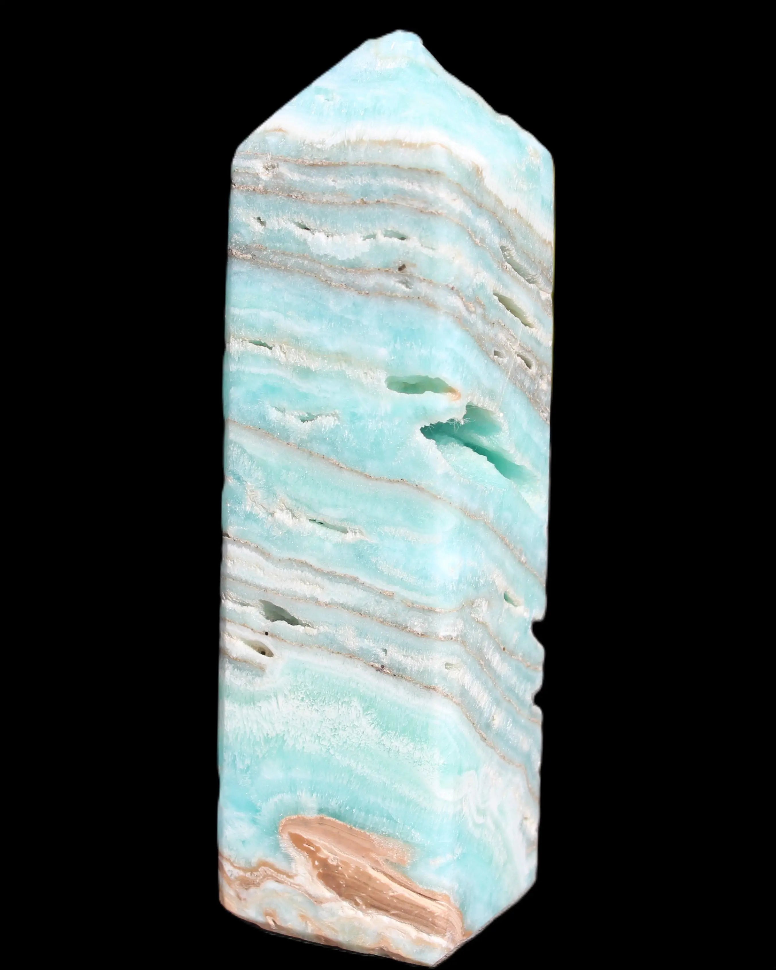 This Aqua Blue Caribbean Calcite obelisk 292g is a stunning example of the majesty of Caribbean Calcite. Caribbean Calcite is a form of Aragonite.  This is a calcium carbonate mineral, formed in limestone caves and around hot springs.