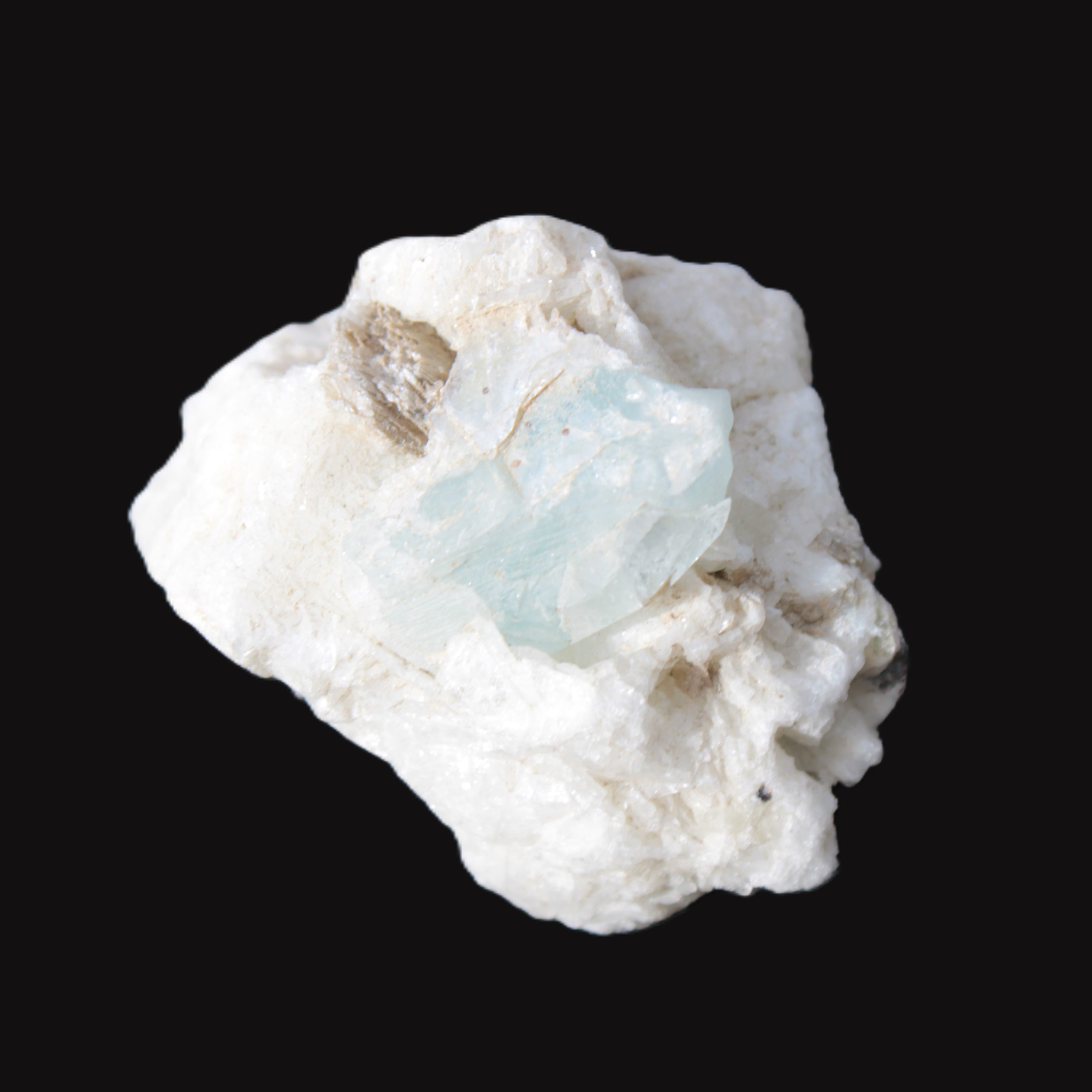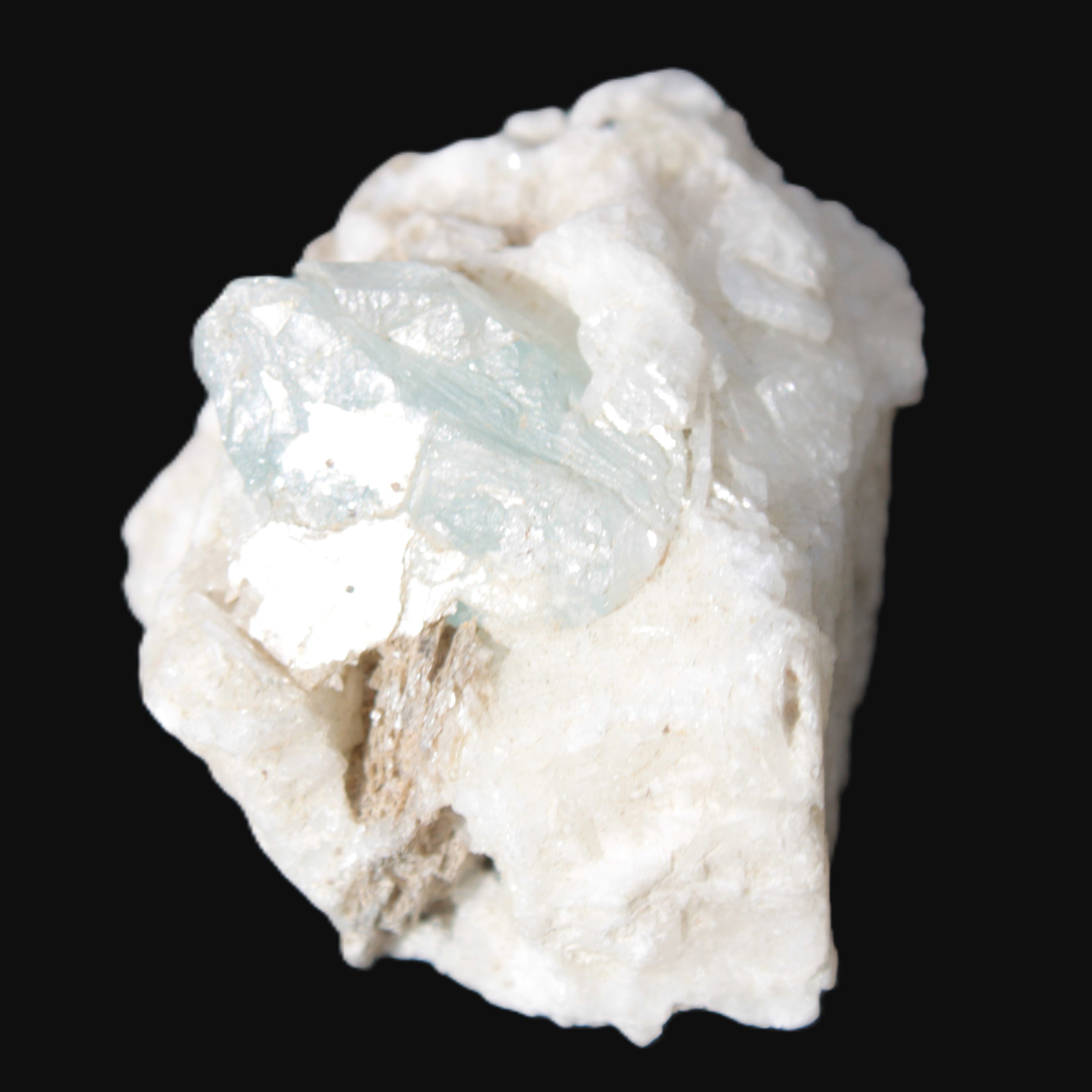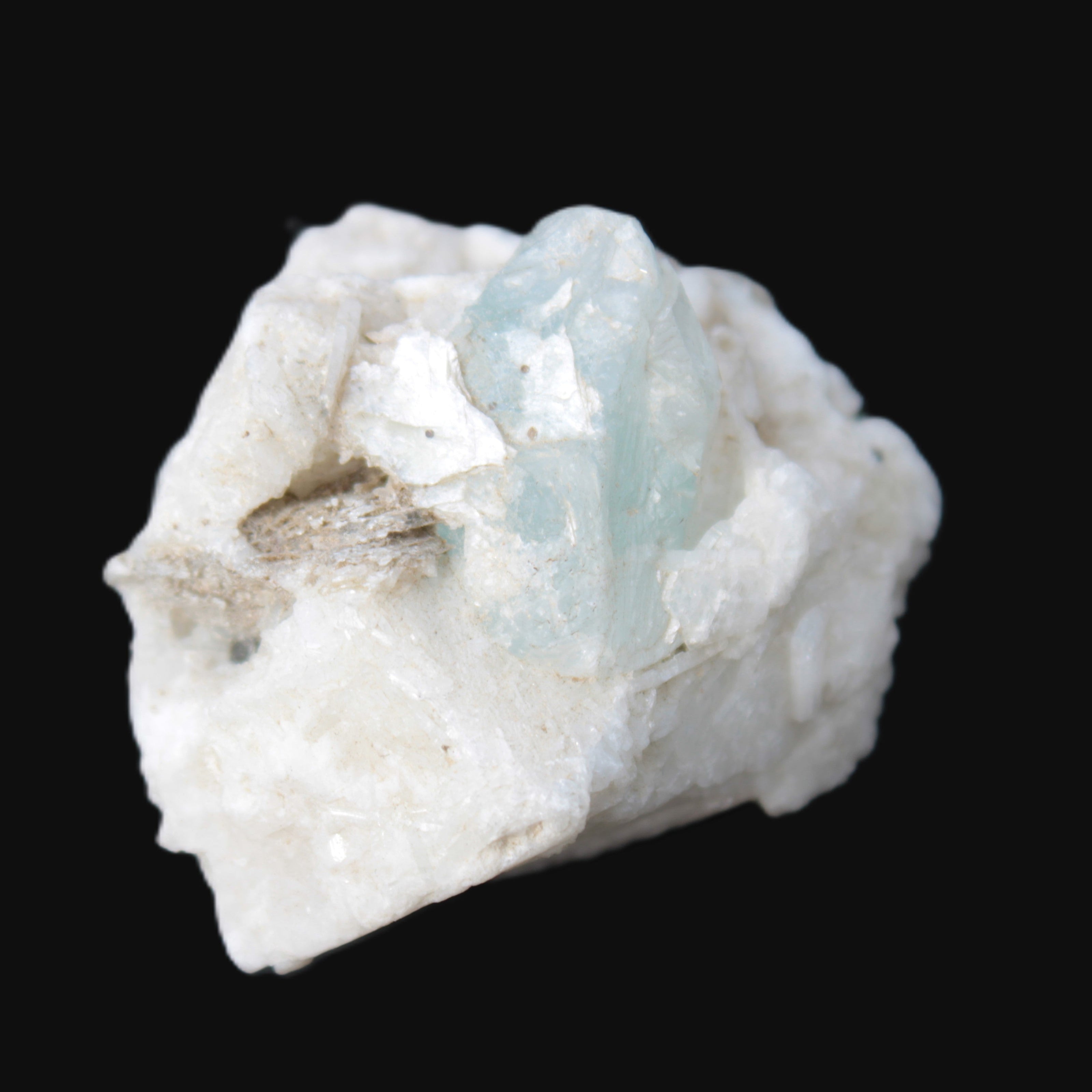 This Aquamarine with three Micas in Feldspar matrix weighs 311ct or 62.3g. Its original conditions of variable heat, pressure and supply of elements resulted in the formation of Aquamarine and (at least) three different micas in a Feldspar matrix. The three Micas that are readily recognisable are Lepidolite, Muscovite and Phlogopite.