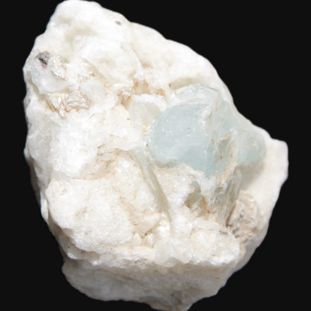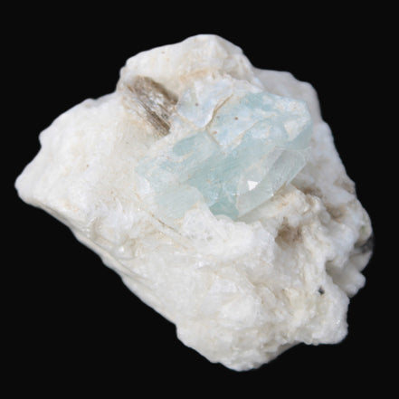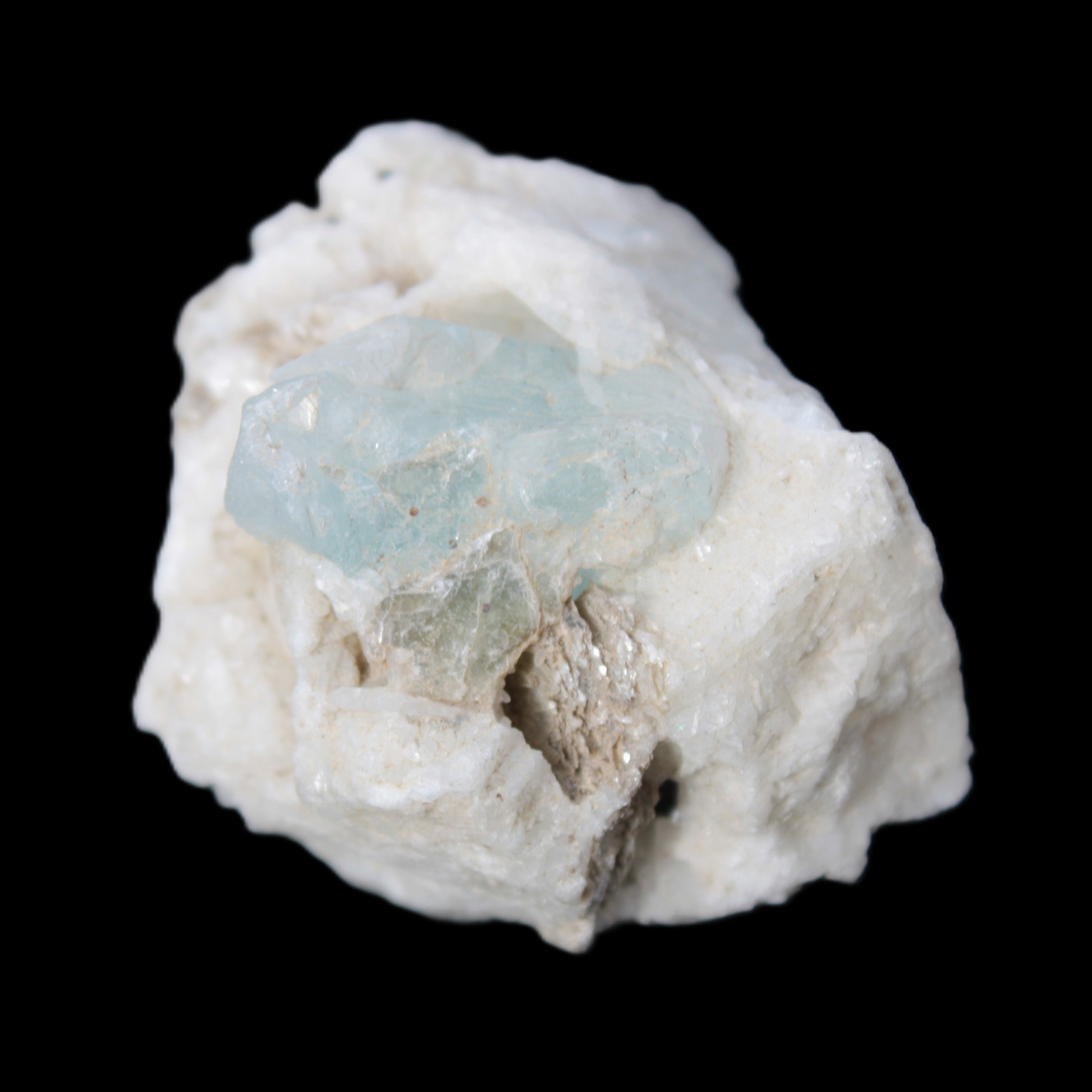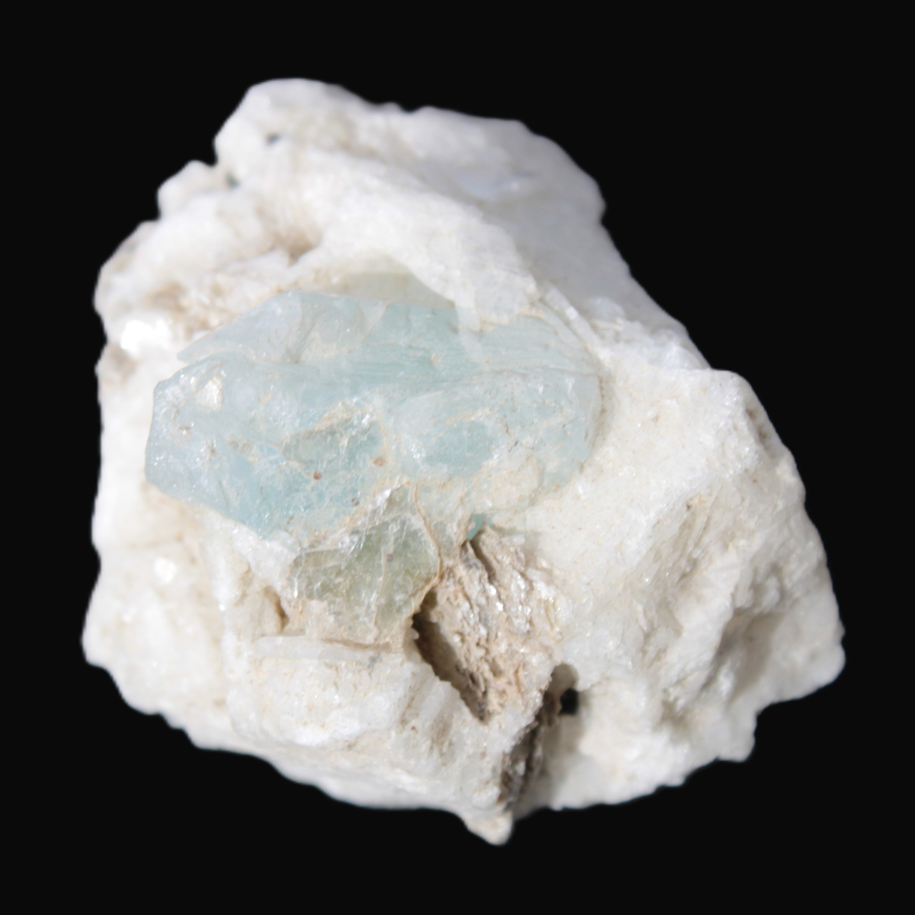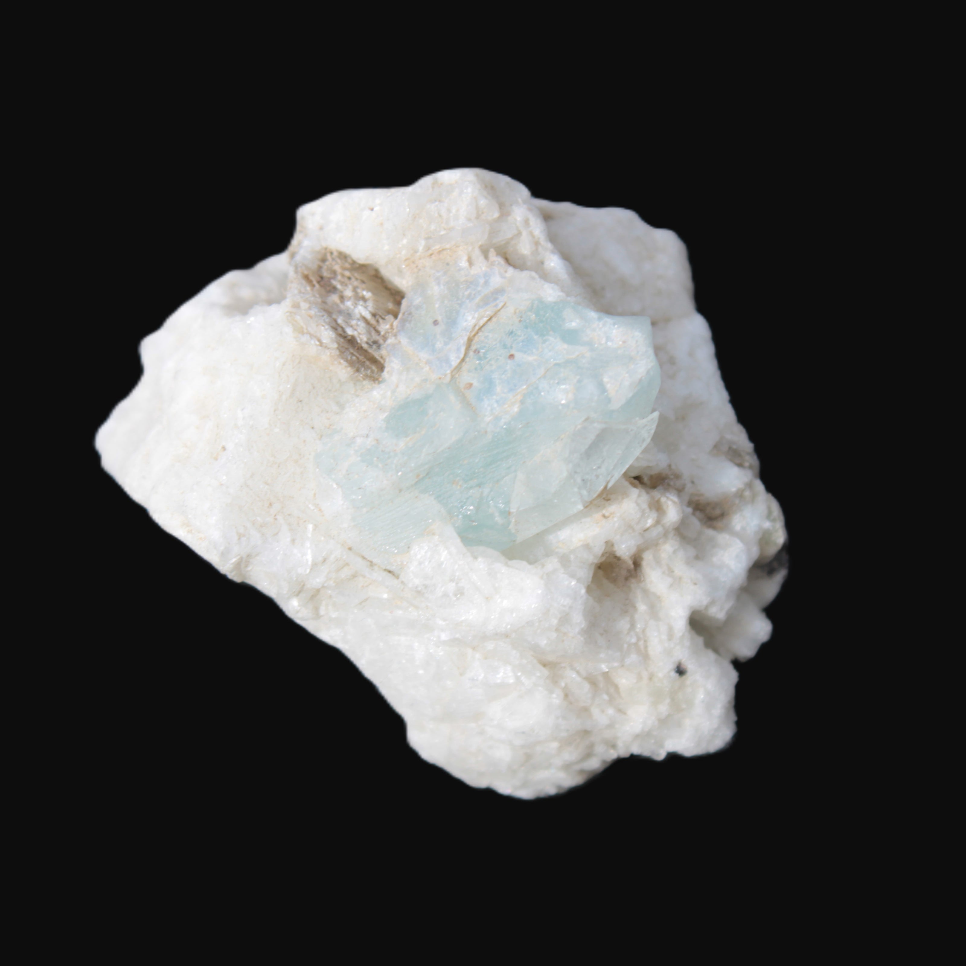 This Aquamarine with three Micas in Feldspar matrix weighs 311ct or 62.3g. Its original conditions of variable heat, pressure and supply of elements resulted in the formation of Aquamarine and (at least) three different micas in a Feldspar matrix. The three Micas that are readily recognisable are Lepidolite, Muscovite and Phlogopite.
