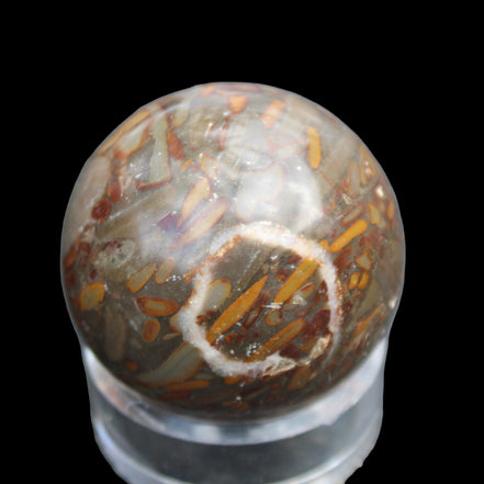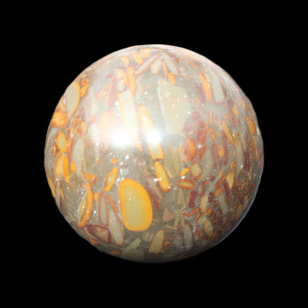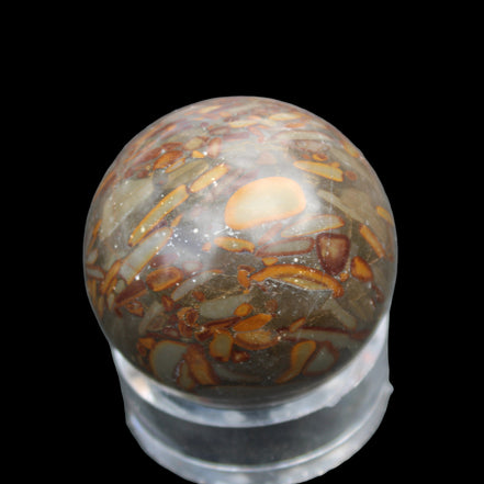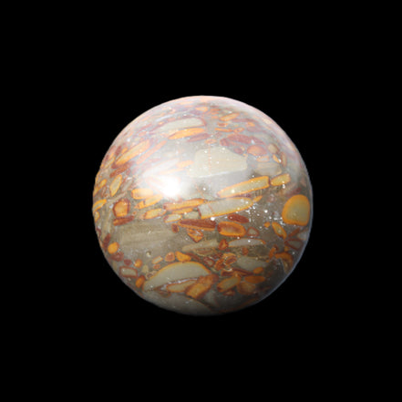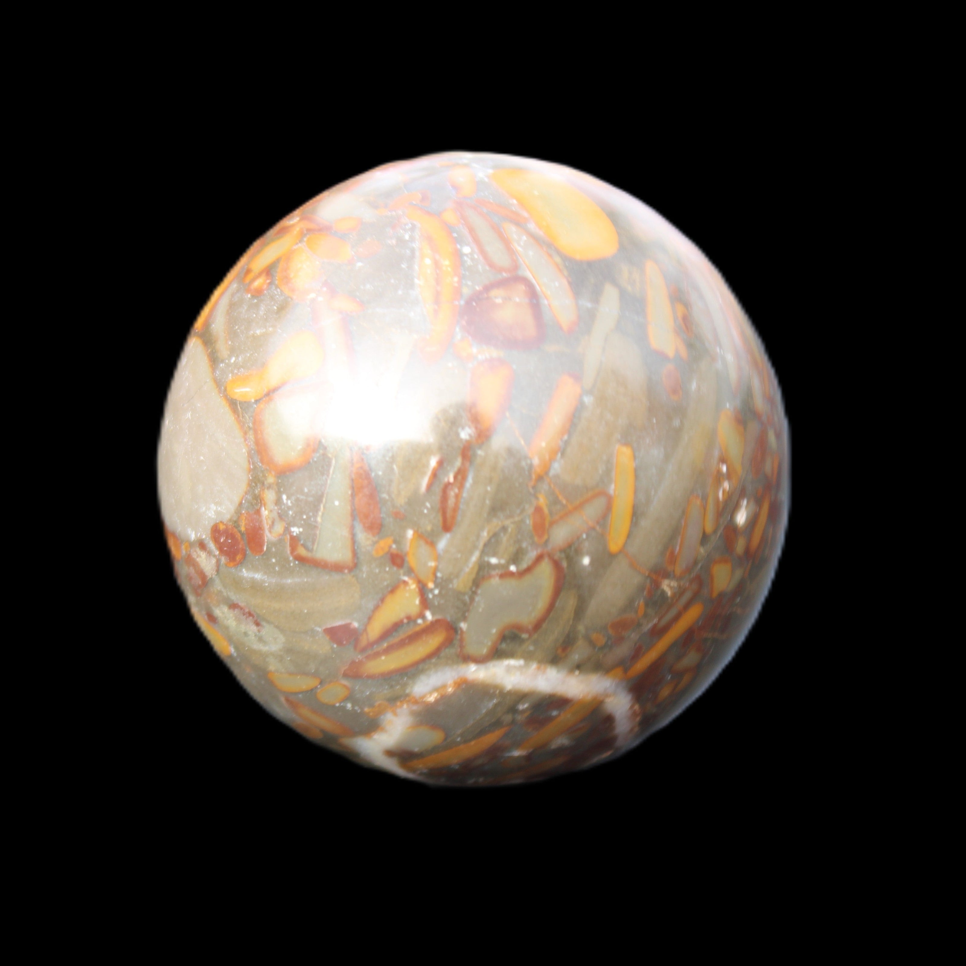 This small Bamboo Leaf Jasper sphere weighs 175g. It is 45mm in diameter. Bamboo Leaf Jasper is also known as Bamboo Leaf Jade or Bamboo Leaf Agate. Bamboo Leaf Jasper is an unusual stone with strong, and grounding healing energies. Bamboo Leaf Jasper is formed from a conglomerate of sandstone structures in a silica matrix. The elevated level of impurities gives it a mix of colours: yellow, light brown, deep brown and tan. The surface inclusions and fissures refract, transmit and reflect light. Bamboo Leaf Jasper protects against negativity, helping one to remain grounded. The healing properties of Bamboo Leaf Jasper encourage inner peace and self-acceptance.