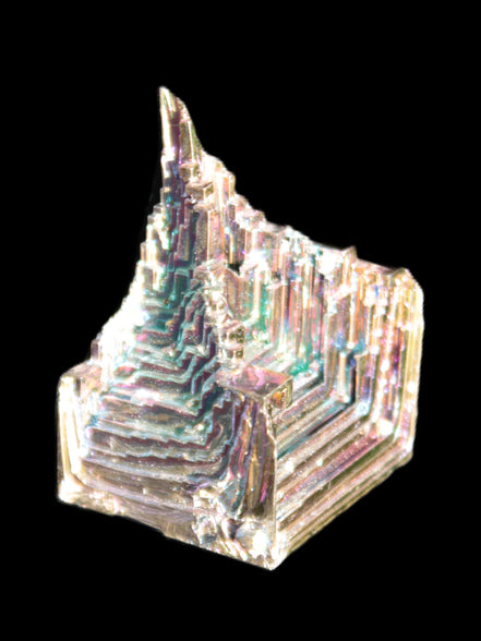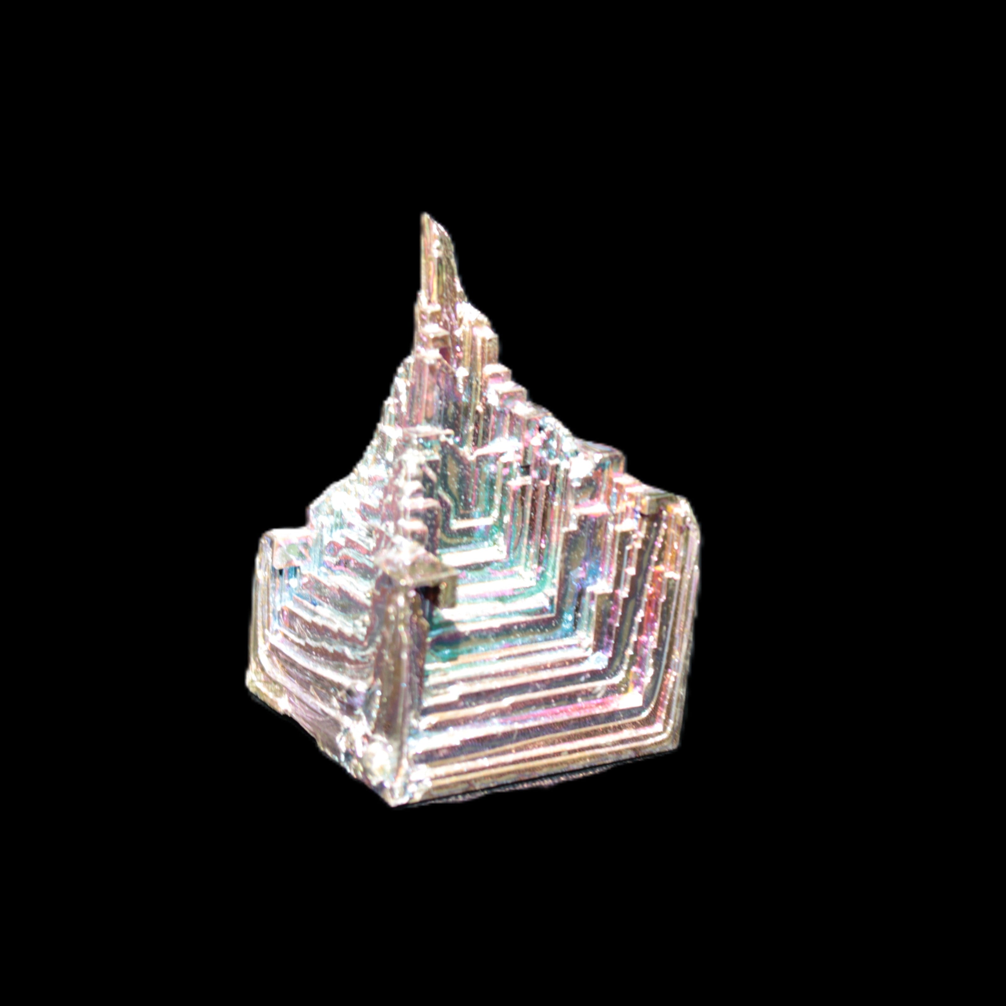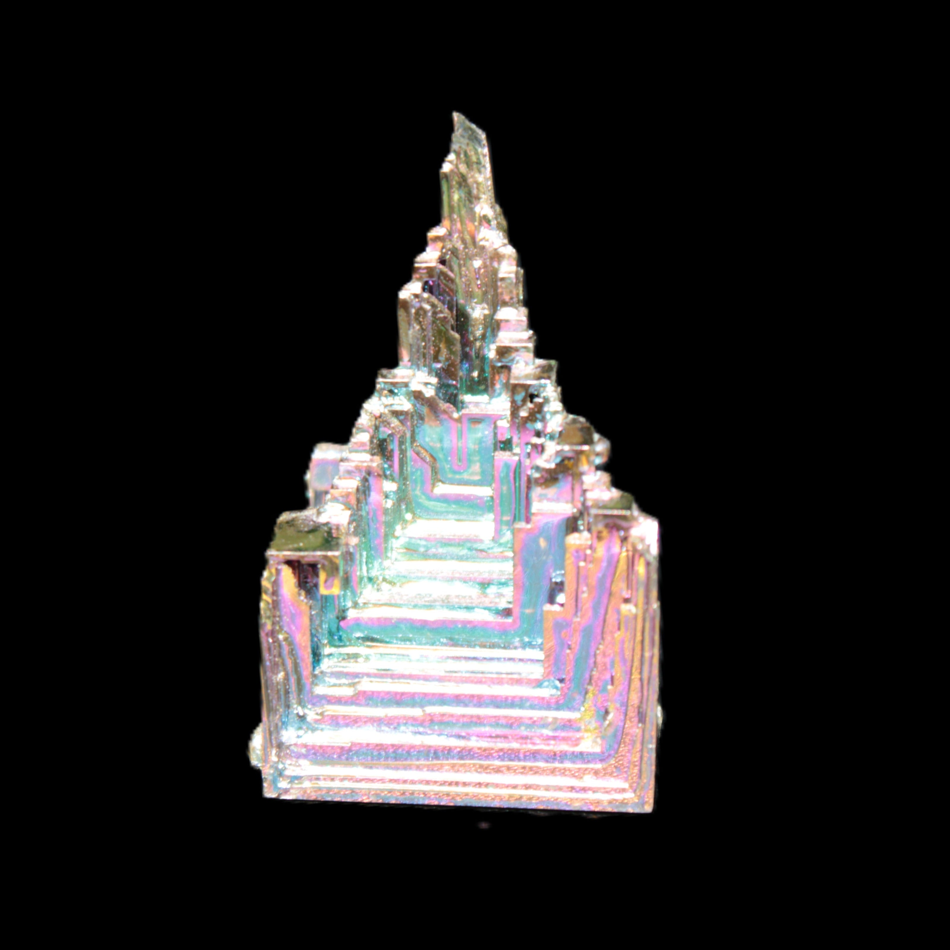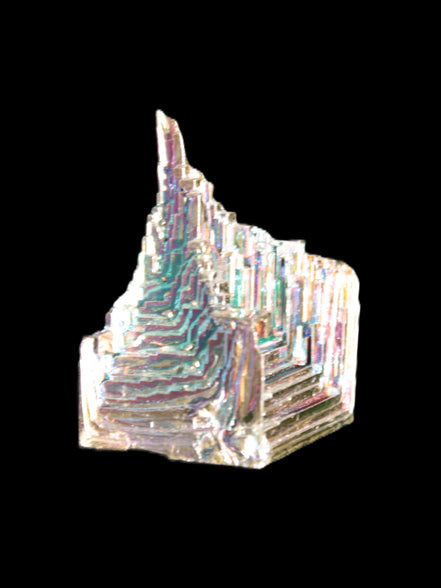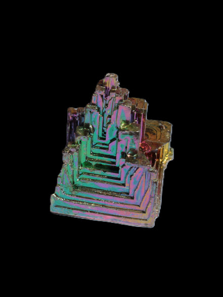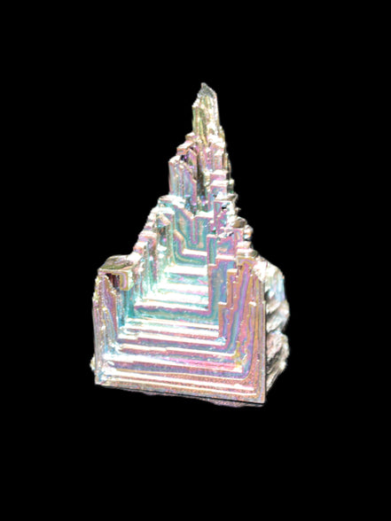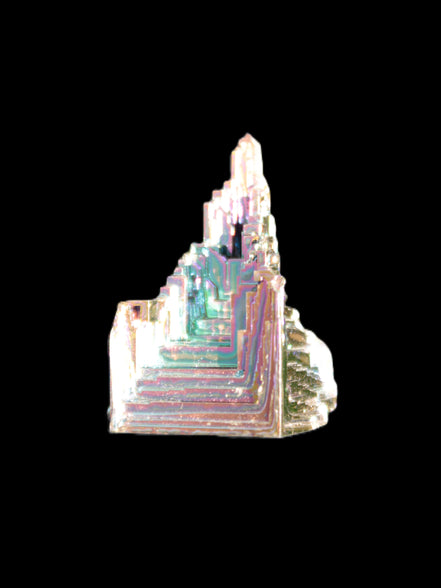 This Bismuth castle crystal 26-41g selection features this amazing metalloid with its crystal formation. Bismuth is a crystalline, brittle metalloid, number 83 on the Periodic Table. It is silvery-white with an iridescent hue. These Bismuth crystals have been lab-created.