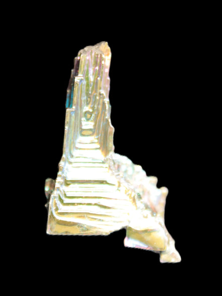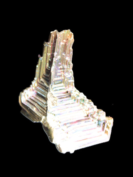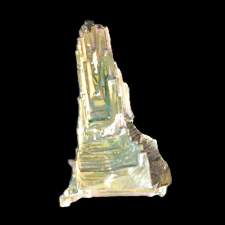 This engrossing Bismuth castle crystal is 45mm tall and weighs 43.4g. It shows off well this amazing metalloid with its intricate and engaging crystal formation. Bismuth is a crystalline, brittle metalloid, number 83 on the Periodic Table. It is silvery-white with an iridescent hue. These Bismuth crystals have been lab-created.