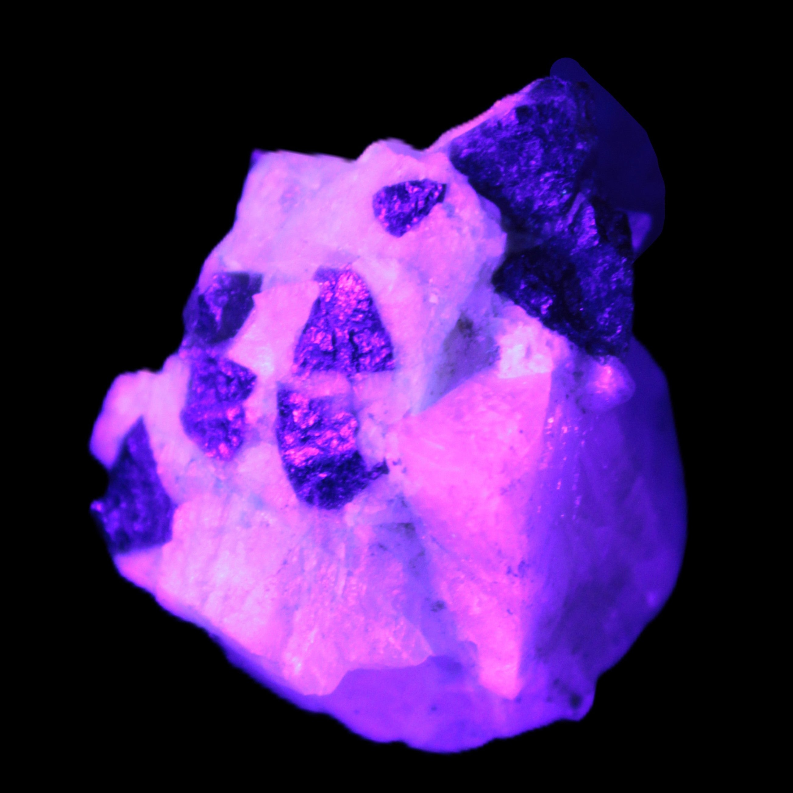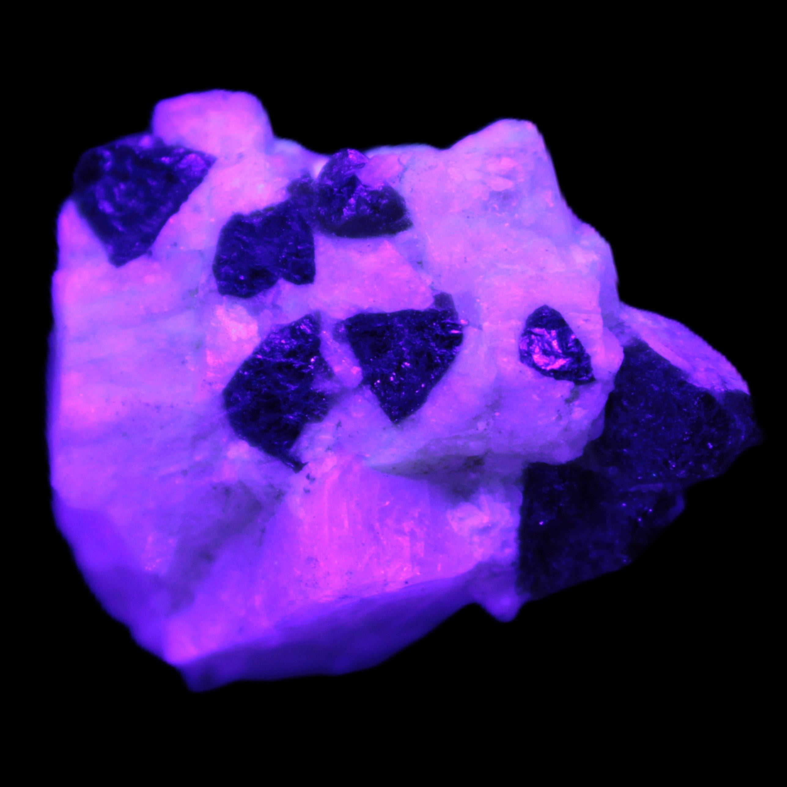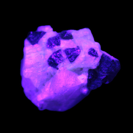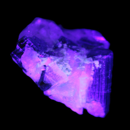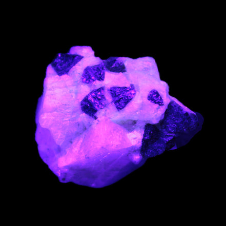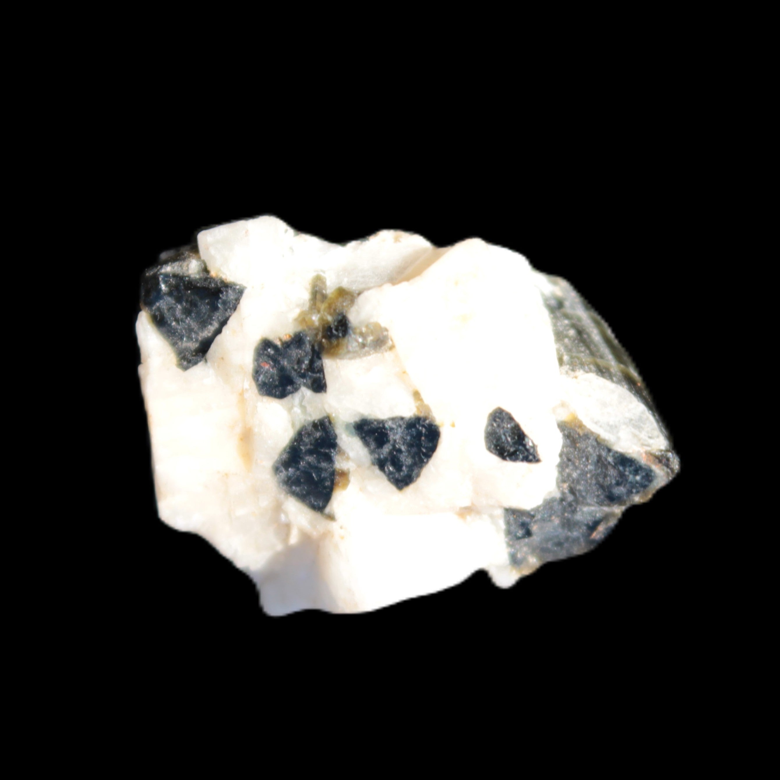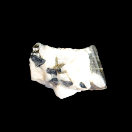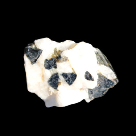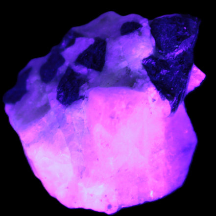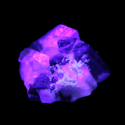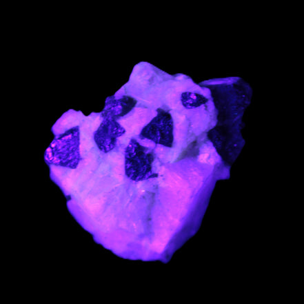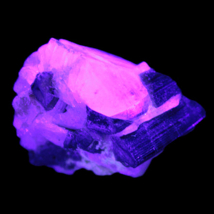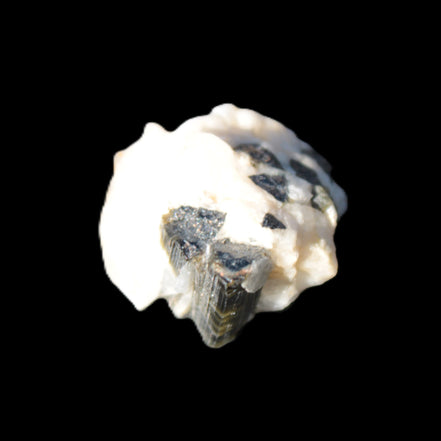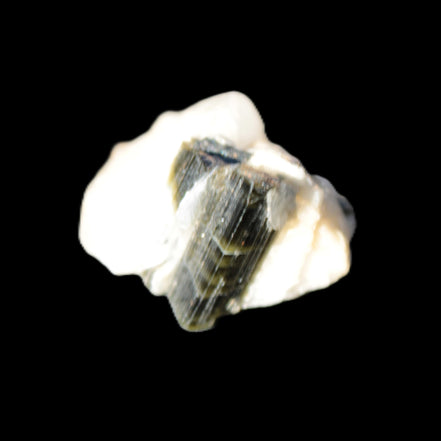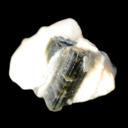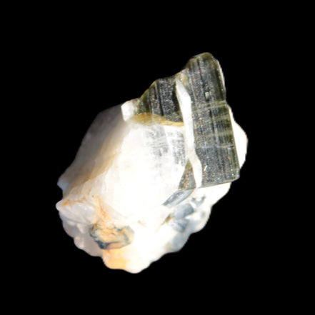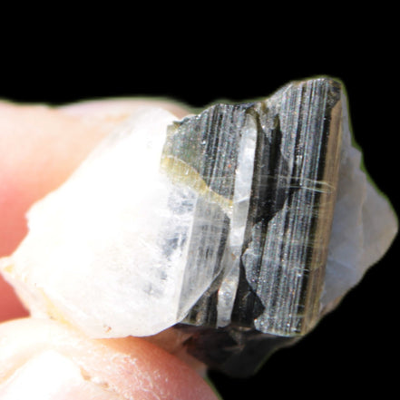 This natural Black Green Tourmaline cluster in Feldspar matrix was sourced in Afghanistan for Rocks and Things Store. It is 25mm in width and weighs 10g. rare black Elbaite cluster, not Black Tourmaline. The Elbaite crystals are encased and astride a Clear Calcite crystal (17mm). There is a strong fluorescent reaction to UV light by a trace element or mineral that is not obvious in sunlight.