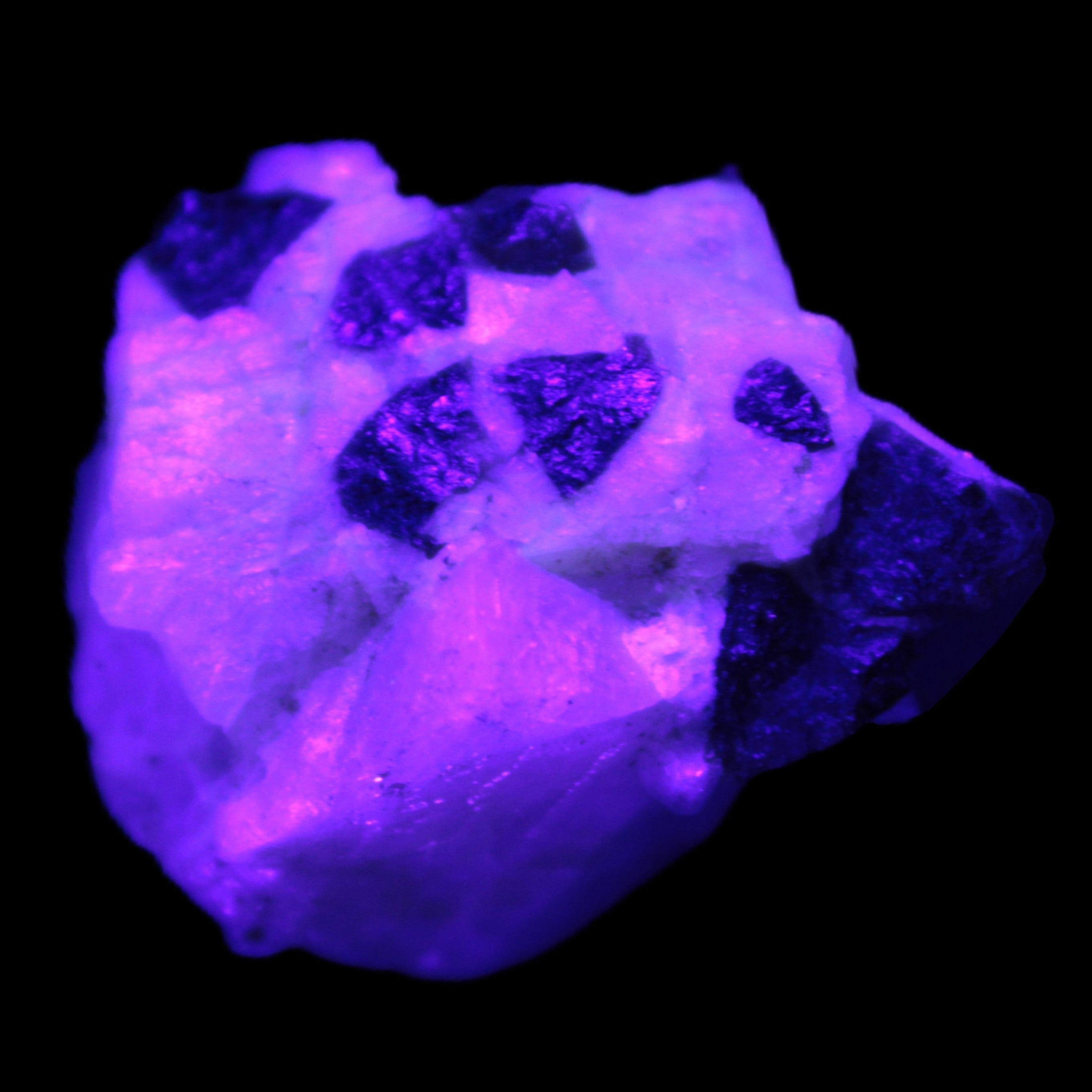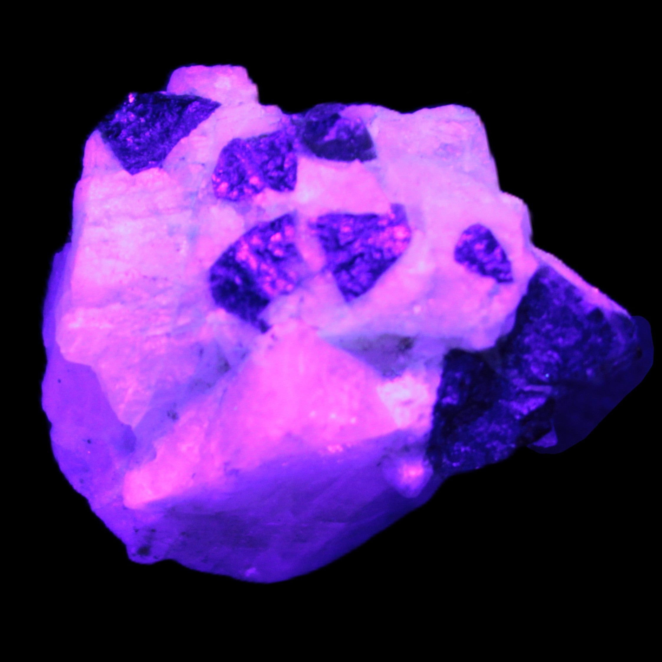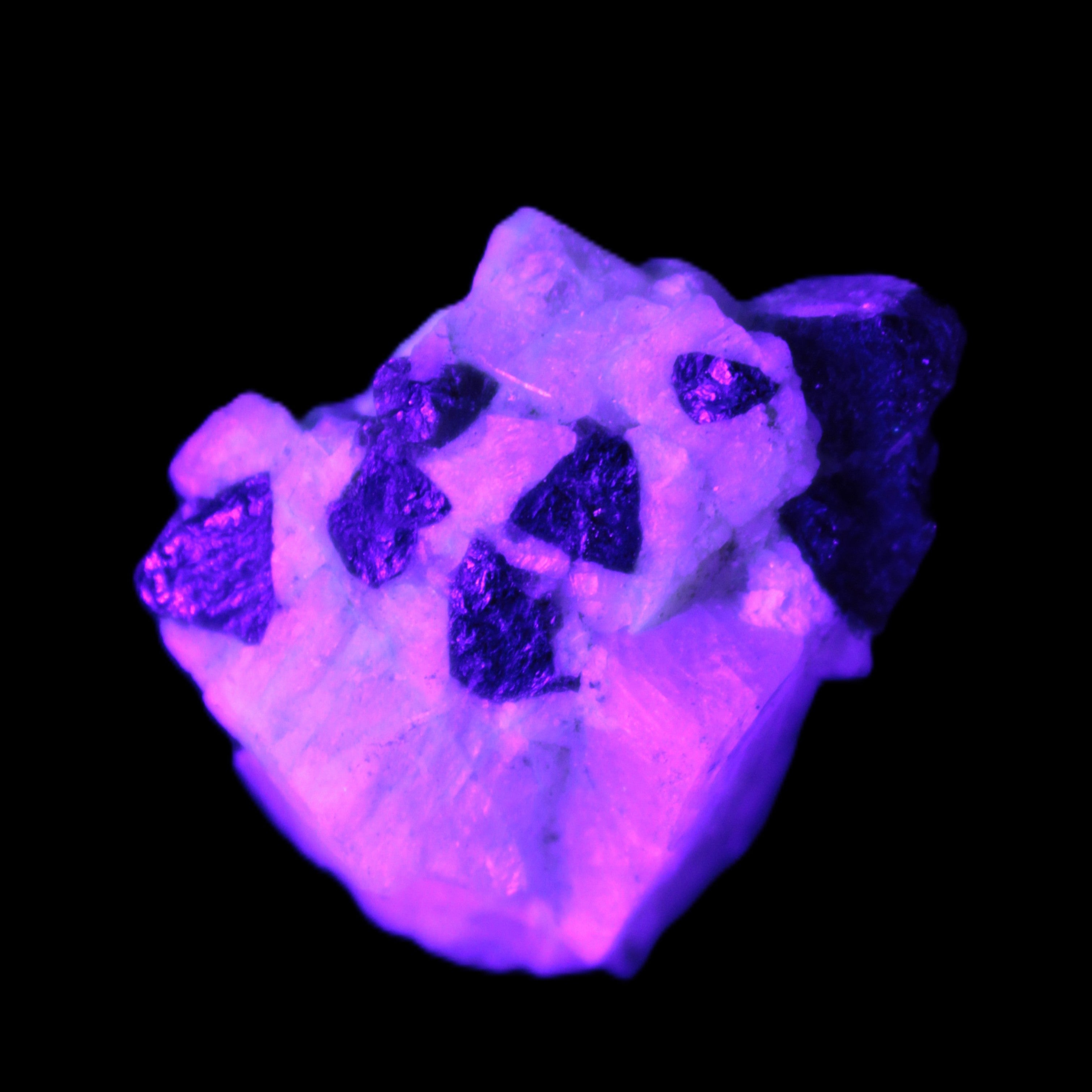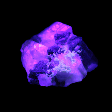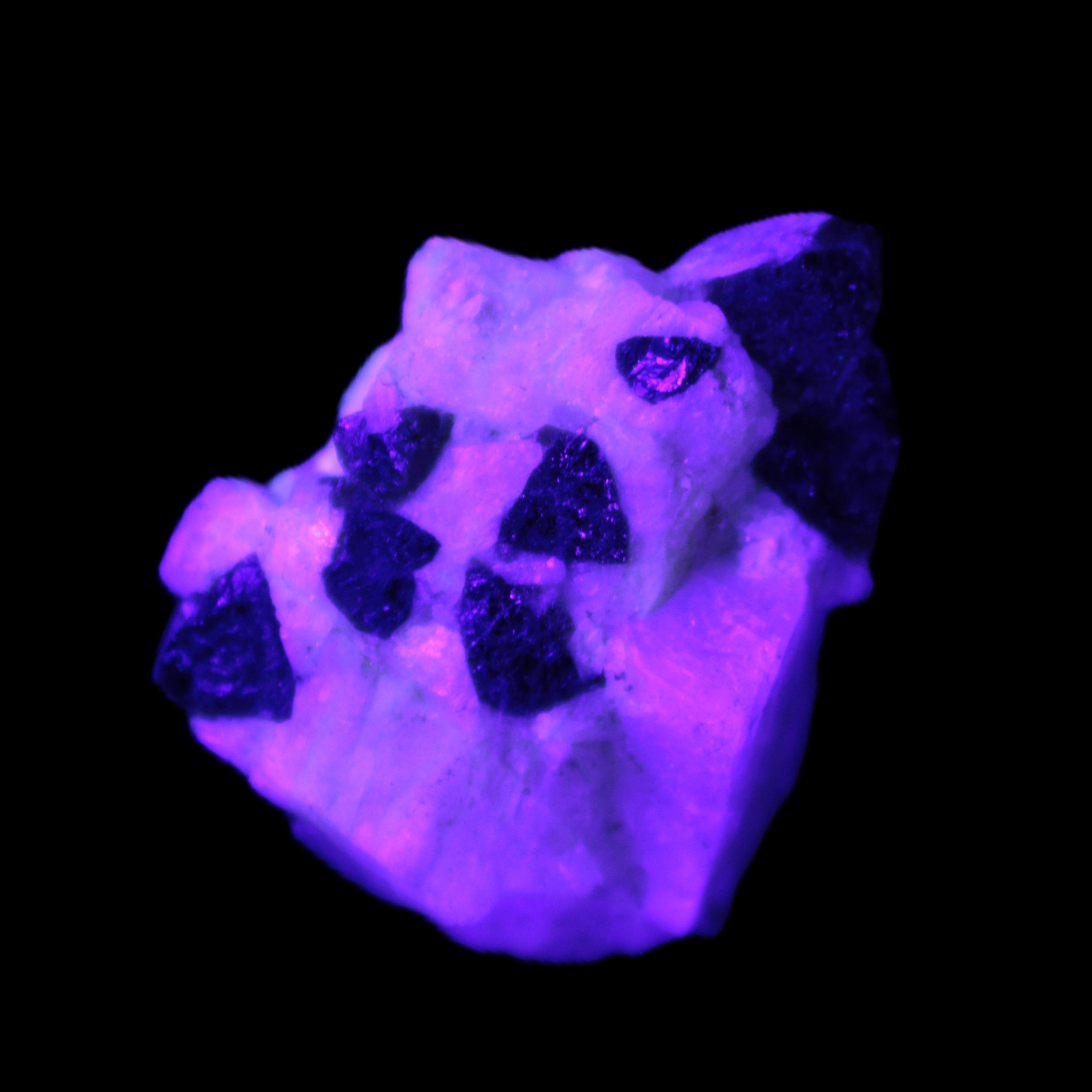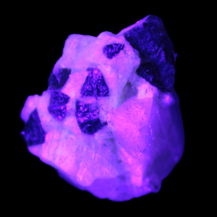 This natural Black Green Tourmaline cluster in Feldspar matrix was sourced in Afghanistan for Rocks and Things Store. It is 25mm in width and weighs 10g. rare black Elbaite cluster, not Black Tourmaline. The Elbaite crystals are encased and astride a Clear Calcite crystal (17mm). There is a strong fluorescent reaction to UV light by a trace element or mineral that is not obvious in sunlight.