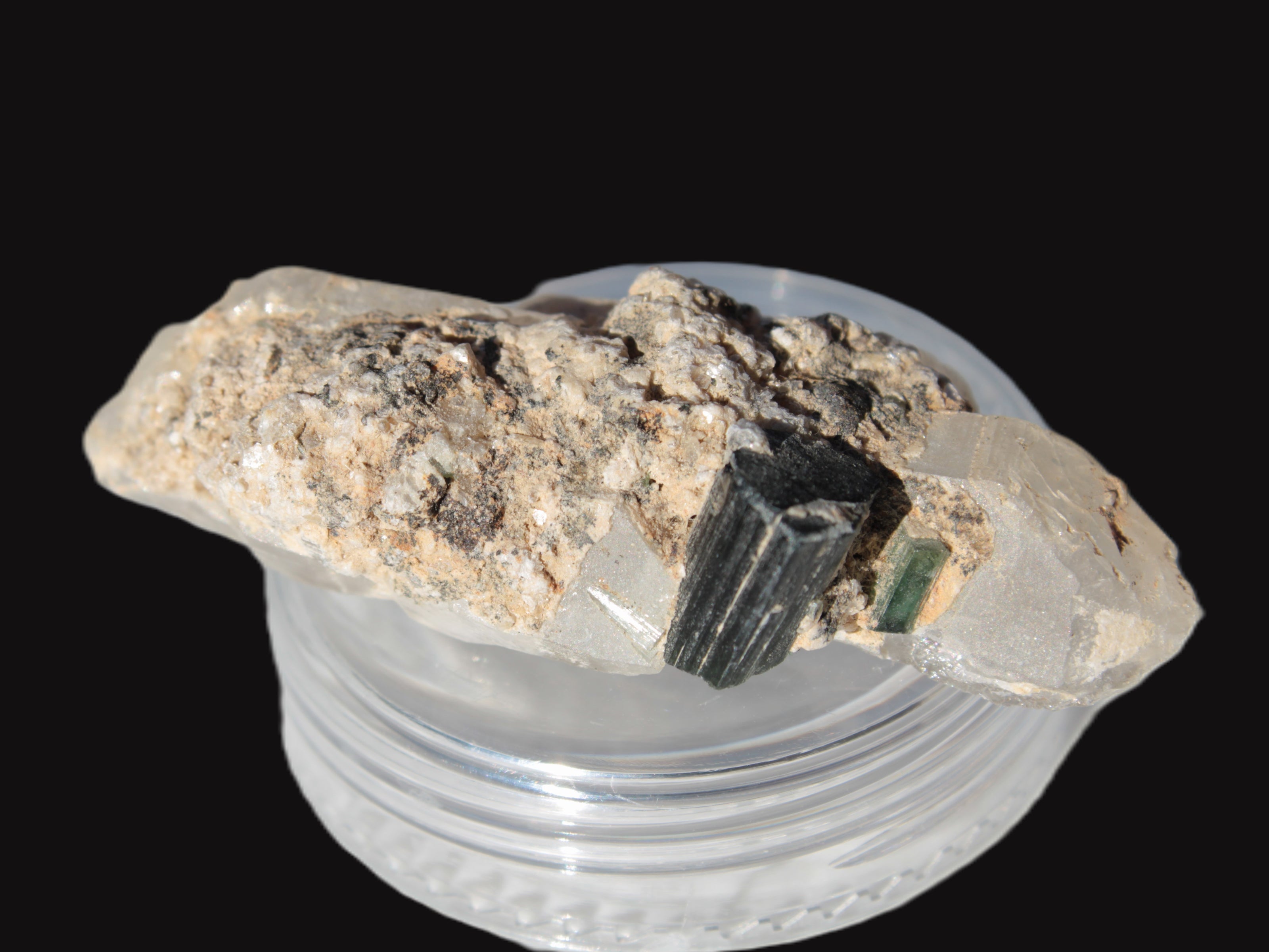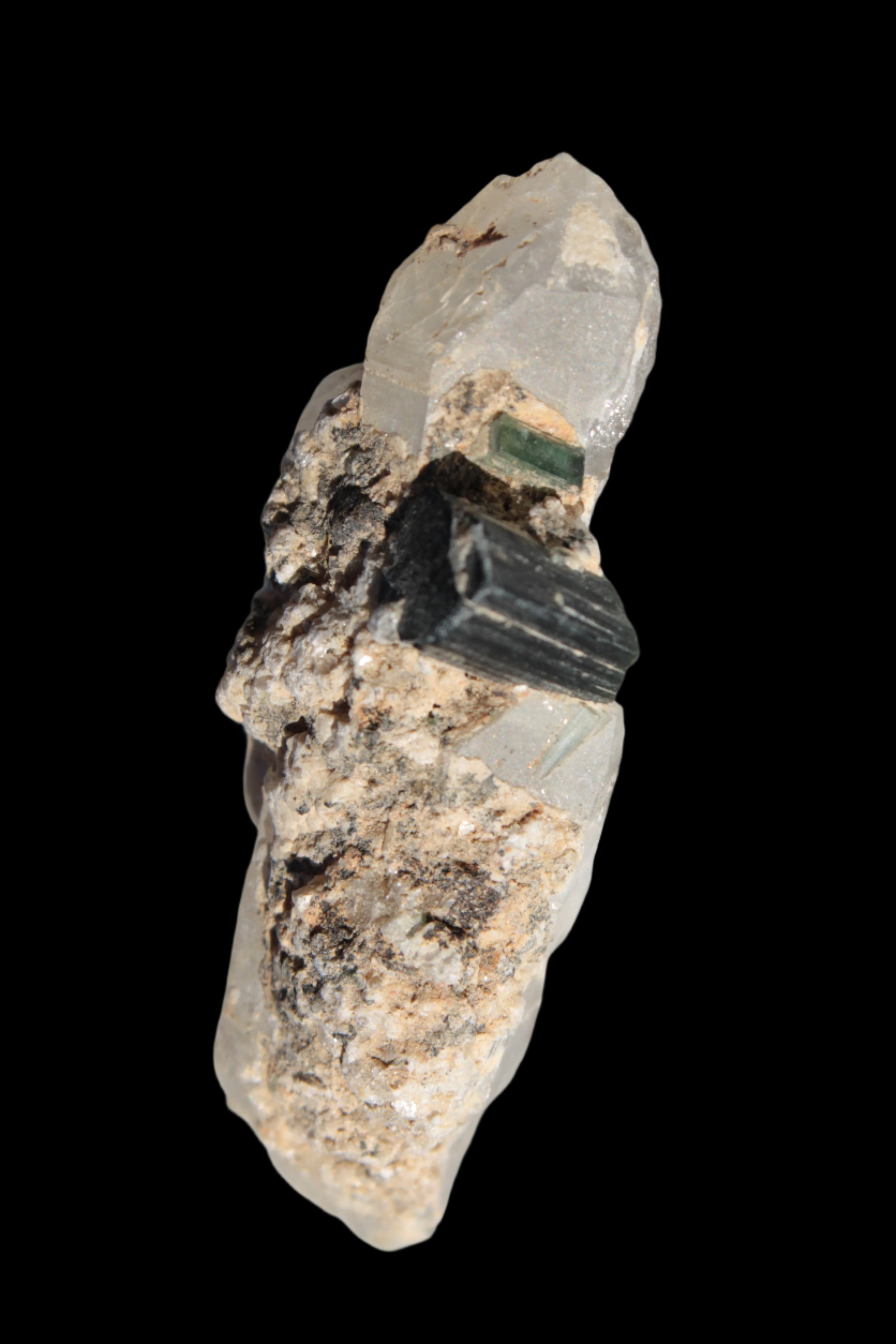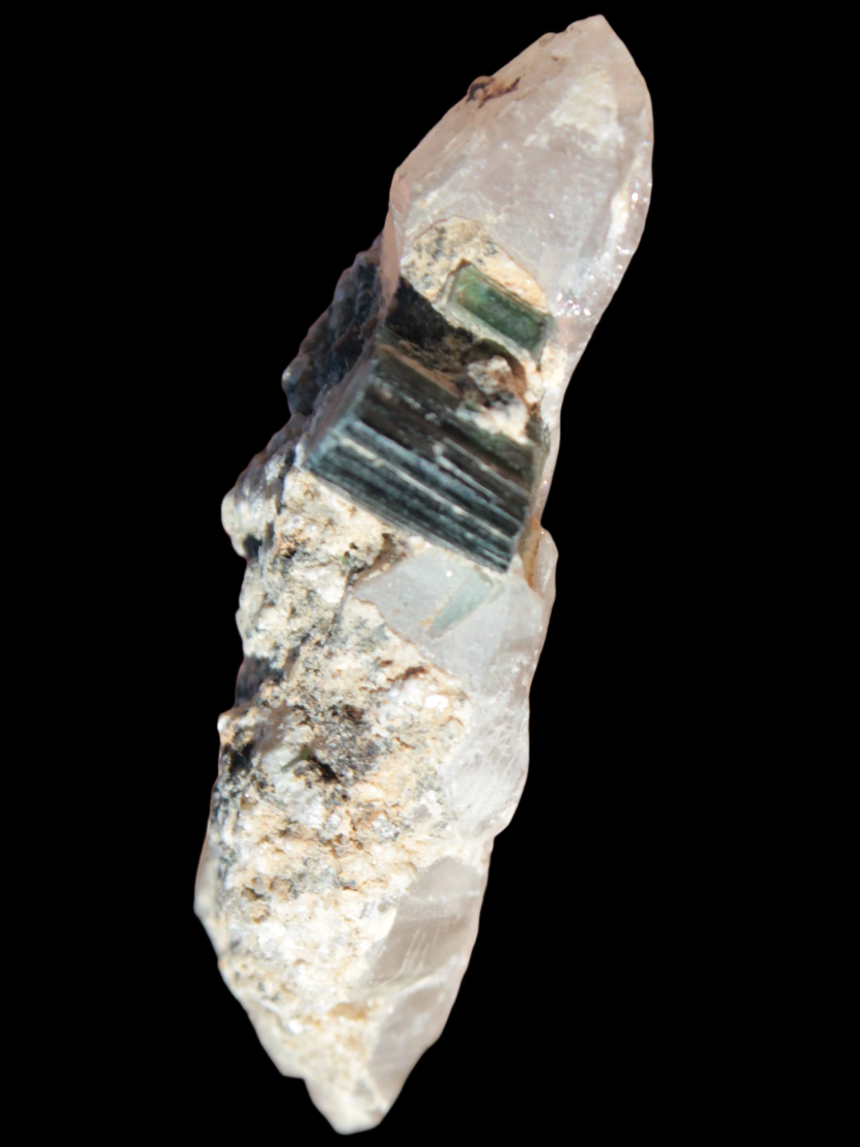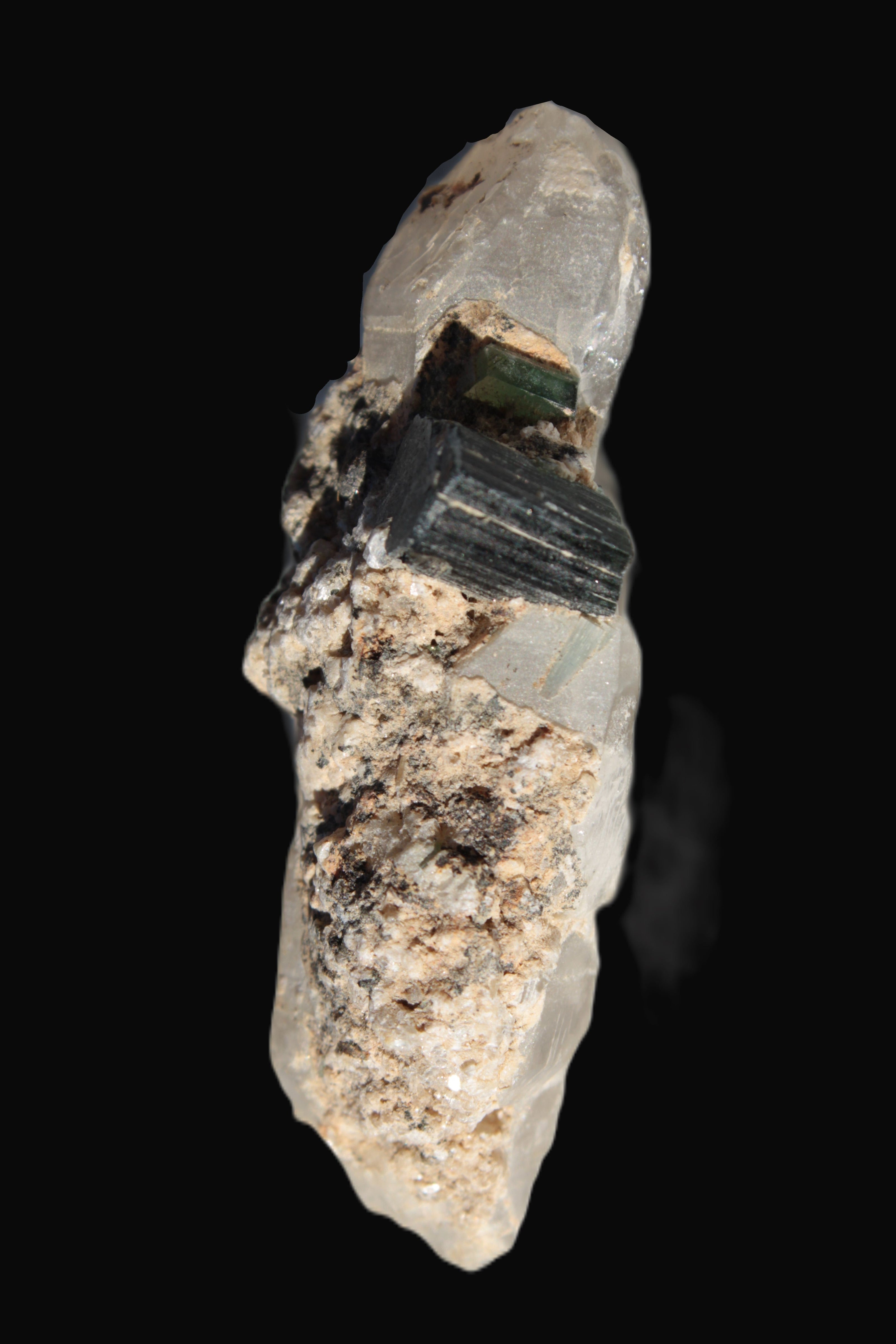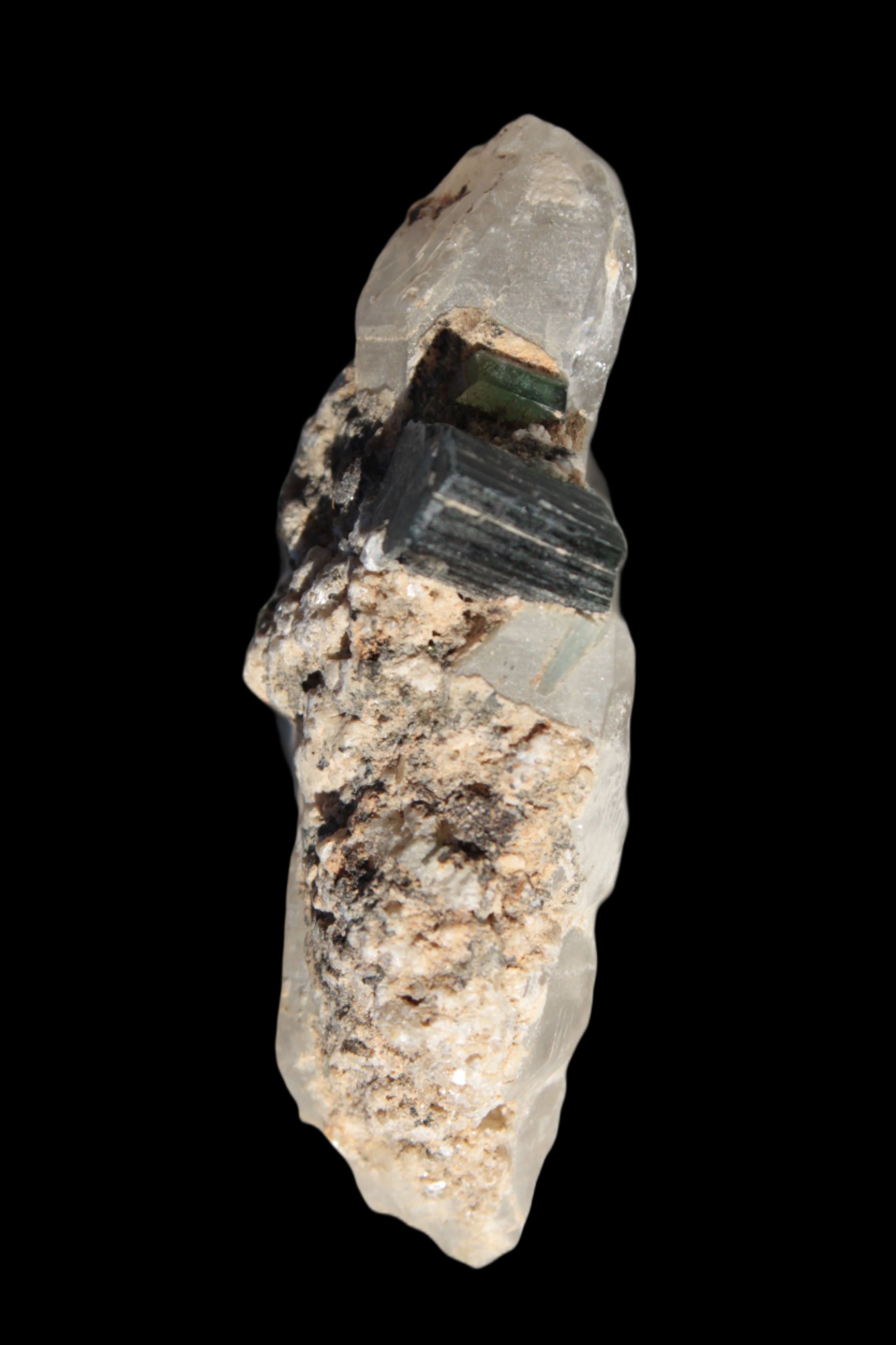 Black & Green Tourmaline on elestial Smoky Quartz crystal with Calcite, Afghanistan 13.4g