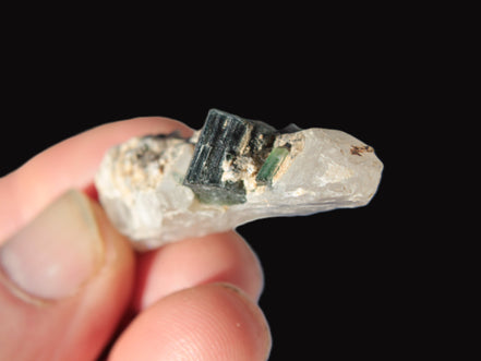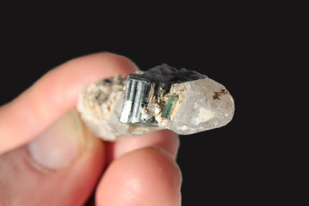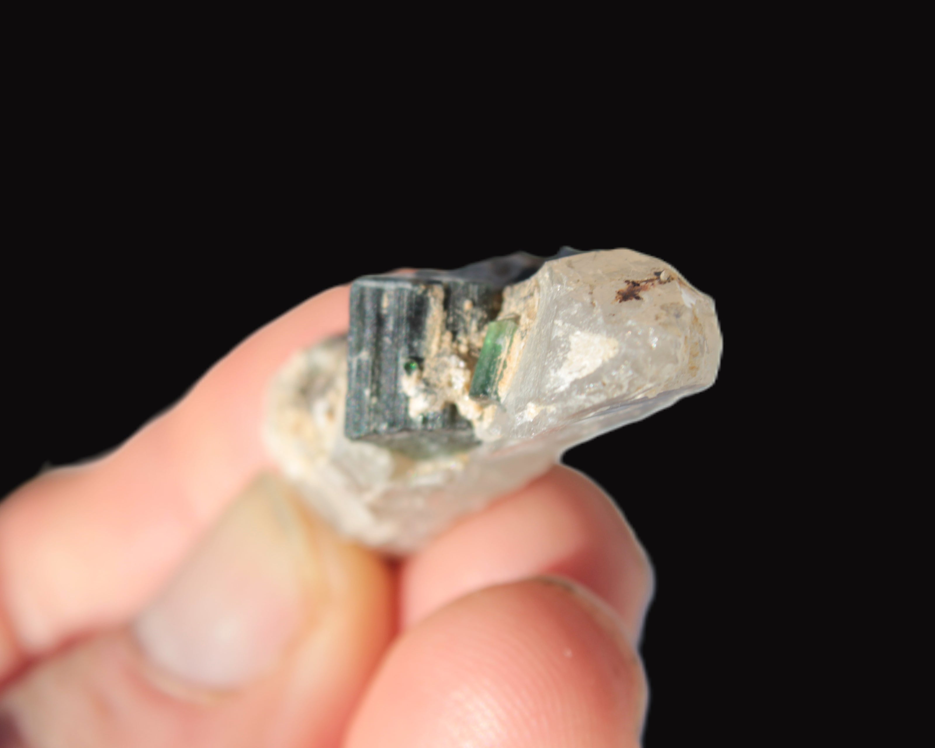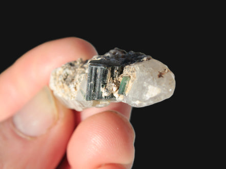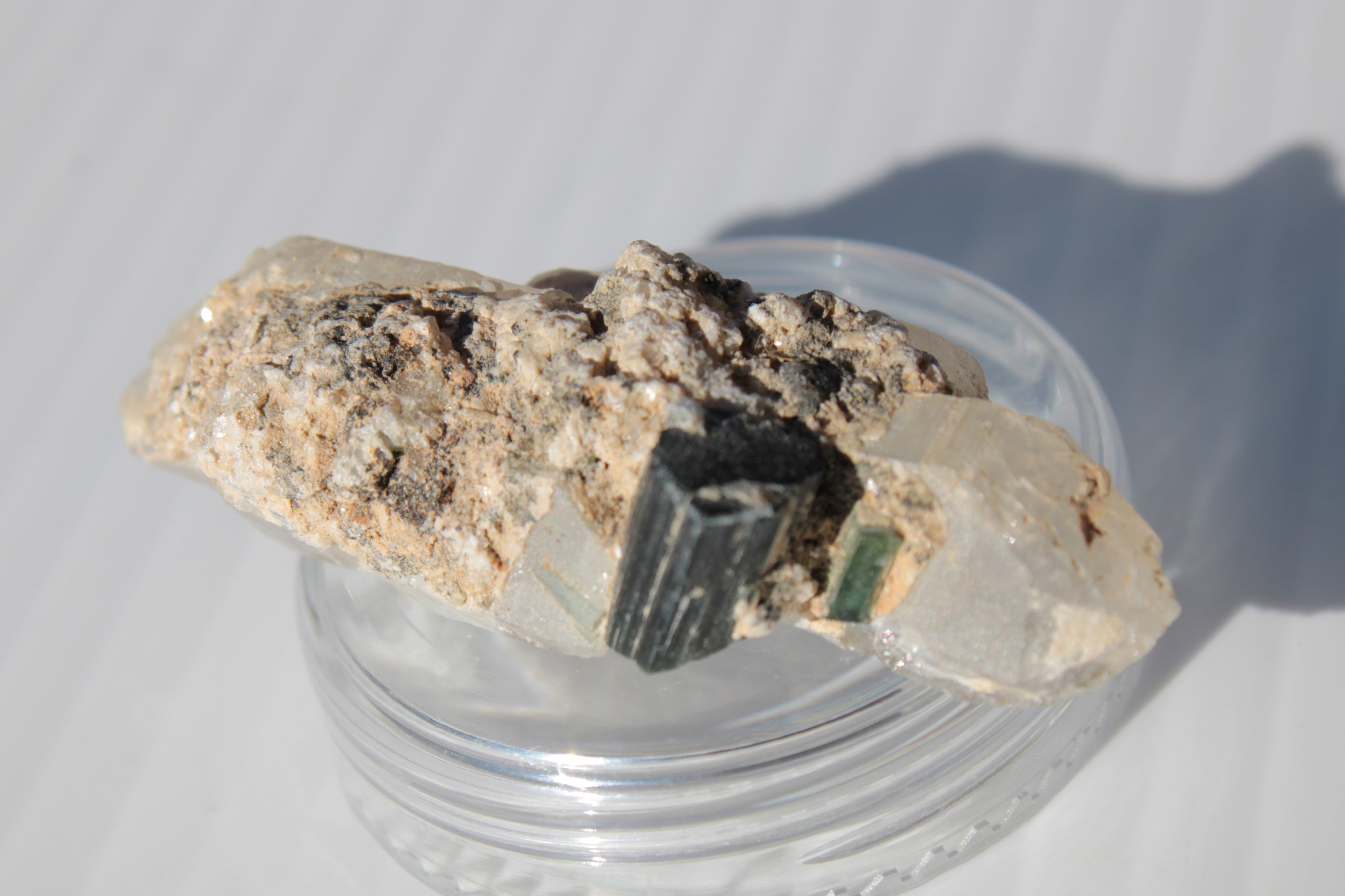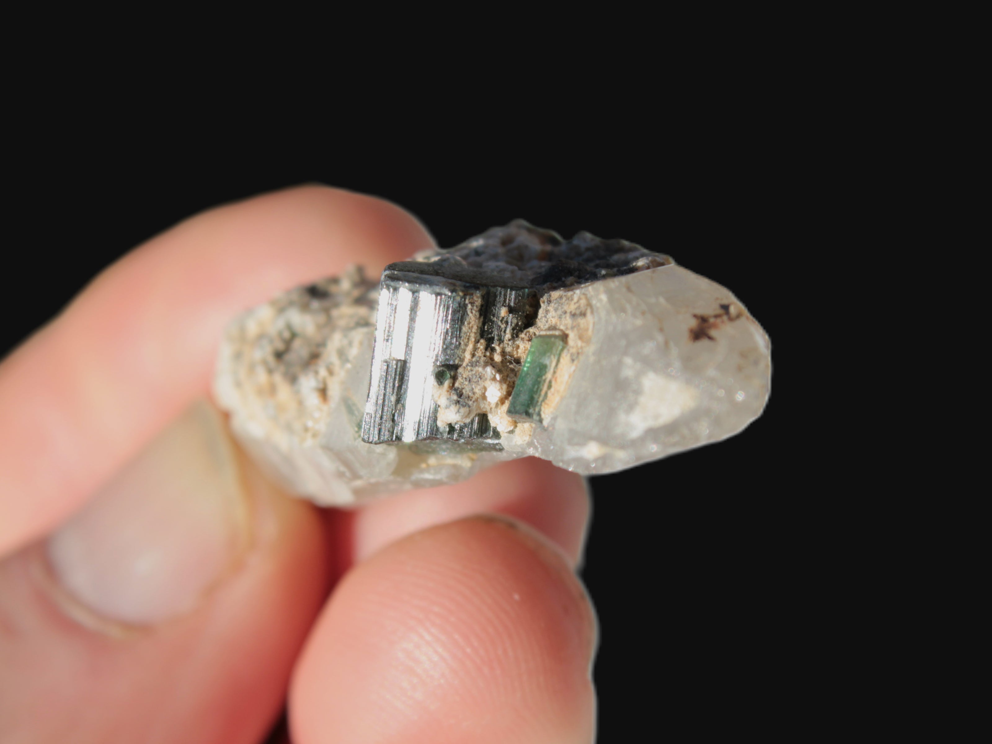 This Black & Green Tourmaline on elestial Smoky Quartz crystal with Calcite from Afghanistan weighs 67.3ct or 13.4g. It is a complex multi-crystal cluster with a lot going on. The larger crystal is Smoky Quartz, with a Calcite covering. On these are two Tourmaline crystals: Green Tourmaline and the bigger Black Tourmaline crystal. All this make for a great specimen from Afghanistan.