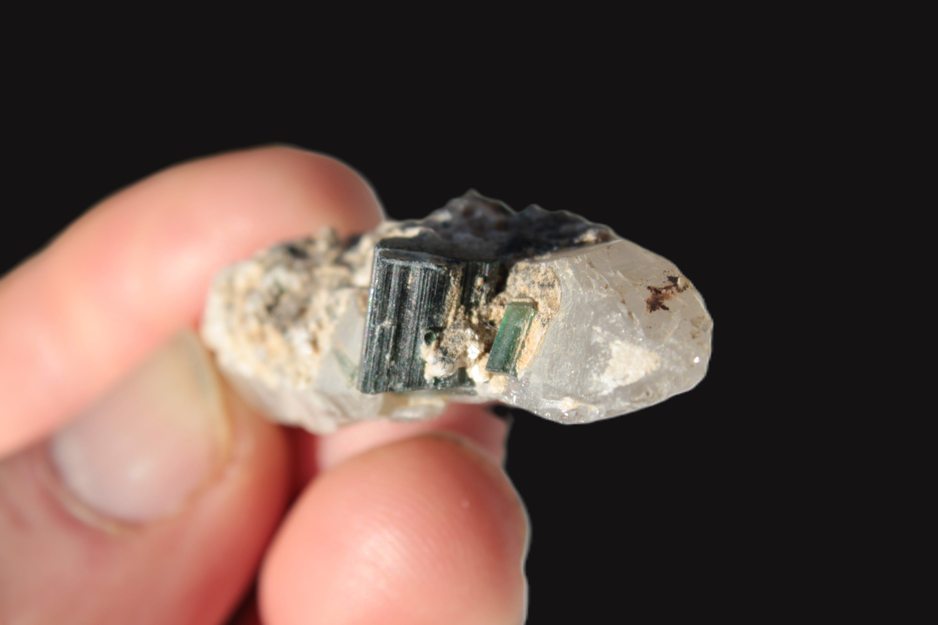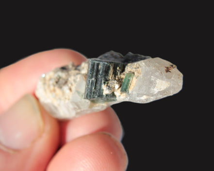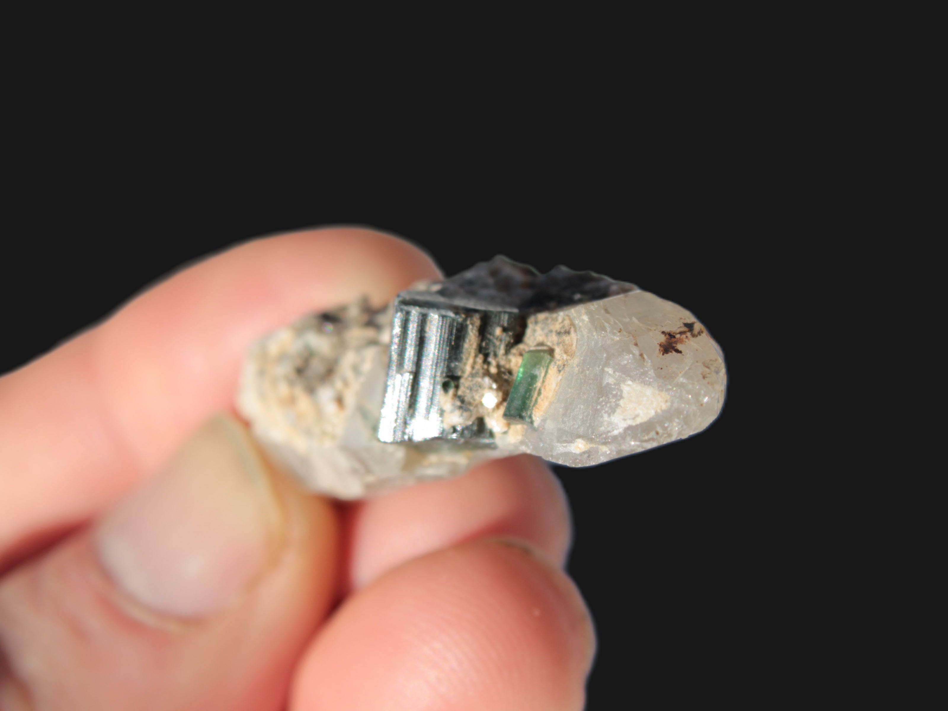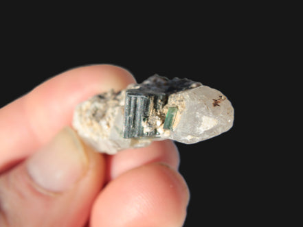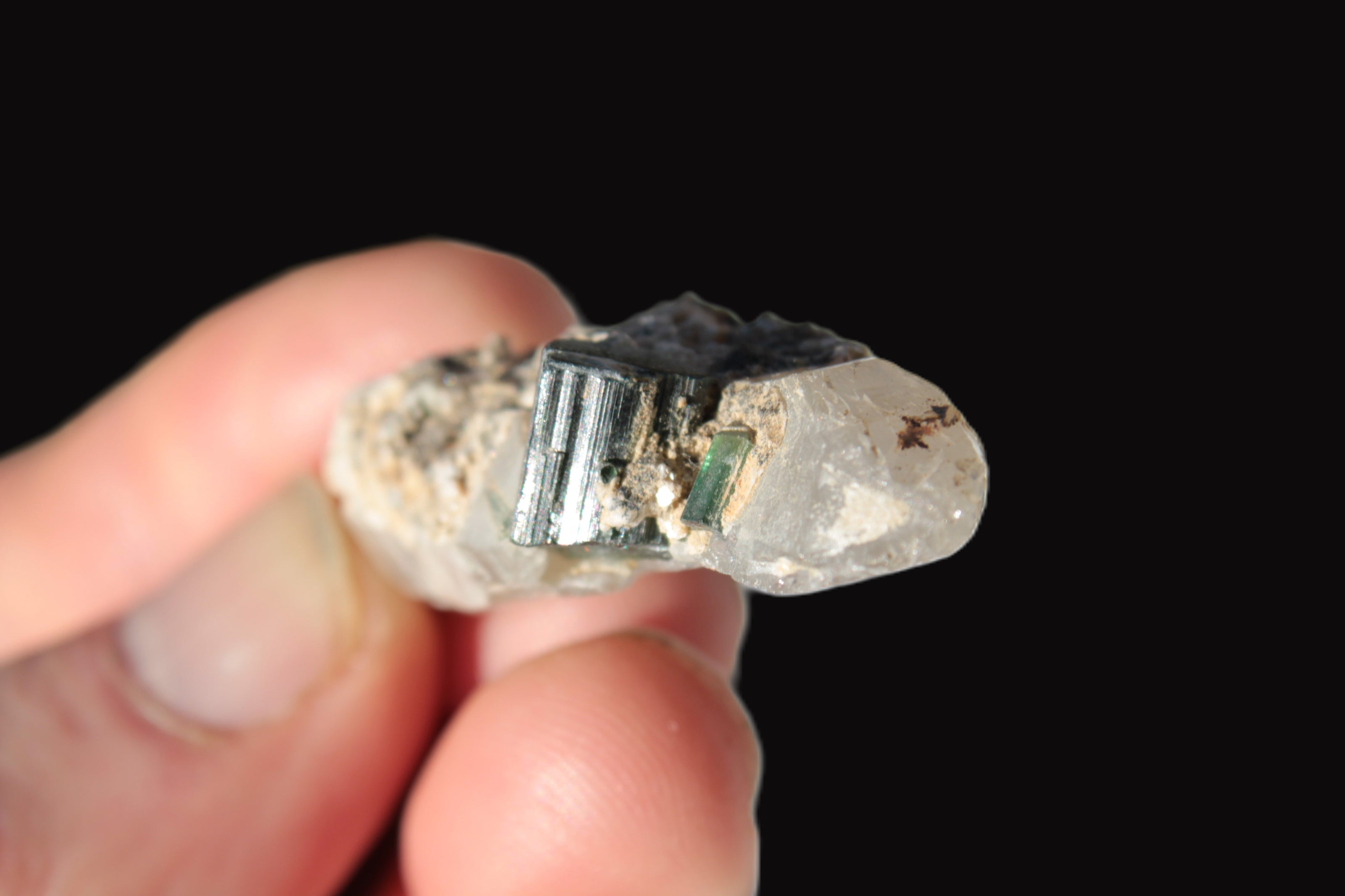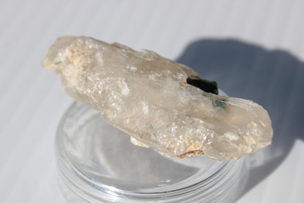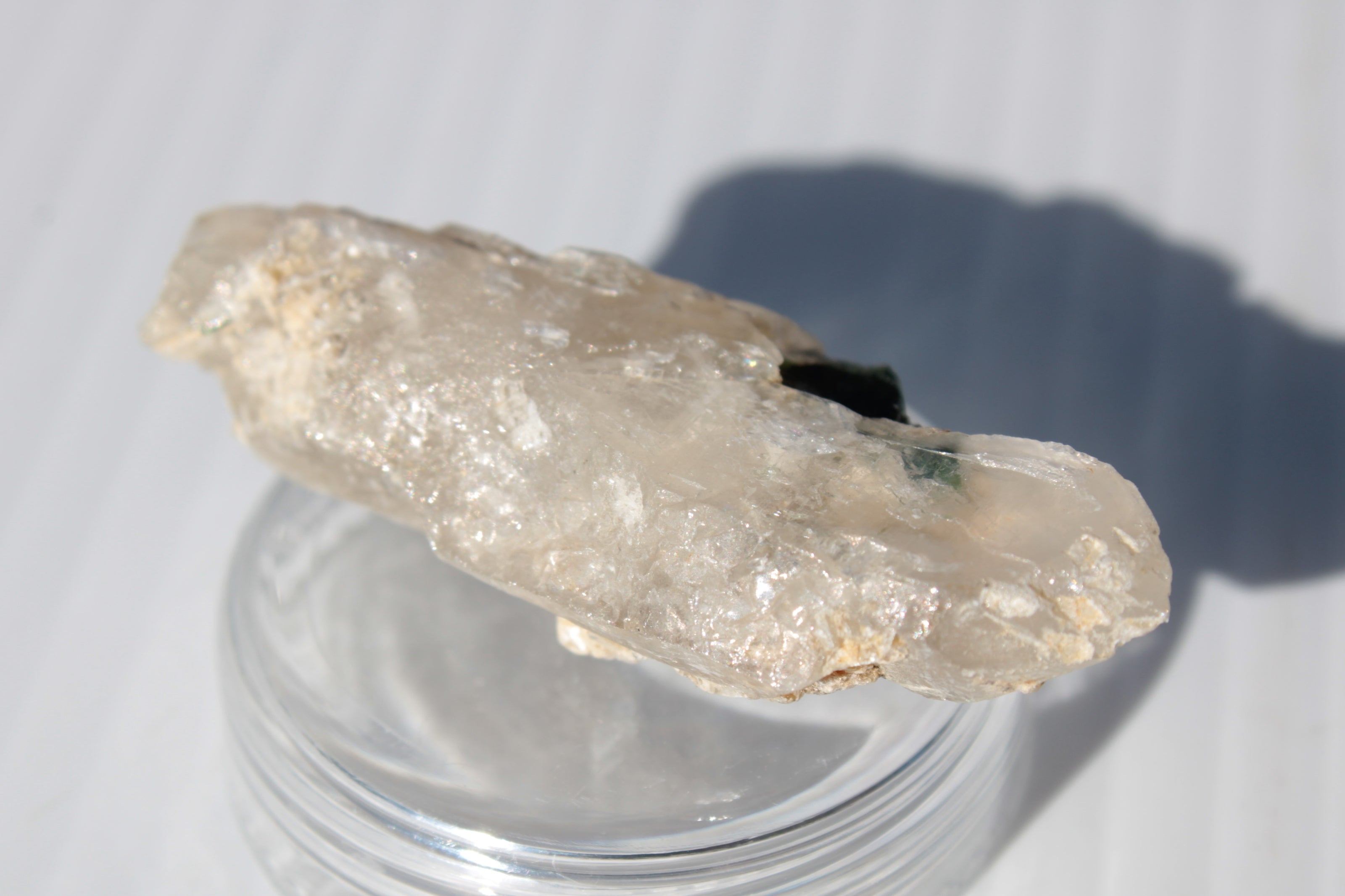 This Black & Green Tourmaline on elestial Smoky Quartz crystal with Calcite from Afghanistan weighs 67.3ct or 13.4g. It is a complex multi-crystal cluster with a lot going on. The larger crystal is Smoky Quartz, with a Calcite covering. On these are two Tourmaline crystals: Green Tourmaline and the bigger Black Tourmaline crystal. All this make for a great specimen from Afghanistan.
