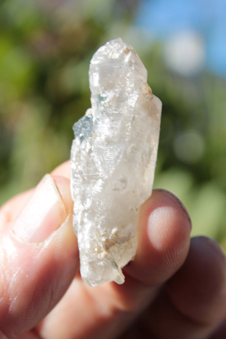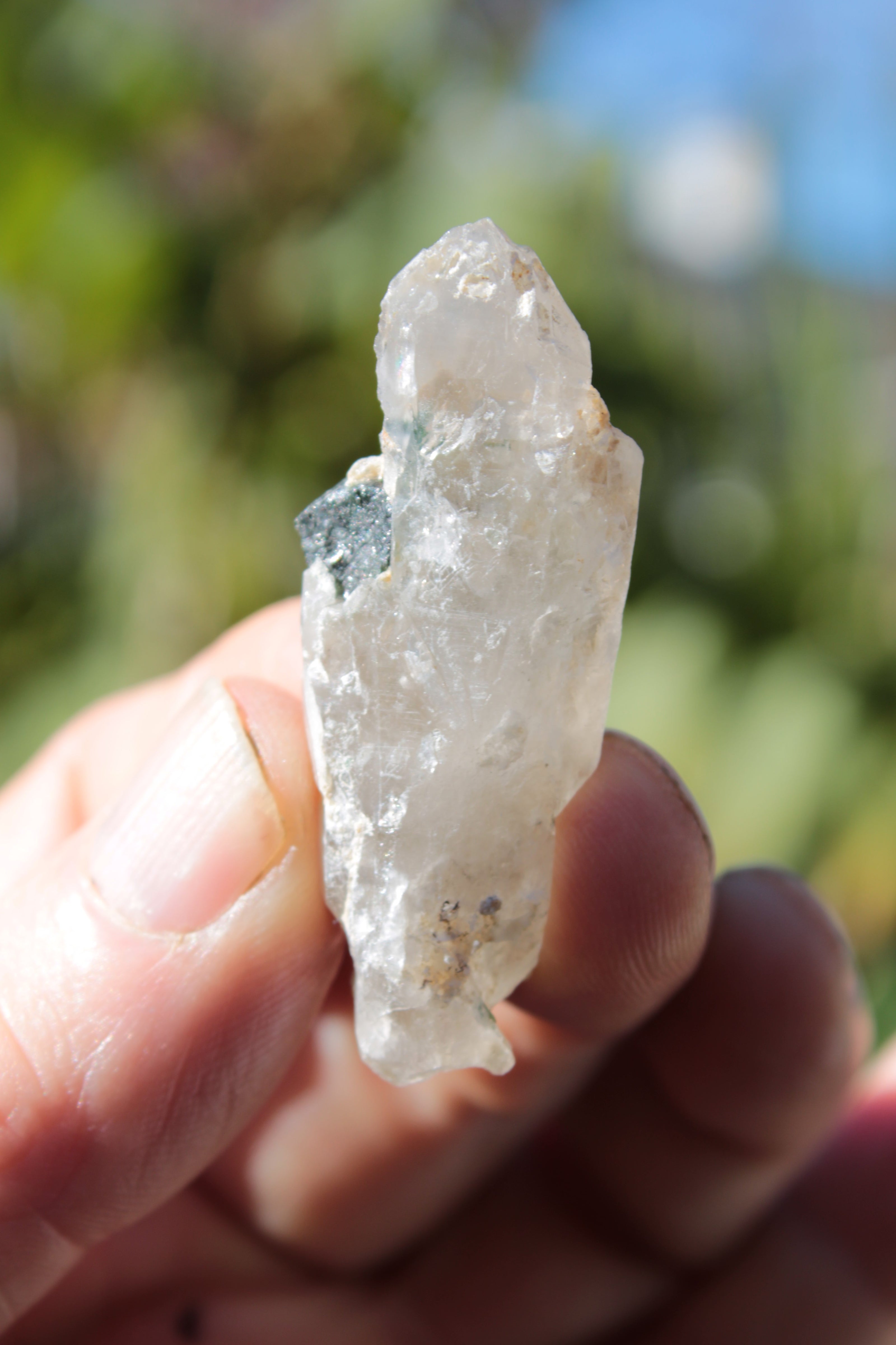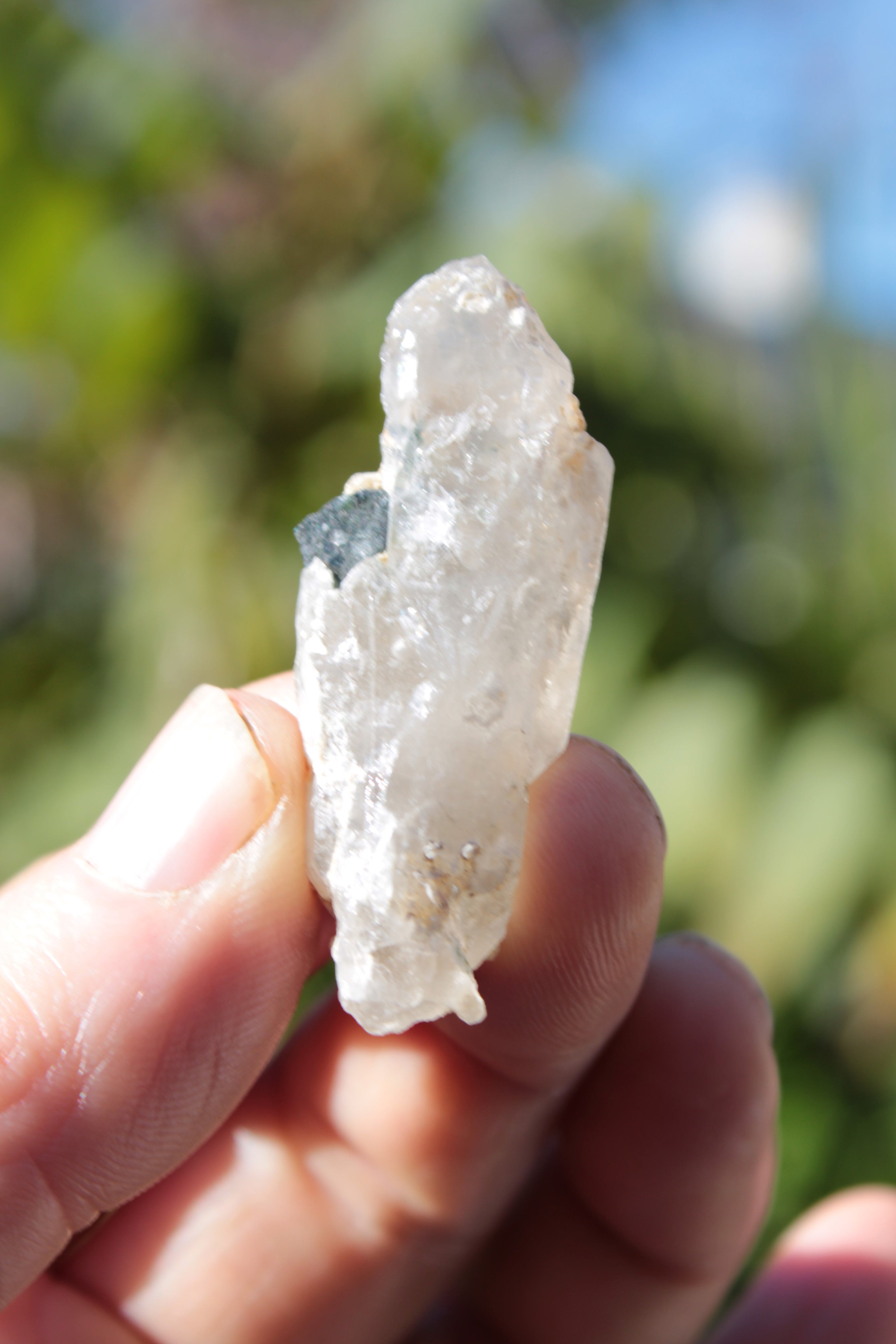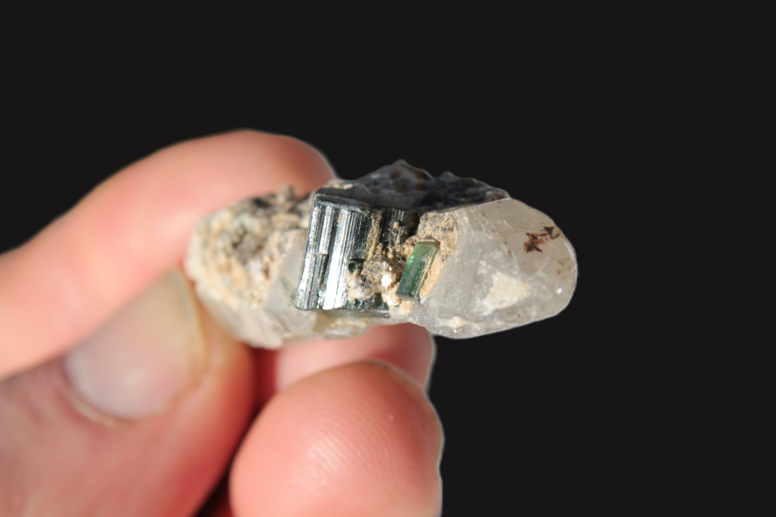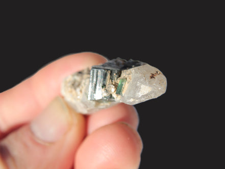 This Black & Green Tourmaline on elestial Smoky Quartz crystal with Calcite from Afghanistan weighs 67.3ct or 13.4g. It is a complex multi-crystal cluster with a lot going on. The larger crystal is Smoky Quartz, with a Calcite covering. On these are two Tourmaline crystals: Green Tourmaline and the bigger Black Tourmaline crystal. All this make for a great specimen from Afghanistan.