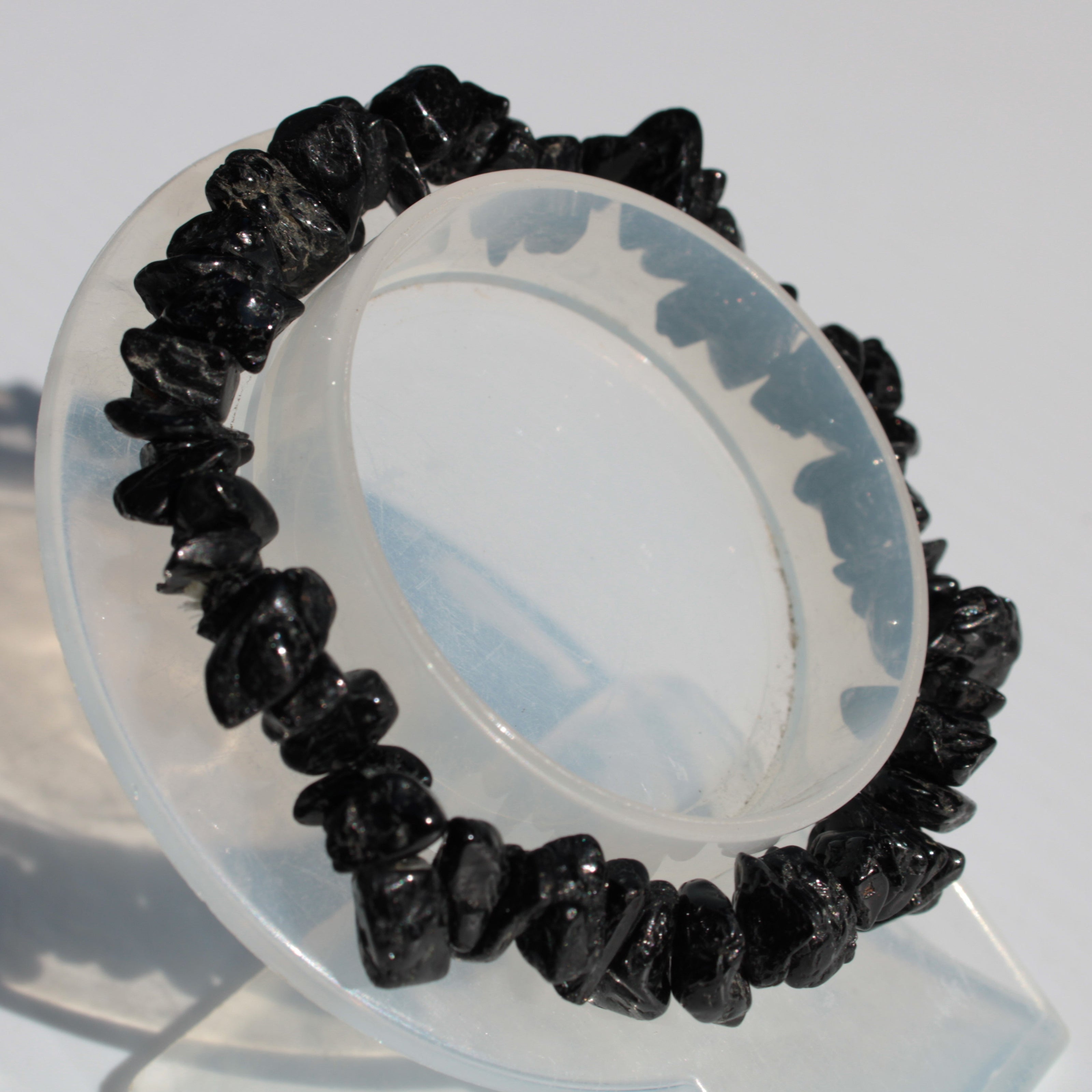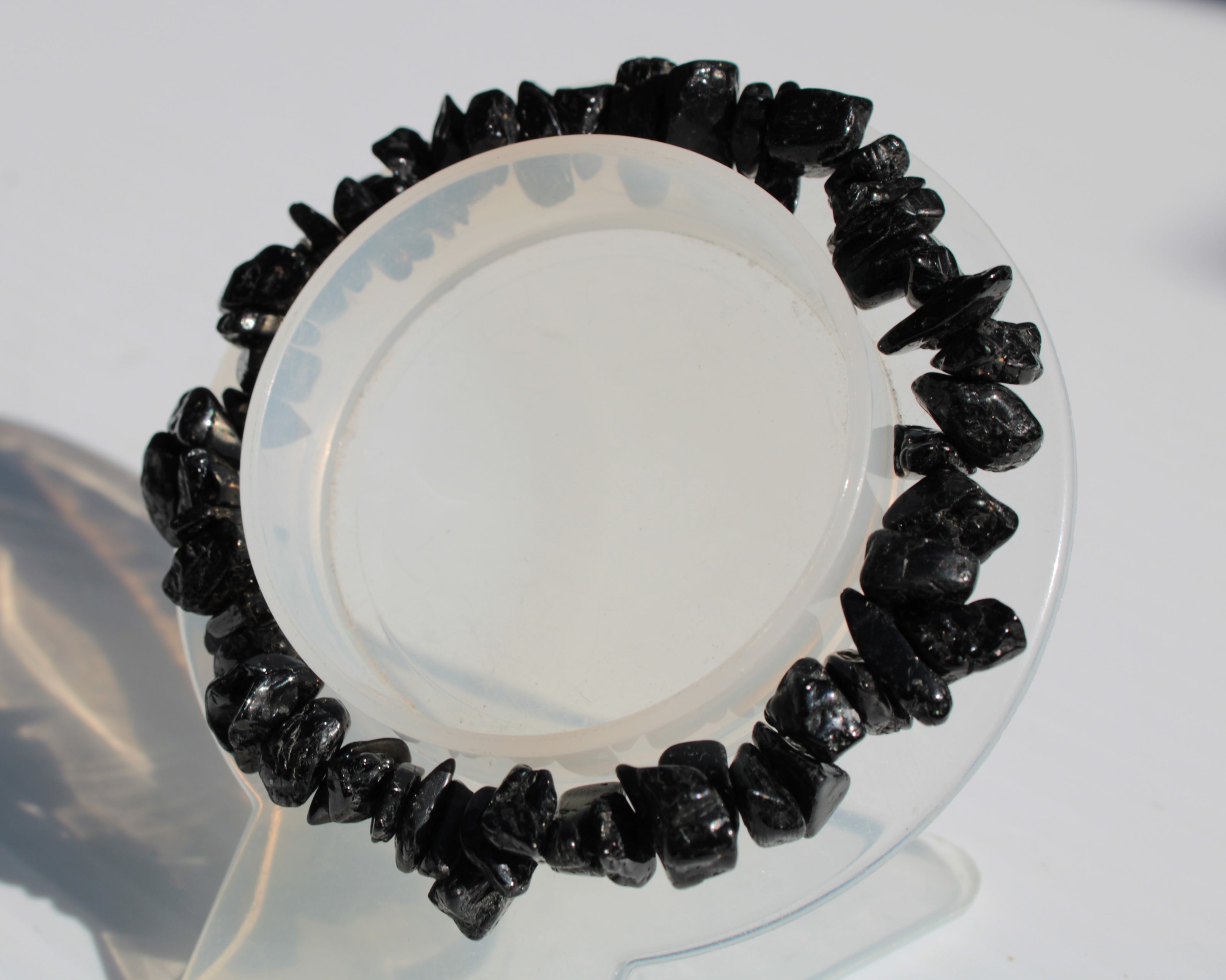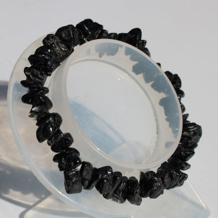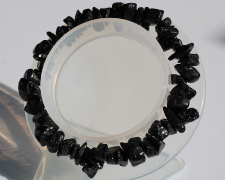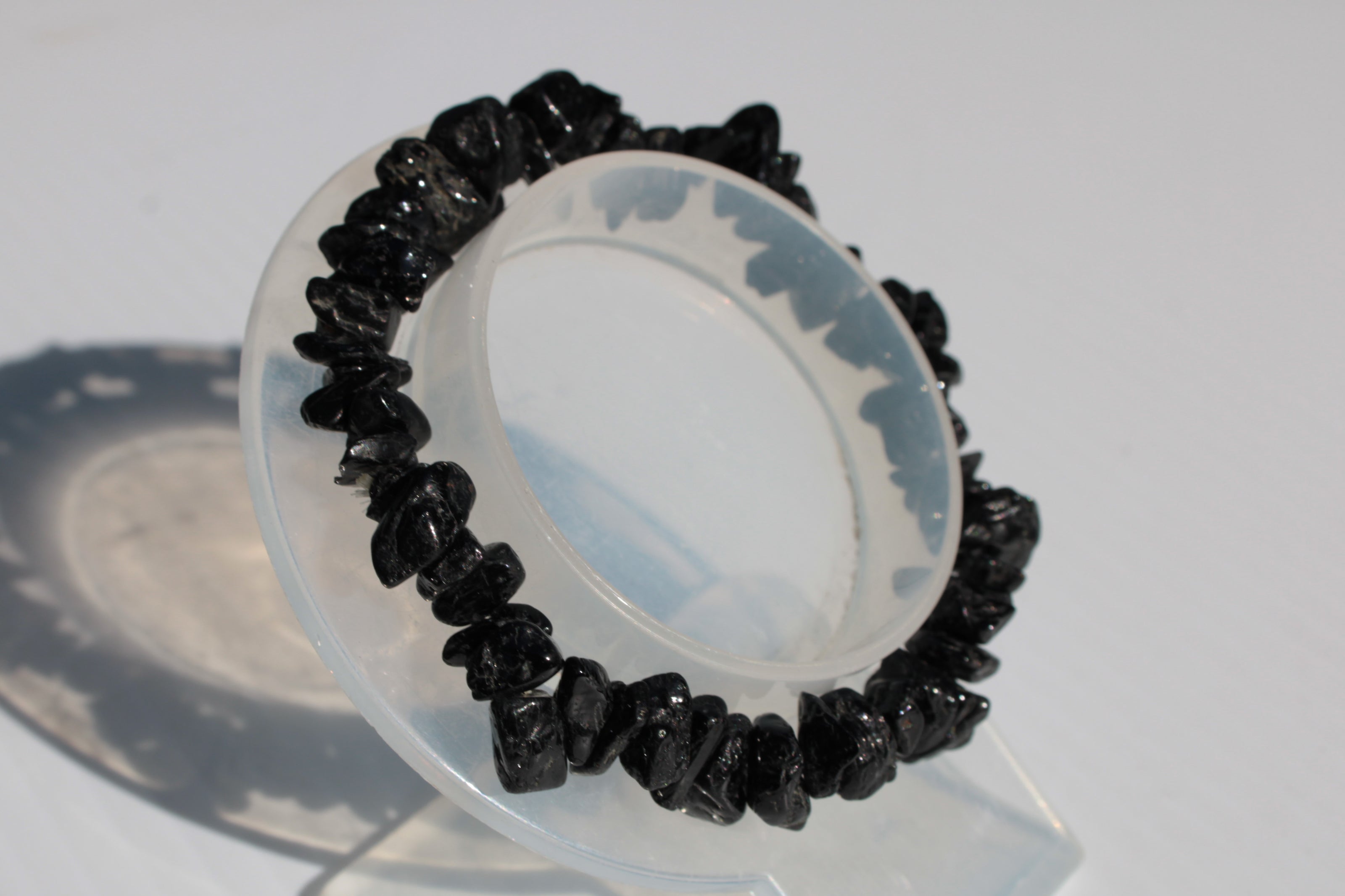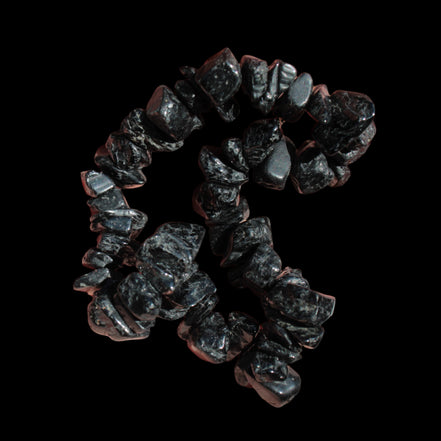 These Black Obsidian chip bracelet selections weigh 17-24g. Black Obsidian is an opaque volcanic glass. It is not a true crystal. The translucent variety is called Apache Tears. Black Obsidian is sometimes known as the ‘wizard stone’, because it has been used in magical practices since ancient times. Obsidian is a very protective stone and excellent for removing negativity. It can help you in developing your intuition and will ground you to the earth. Obsidian enables you to move forward in your life, with a more promising outlook.