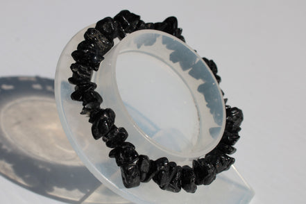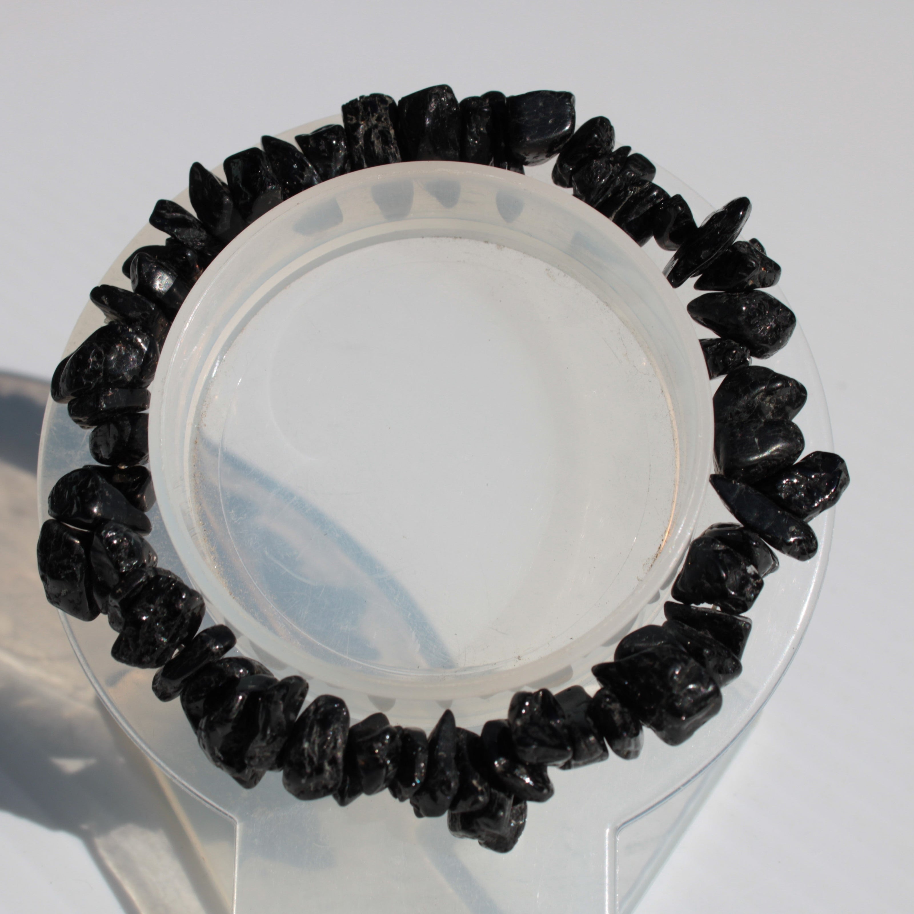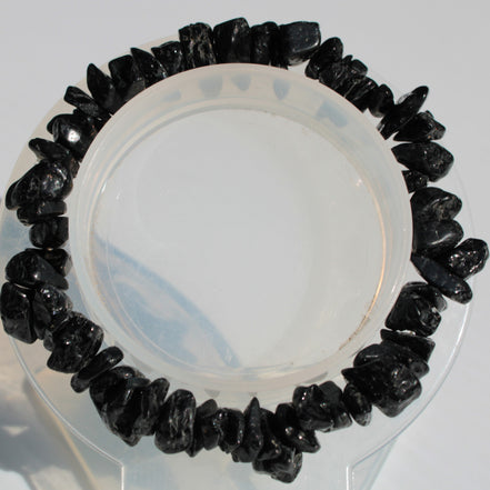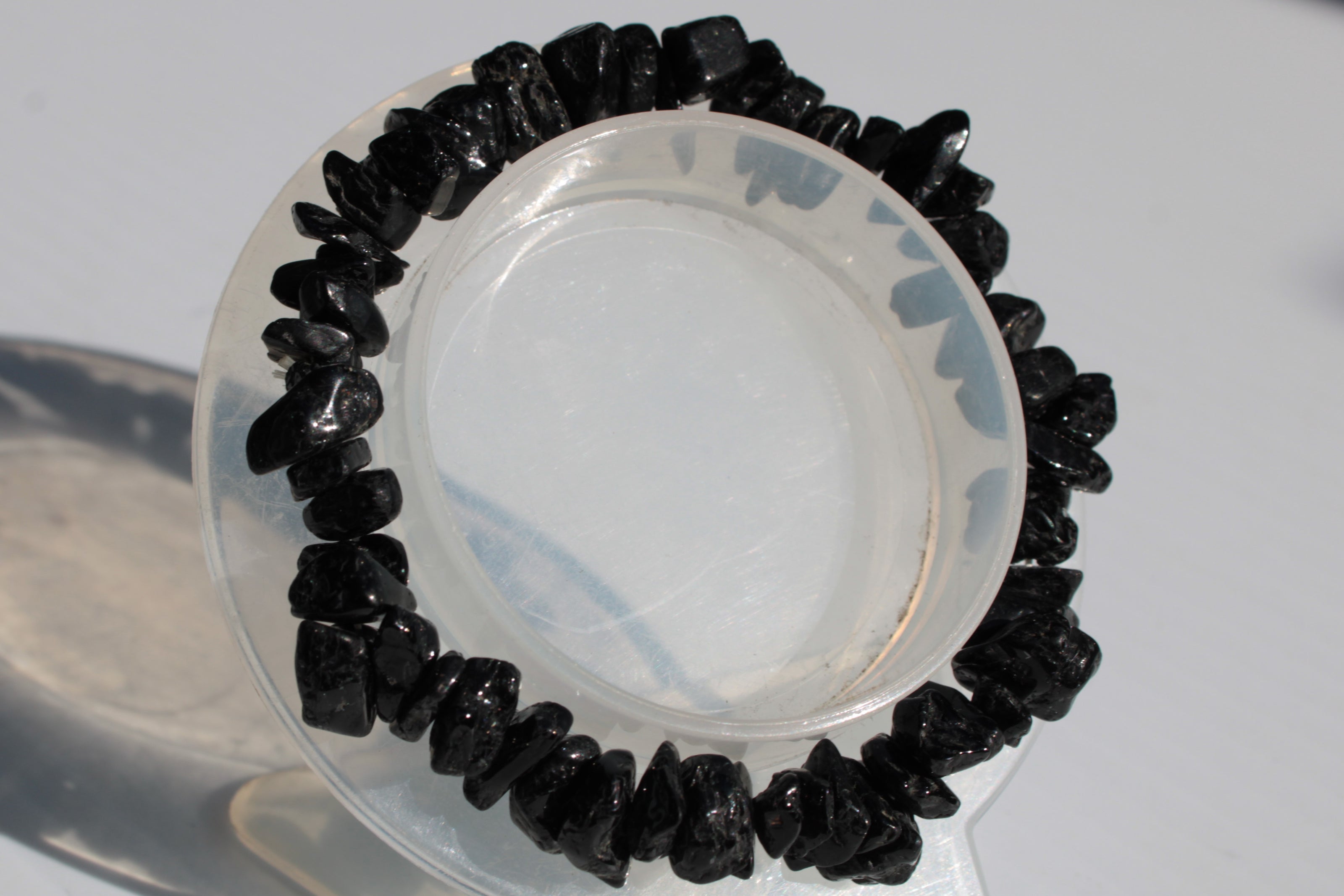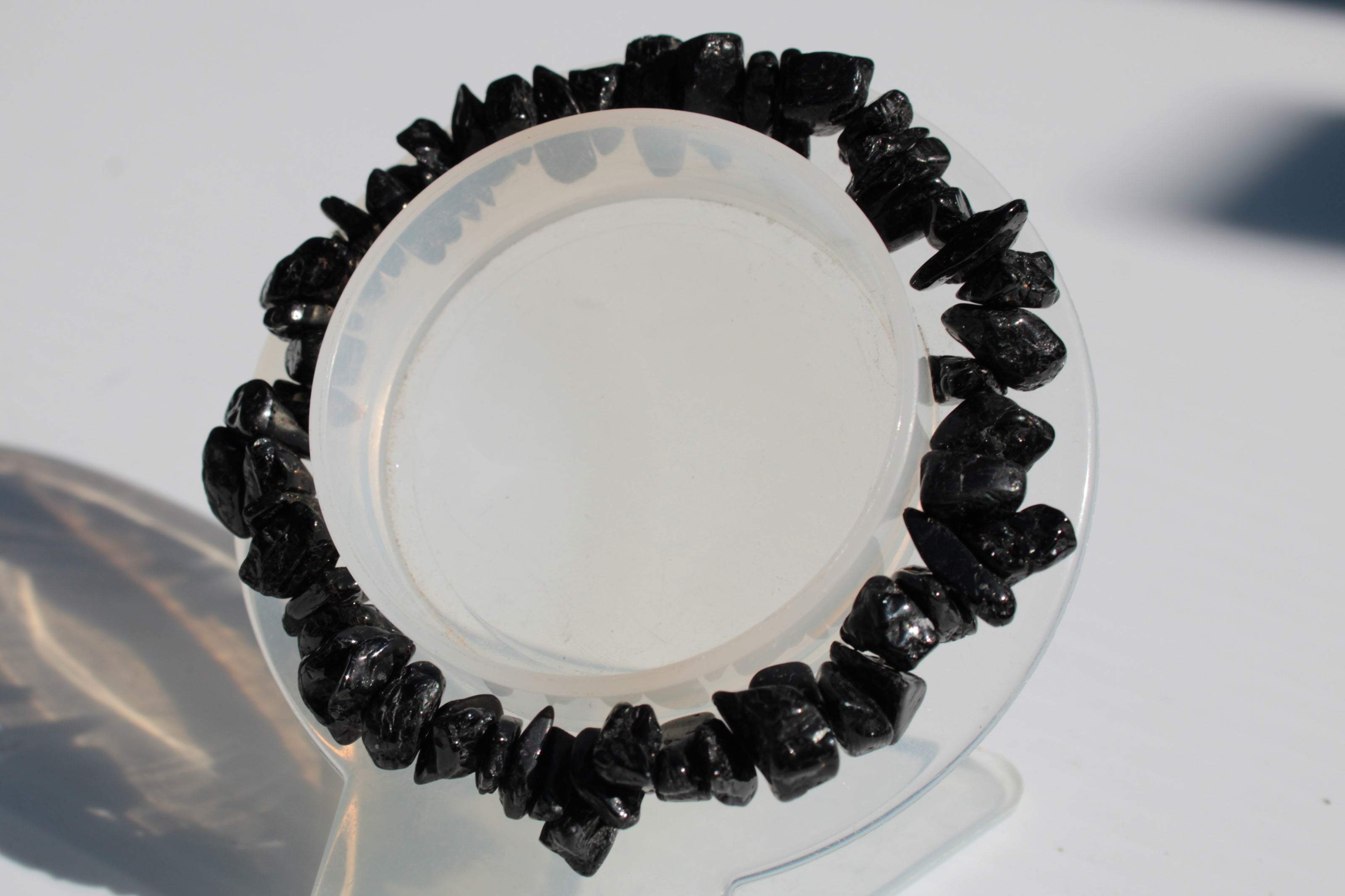 These Black Obsidian chip bracelet selections weigh 17-24g. Black Obsidian is an opaque volcanic glass. It is not a true crystal. The translucent variety is called Apache Tears. Black Obsidian is sometimes known as the ‘wizard stone’, because it has been used in magical practices since ancient times. Obsidian is a very protective stone and excellent for removing negativity. It can help you in developing your intuition and will ground you to the earth. Obsidian enables you to move forward in your life, with a more promising outlook.