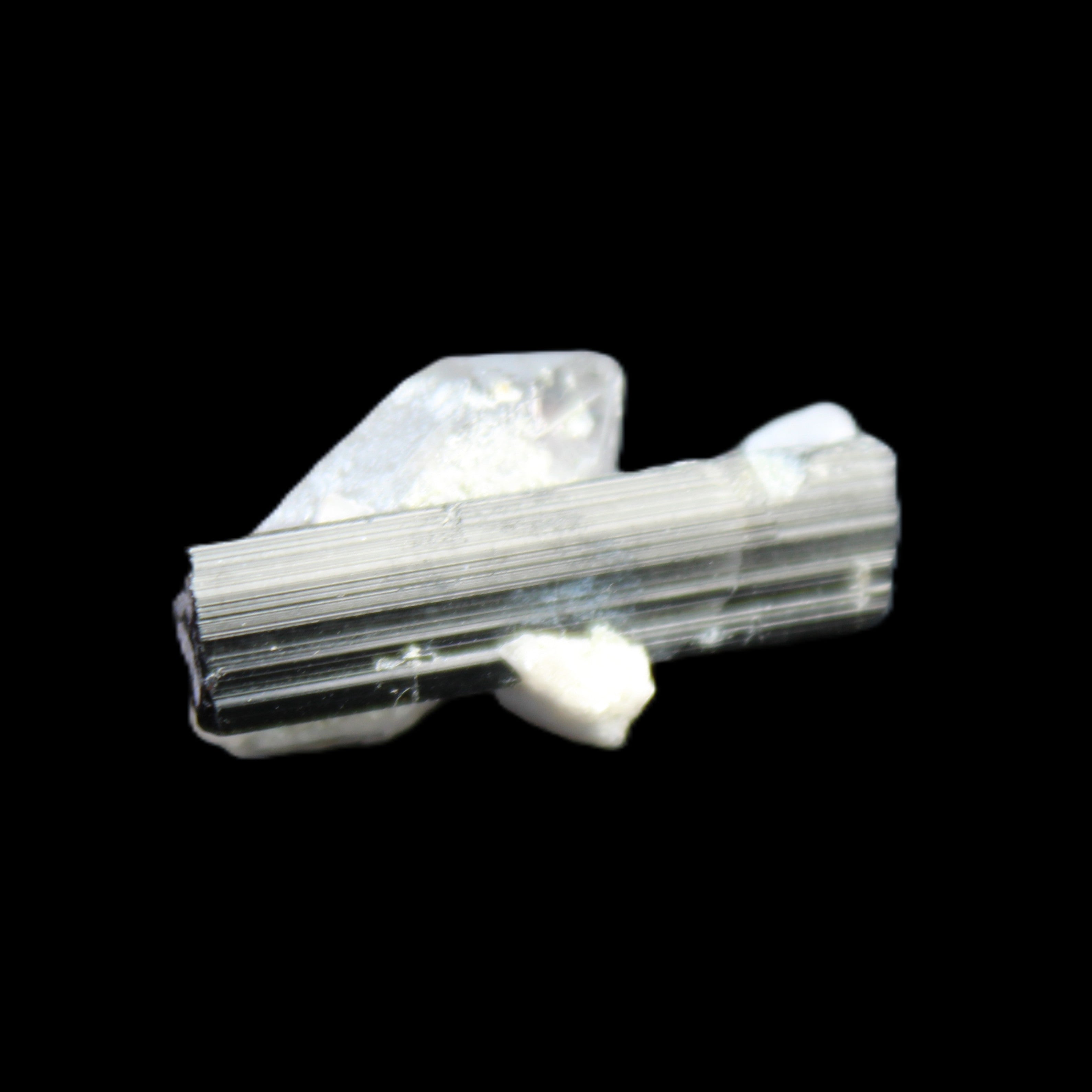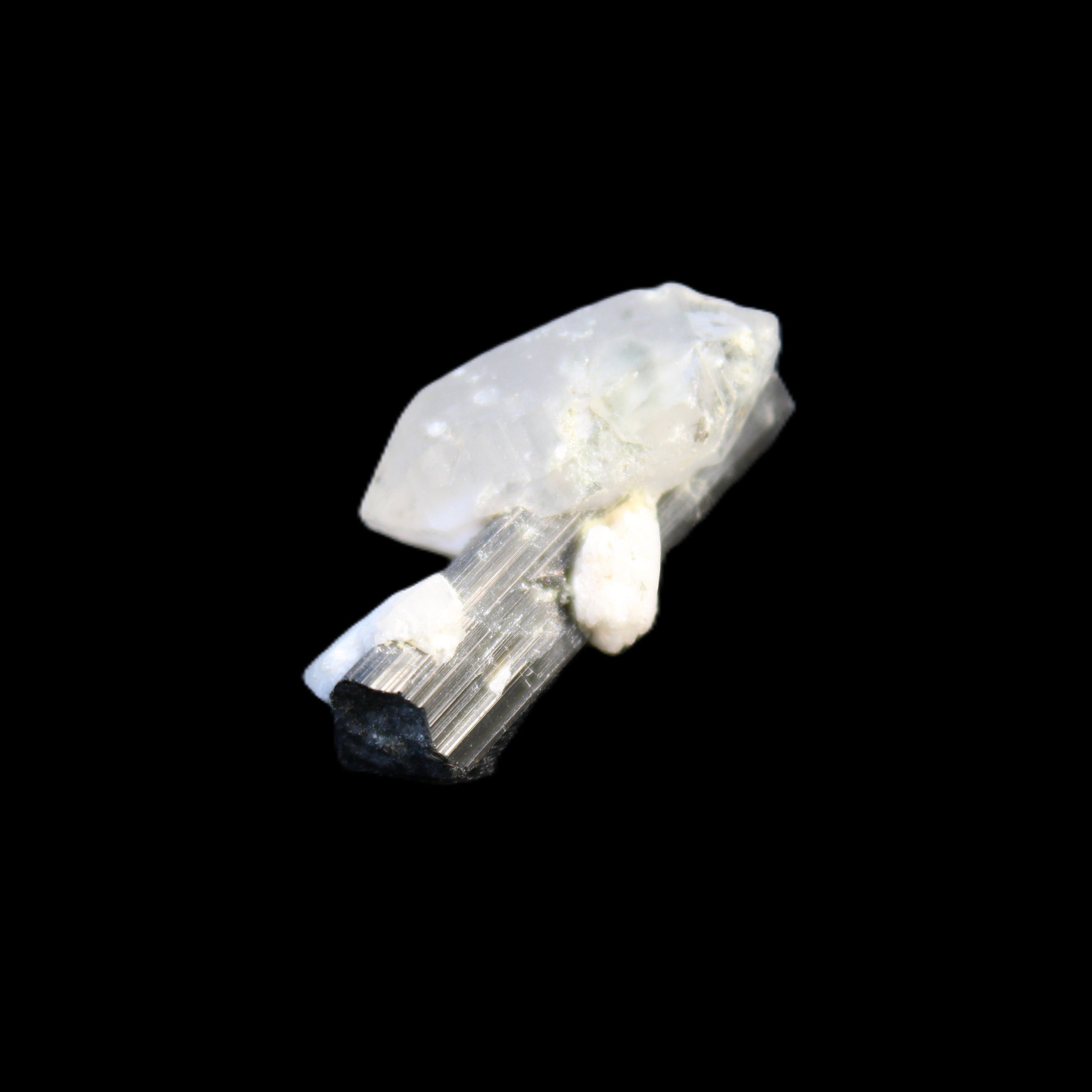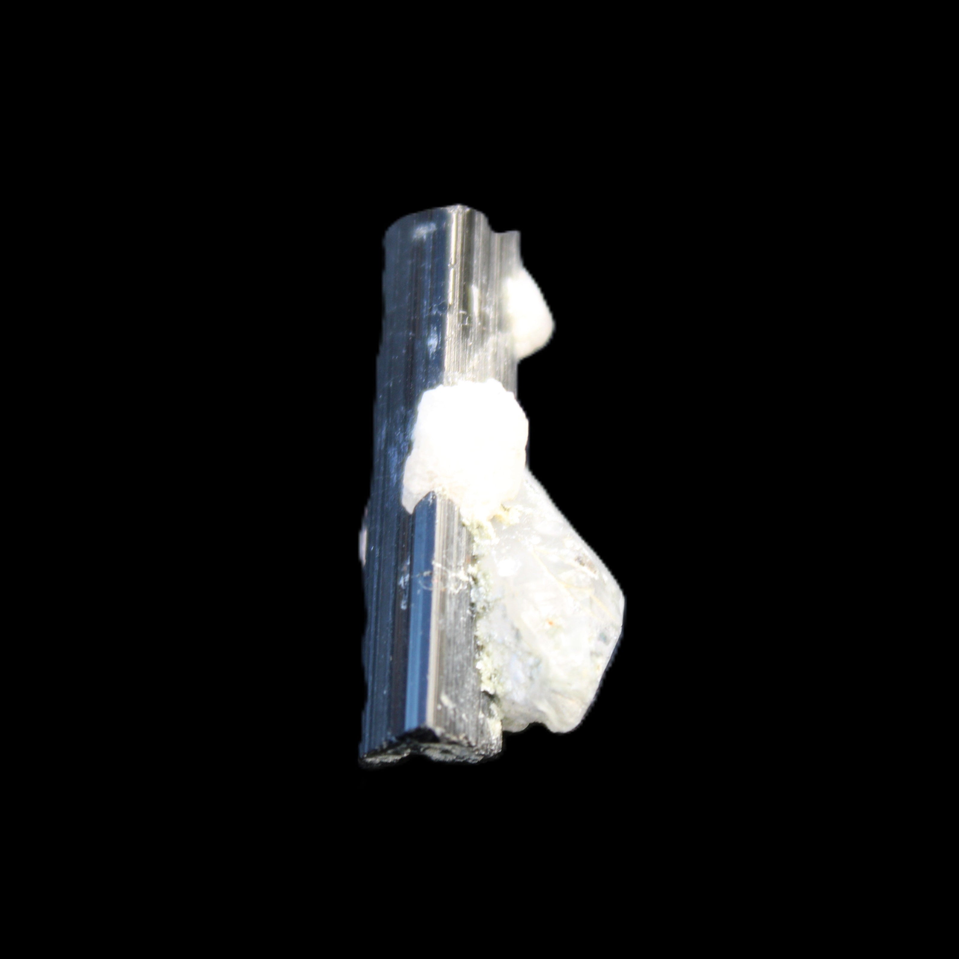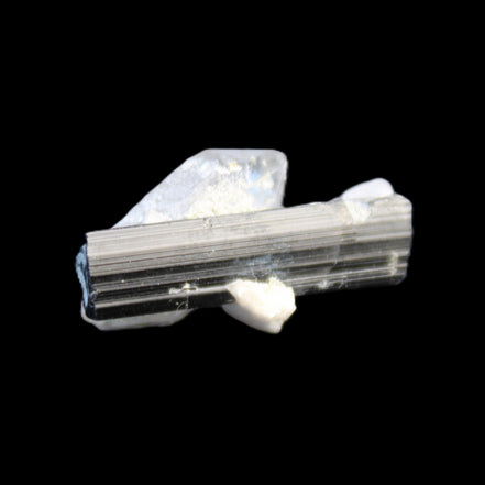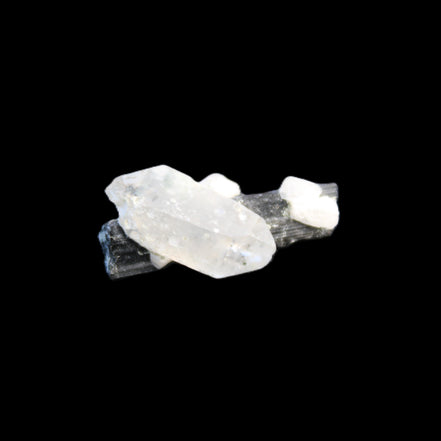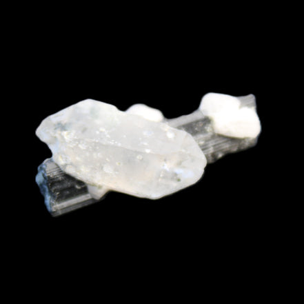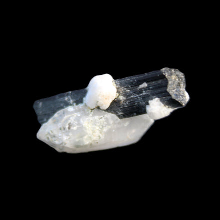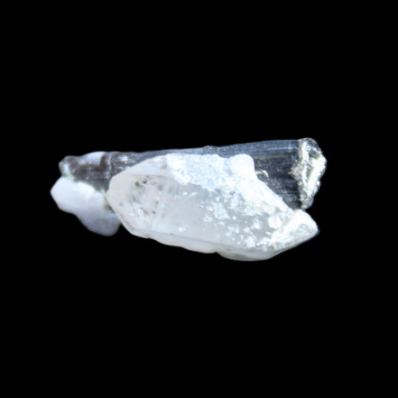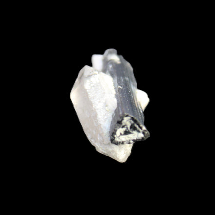 This Black Tourmaline with Quartz crystal weighs 5.6g. The Quartz crystal is double terminated.  Black Tourmaline is one of the most popular metaphysical stones. Except for in thin section, Black Tourmaline is always a solid black. Unlike other tourmaline minerals, it is never translucent or transparent in its natural crystal form. It has a distinctive appearance with glossy long striated crystals. This structure and its other properties generate a strong piezoelectric effect, with electrically charged poles at the crystal’s poles. It is also pyroelectric, generating an electric charge through temperature changes. As a result, Black Tourmaline is a highly protective stone, able to block, repel and transmute negative energies.