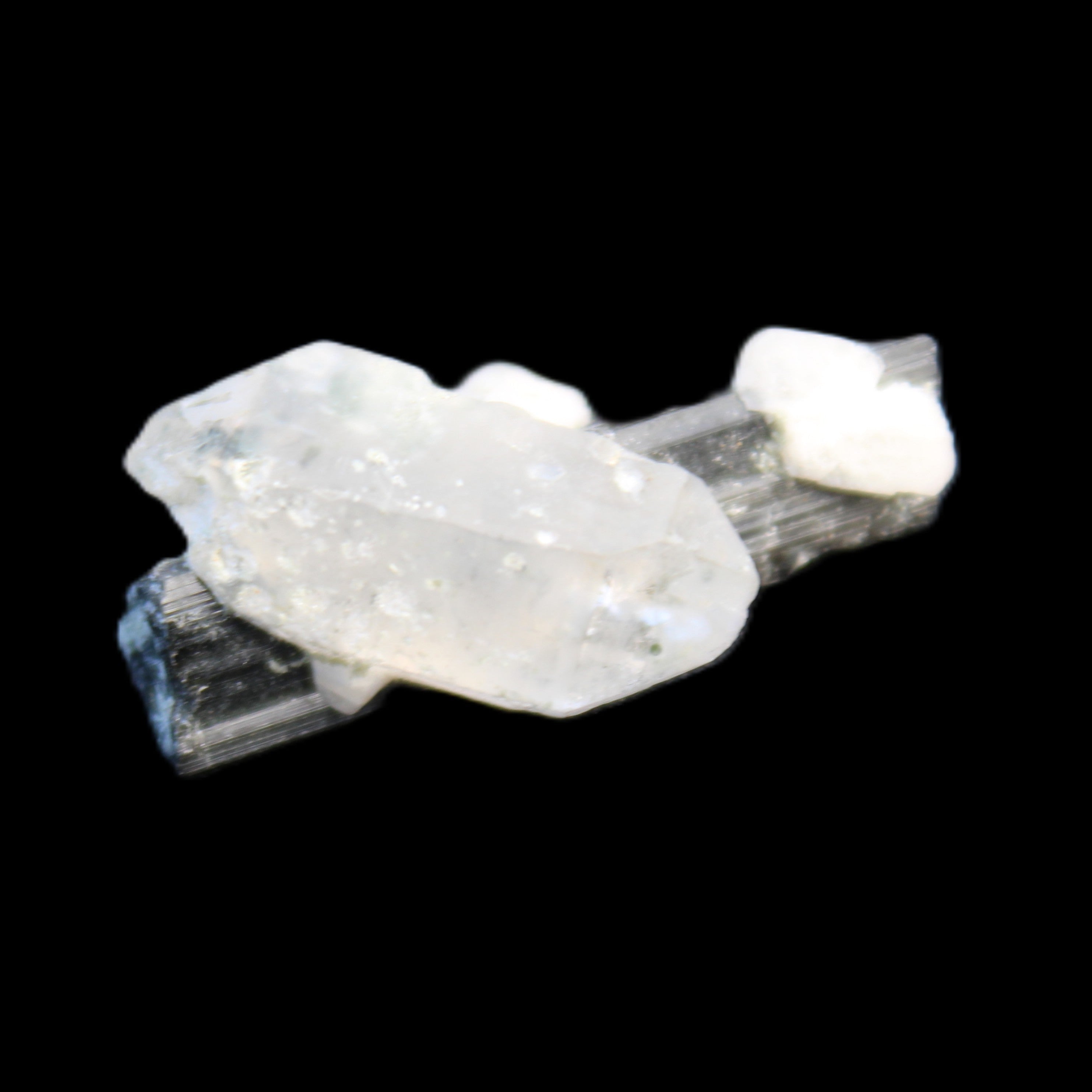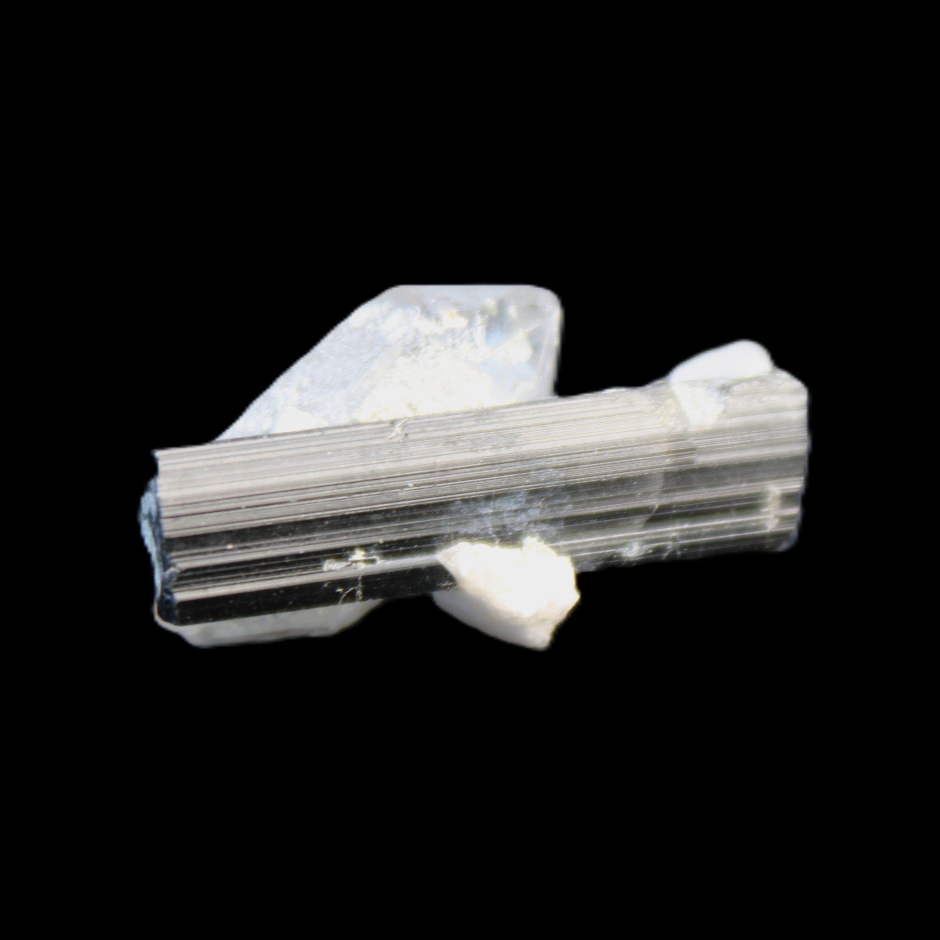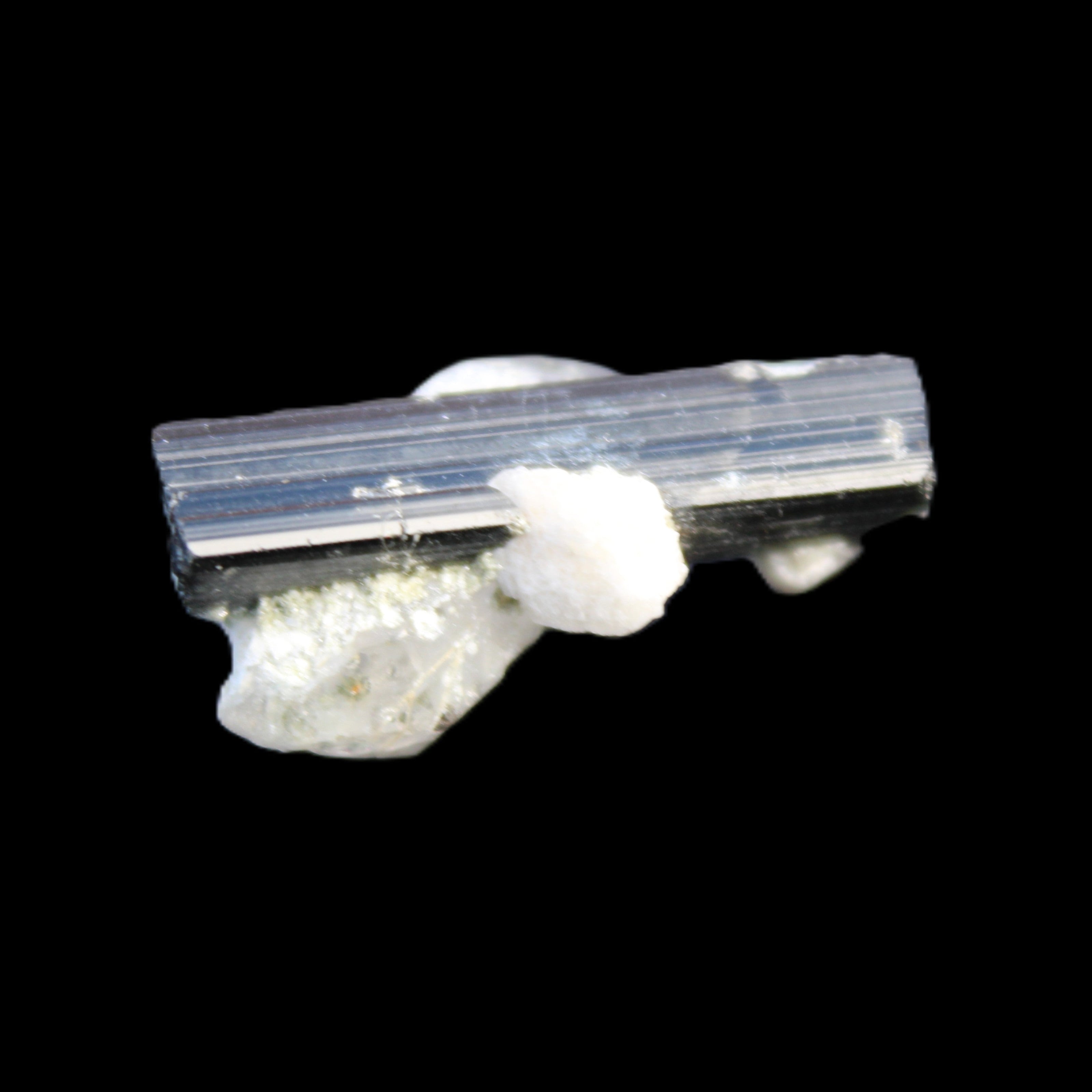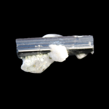 This Black Tourmaline with Quartz crystal weighs 5.6g. The Quartz crystal is double terminated.  Black Tourmaline is one of the most popular metaphysical stones. Except for in thin section, Black Tourmaline is always a solid black. Unlike other tourmaline minerals, it is never translucent or transparent in its natural crystal form. It has a distinctive appearance with glossy long striated crystals. This structure and its other properties generate a strong piezoelectric effect, with electrically charged poles at the crystal’s poles. It is also pyroelectric, generating an electric charge through temperature changes. As a result, Black Tourmaline is a highly protective stone, able to block, repel and transmute negative energies.