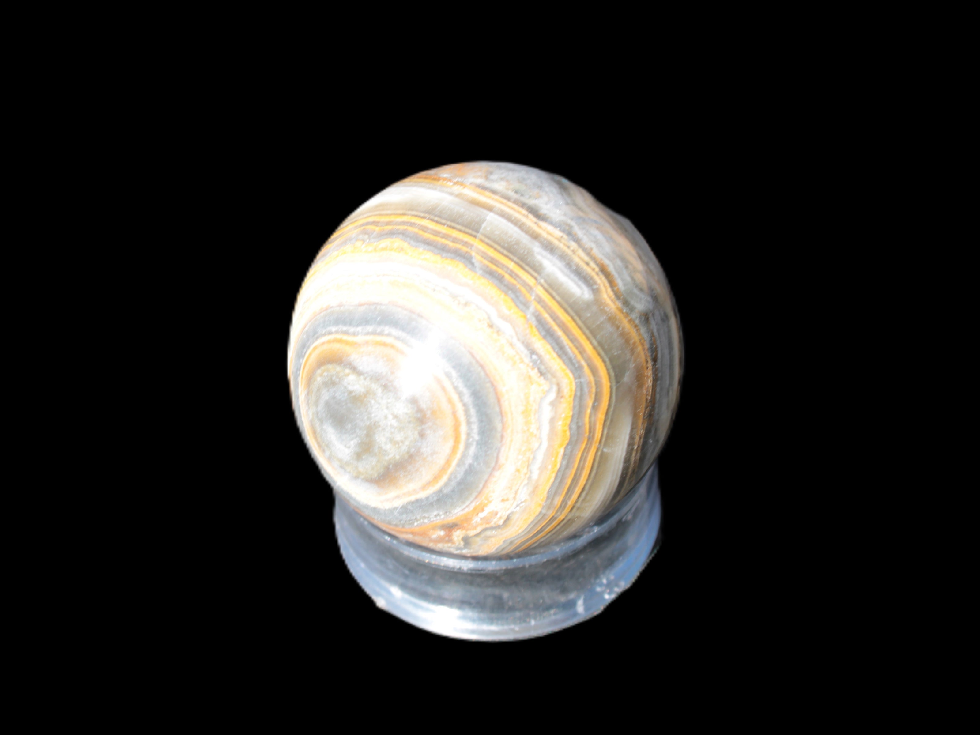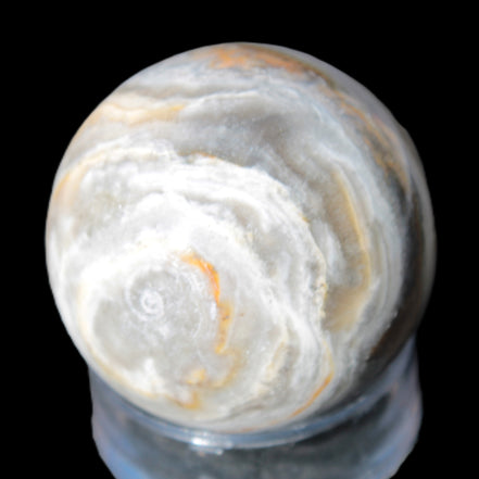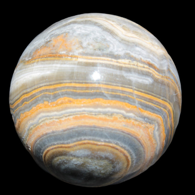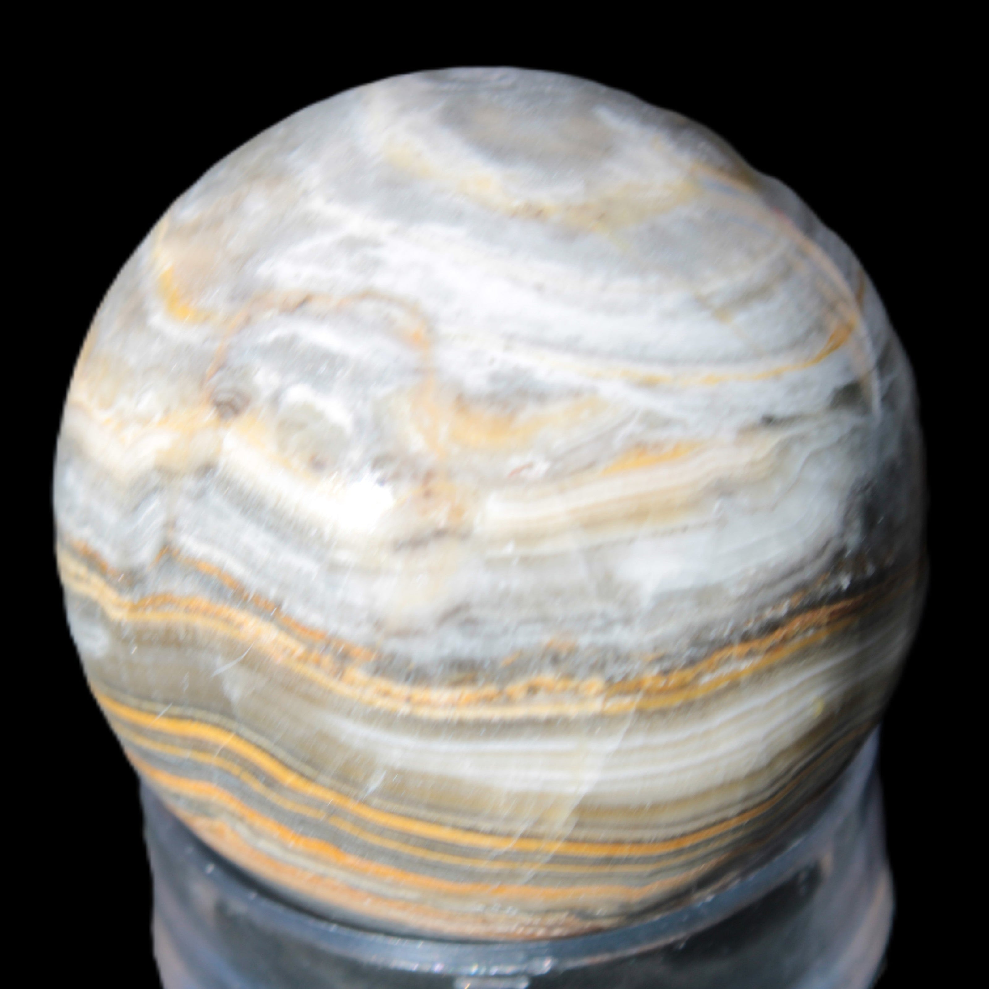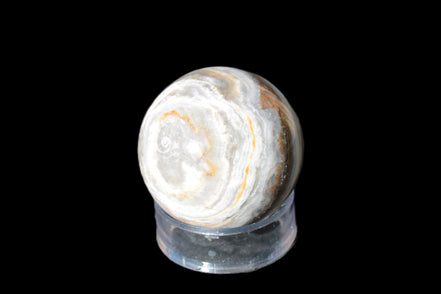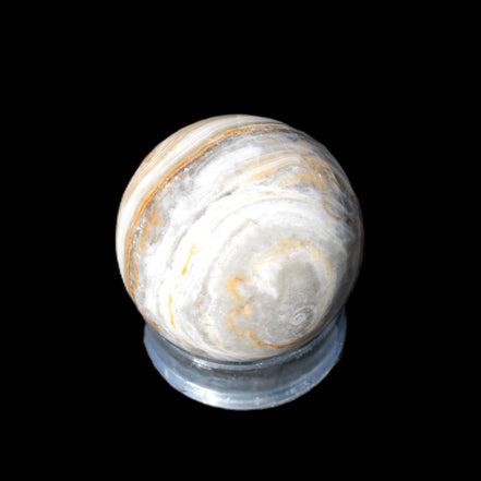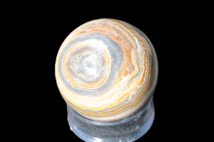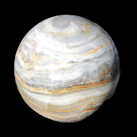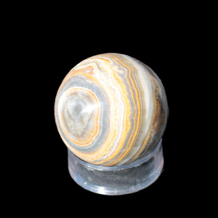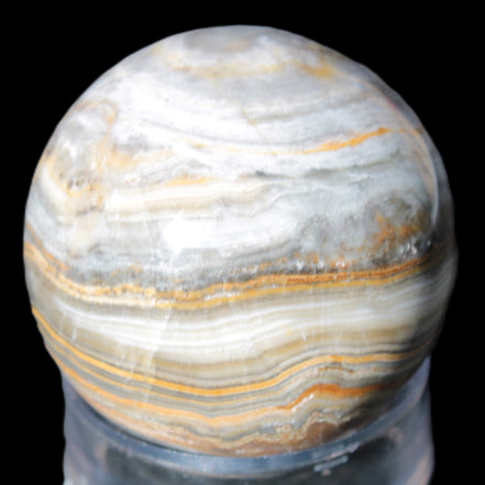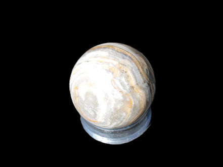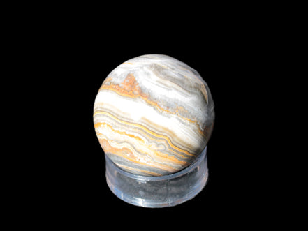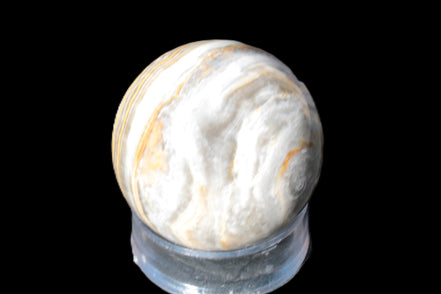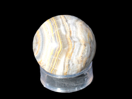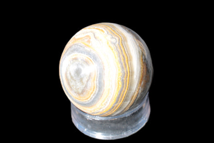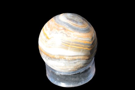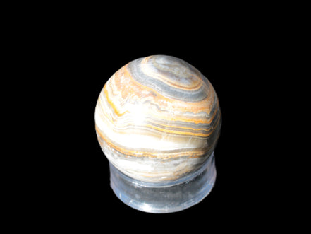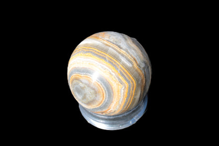 This BumbleBee Calcite sphere 51mm weighs 191g. This sphere was crafted in the artisan workshops of Lawrence Handicrafts from beautiful Bumblebee Calcite. Despite some resemblance, Bumblebee Calcite is quite different to Indonesian Bumblebee Jasper. It is an unusual form of sedimentary calcite, found only in Pakistan. This sphere has some amazing colours in its fine banding, including blue/violet greys and bright yellows.