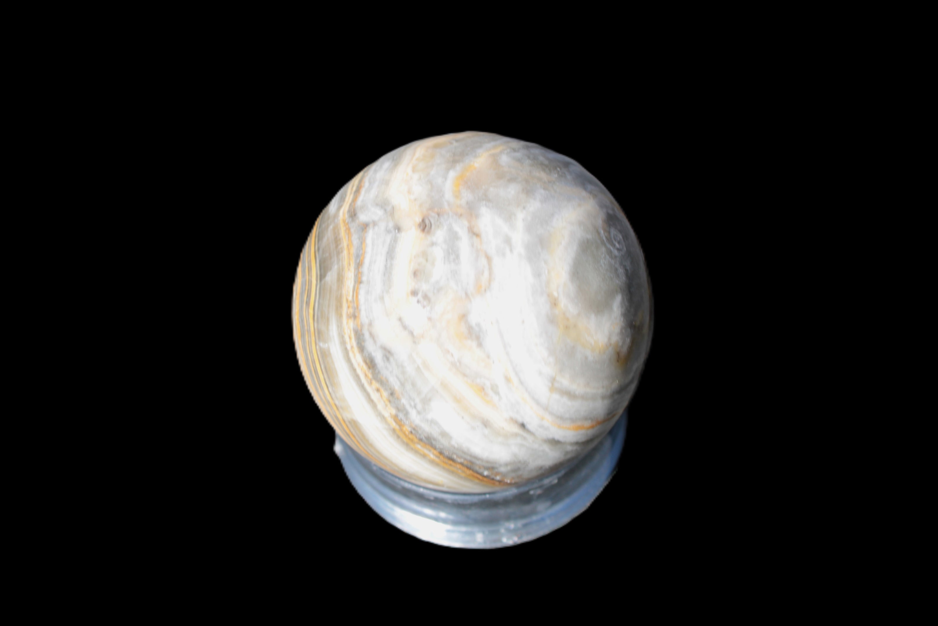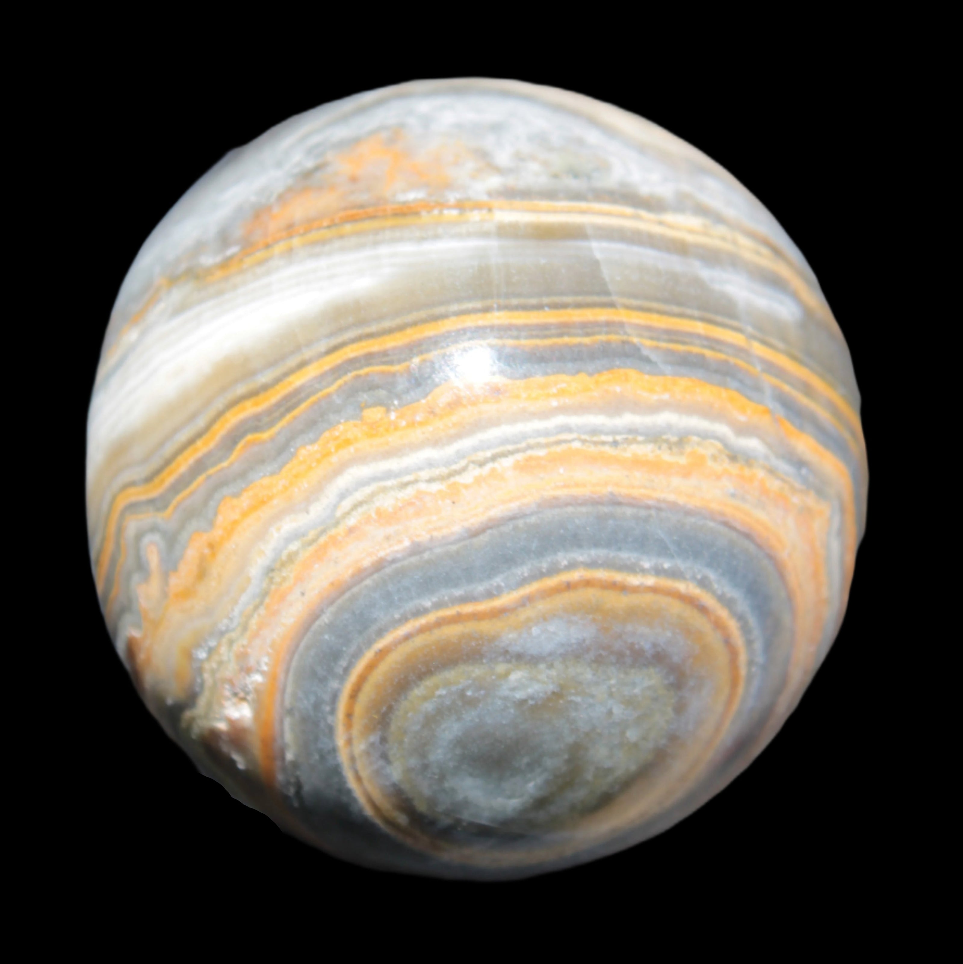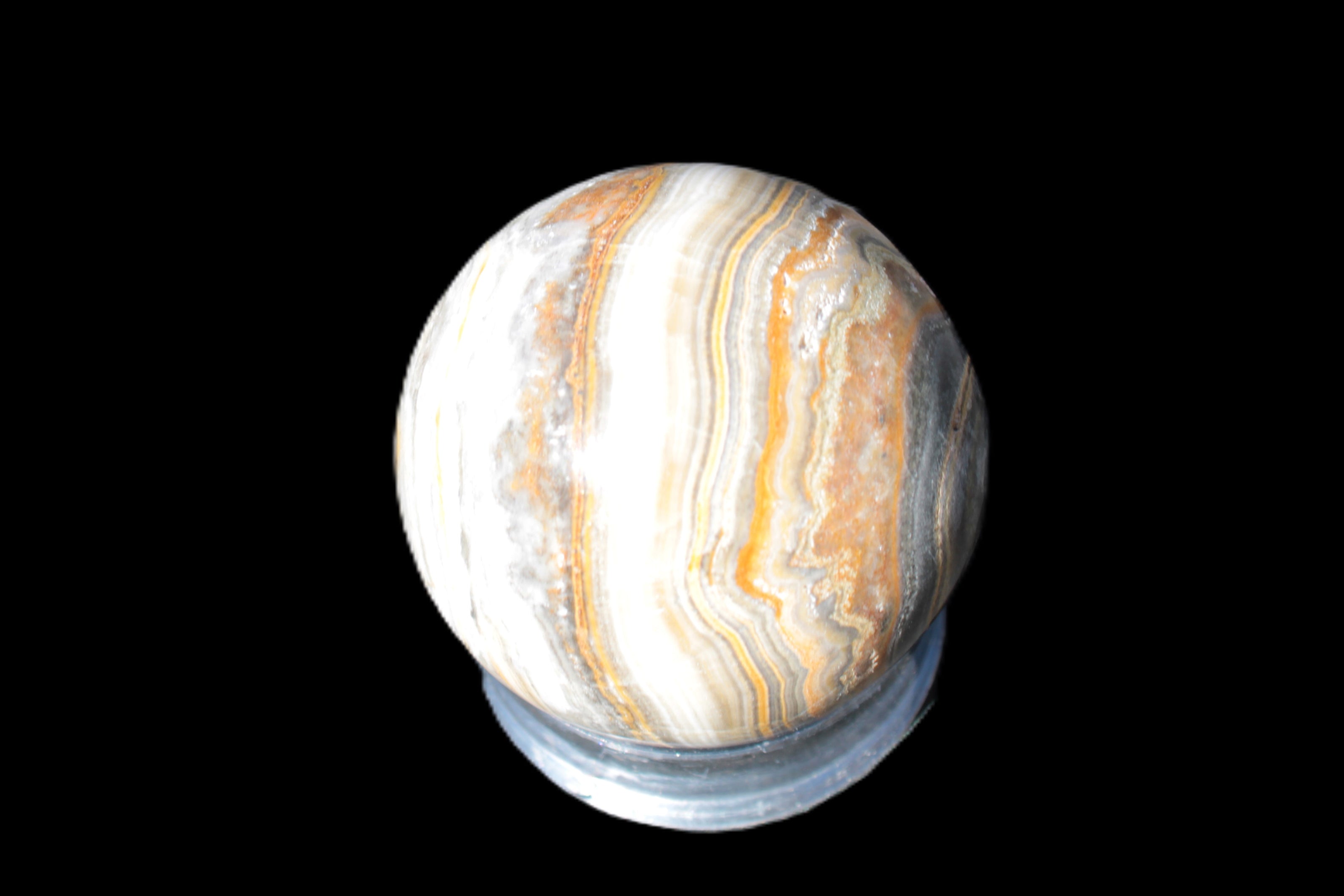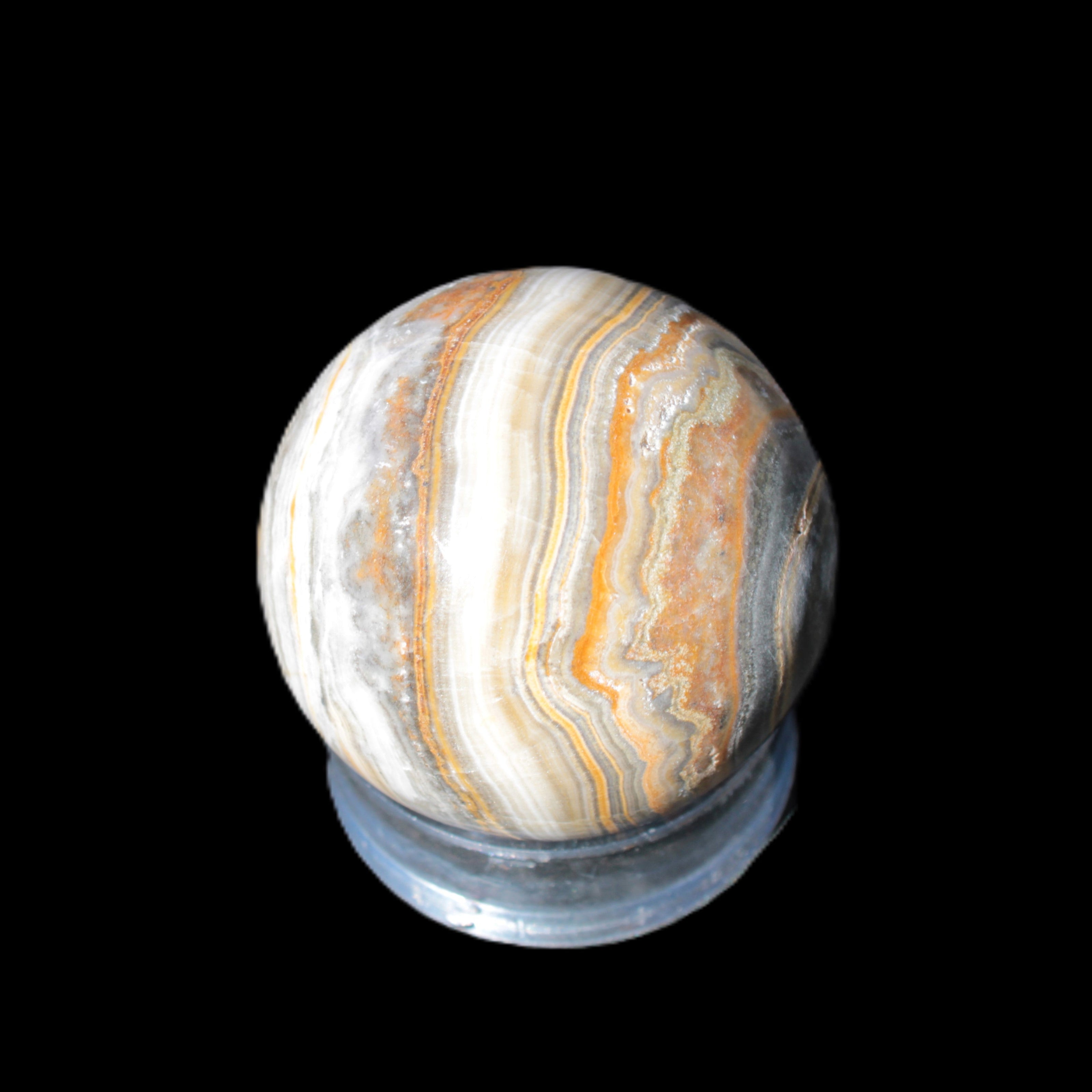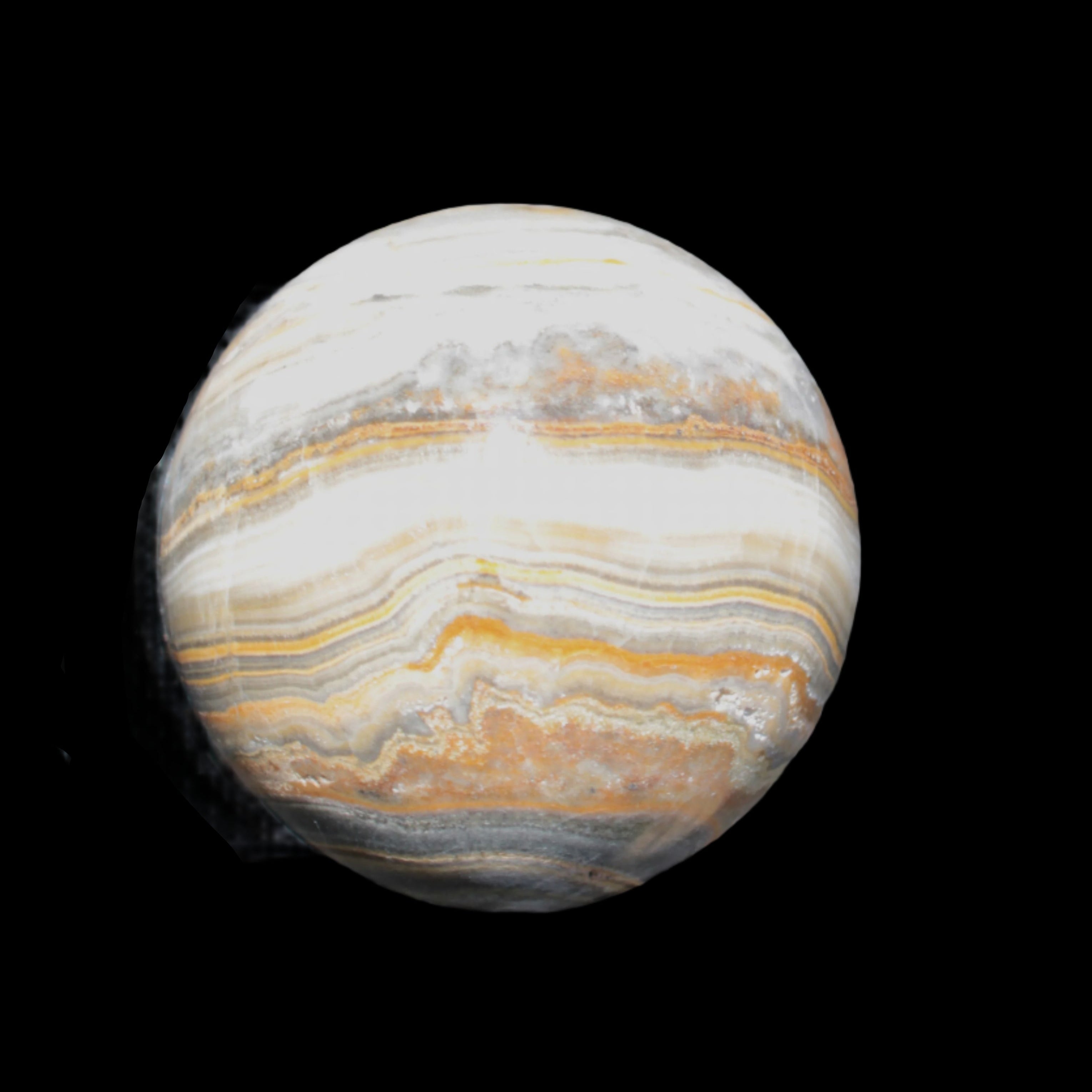 This BumbleBee Calcite sphere 51mm weighs 191g. This sphere was crafted in the artisan workshops of Lawrence Handicrafts from beautiful Bumblebee Calcite. Despite some resemblance, Bumblebee Calcite is quite different to Indonesian Bumblebee Jasper. It is an unusual form of sedimentary calcite, found only in Pakistan. This sphere has some amazing colours in its fine banding, including blue/violet greys and bright yellows.