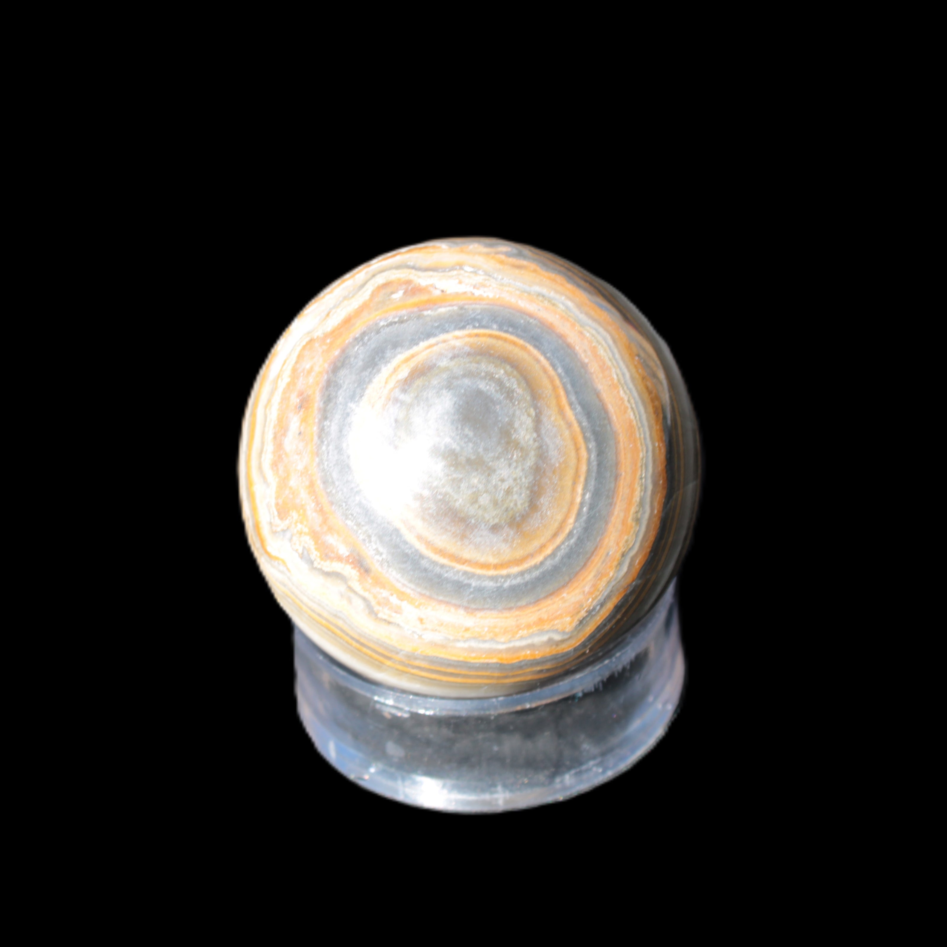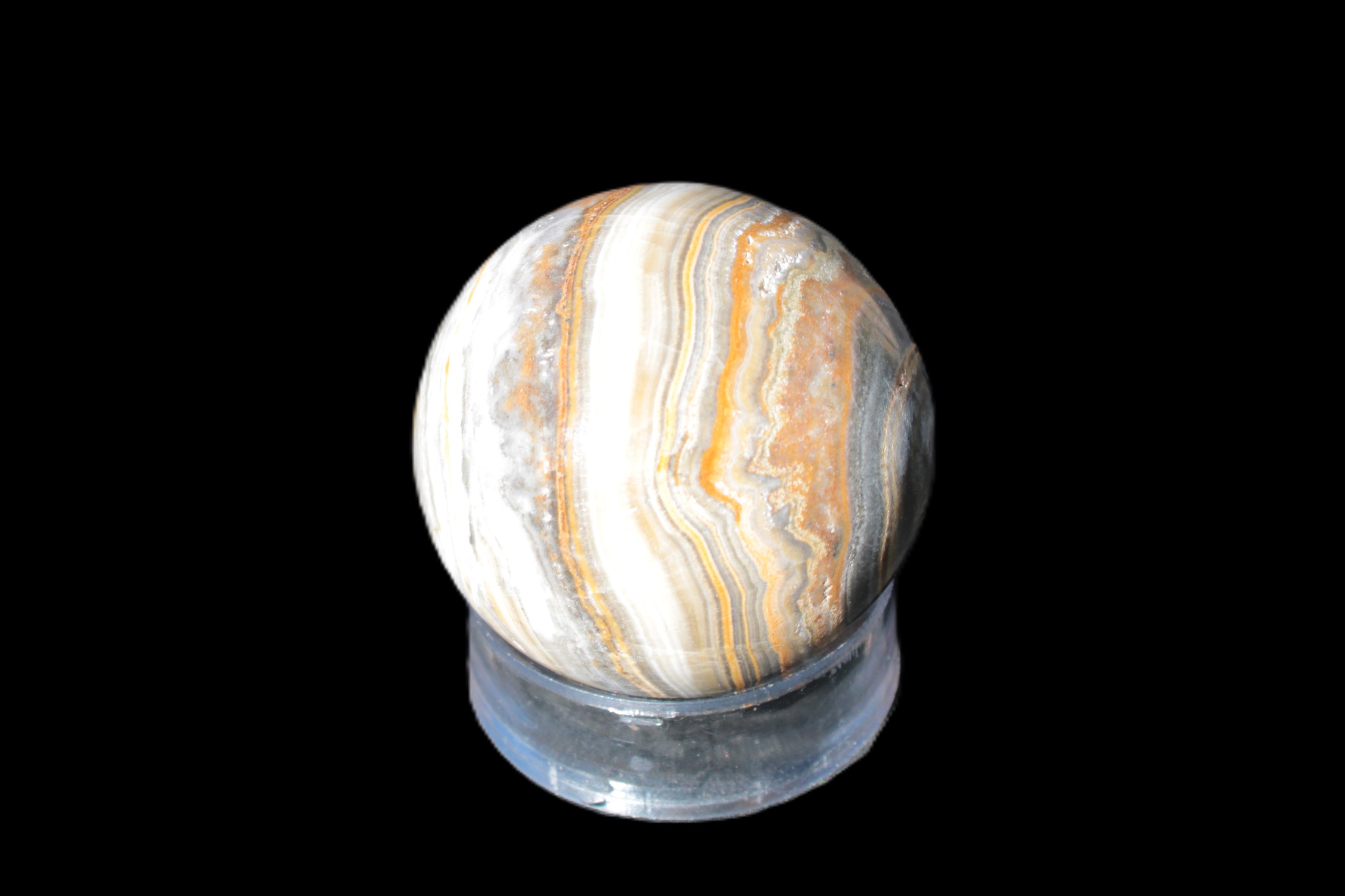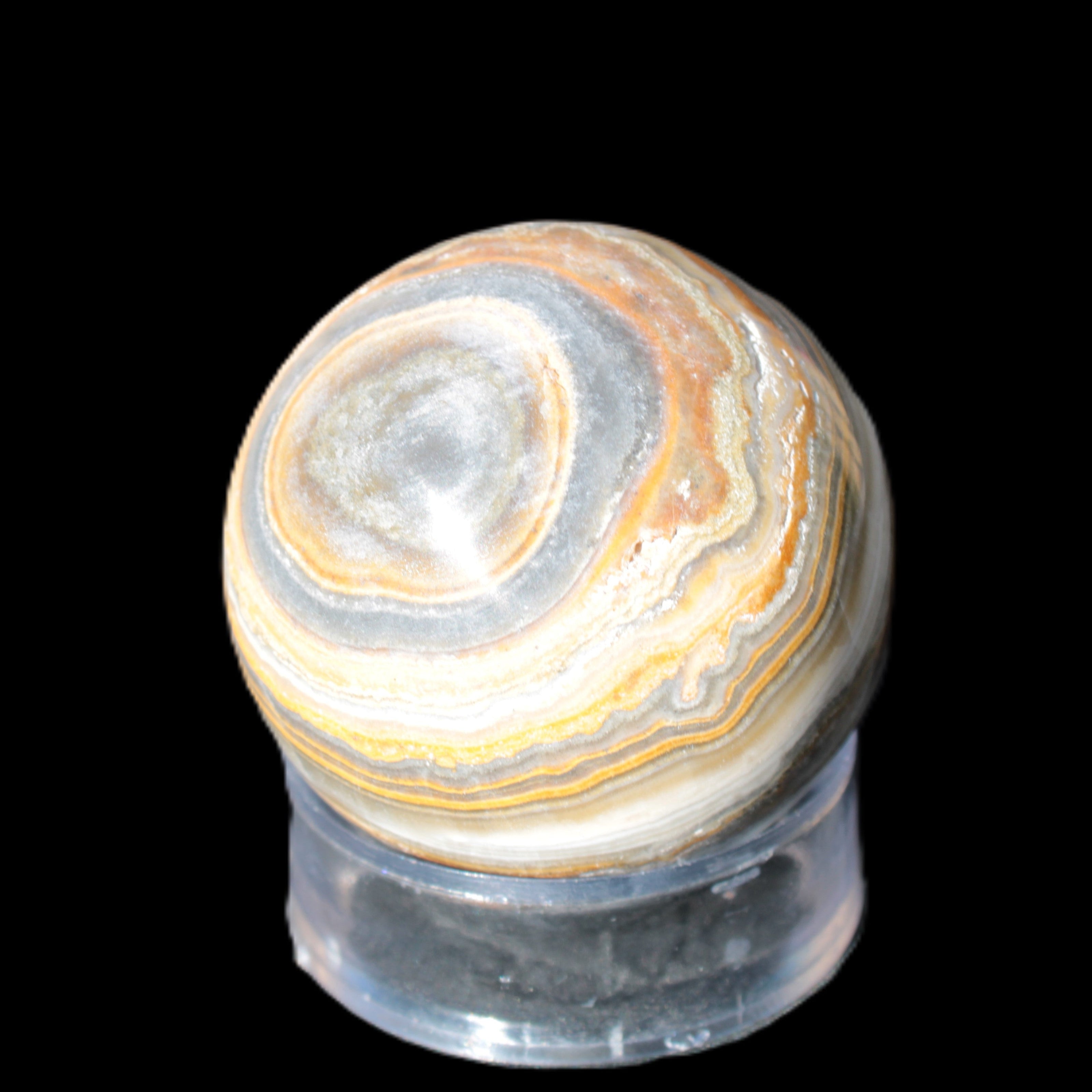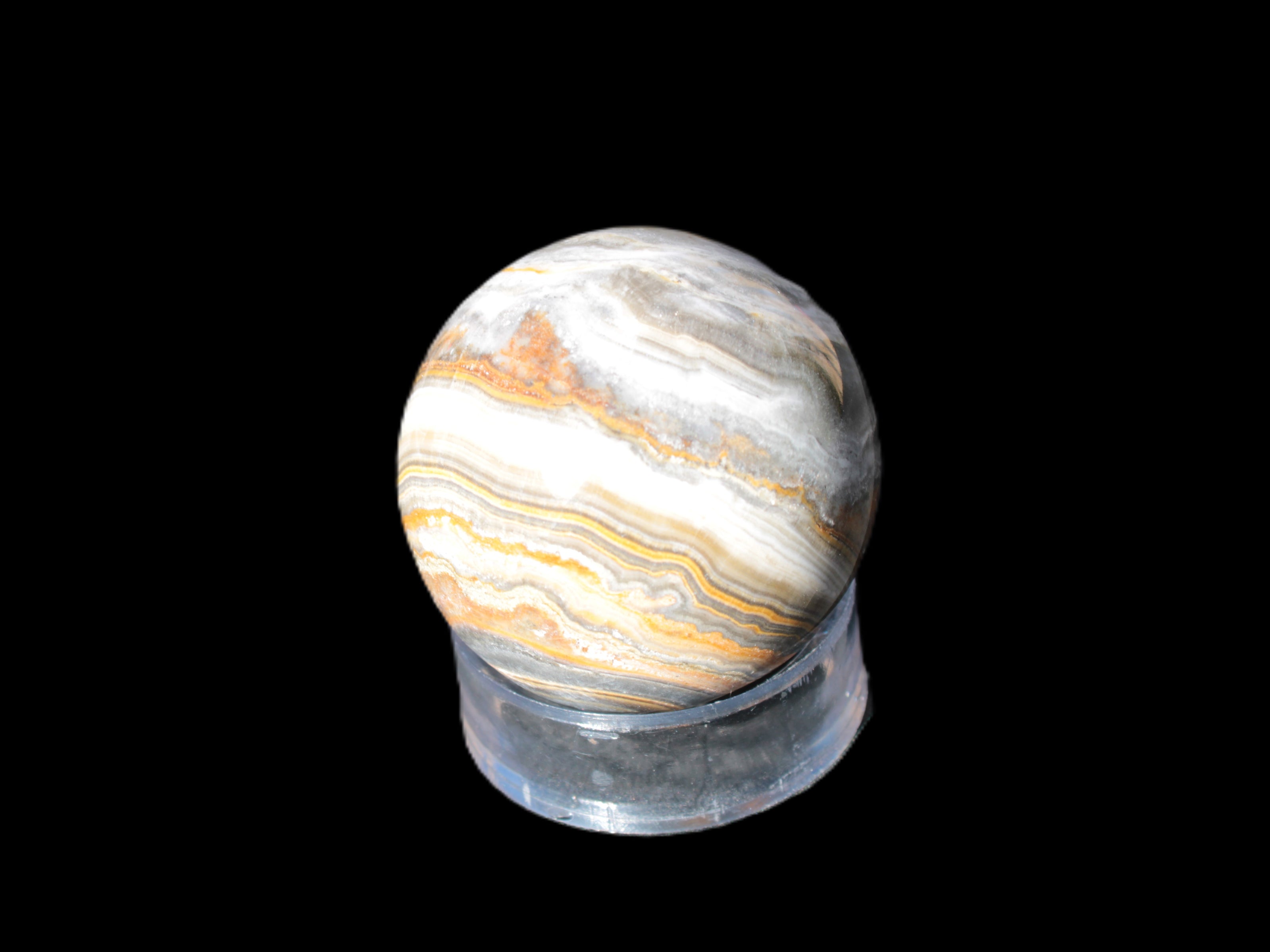This BumbleBee Calcite sphere 51mm weighs 191g. This sphere was crafted in the artisan workshops of Lawrence Handicrafts from beautiful Bumblebee Calcite. Despite some resemblance, Bumblebee Calcite is quite different to Indonesian Bumblebee Jasper. It is an unusual form of sedimentary calcite, found only in Pakistan. This sphere has some amazing colours in its fine banding, including blue/violet greys and bright yellows.