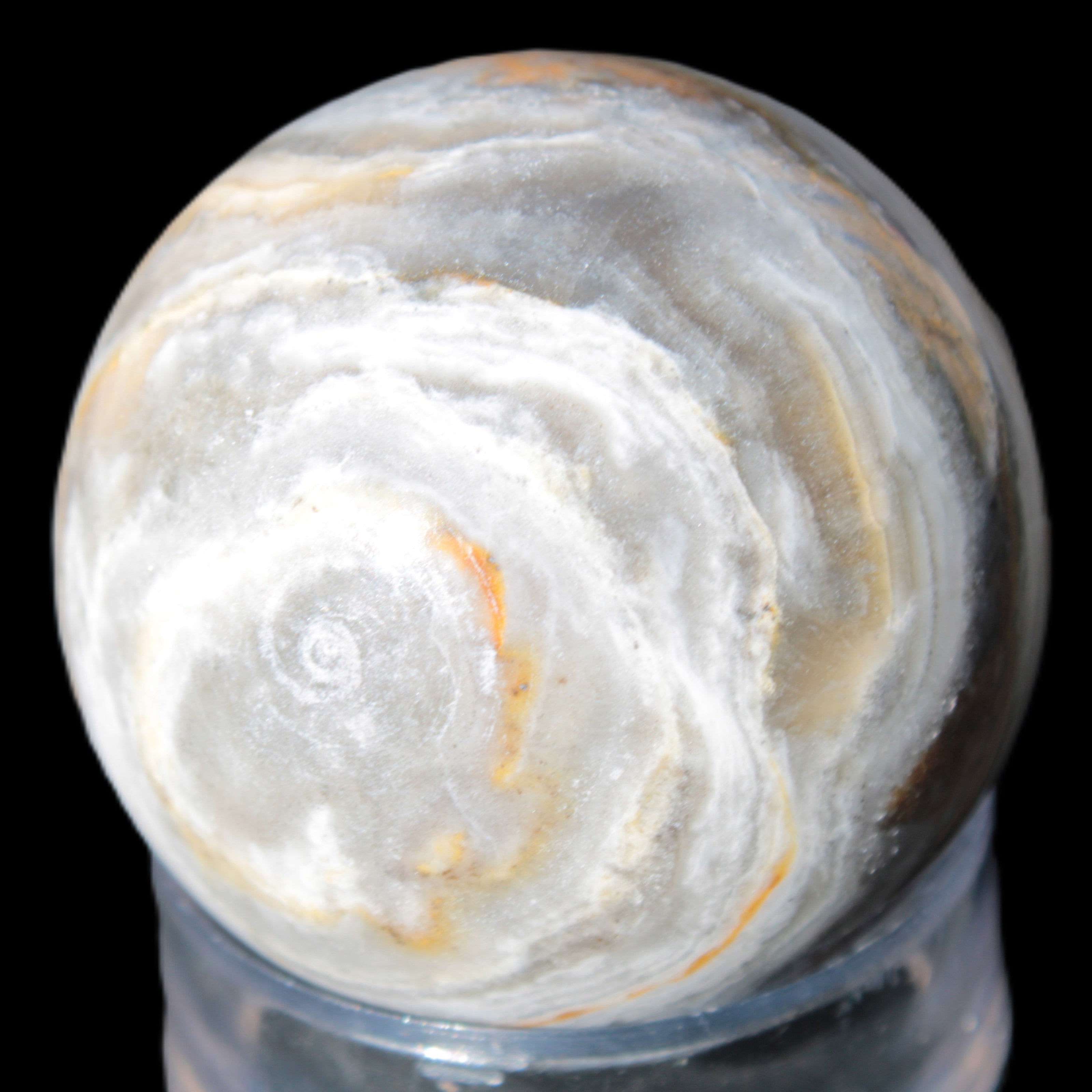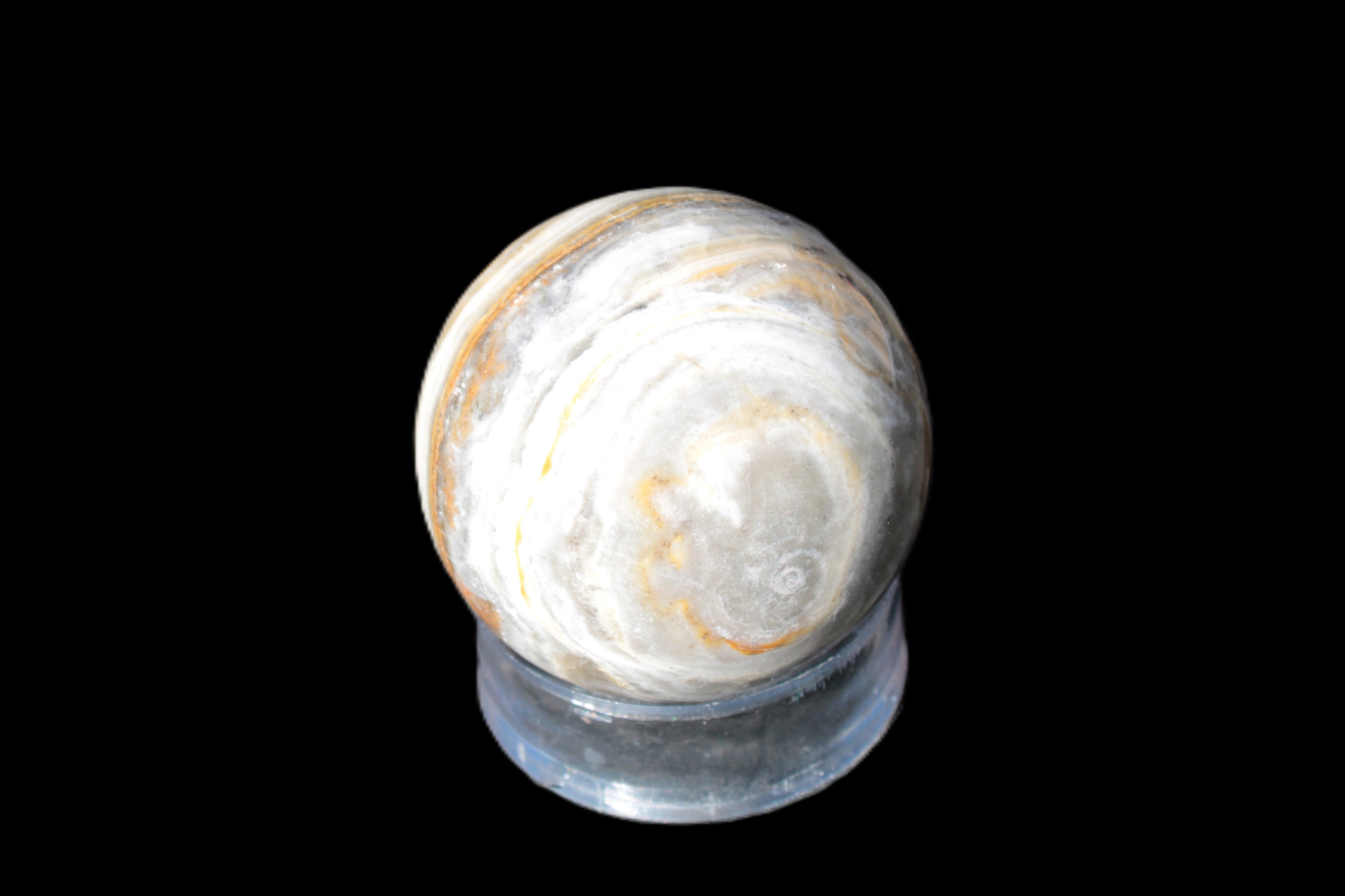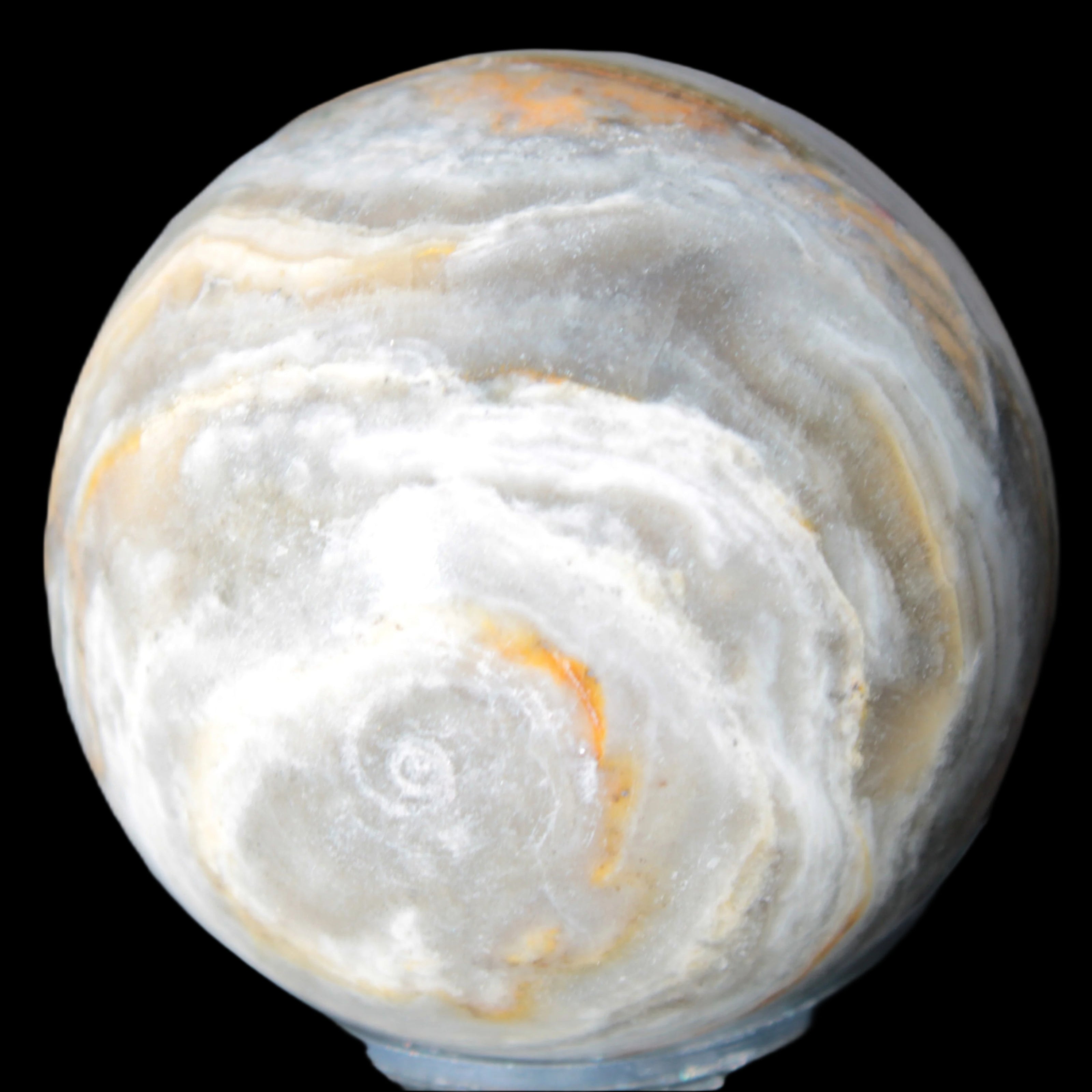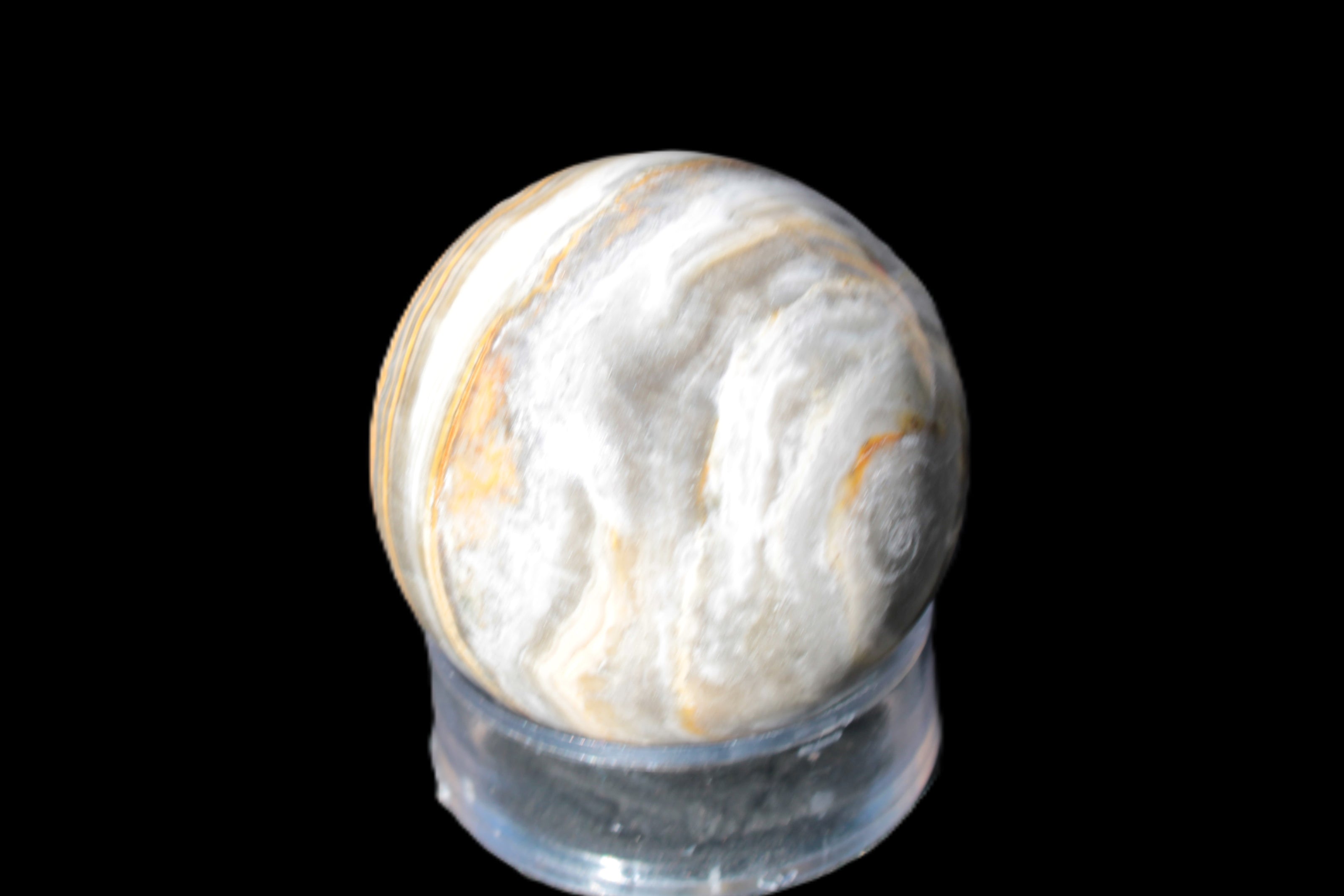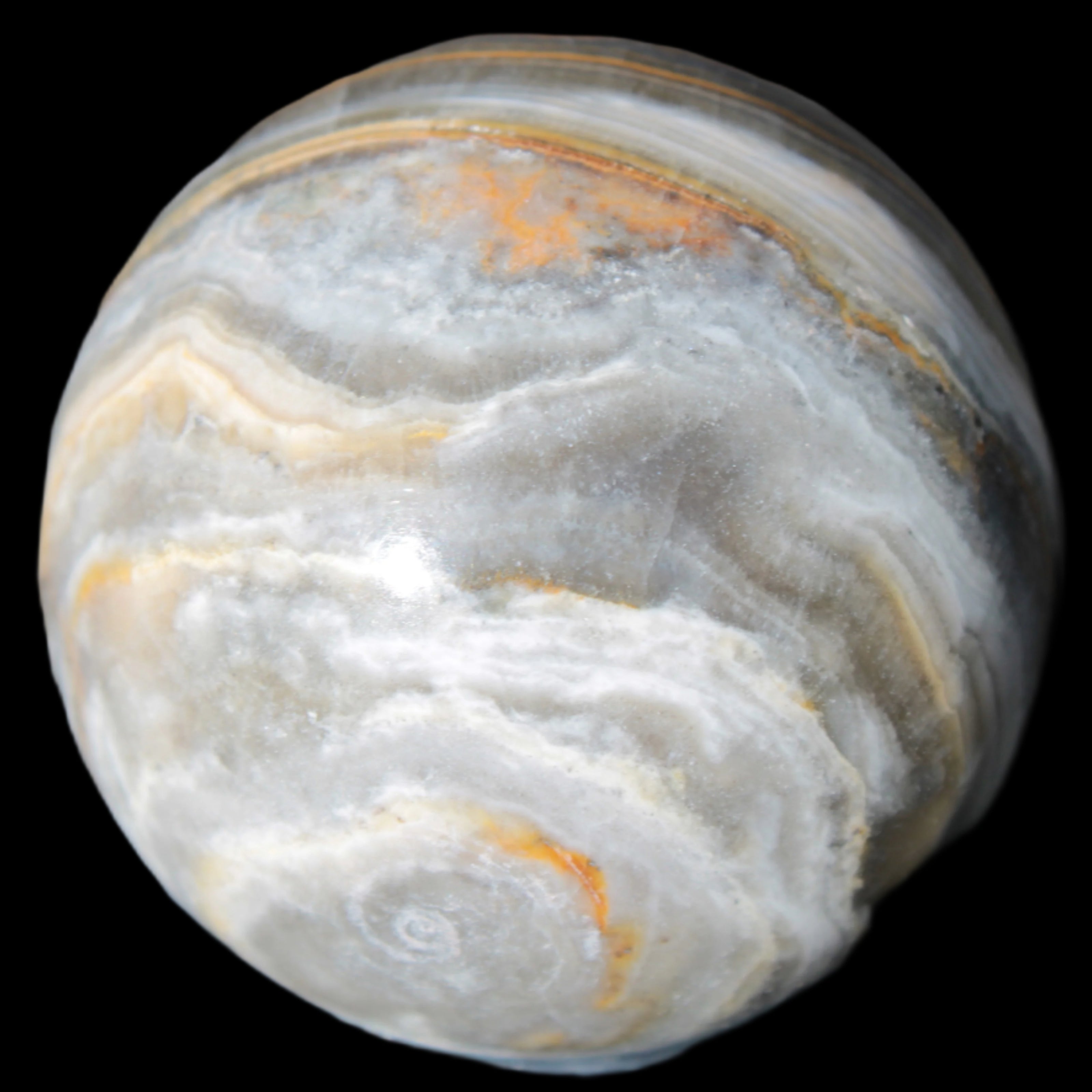 This BumbleBee Calcite sphere 51mm weighs 191g. This sphere was crafted in the artisan workshops of Lawrence Handicrafts from beautiful Bumblebee Calcite. Despite some resemblance, Bumblebee Calcite is quite different to Indonesian Bumblebee Jasper. It is an unusual form of sedimentary calcite, found only in Pakistan. This sphere has some amazing colours in its fine banding, including blue/violet greys and bright yellows.
