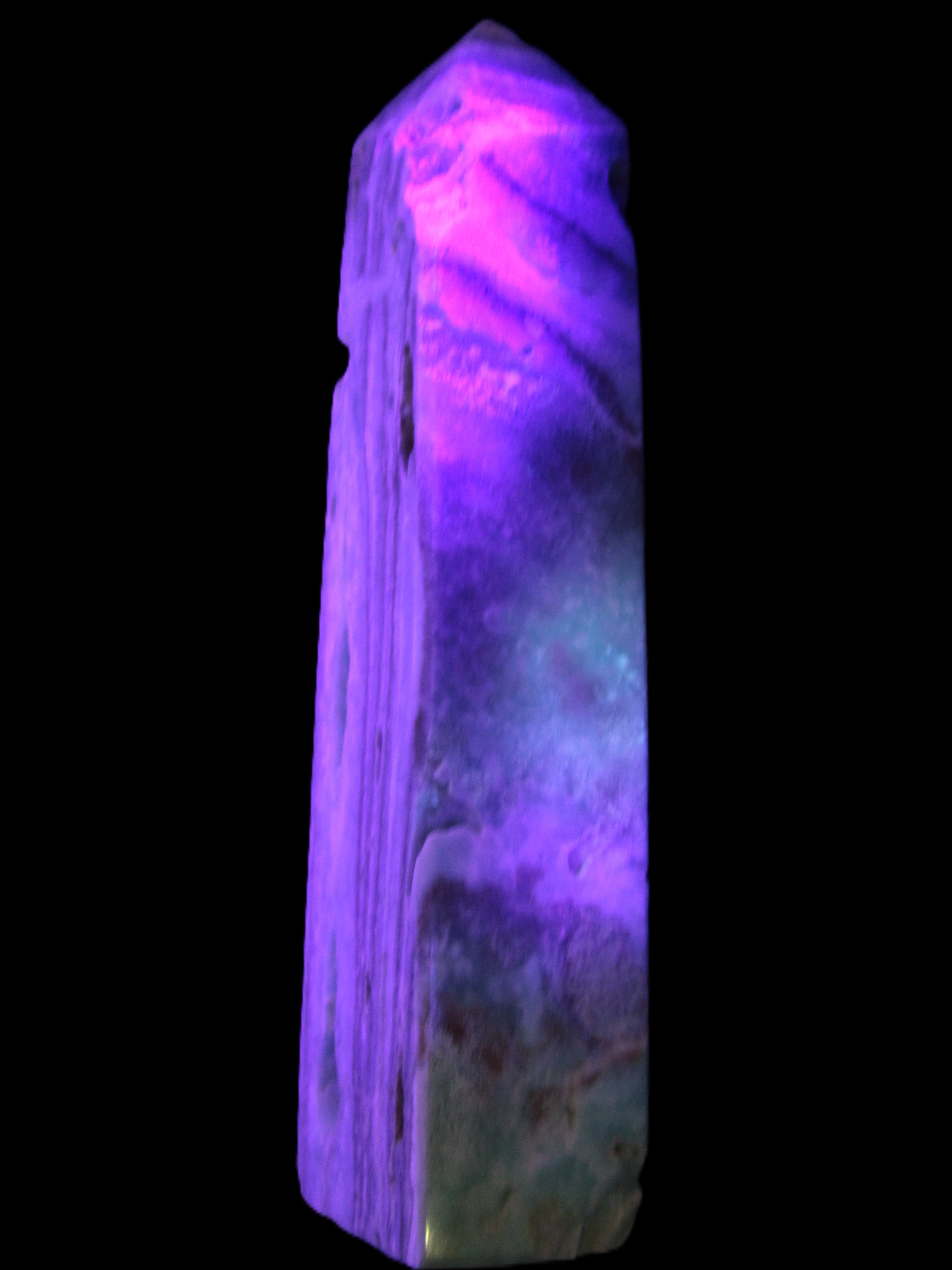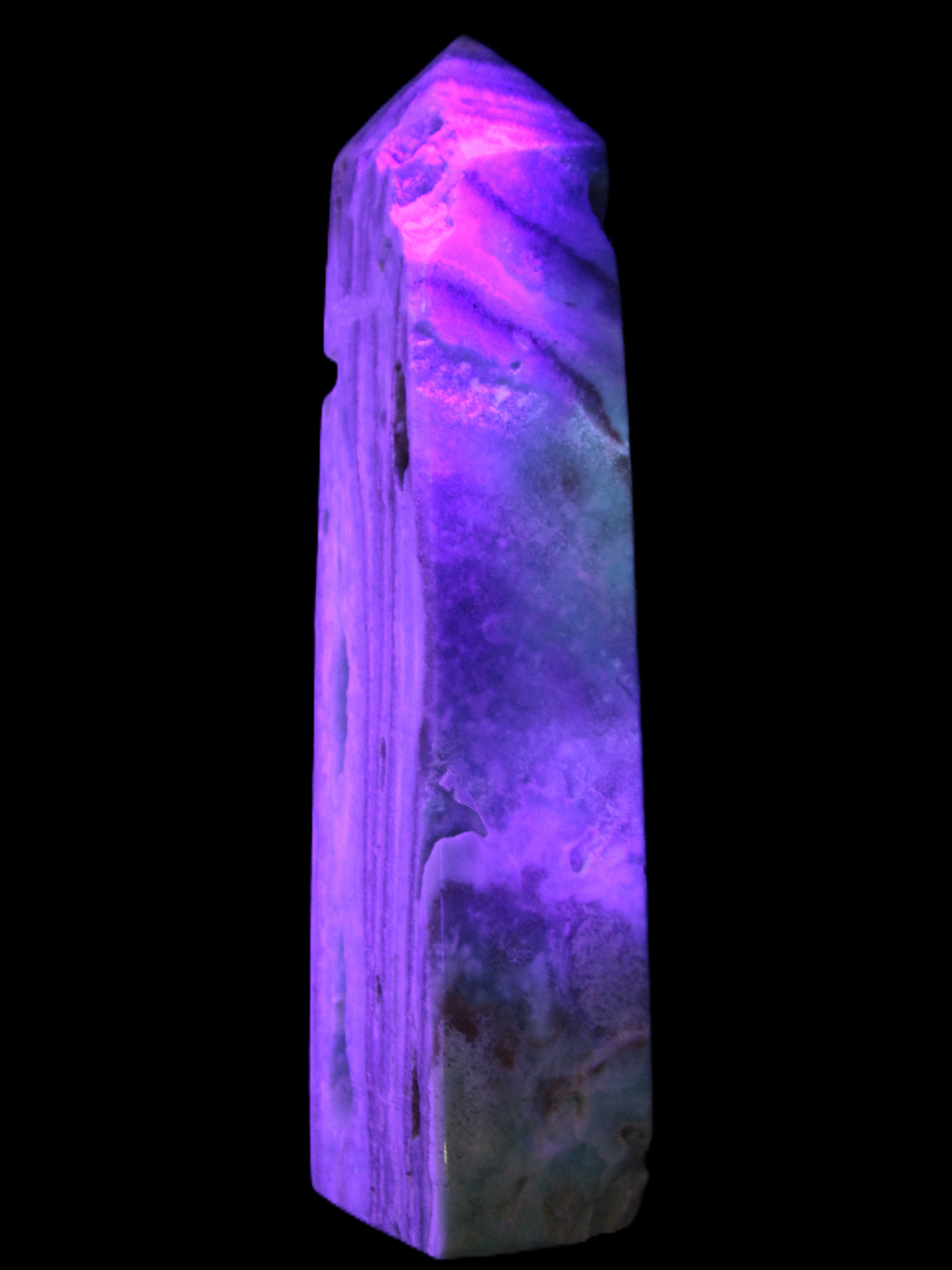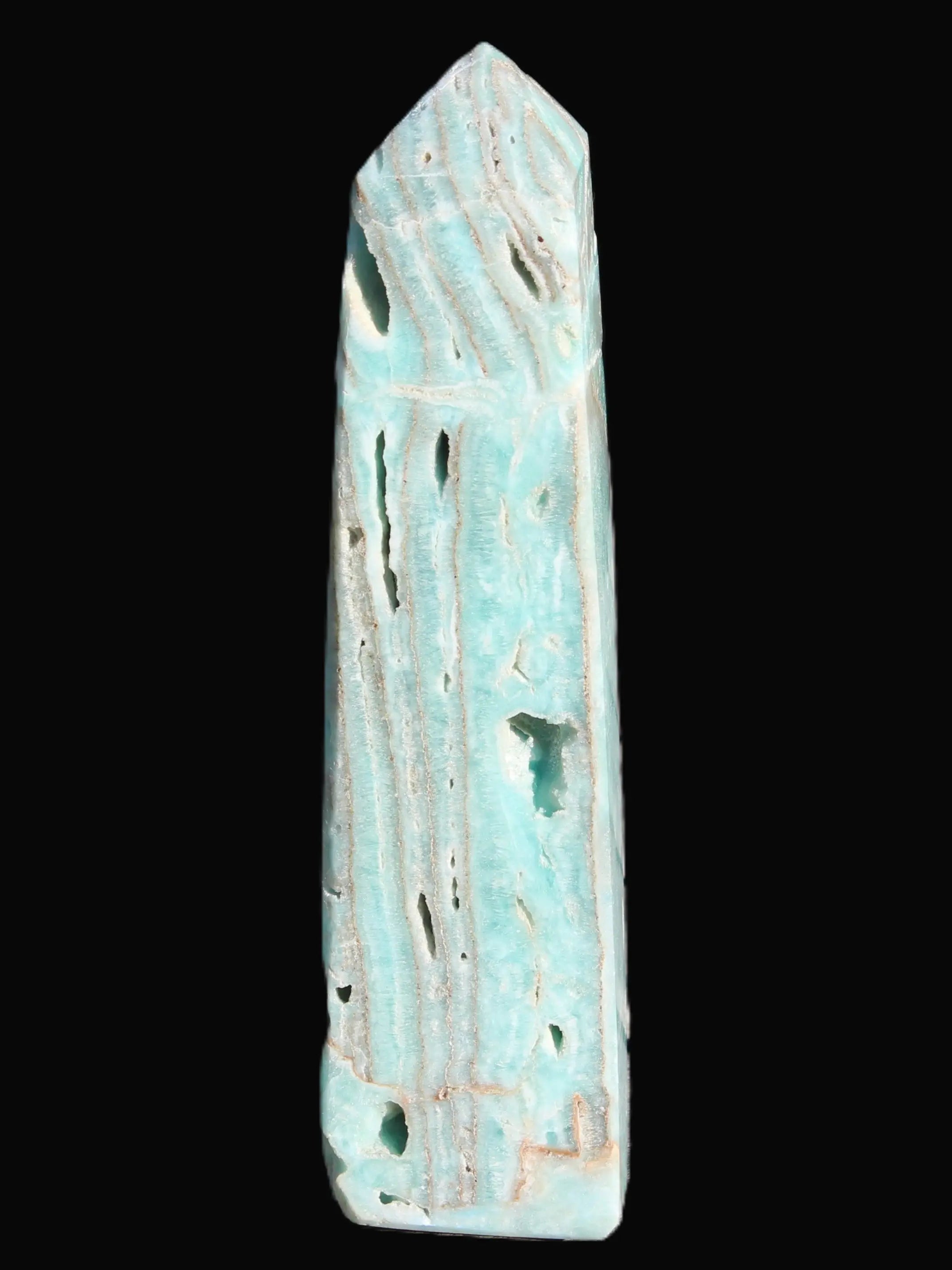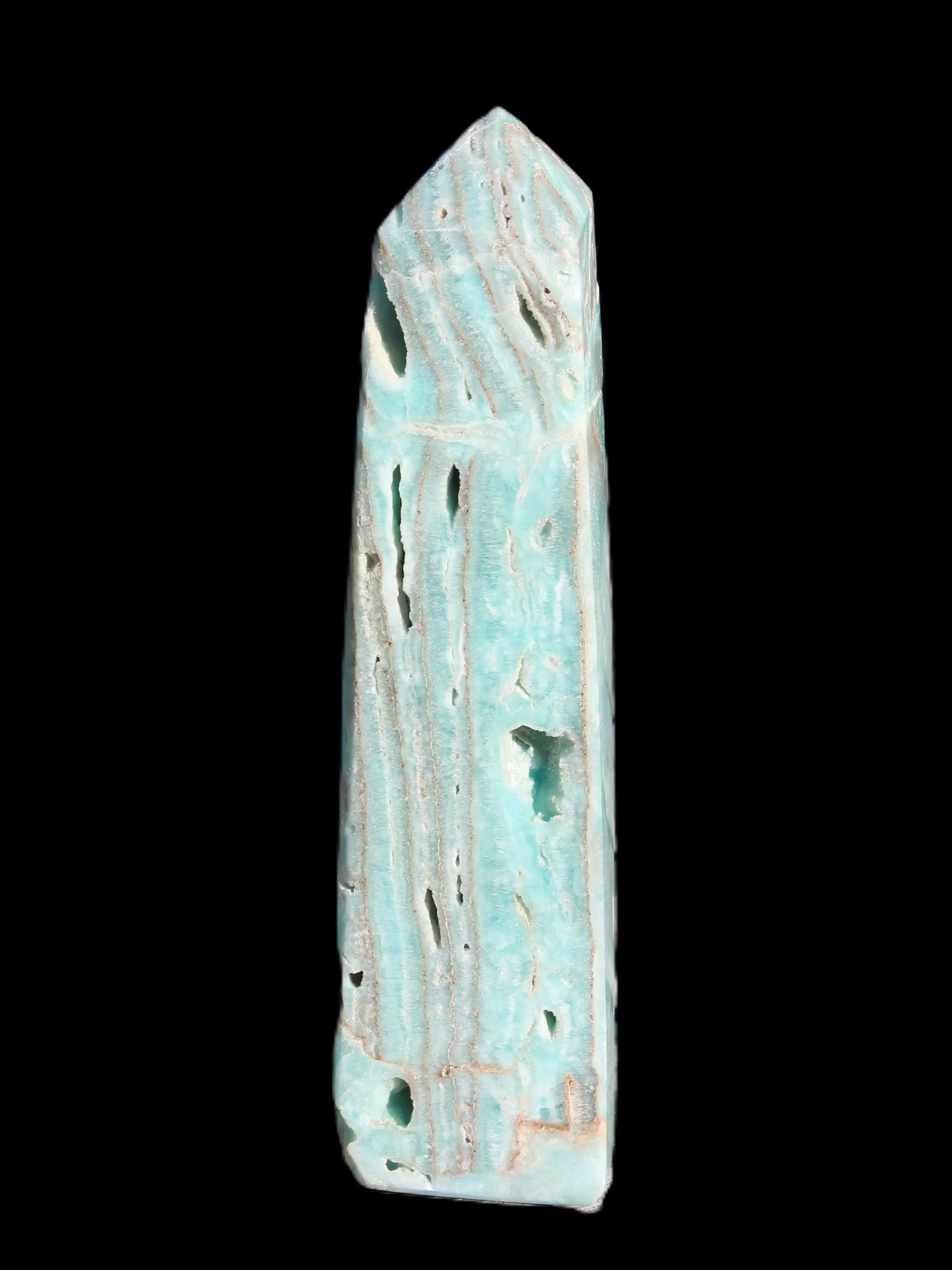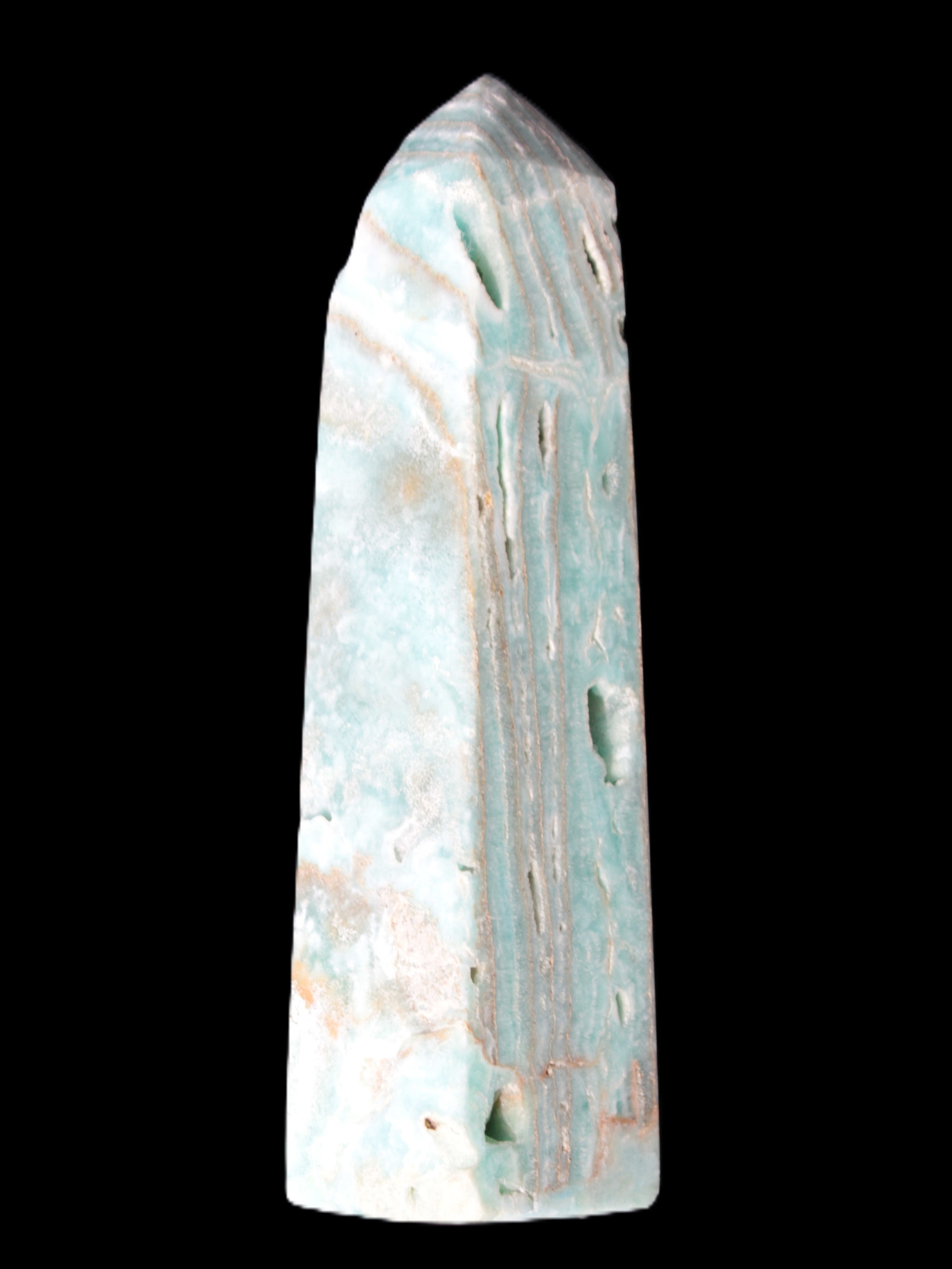 This Caribbean Calcite aqua blue obelisk stands 170mm tall and weighs 539g. This is a rectangular tower. It is 42mm by 35mm wide at its base. Caribbean Calcite is a form of Aragonite.