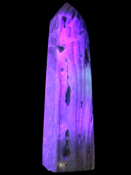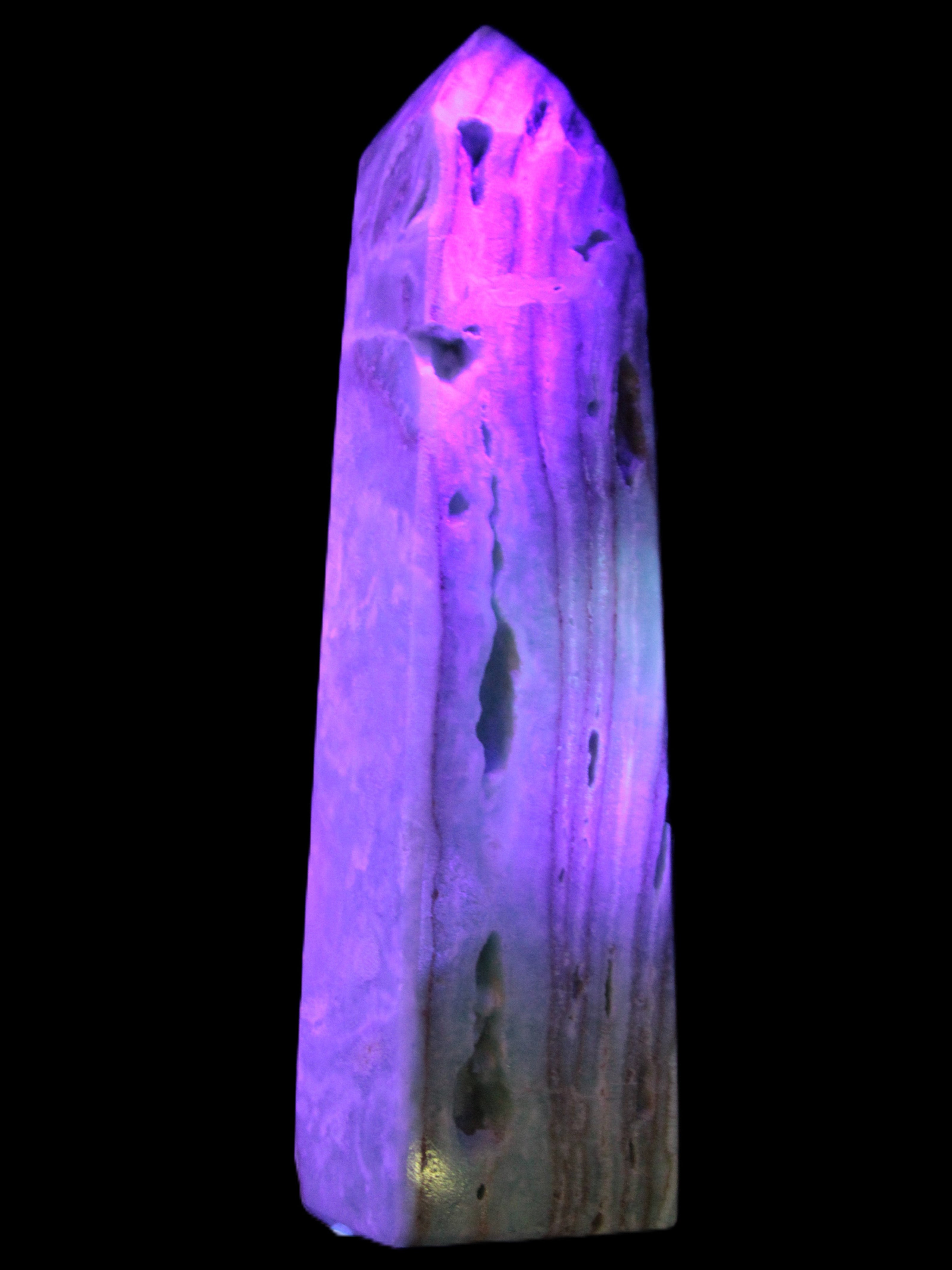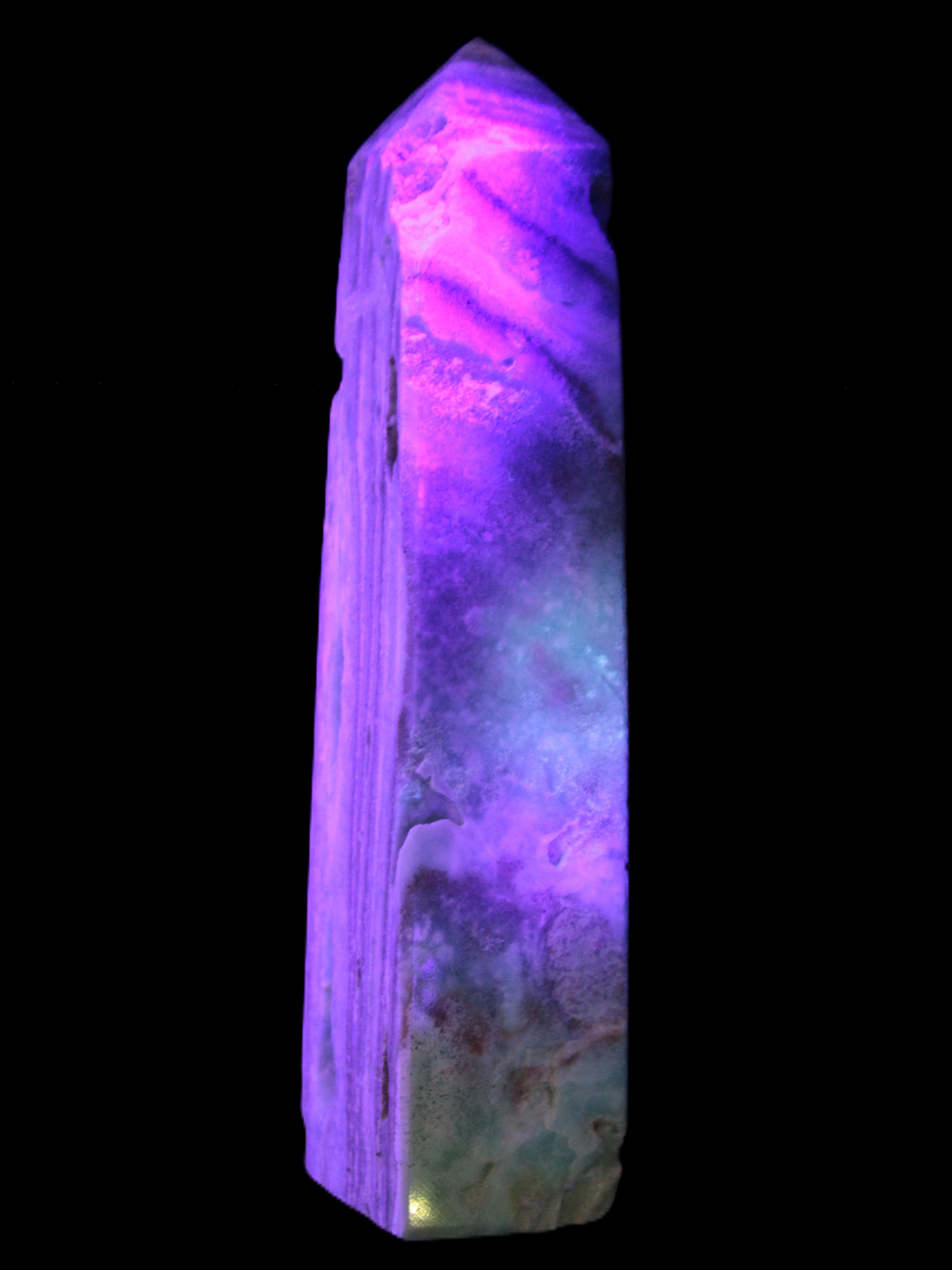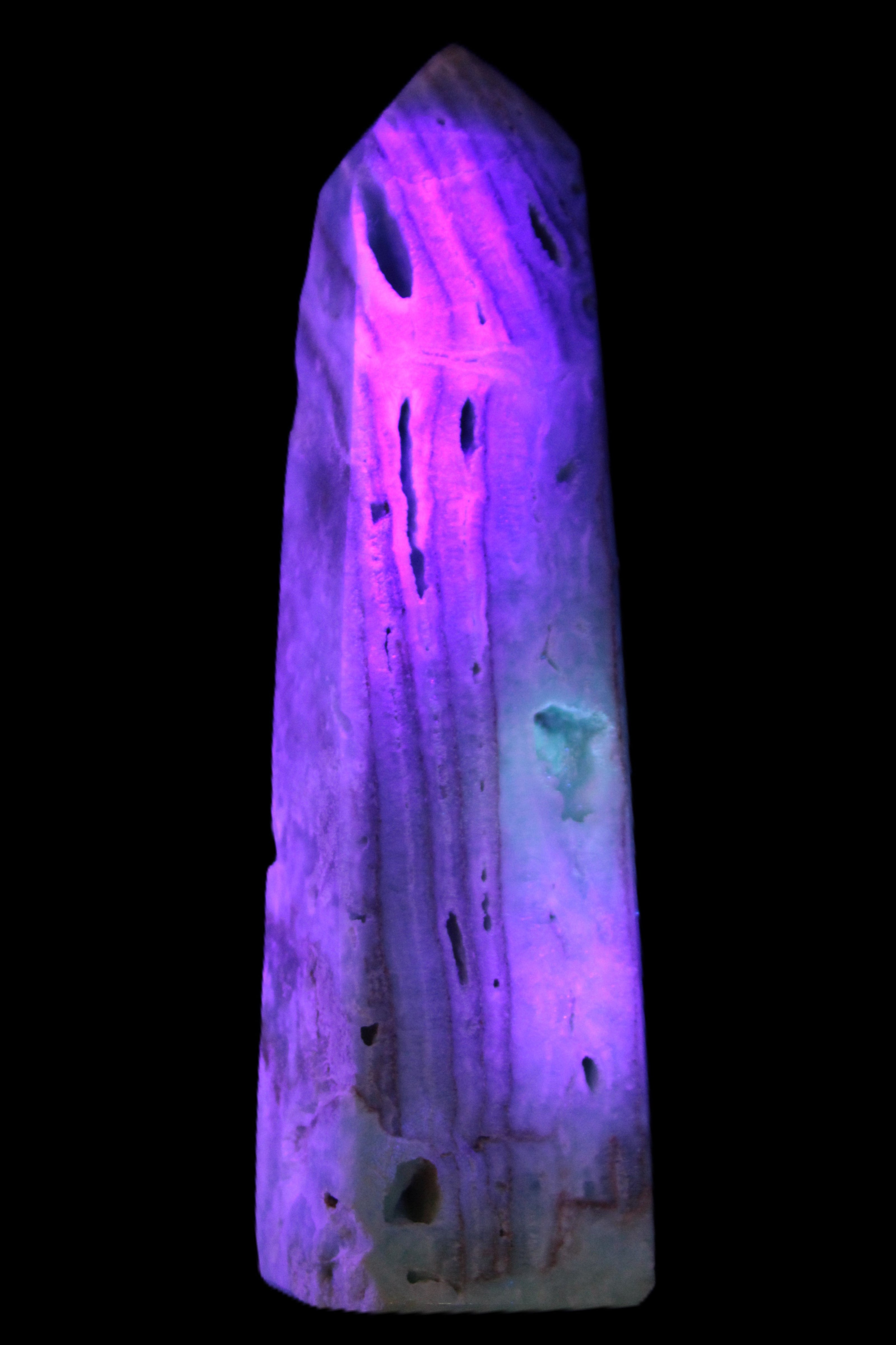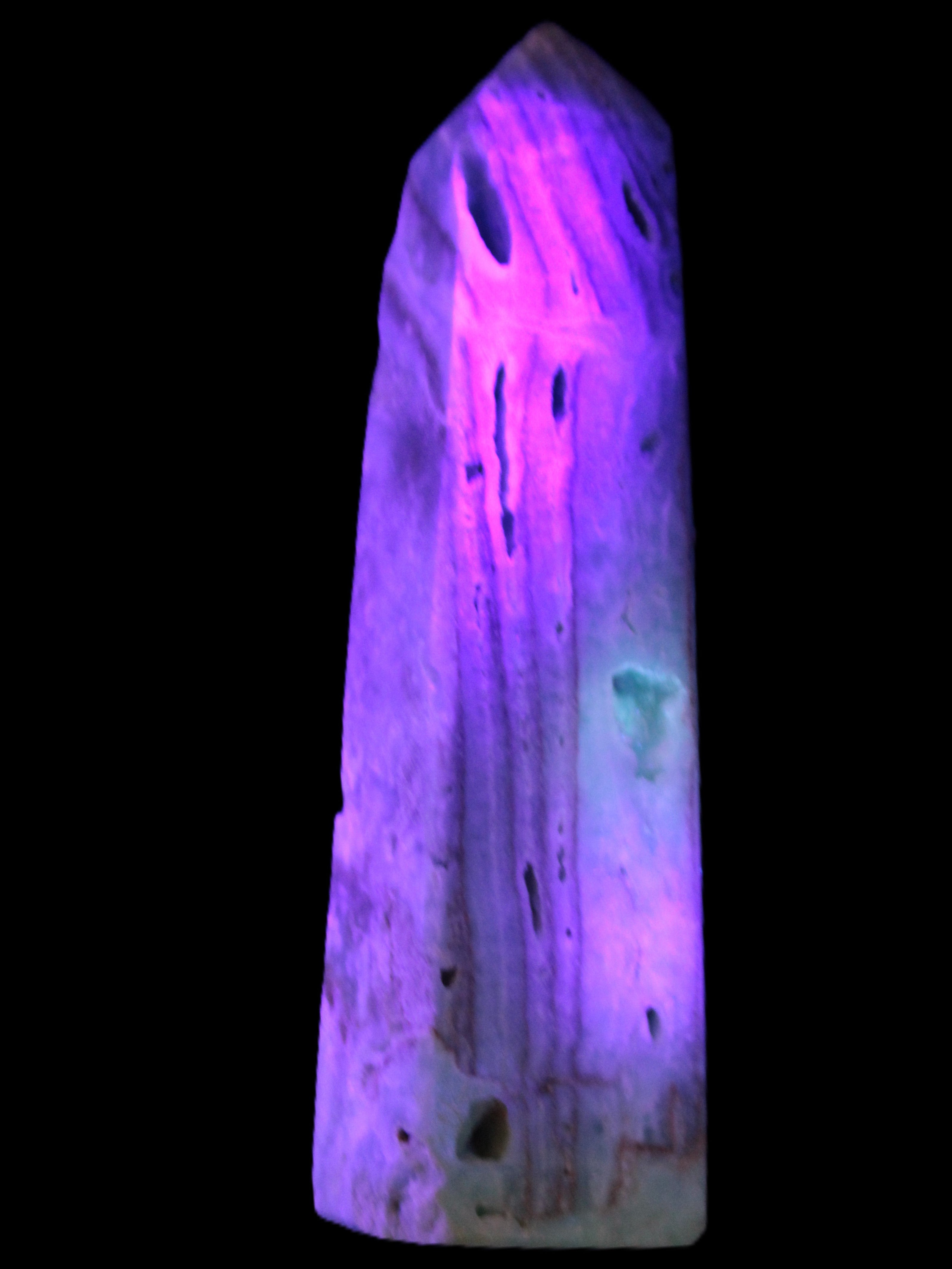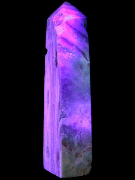 This Caribbean Calcite aqua blue obelisk stands 170mm tall and weighs 539g. This is a rectangular tower. It is 42mm by 35mm wide at its base. Caribbean Calcite is a form of Aragonite.