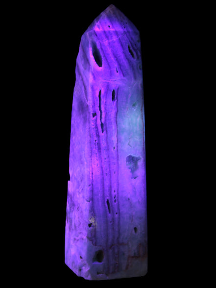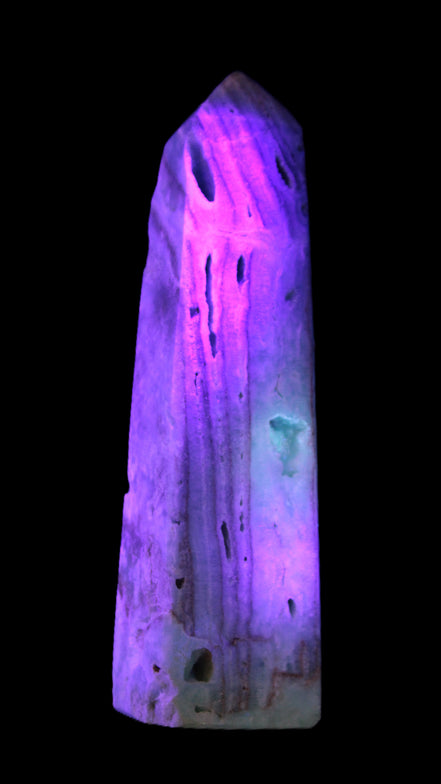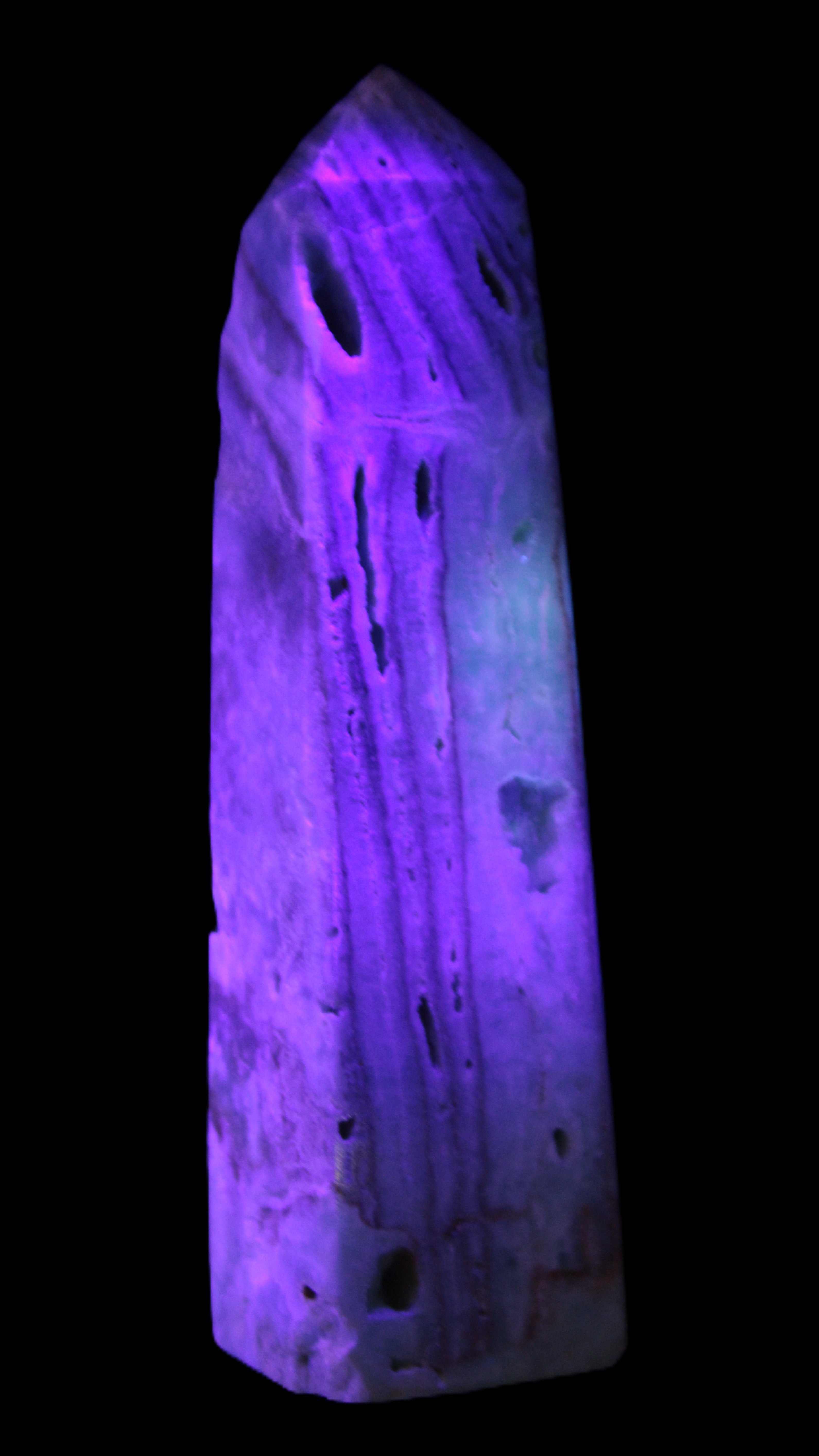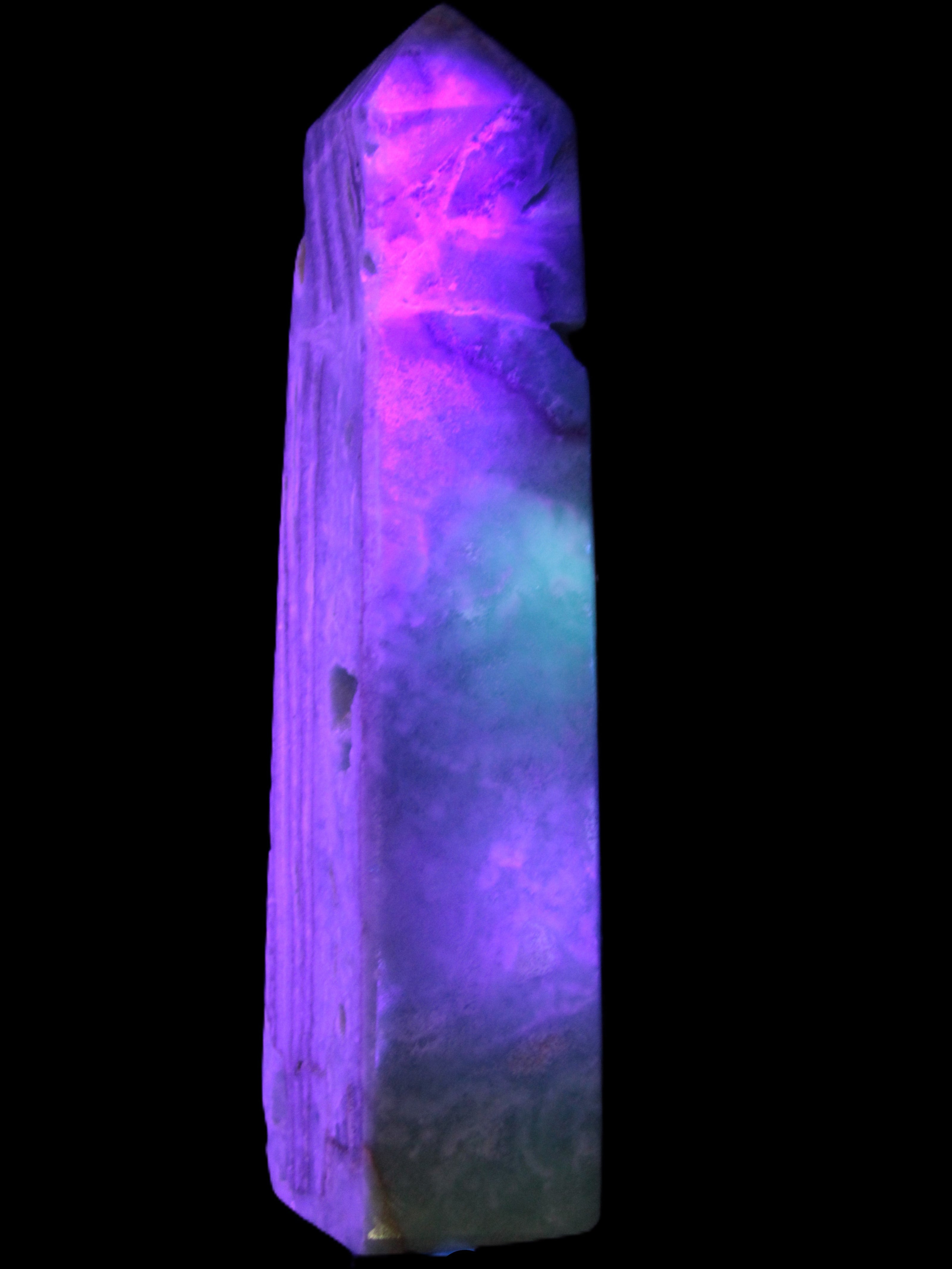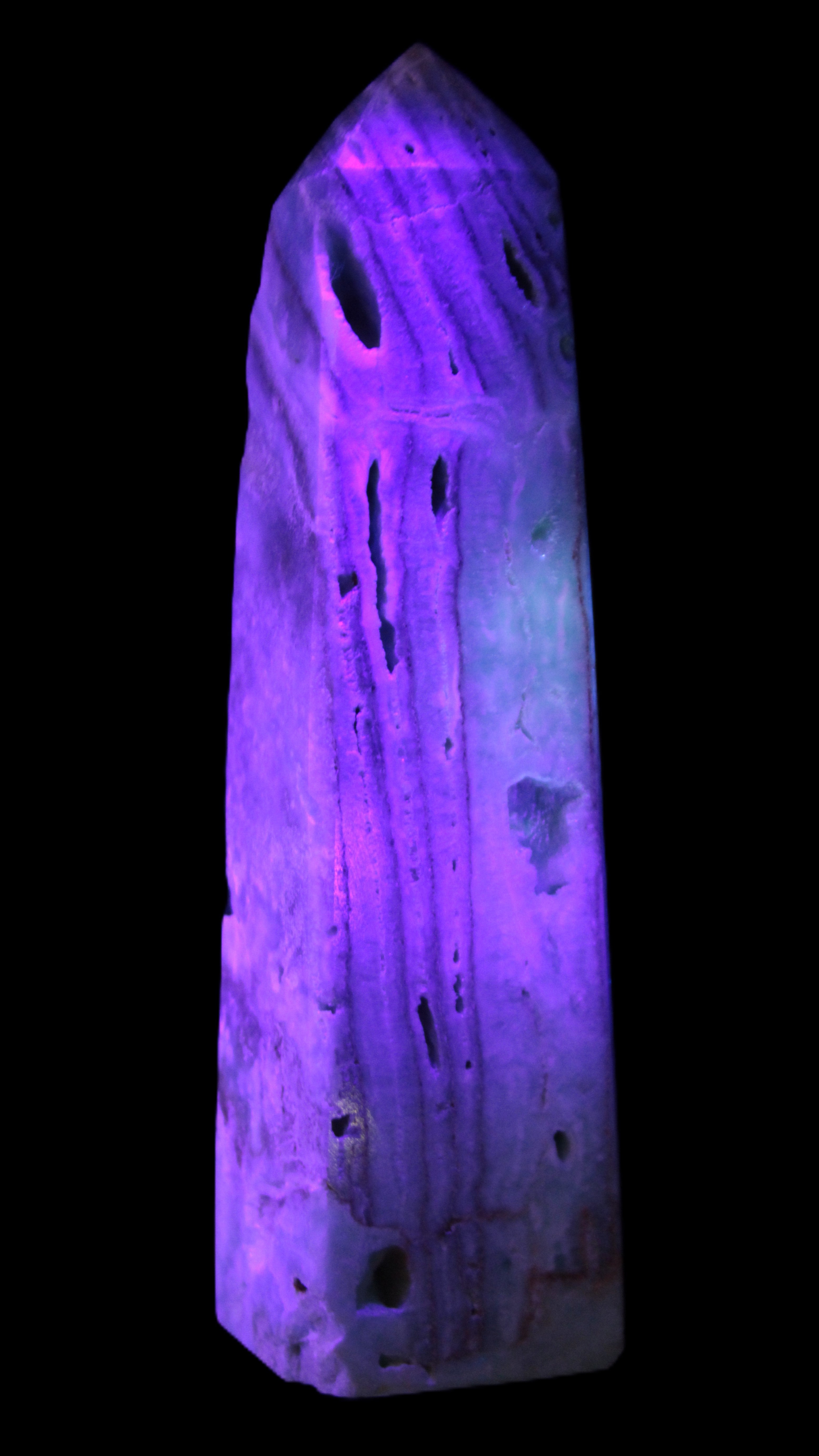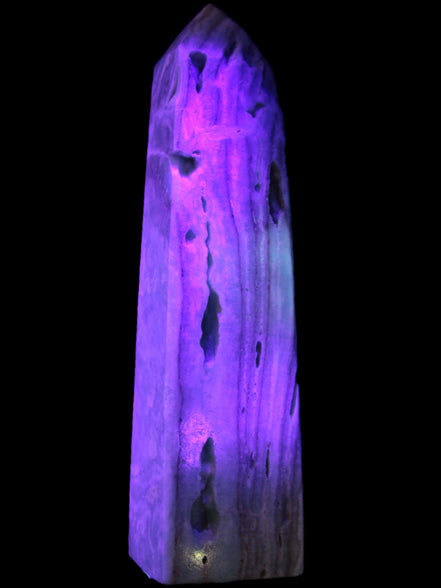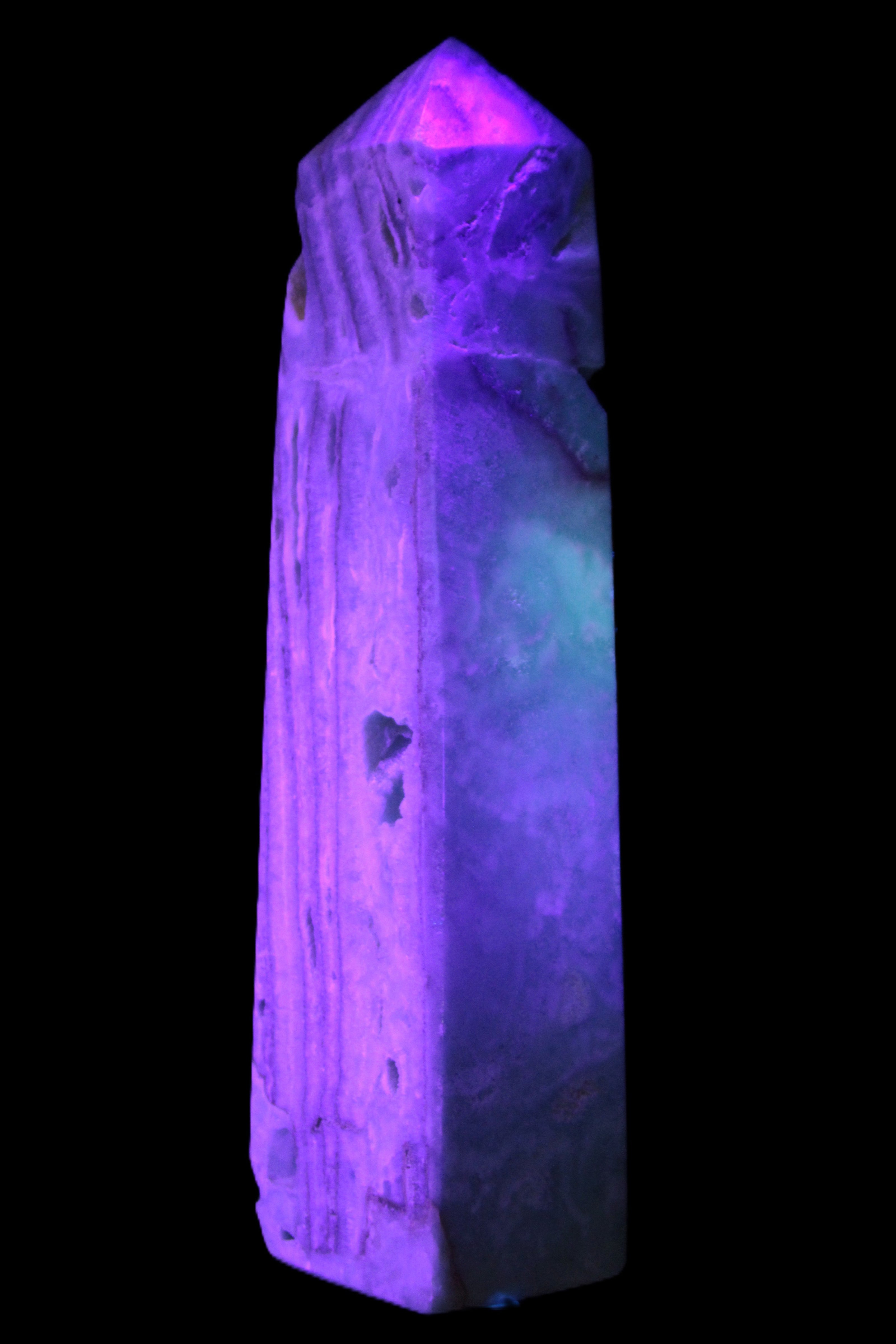 This Caribbean Calcite aqua blue obelisk stands 170mm tall and weighs 539g. This is a rectangular tower. It is 42mm by 35mm wide at its base. Caribbean Calcite is a form of Aragonite.
