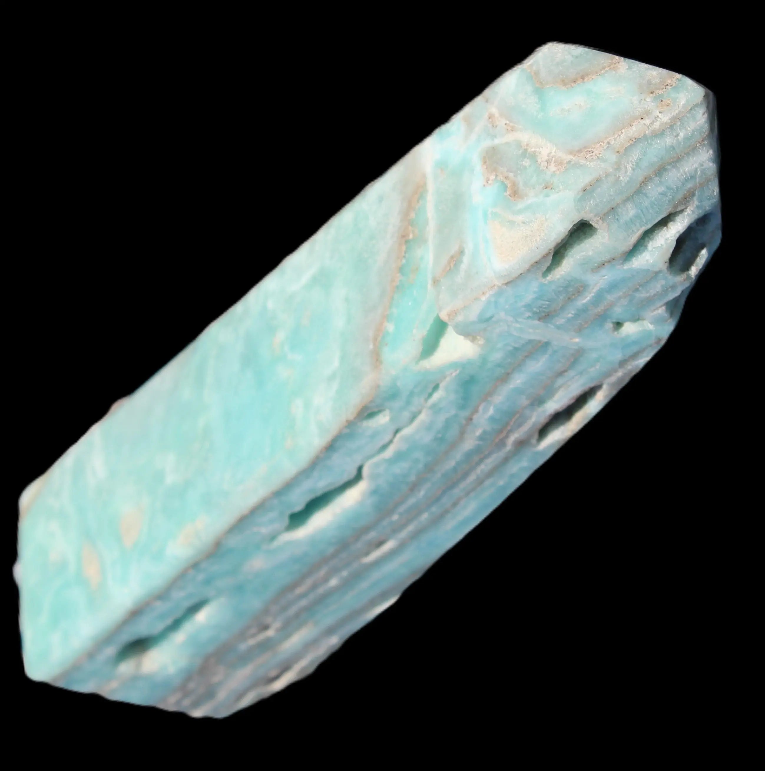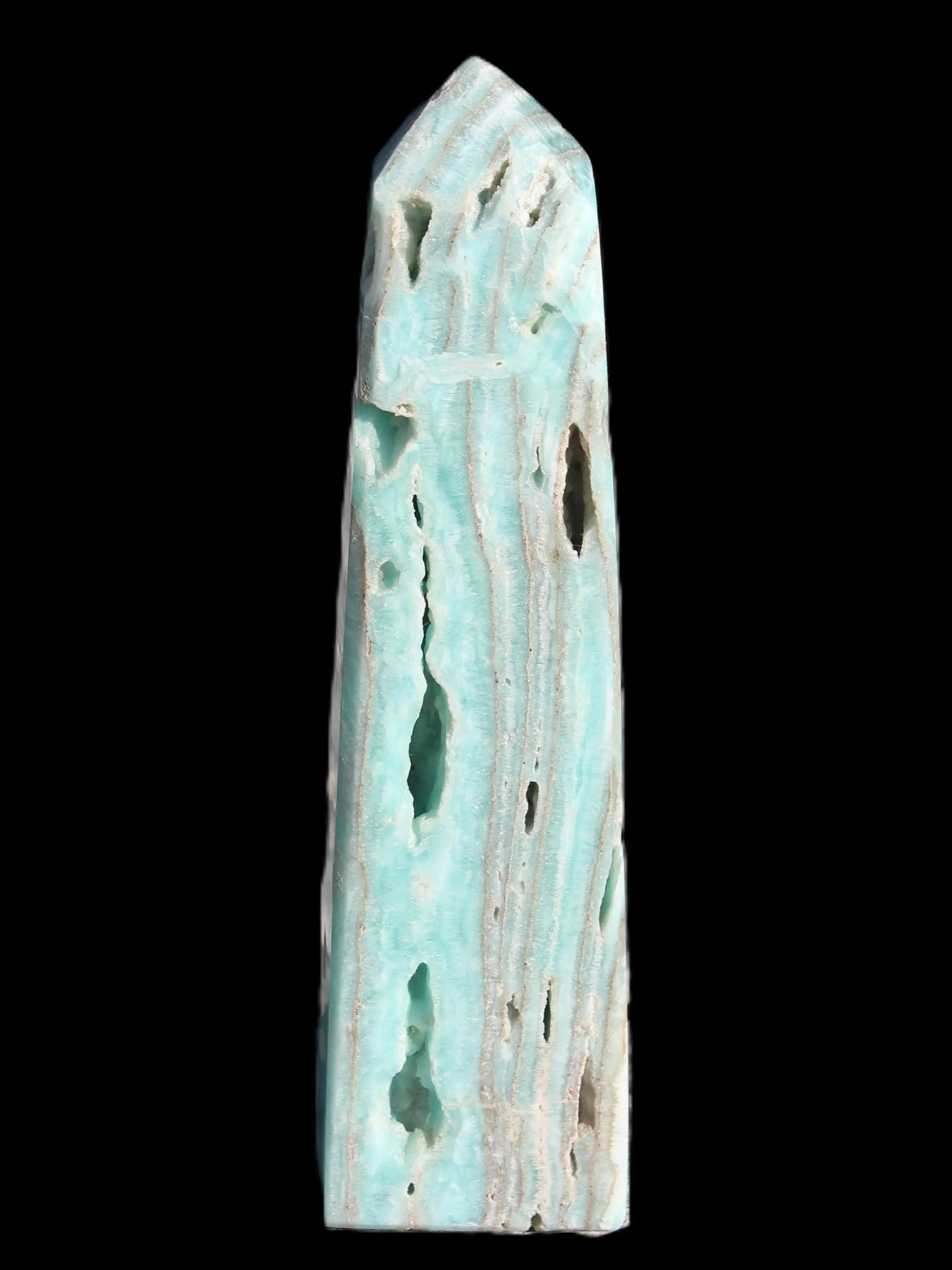 Caribbean Calcite aqua blue obelisk 170mm 539g in sunlight - Rocks and Things Store