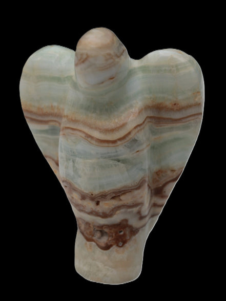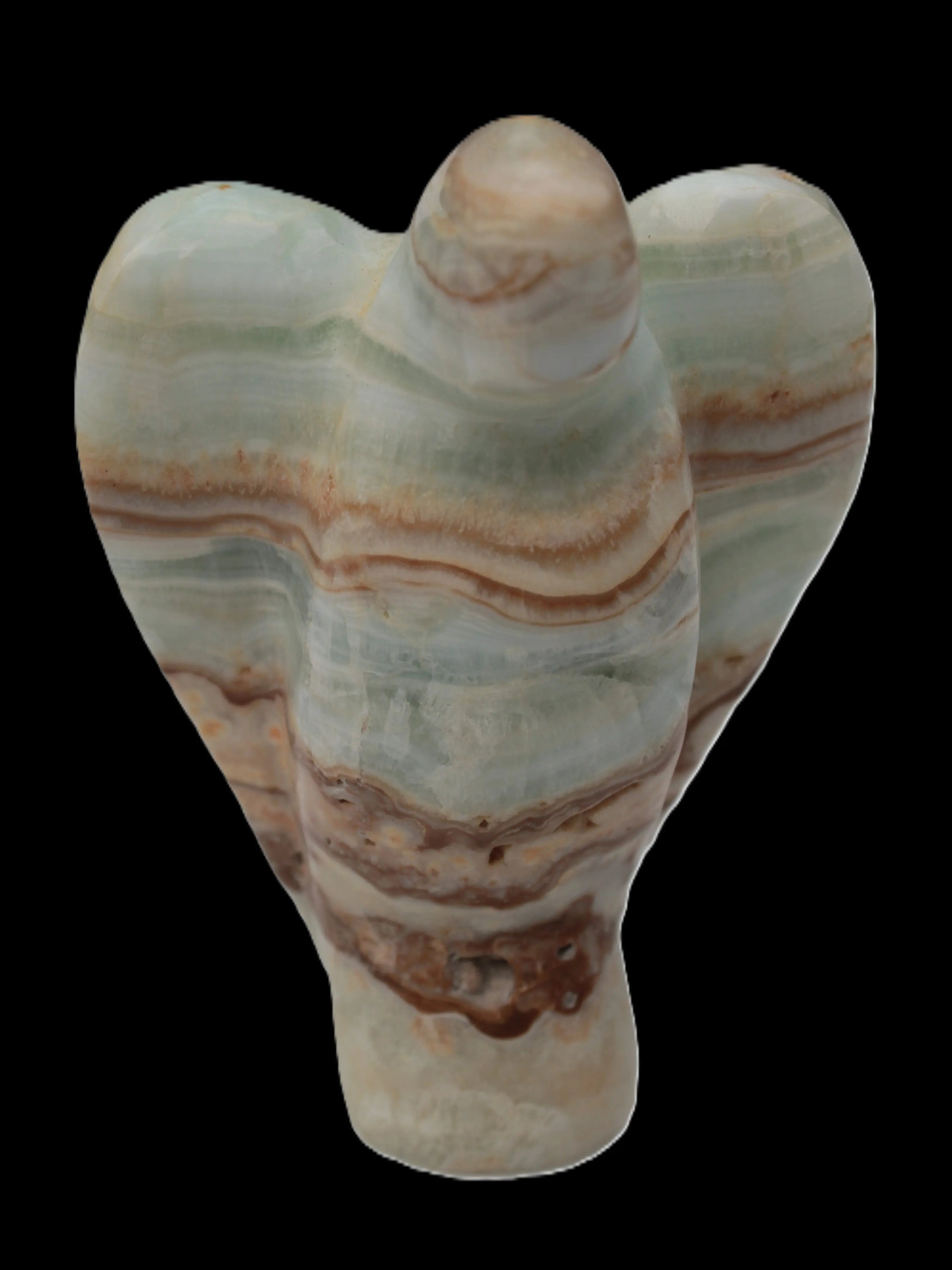 This Caribbean Calcite Angel 152g was hand-carved by Lawrence Riaz from local stone in Pakistan. This angel is 80mm tall and its wings are 57mm wide.