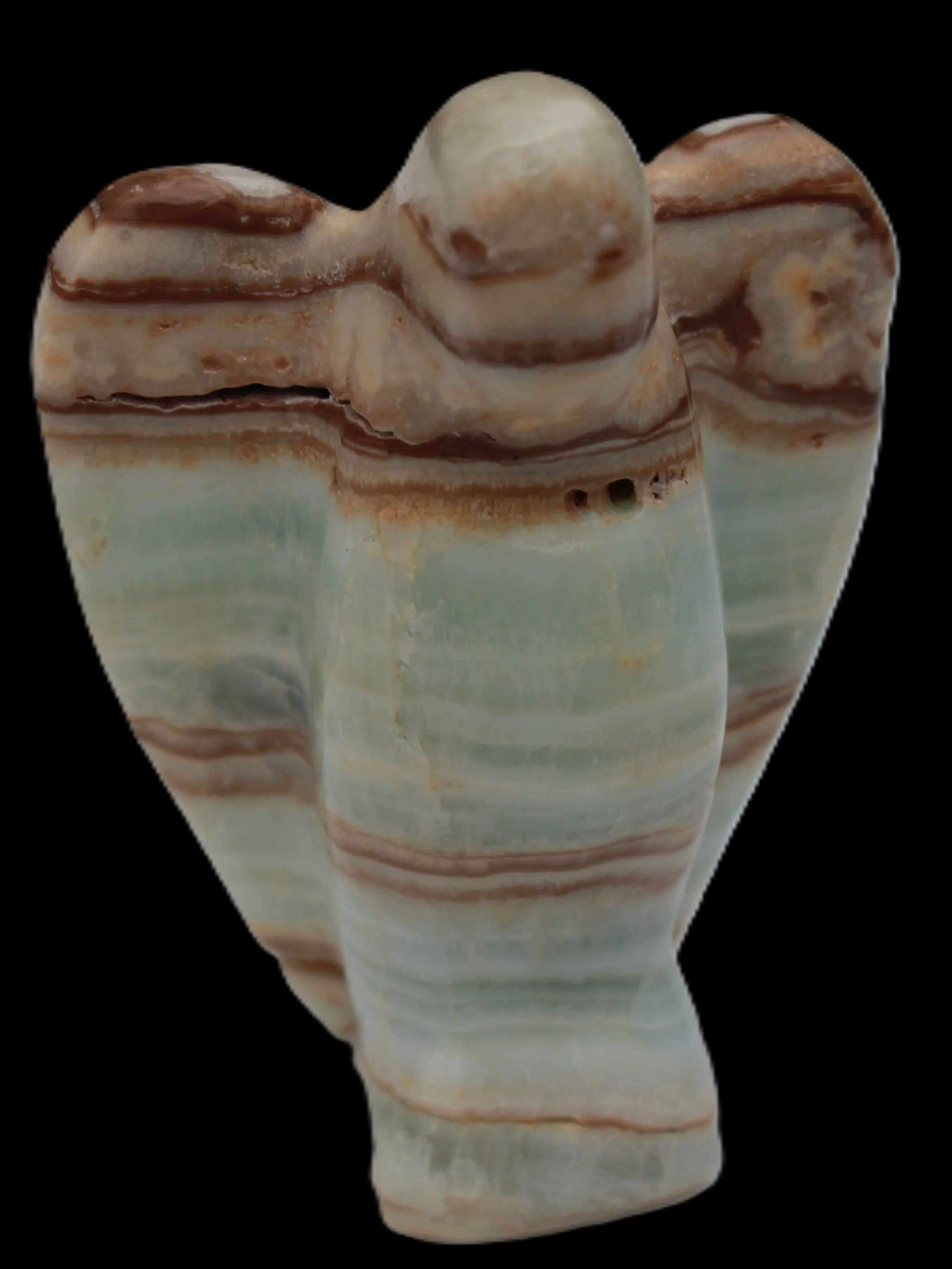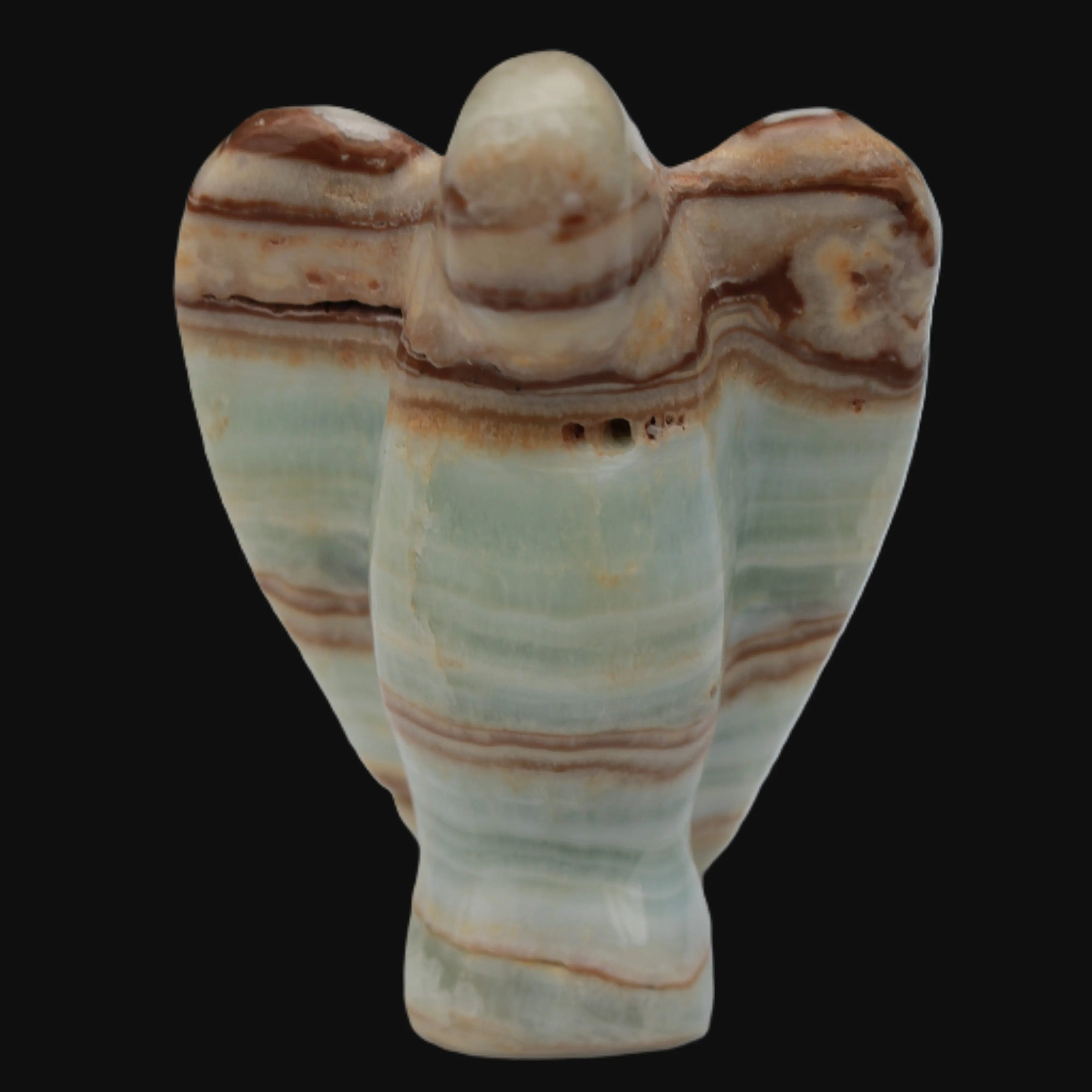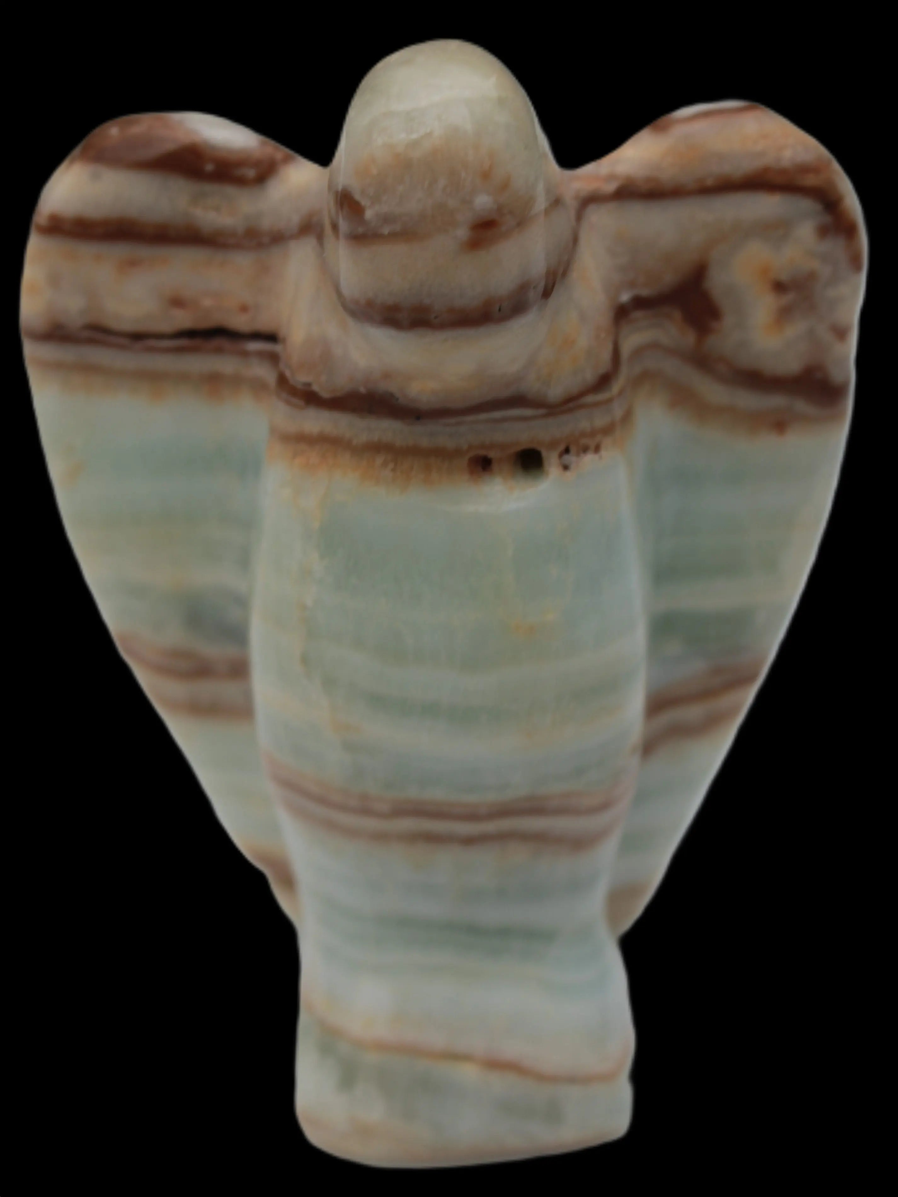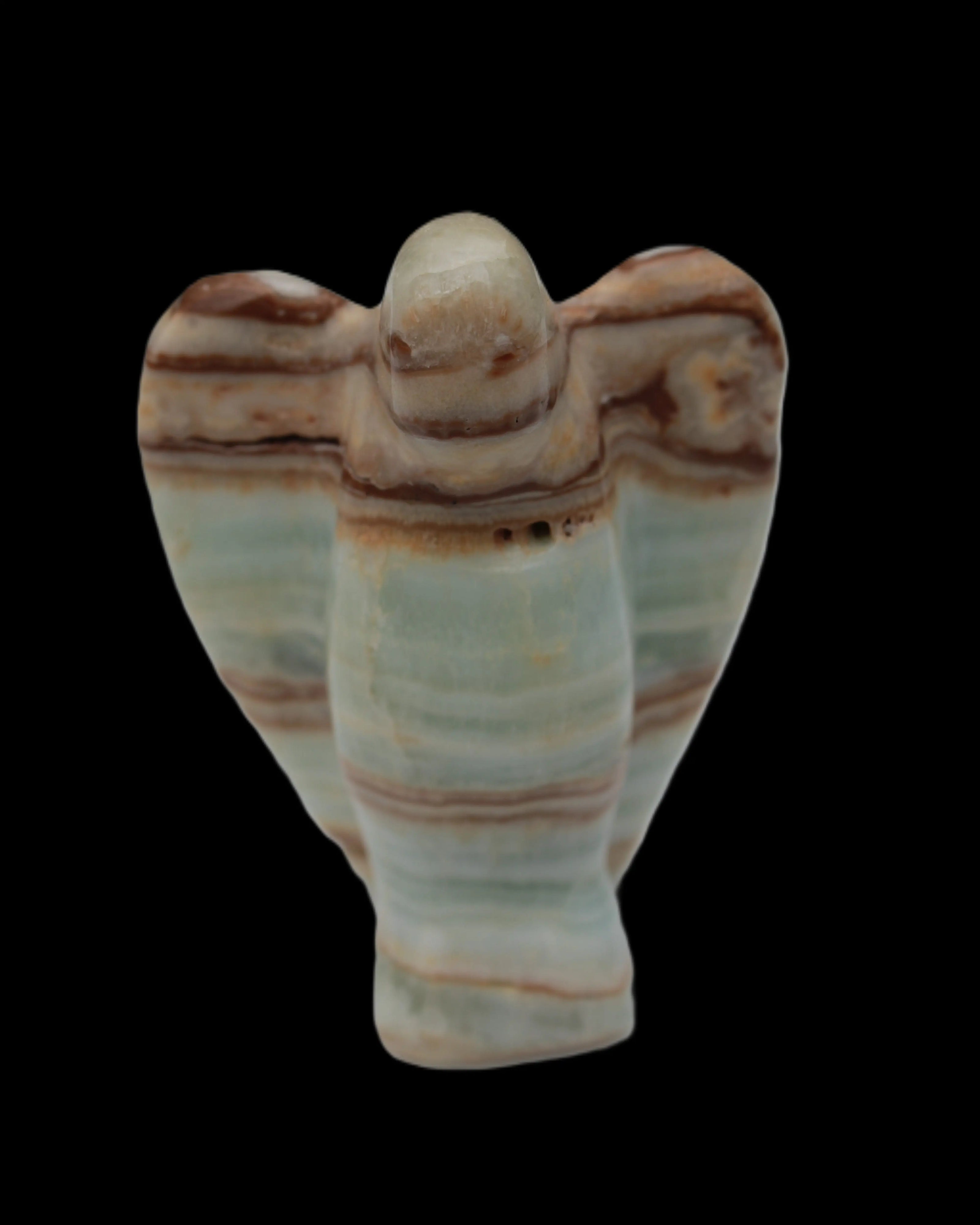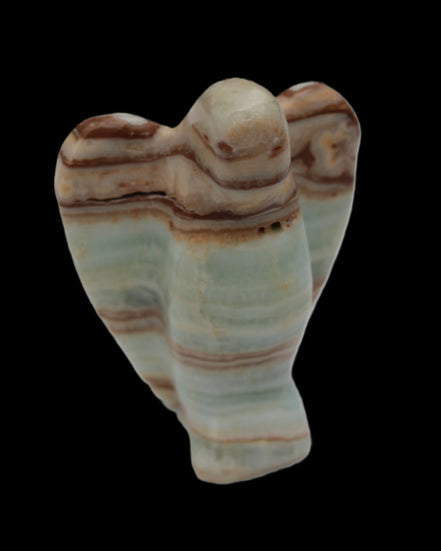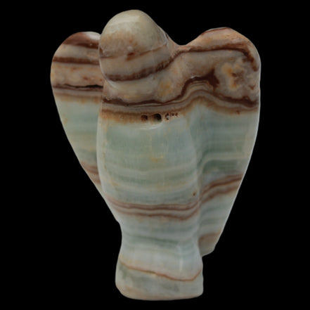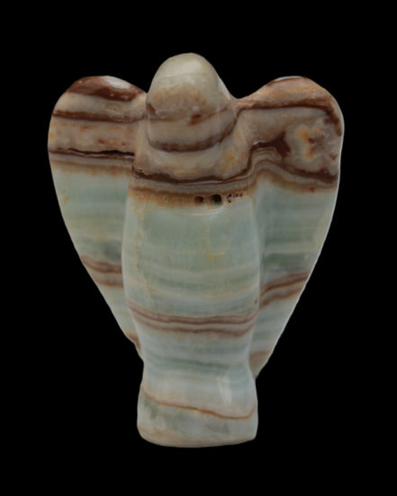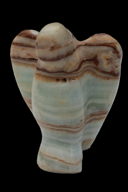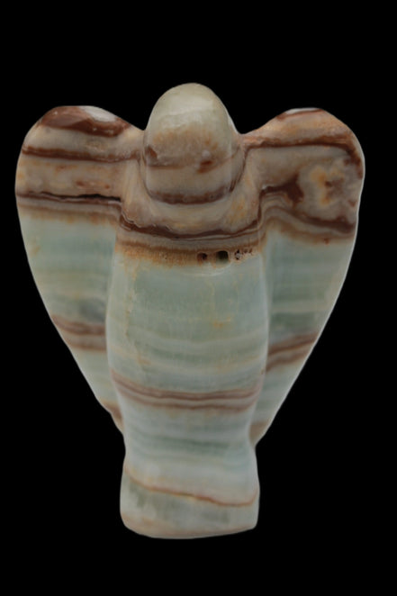 This Caribbean Calcite Guardian Angel 135g was hand-carved in local stone by Lawrence Handicrafts. While called Caribbean Calcite, this stone is actually the mineral Aragonite. It is found only in Pakistan, where Lawrence Handicrafts is located. This guardian Angel is 76mm tall and its wings are 55mm wide.
