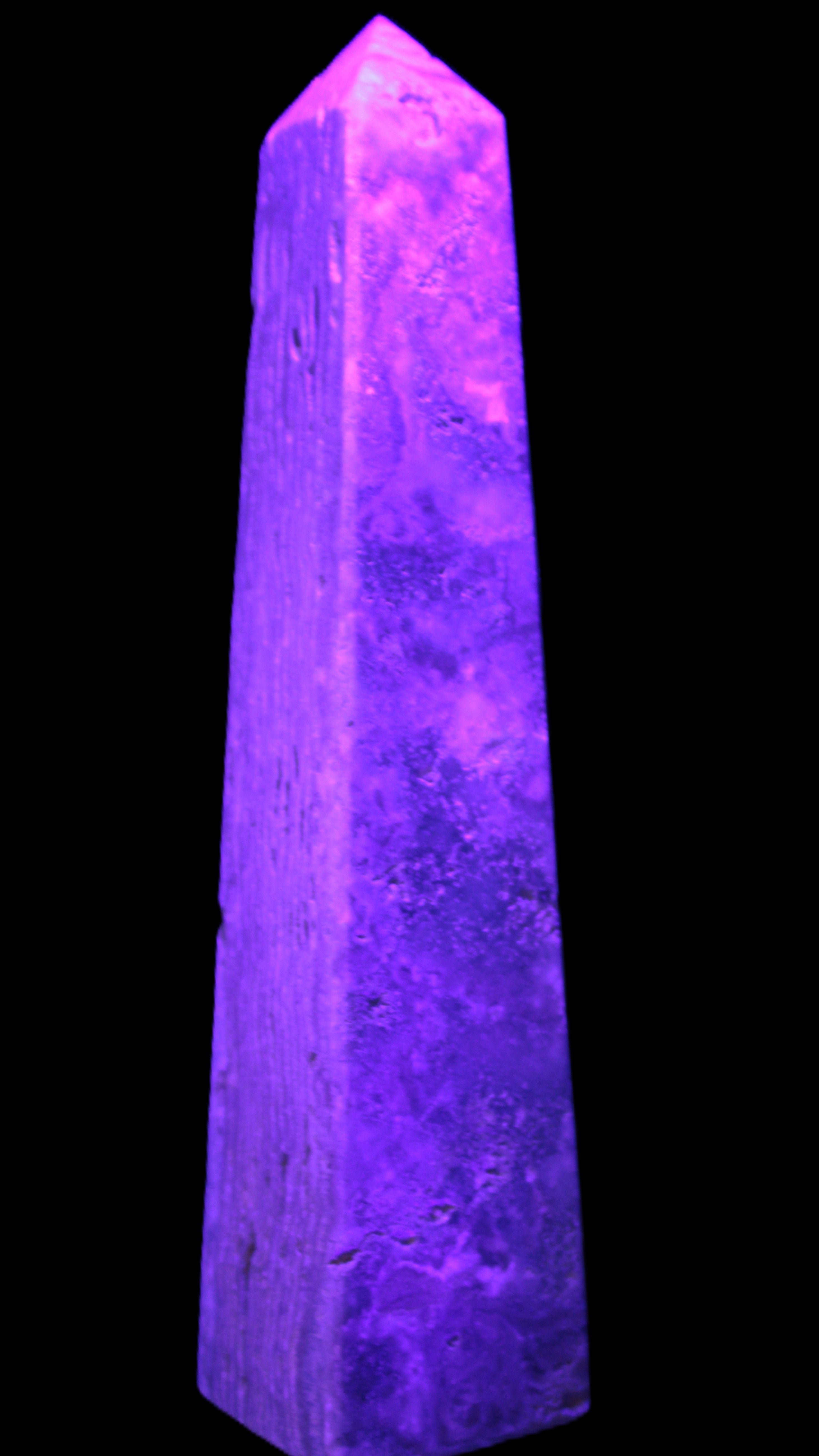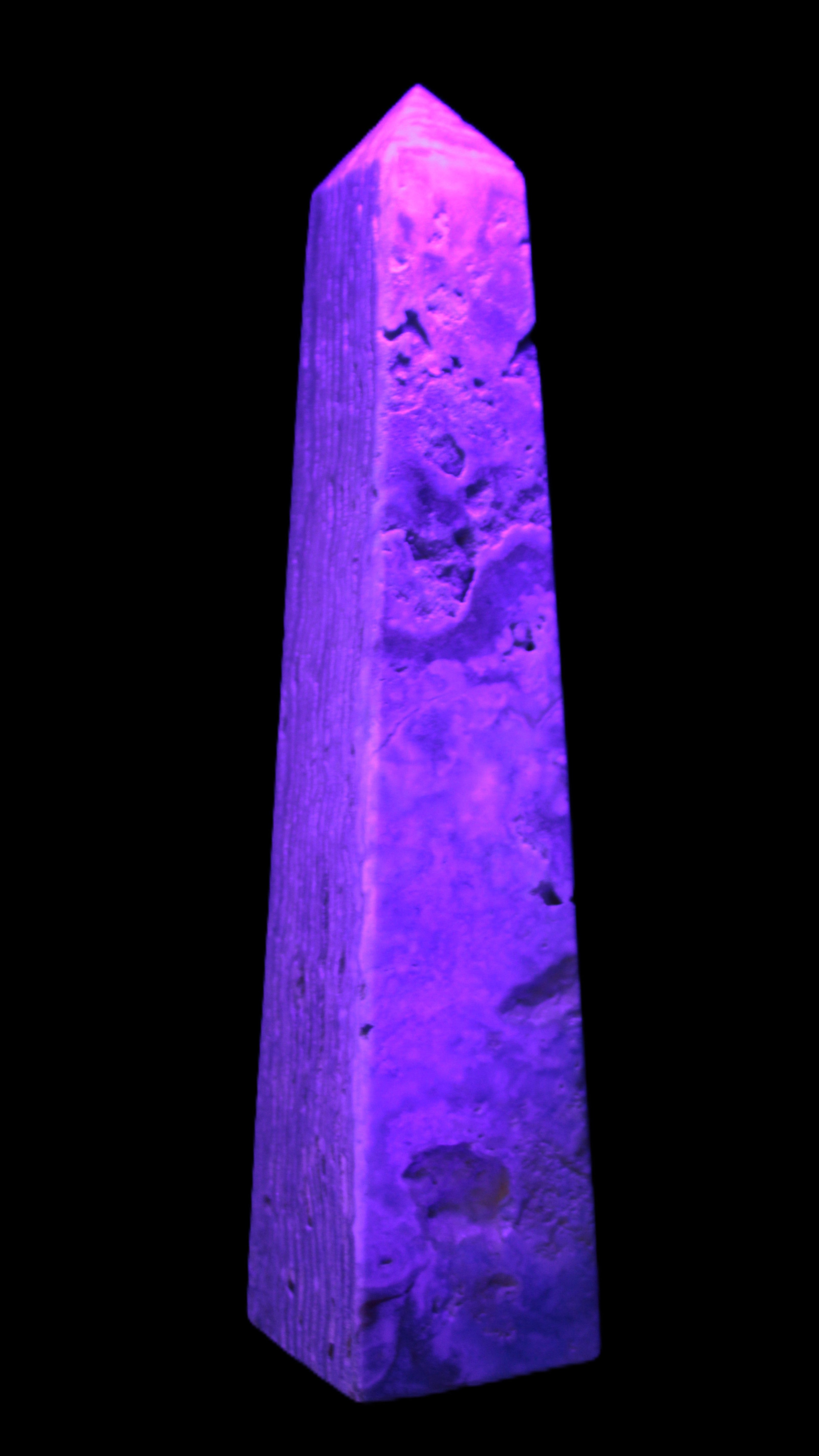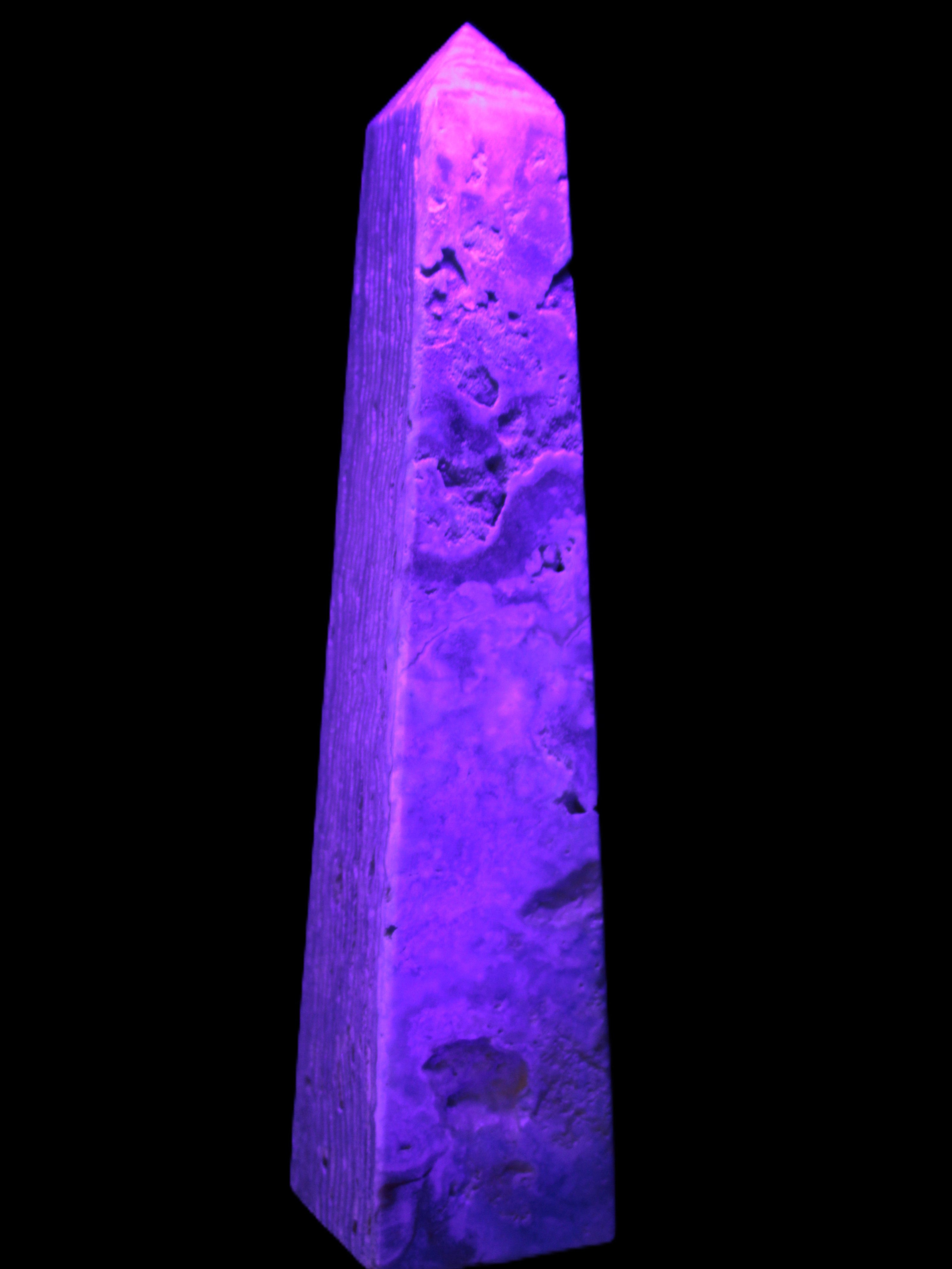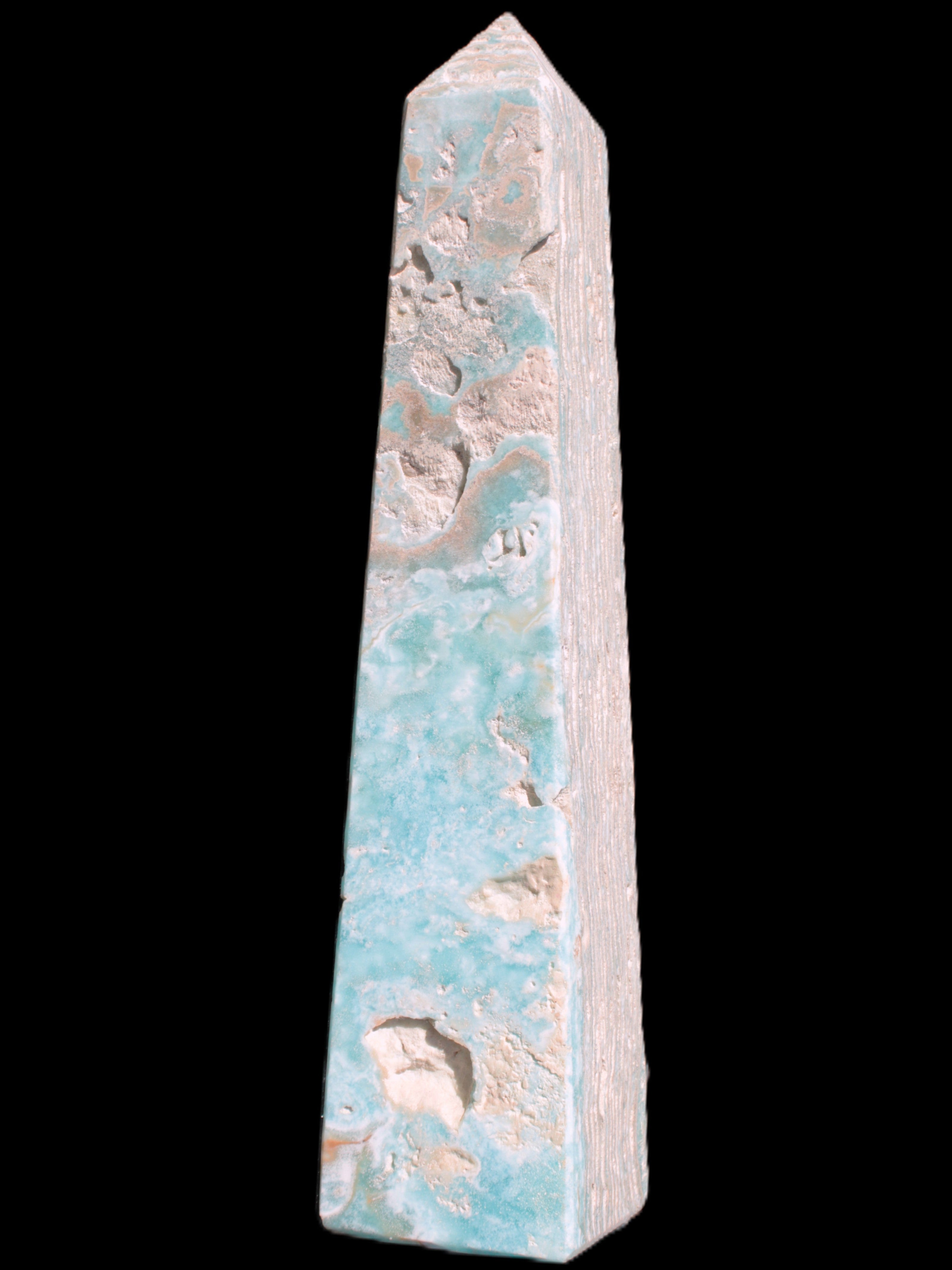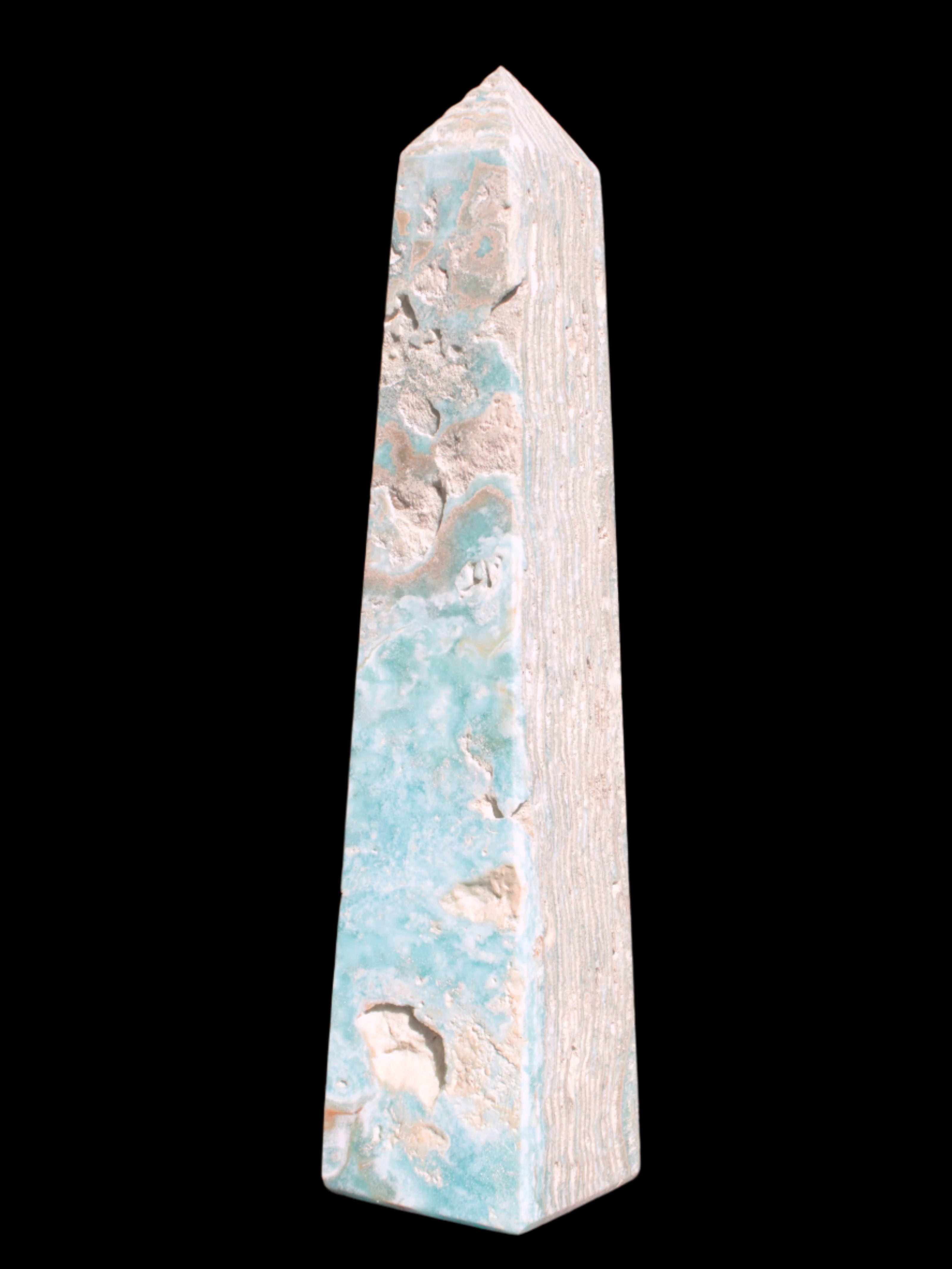 This Caribbean Calcite obelisk 263*54*56mm weighs 1271g. This is a rectangular tower. It is 263mm tall and 54mm by 56mm wide at its base. Caribbean Calcite is a form of Aragonite.