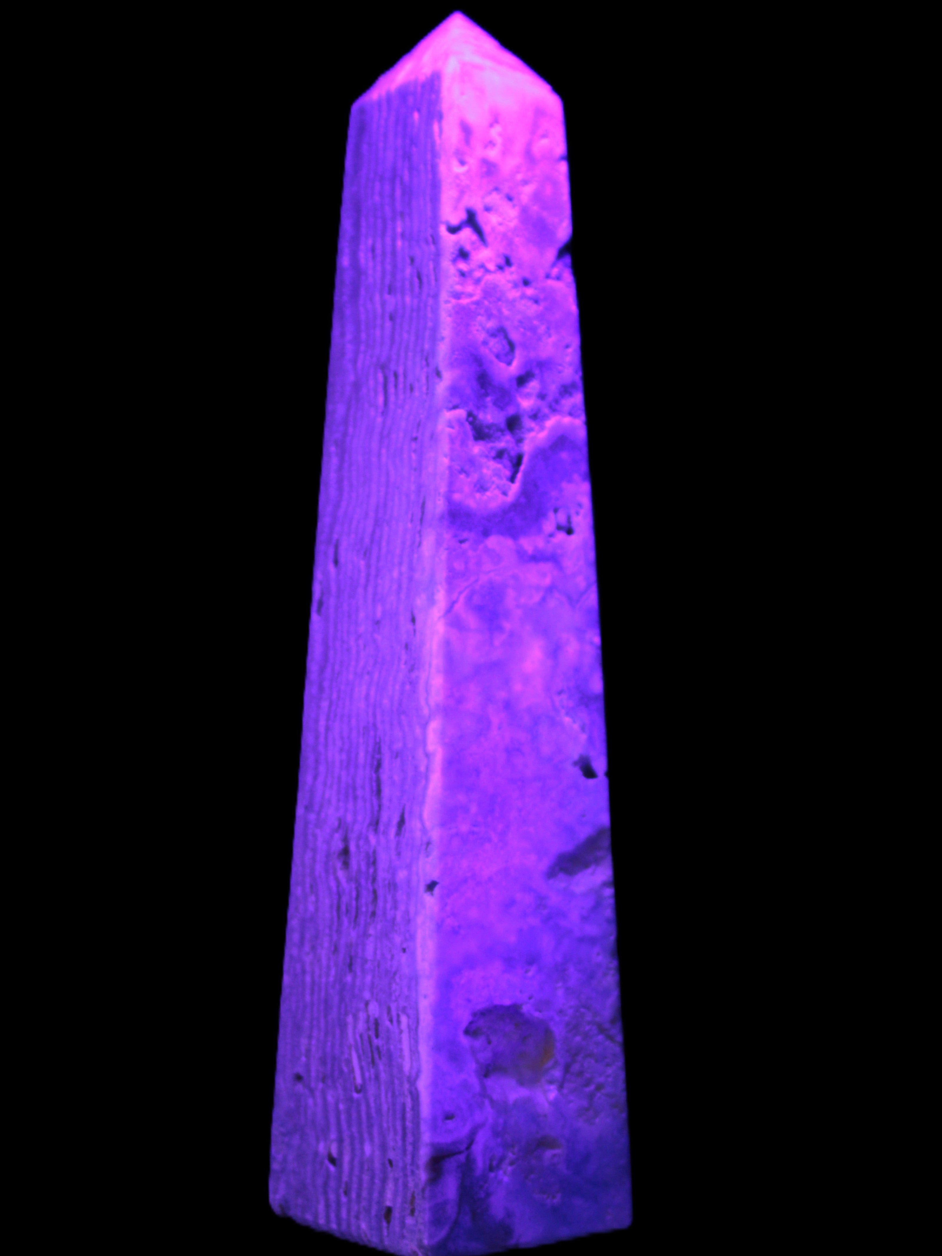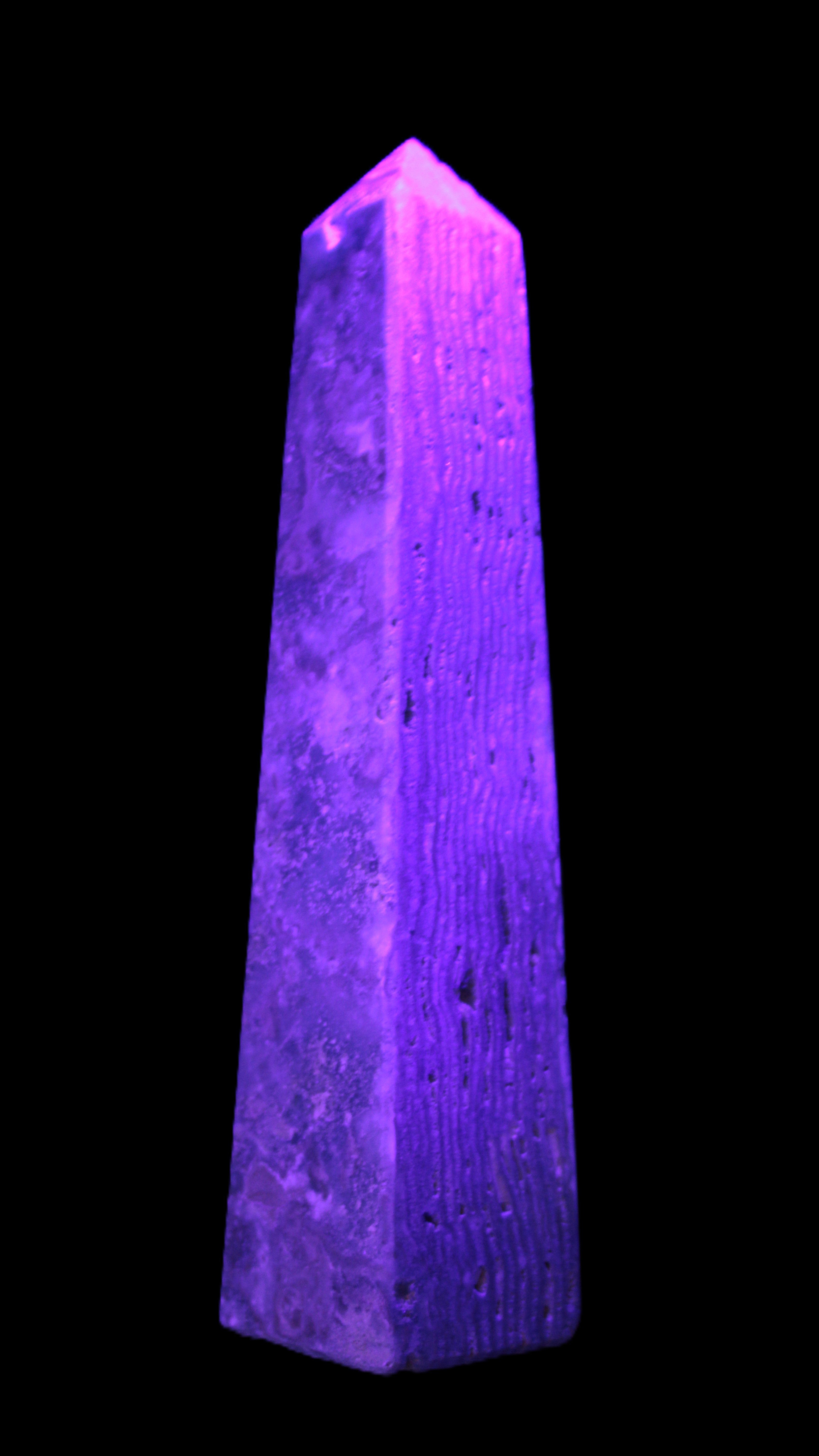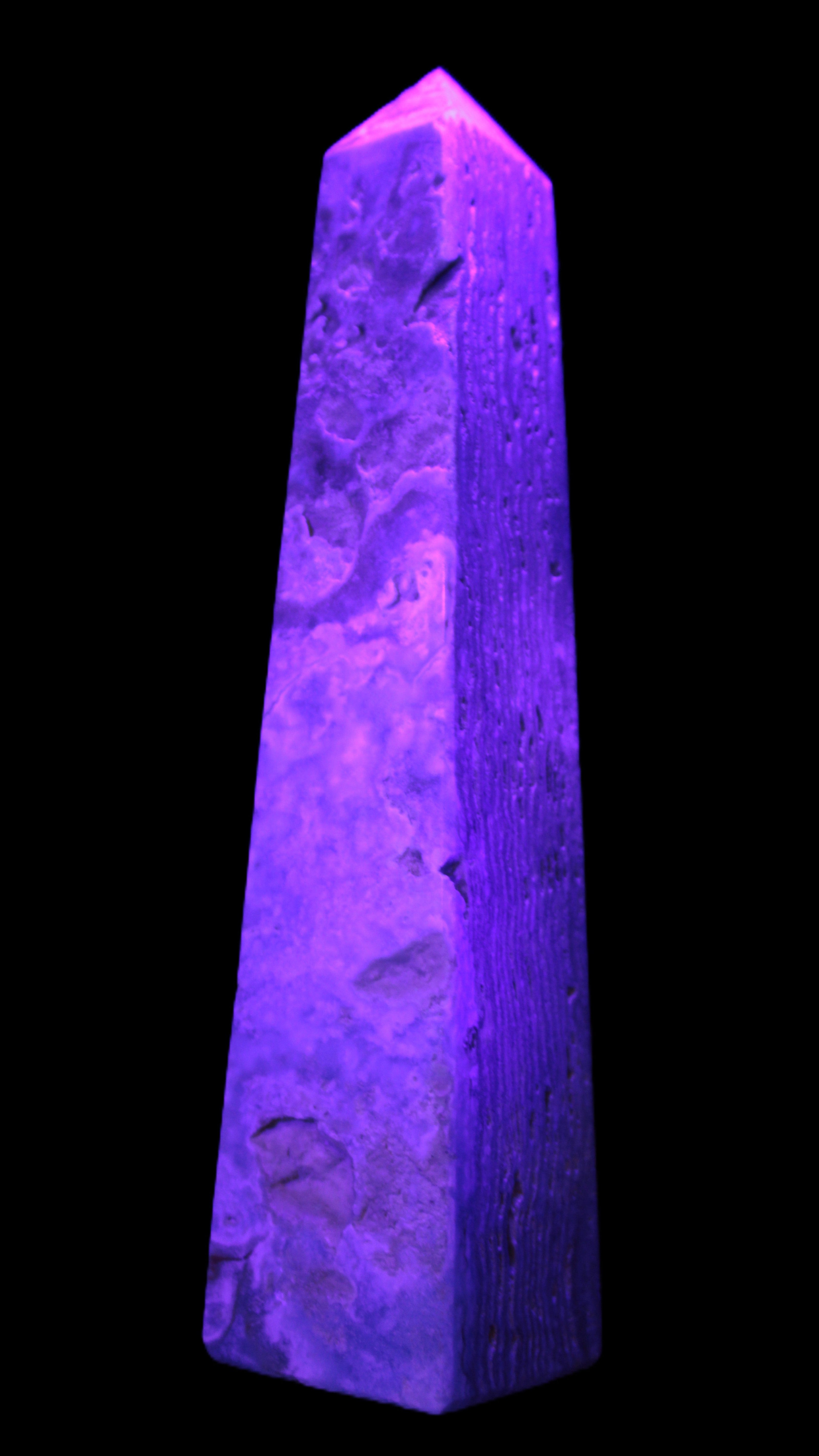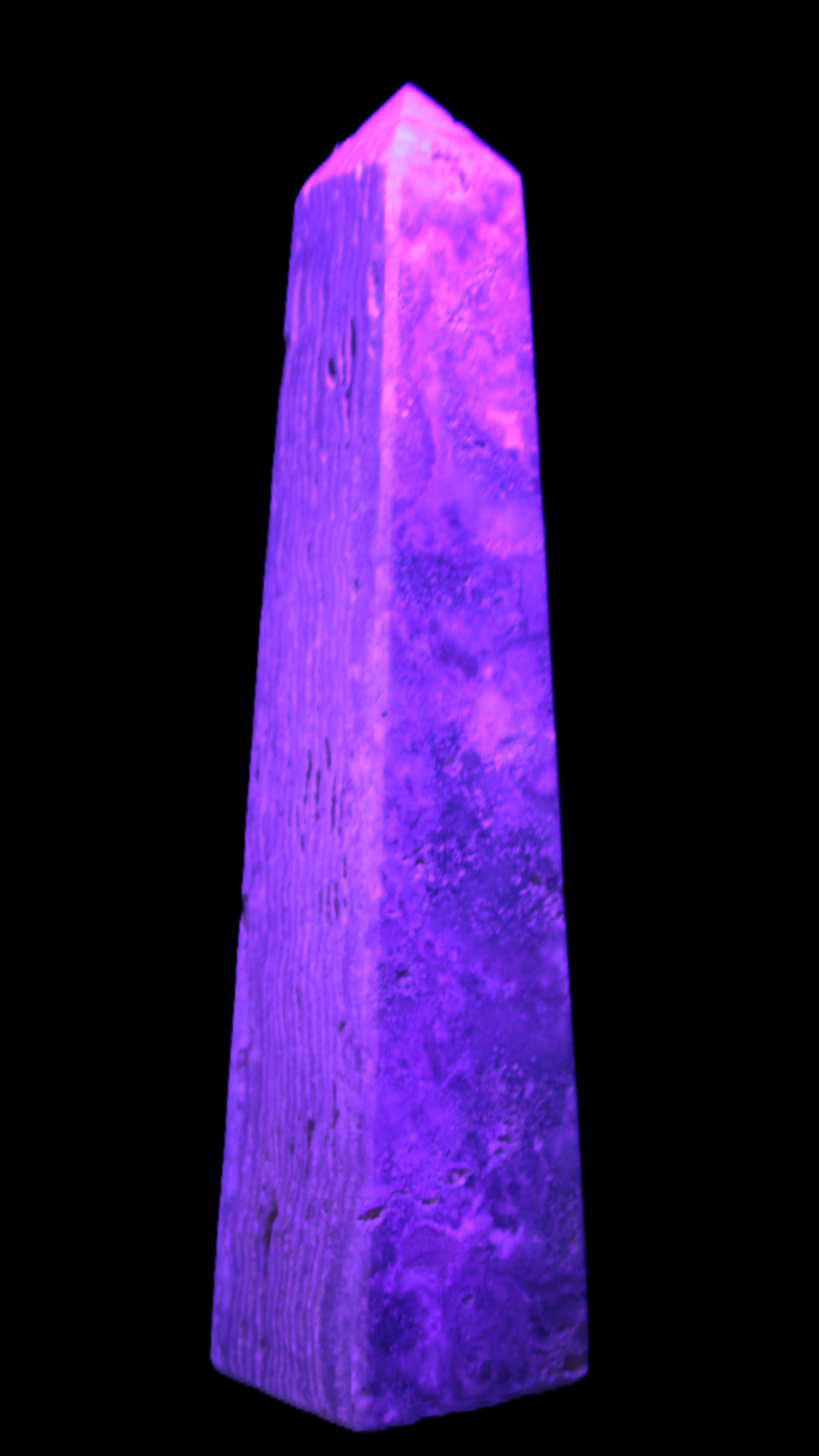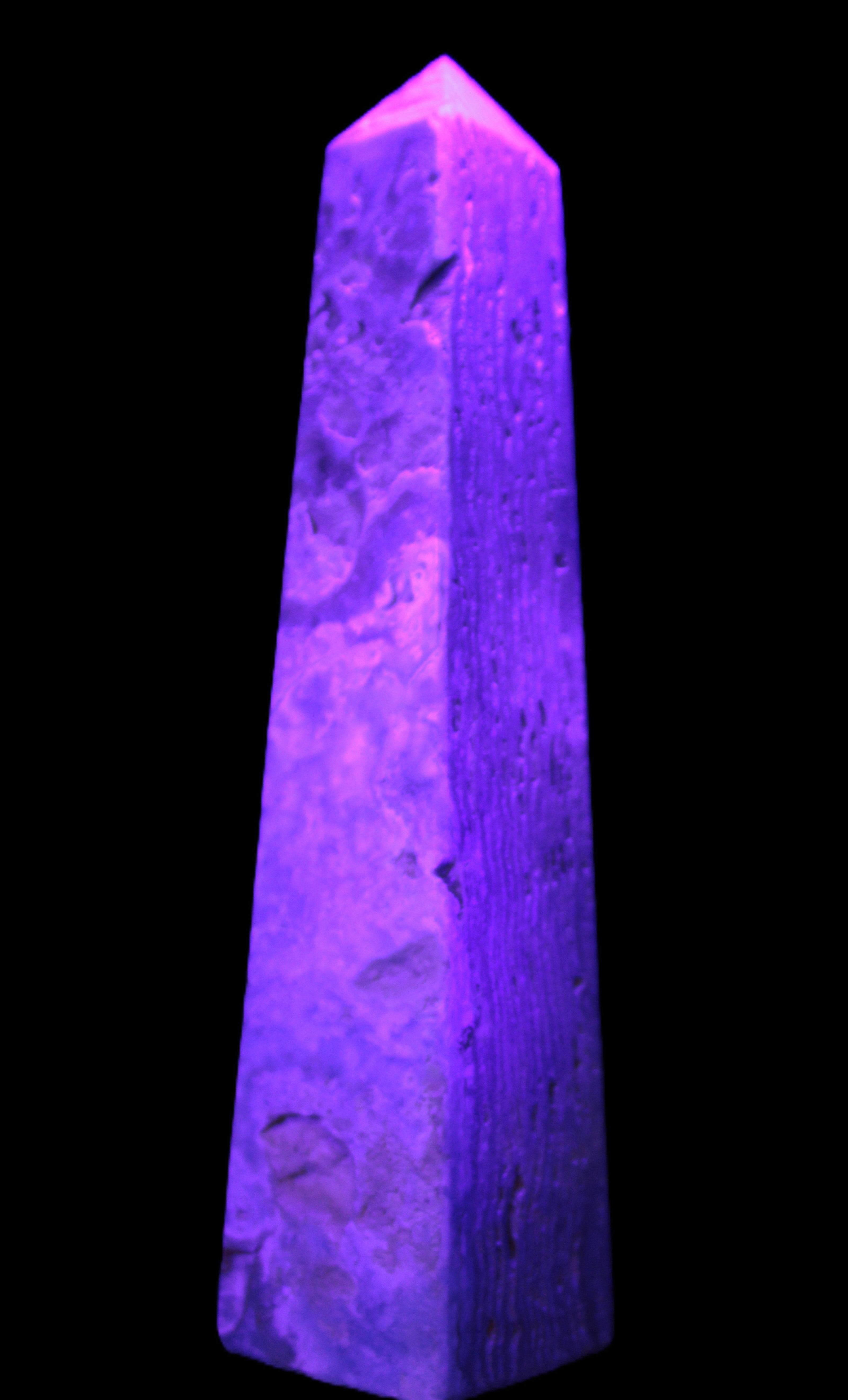 This Caribbean Calcite obelisk 263*54*56mm weighs 1271g. This is a rectangular tower. It is 263mm tall and 54mm by 56mm wide at its base. Caribbean Calcite is a form of Aragonite.