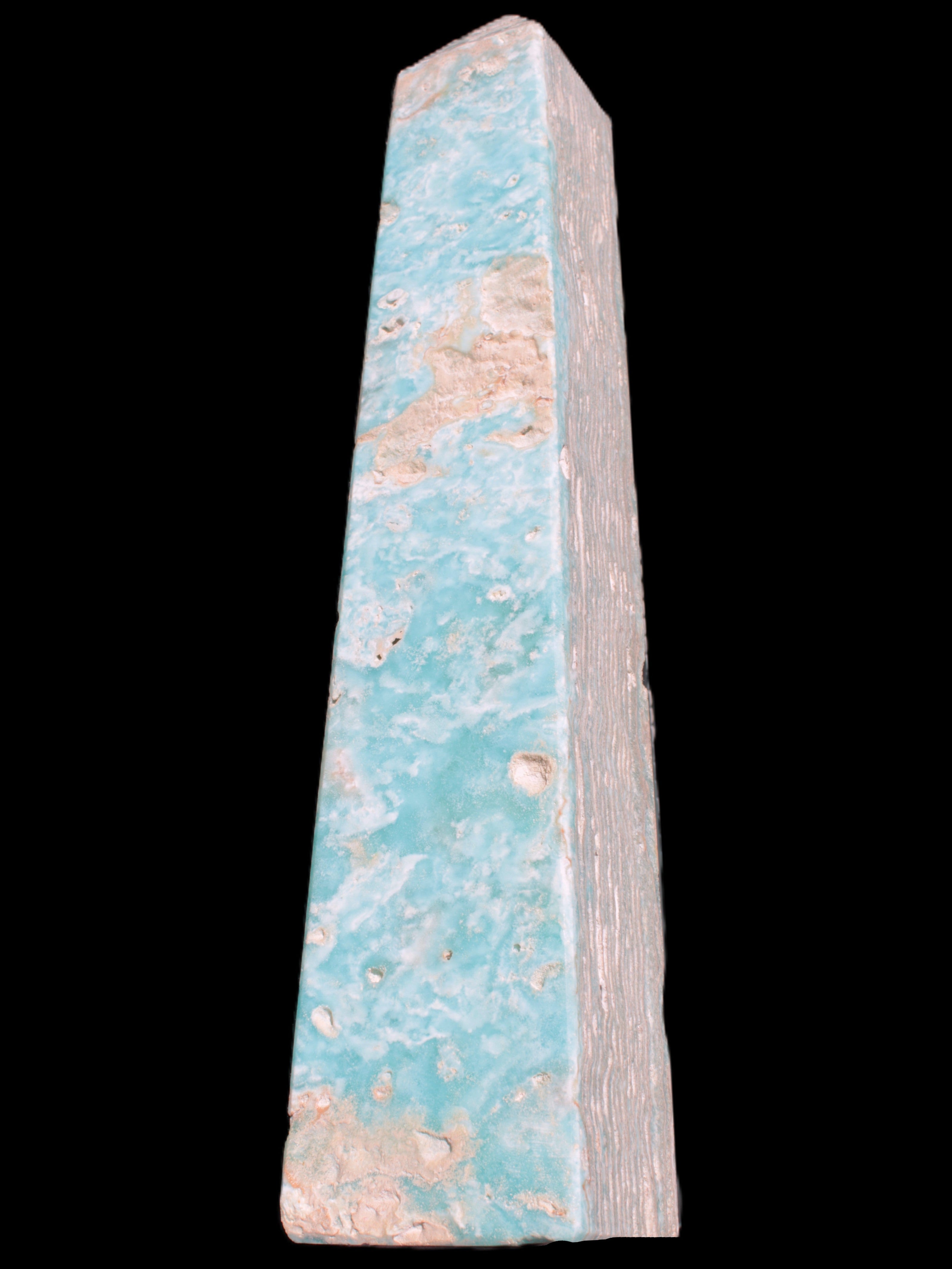 This large Caribbean Calcite obelisk 348*55*75mm weighs 2574g. This is a rectangular tower. It is 348mm tall and 55mm by 75mm wide at its base. Caribbean Calcite is a form of Aragonite.