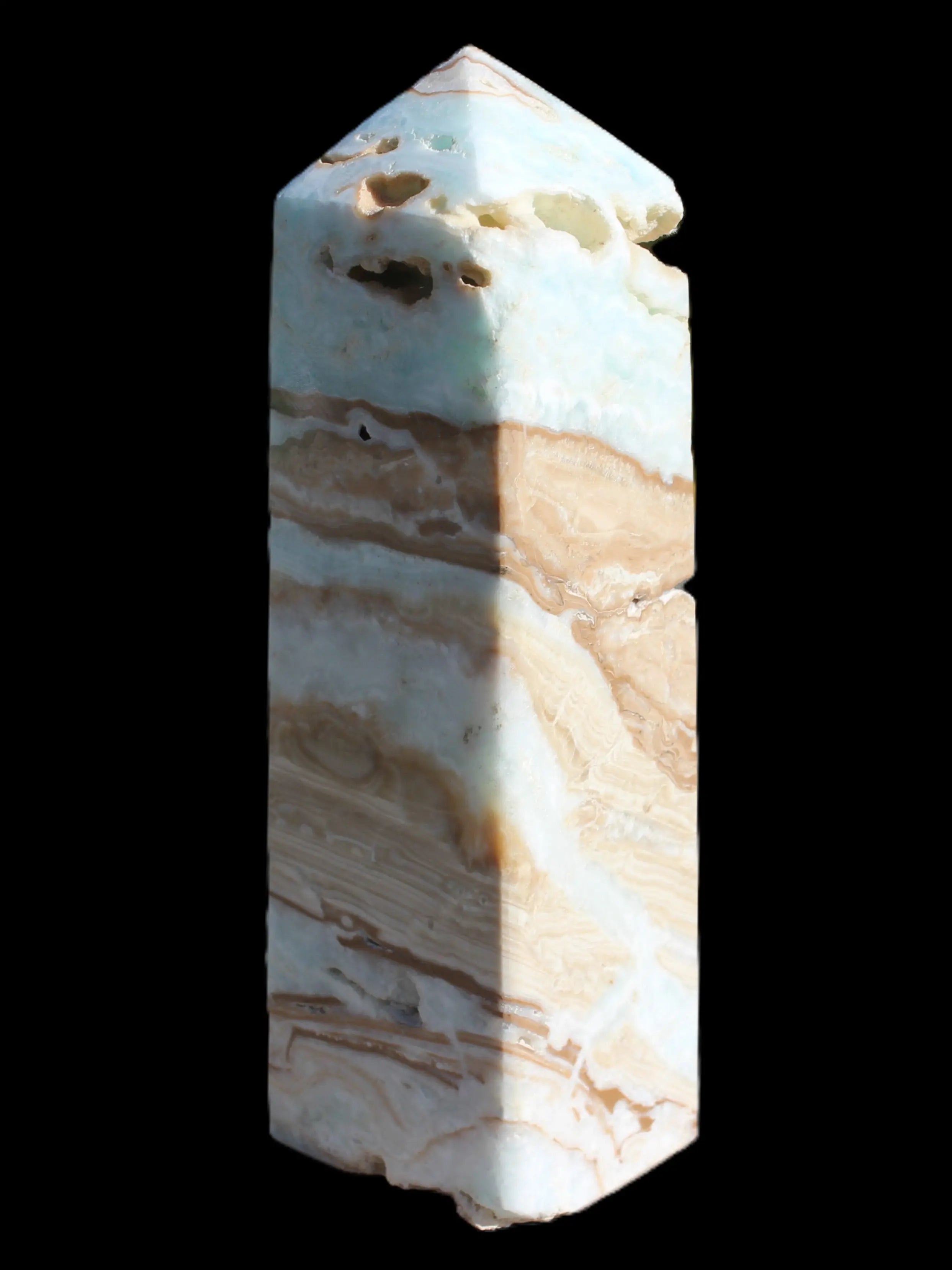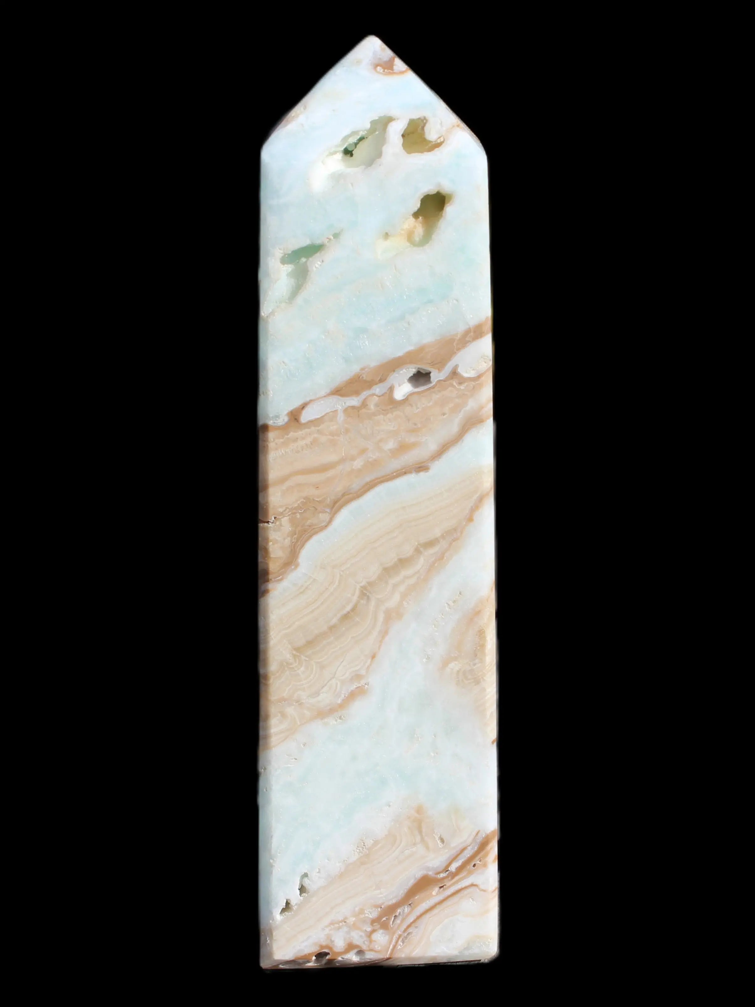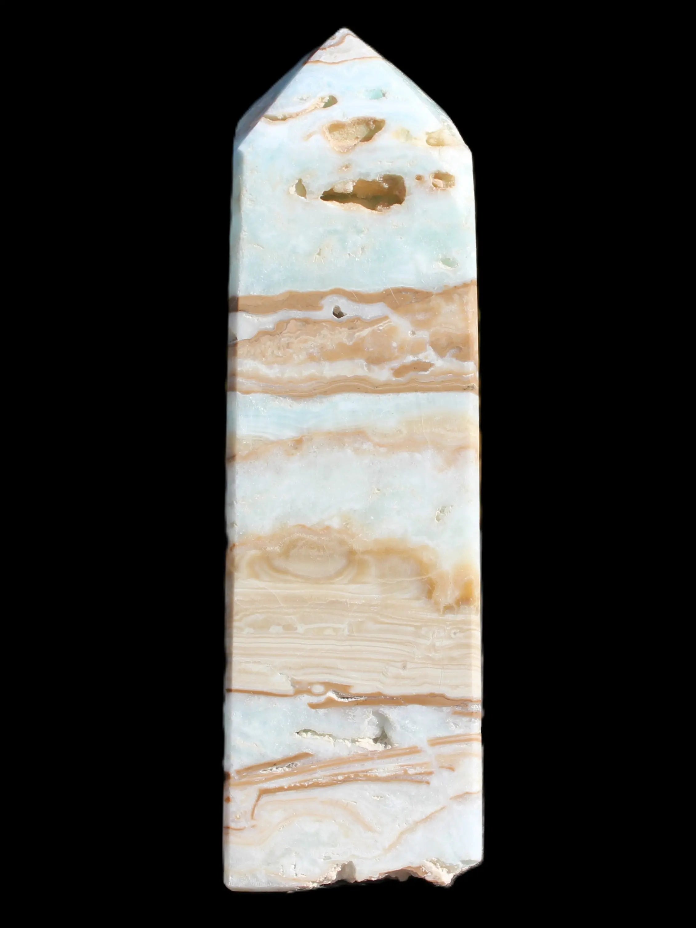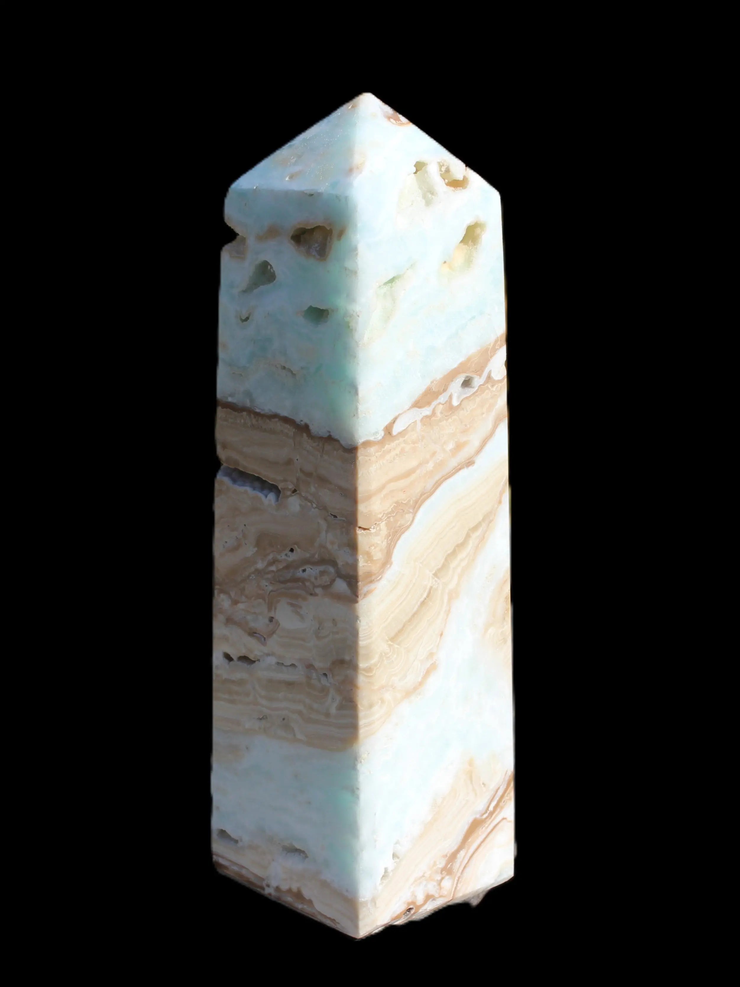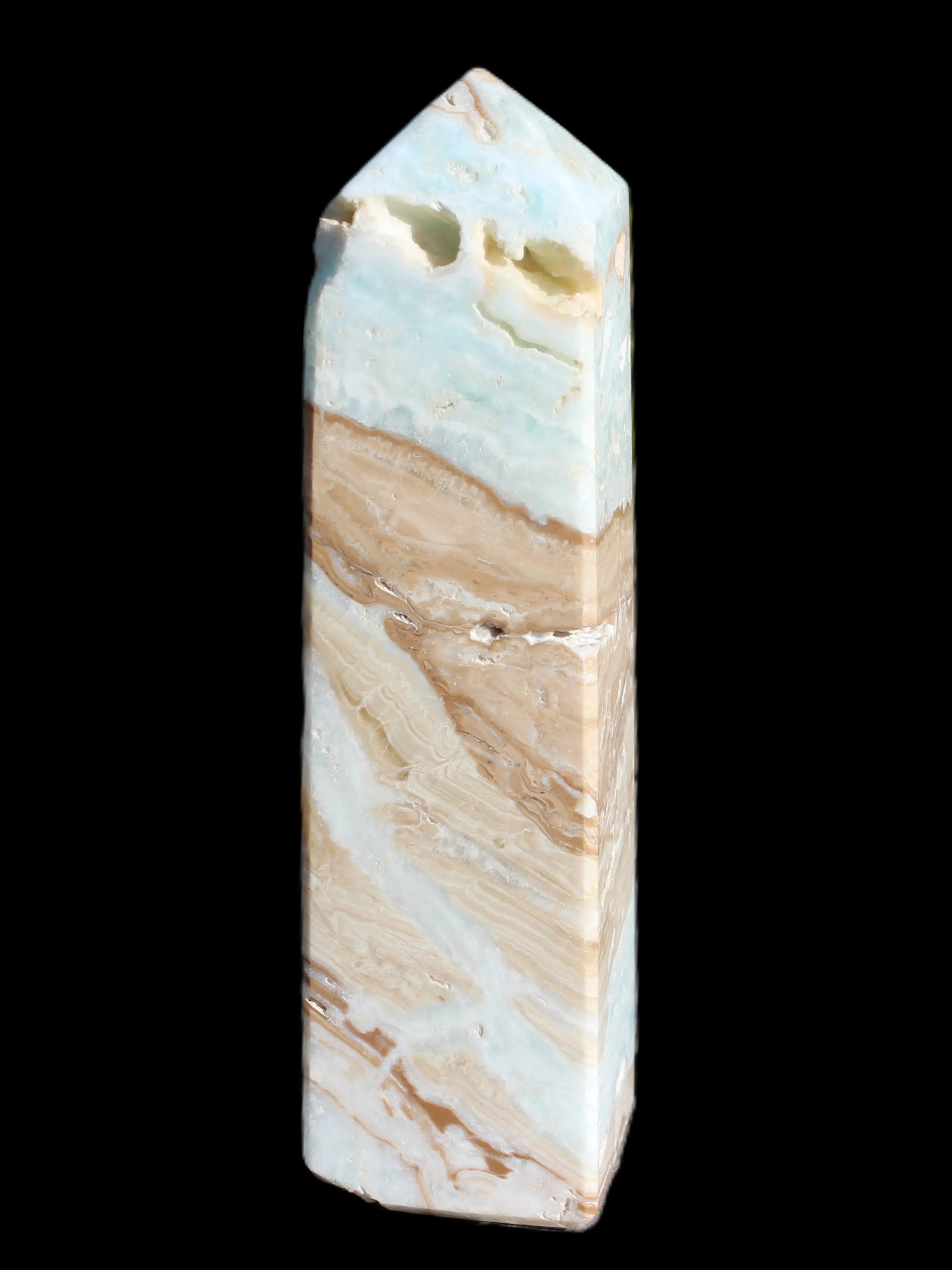 This Caribbean Calcite obelisk 694g is a great exemplar of this beautiful aqua-blue stone. Aragonite is a calcium carbonate mineral, formed in limestone caves and around hot springs.