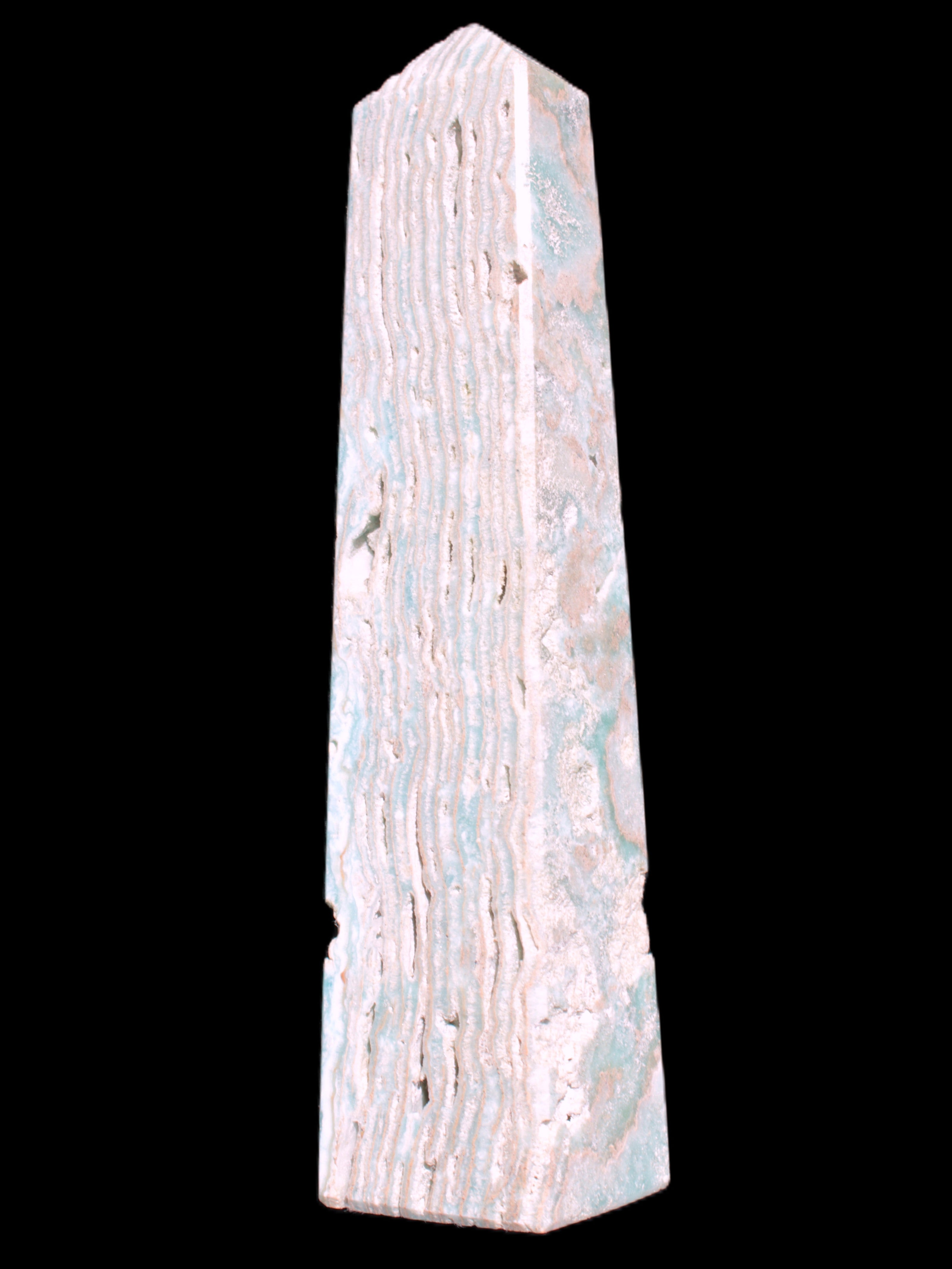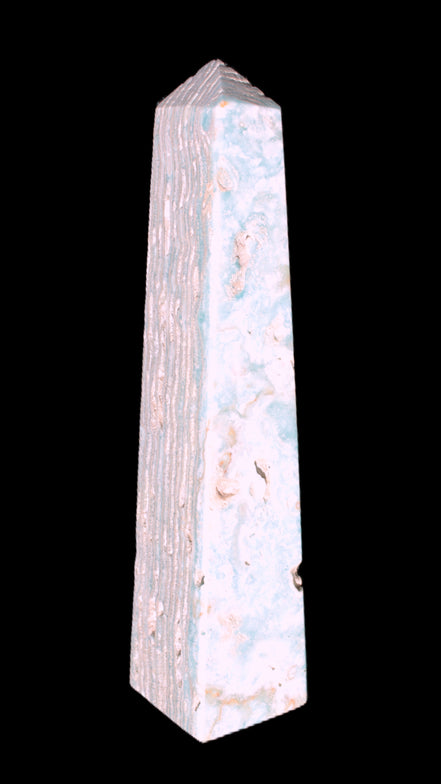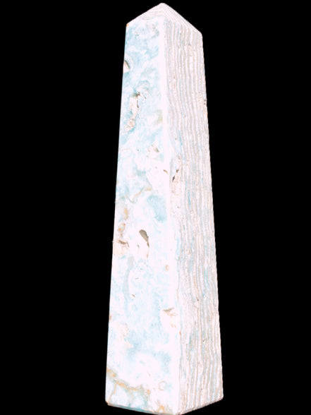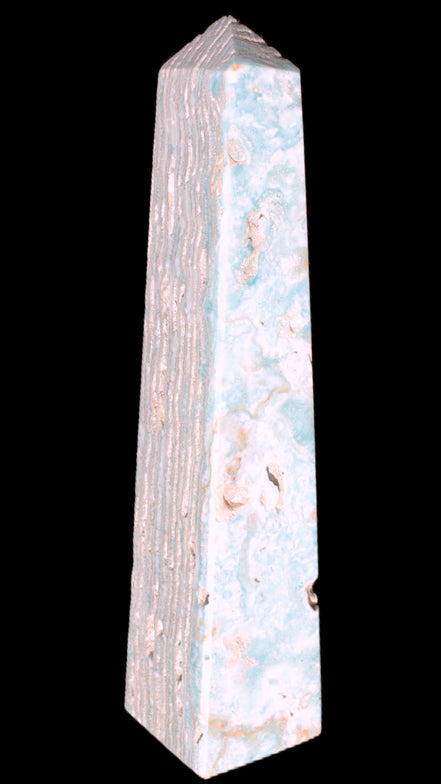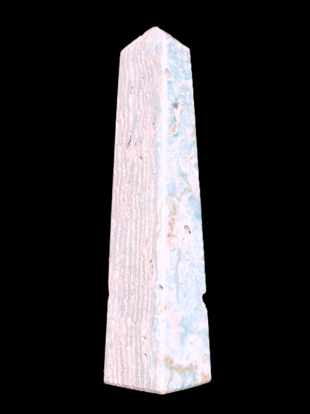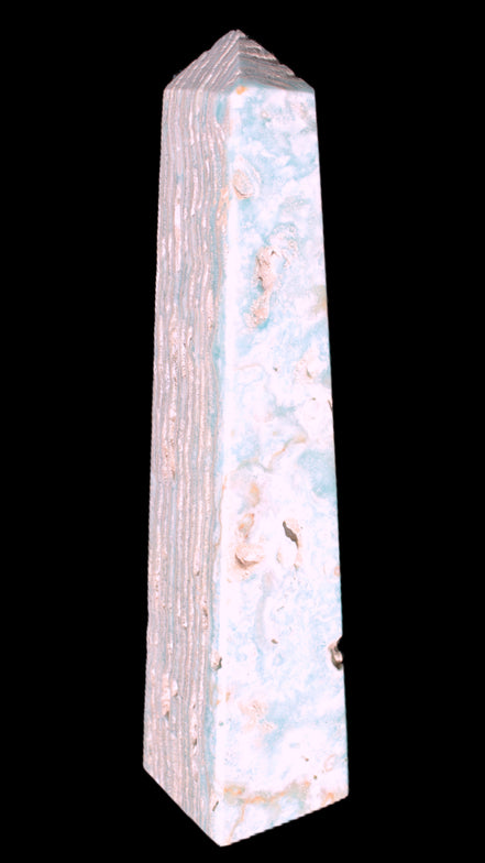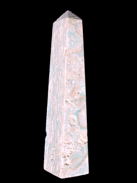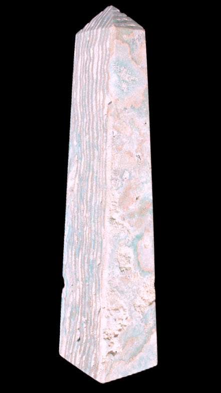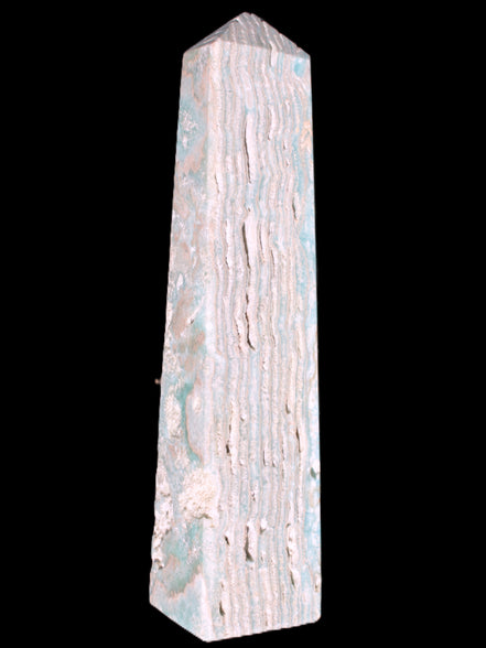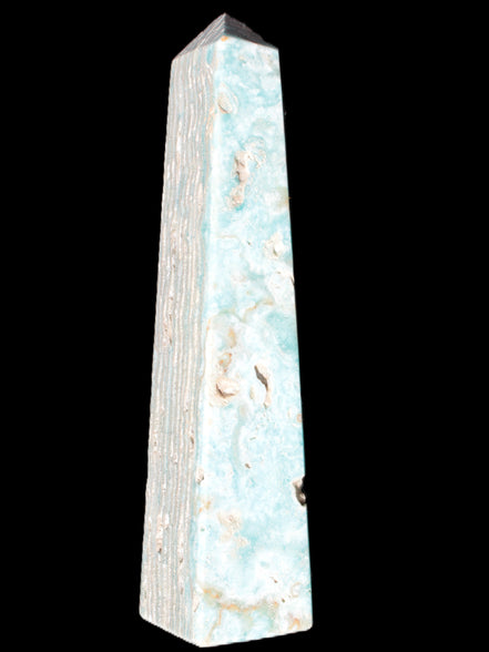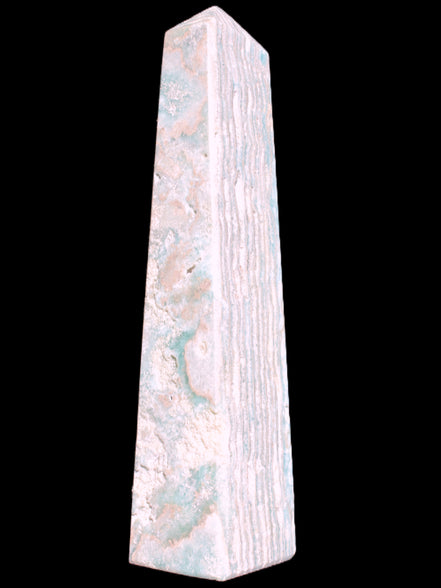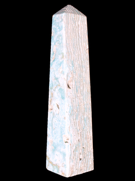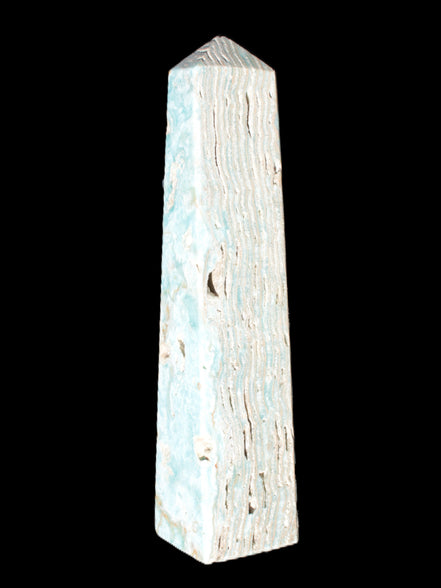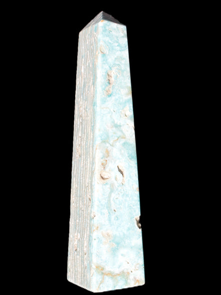 This Caribbean Calcite obelisk 95*40*44mm weighs 571g. This is a rectangular tower. It is 95mm tall and 44mm by 40mm wide at its base. Caribbean Calcite is a form of Aragonite.