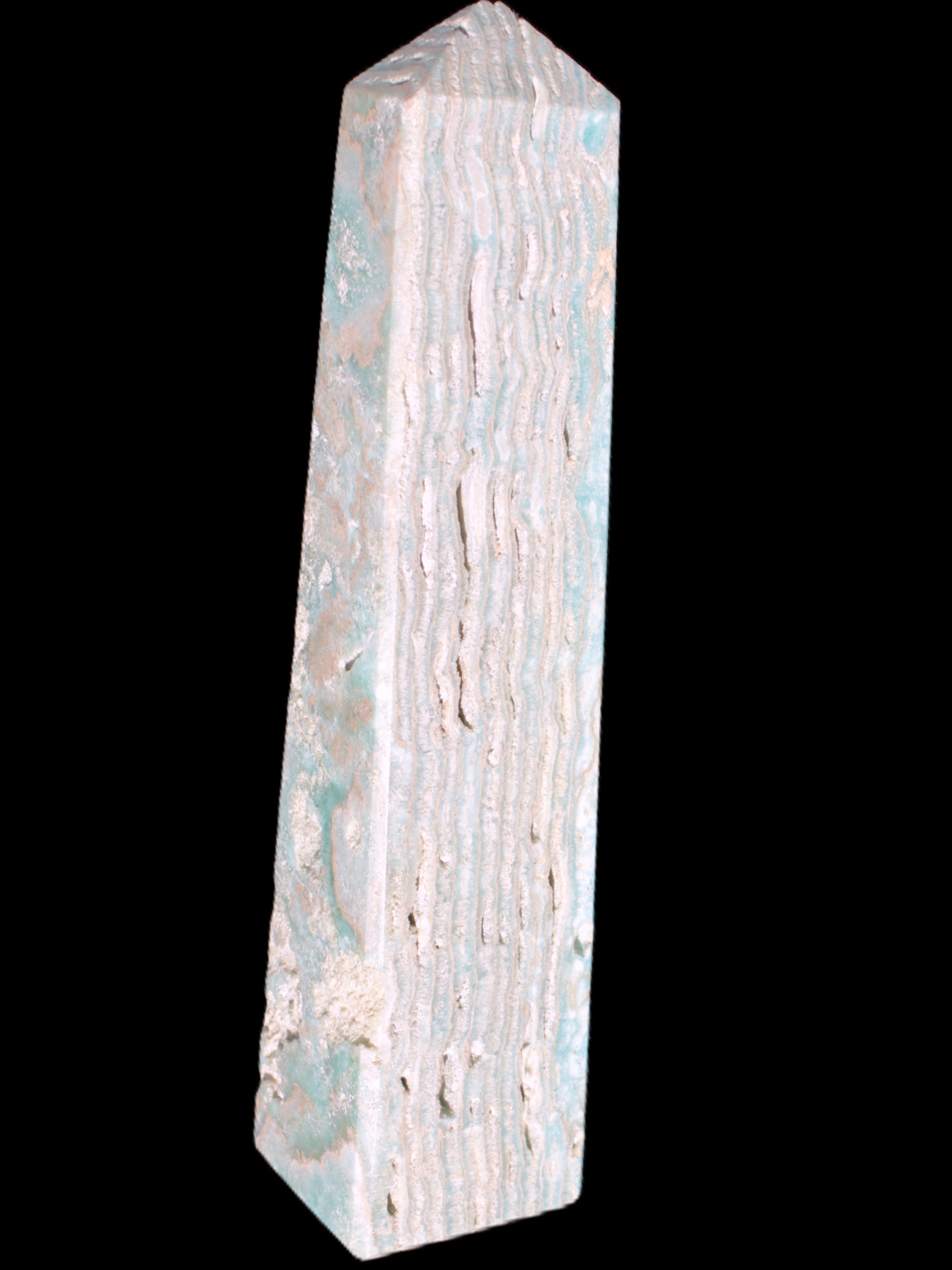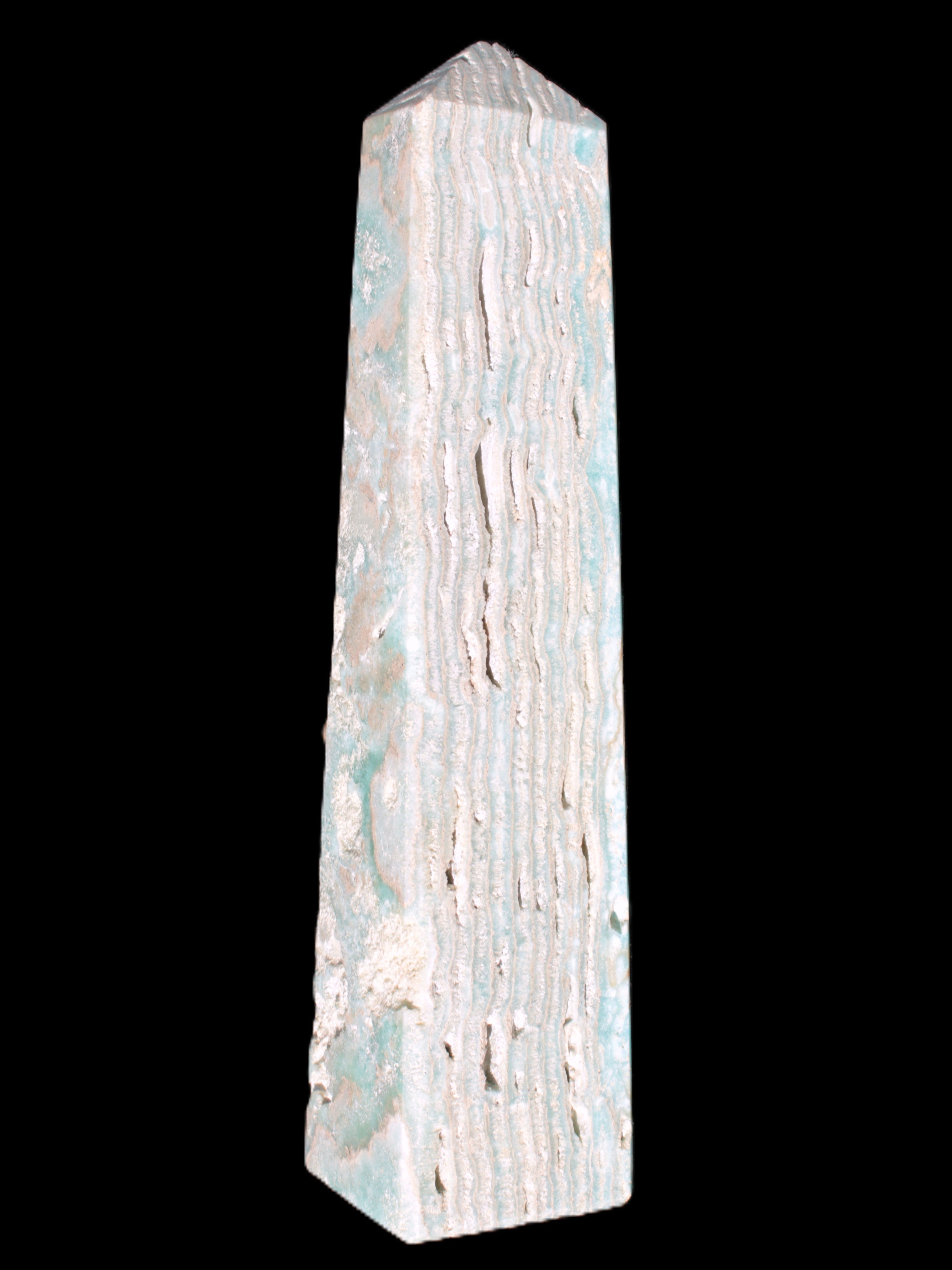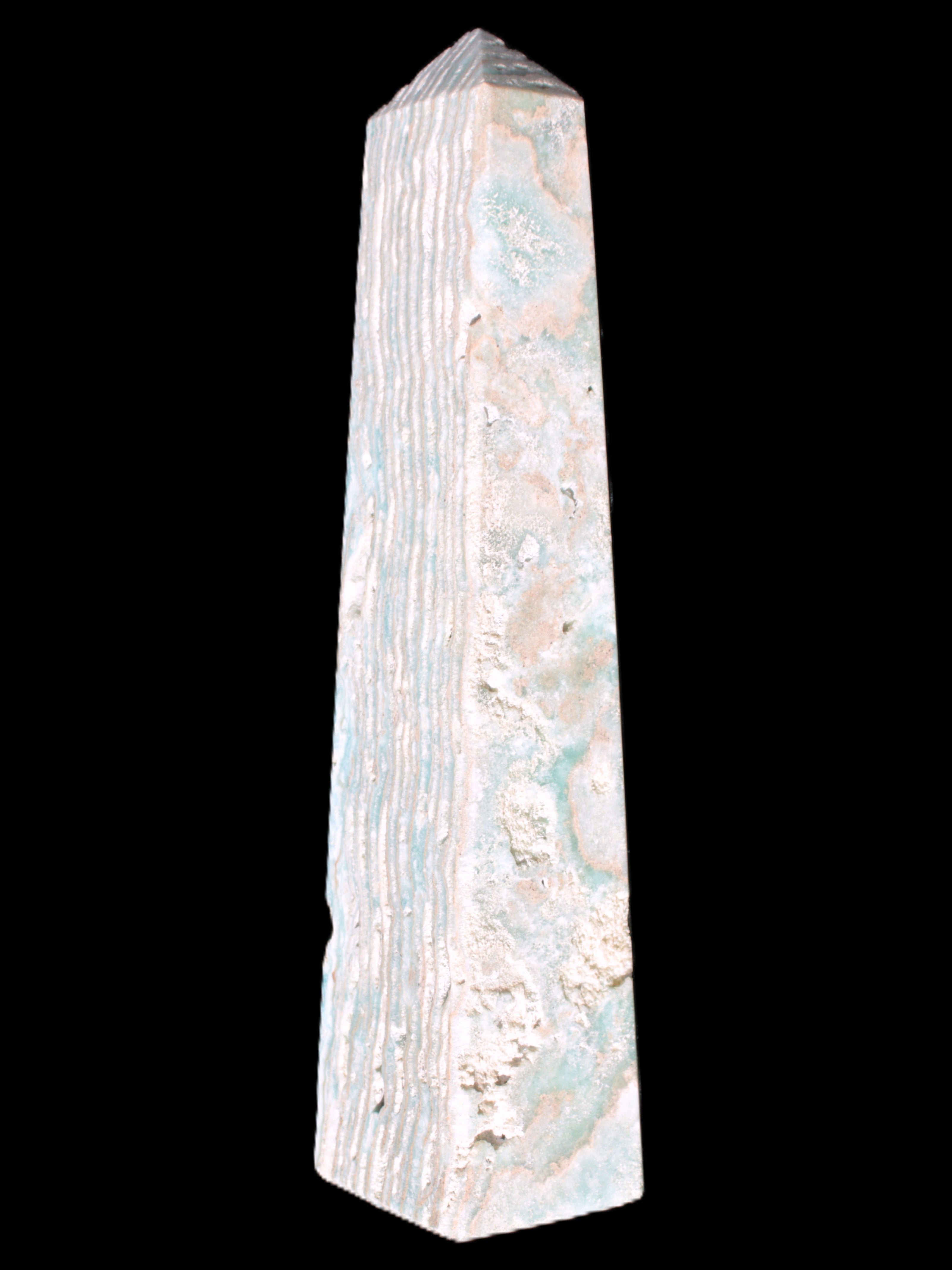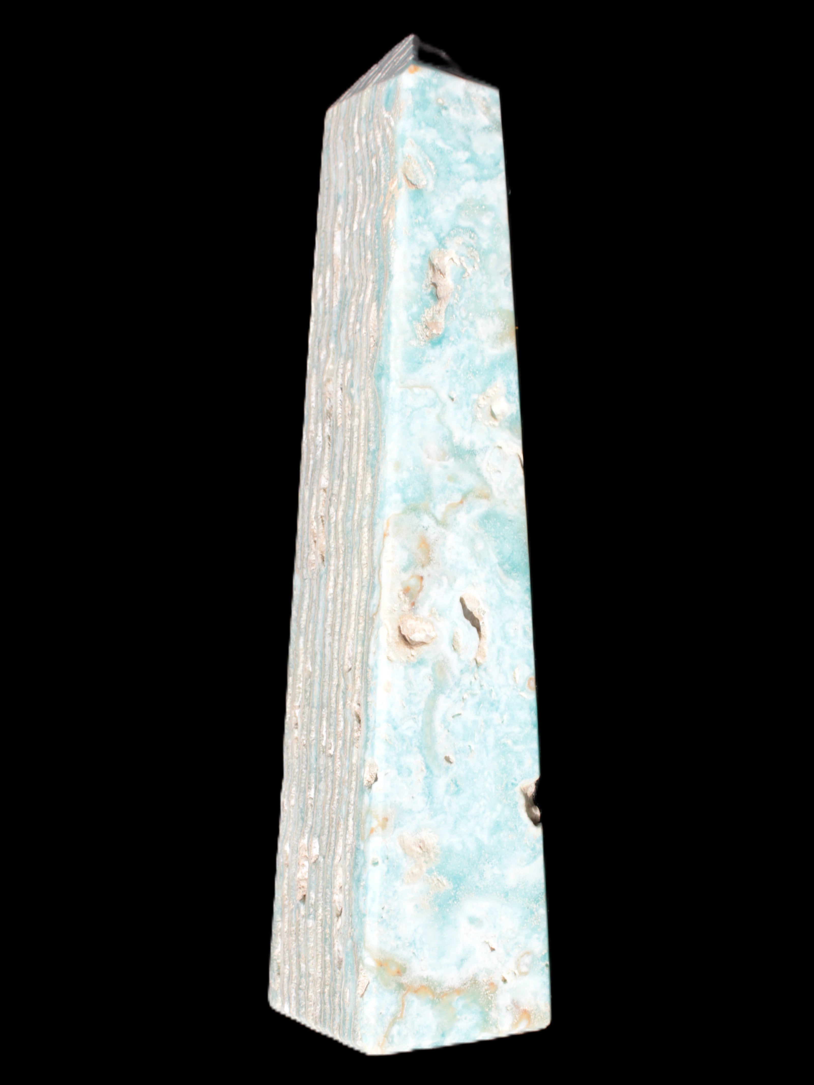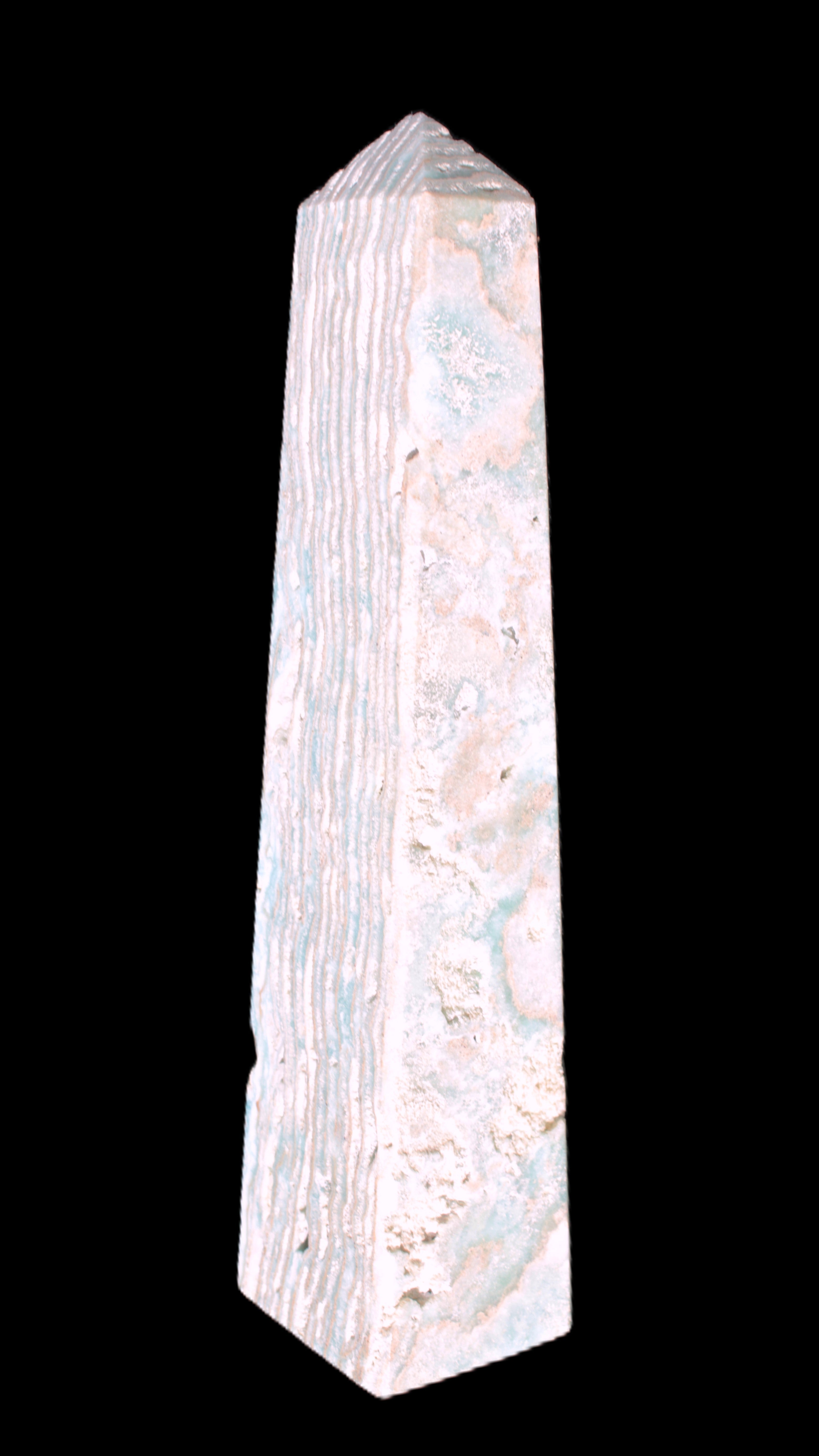 This Caribbean Calcite obelisk 95*40*44mm weighs 571g. This is a rectangular tower. It is 95mm tall and 44mm by 40mm wide at its base. Caribbean Calcite is a form of Aragonite.