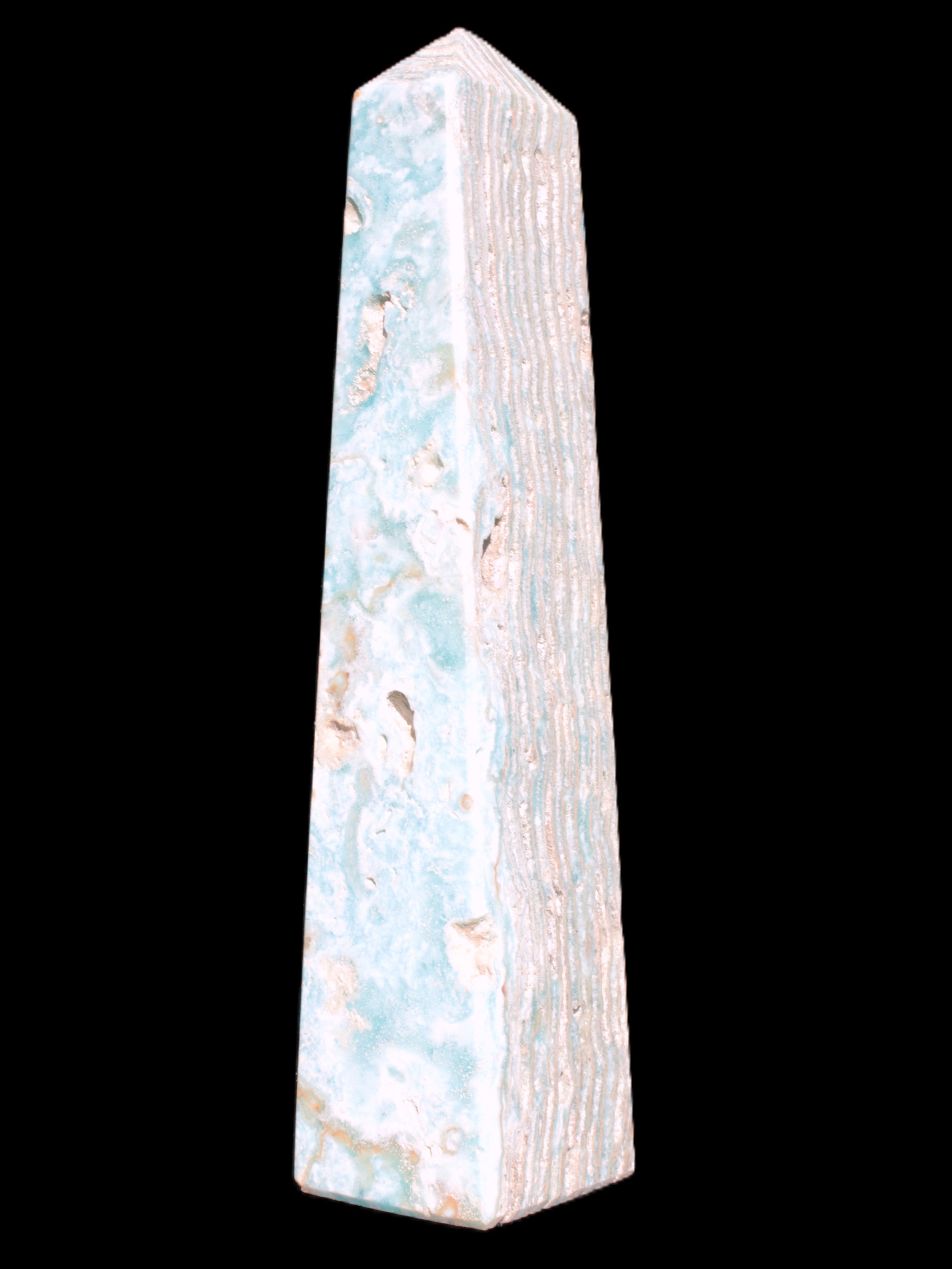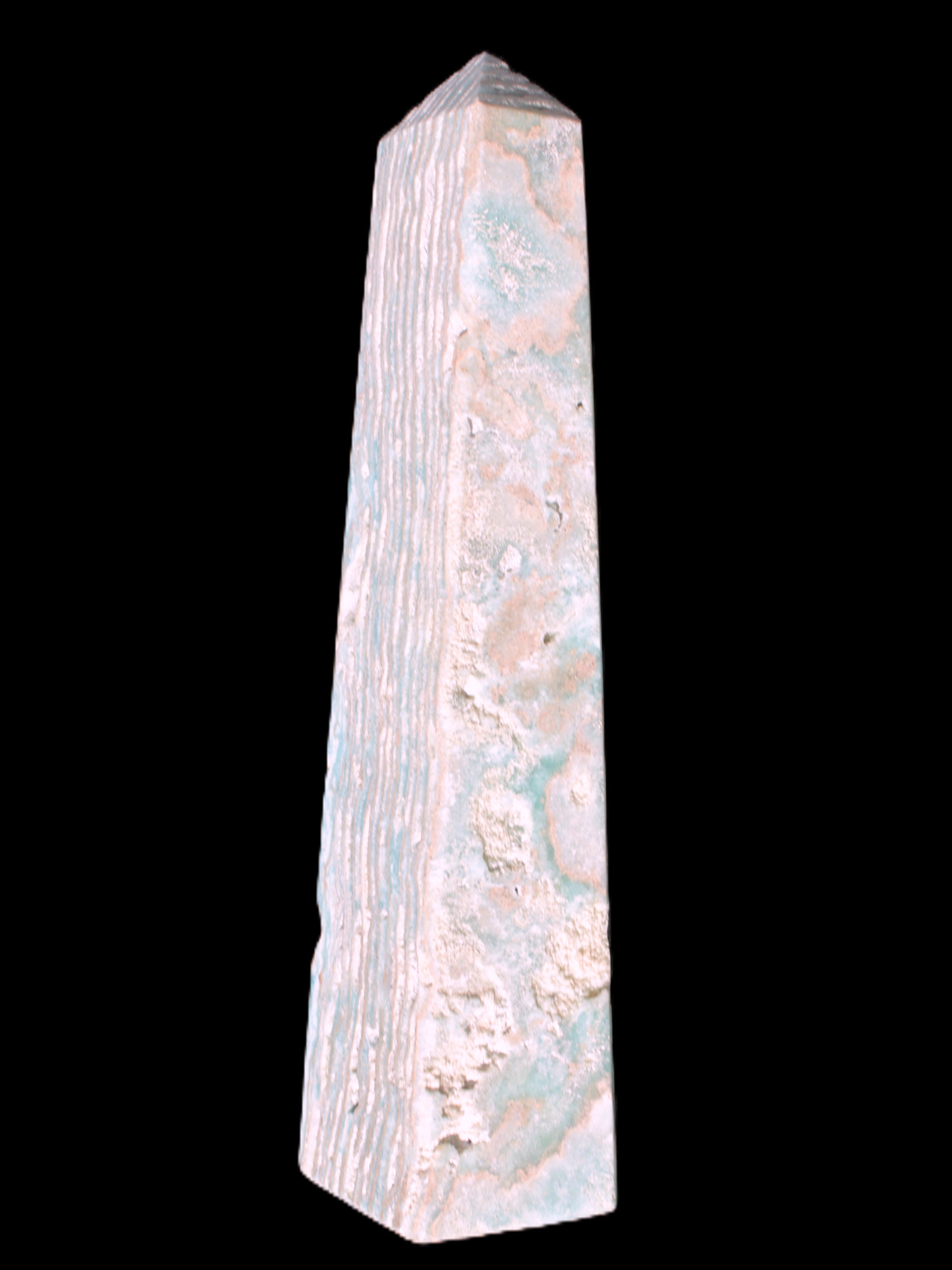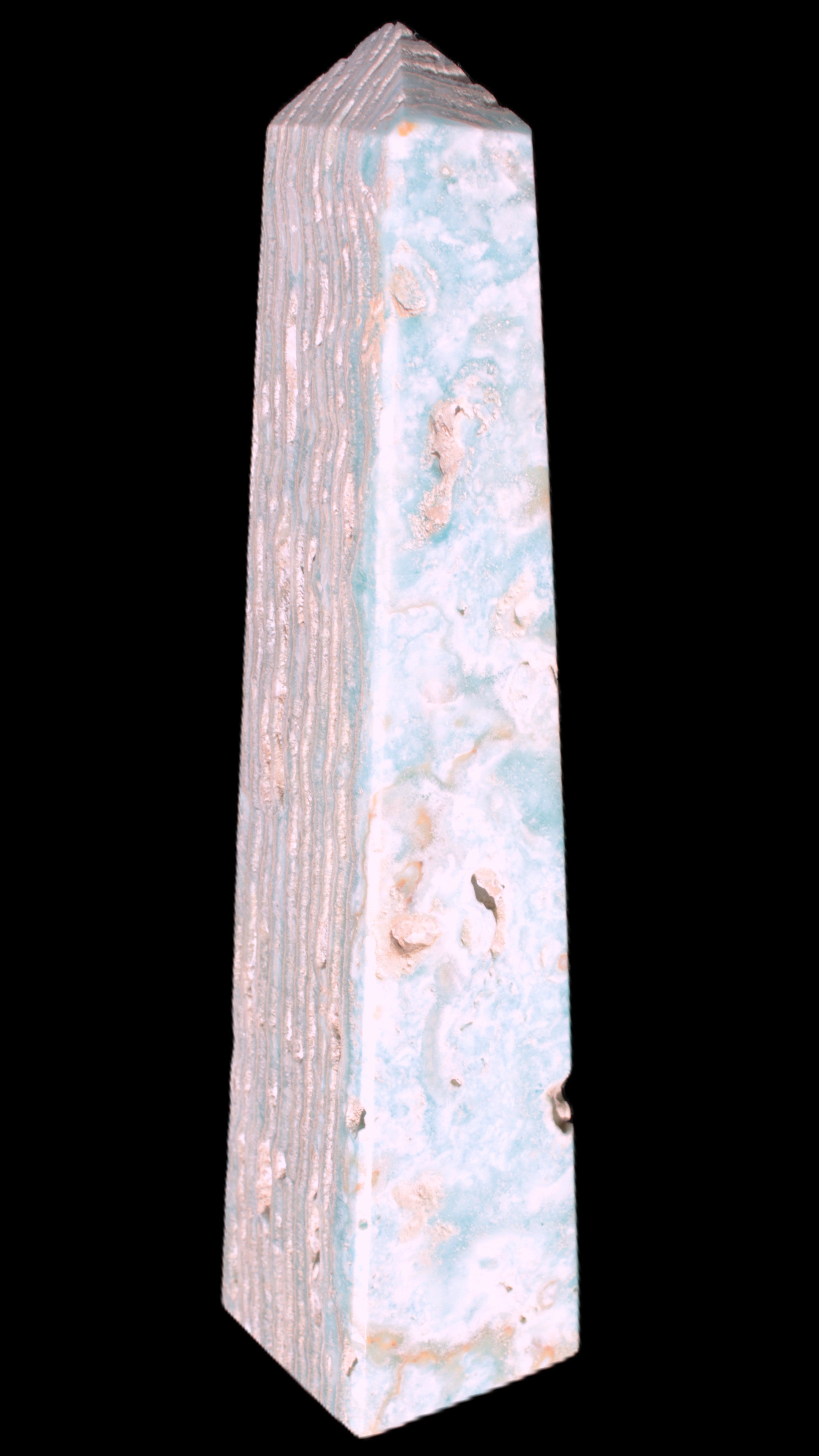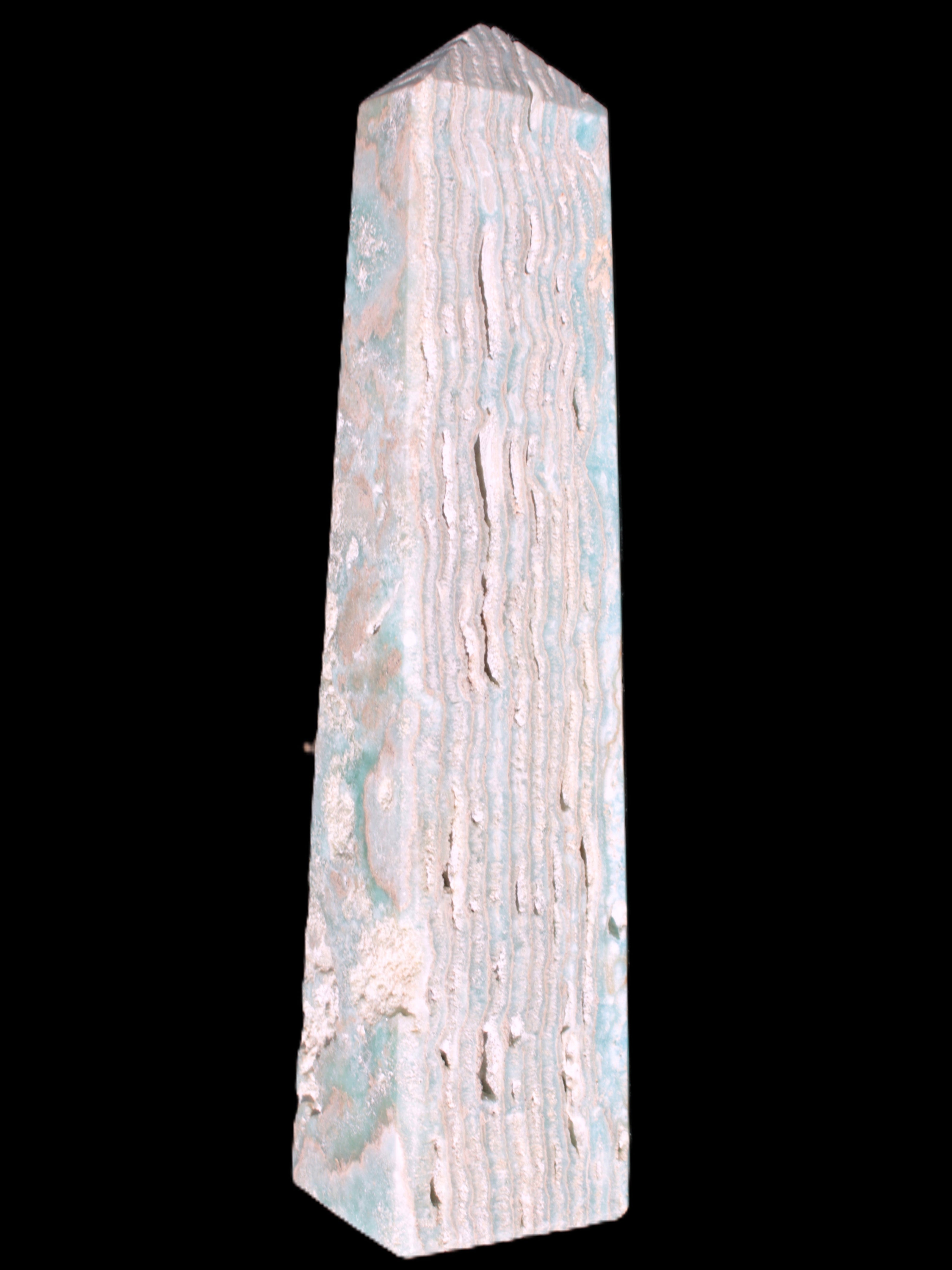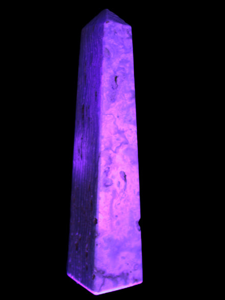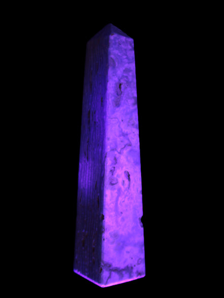 This Caribbean Calcite obelisk 95*40*44mm weighs 571g. This is a rectangular tower. It is 95mm tall and 44mm by 40mm wide at its base. Caribbean Calcite is a form of Aragonite.