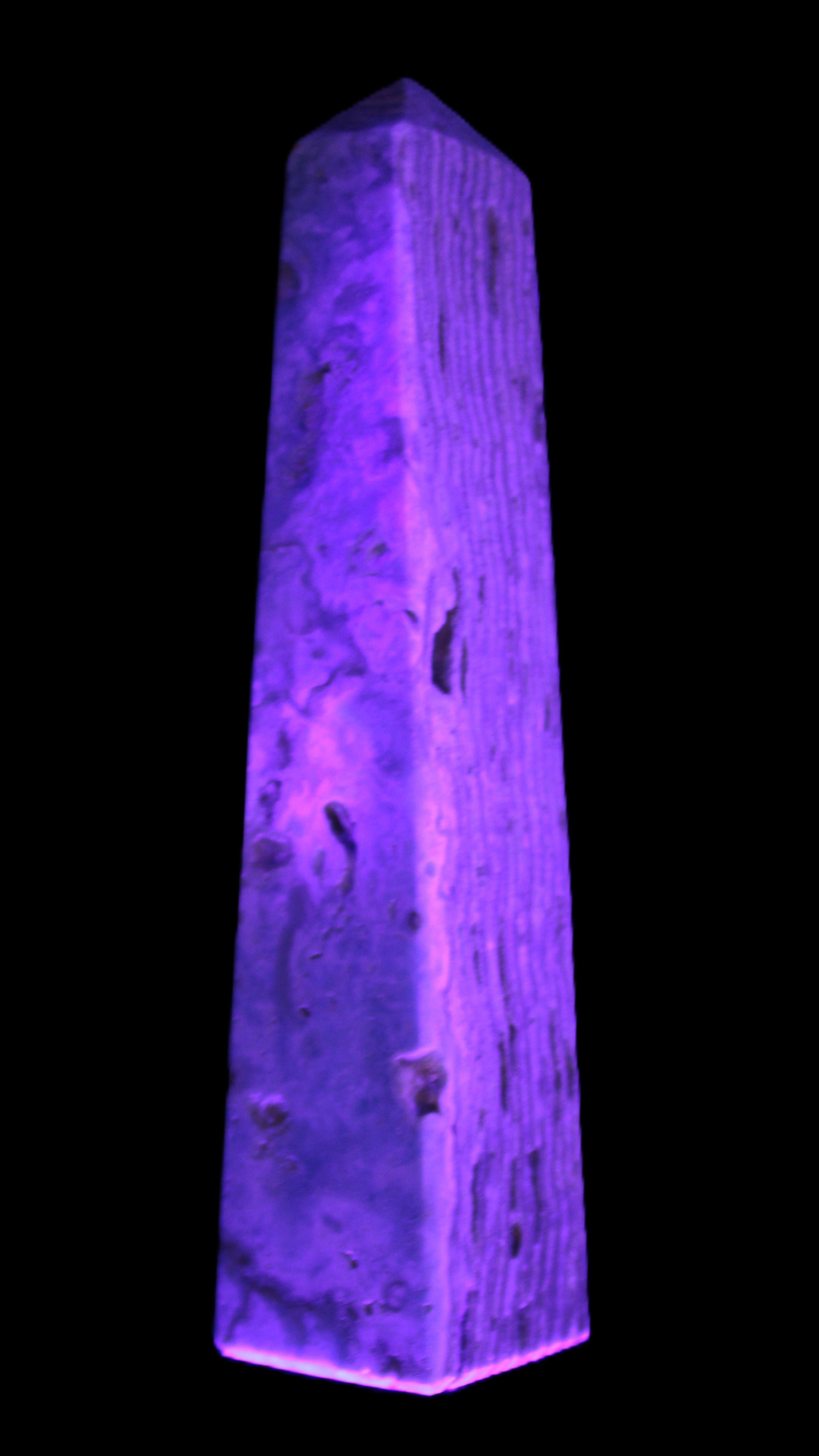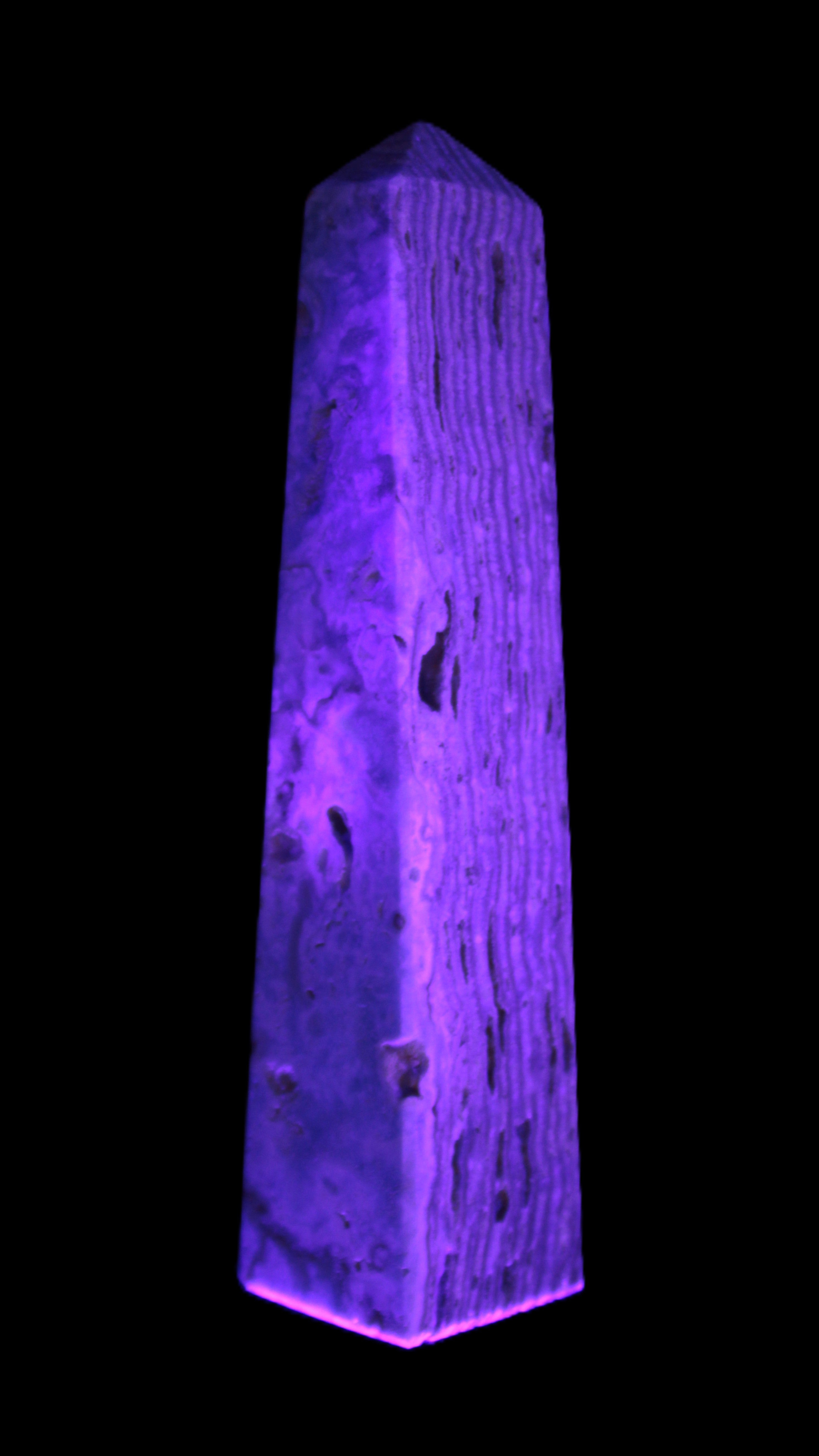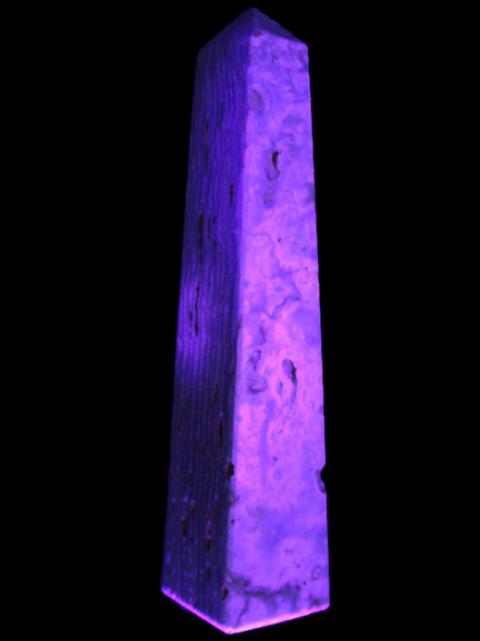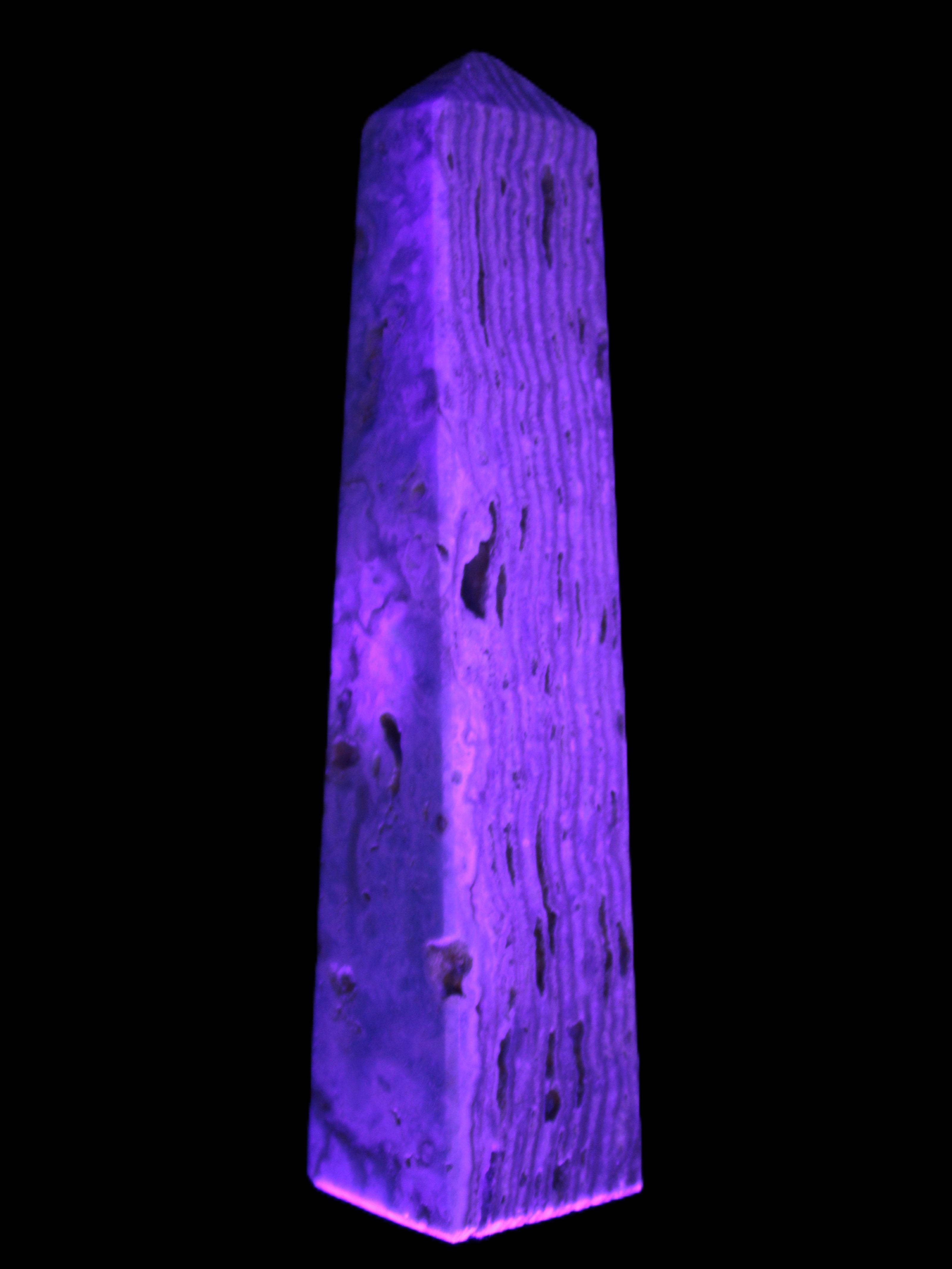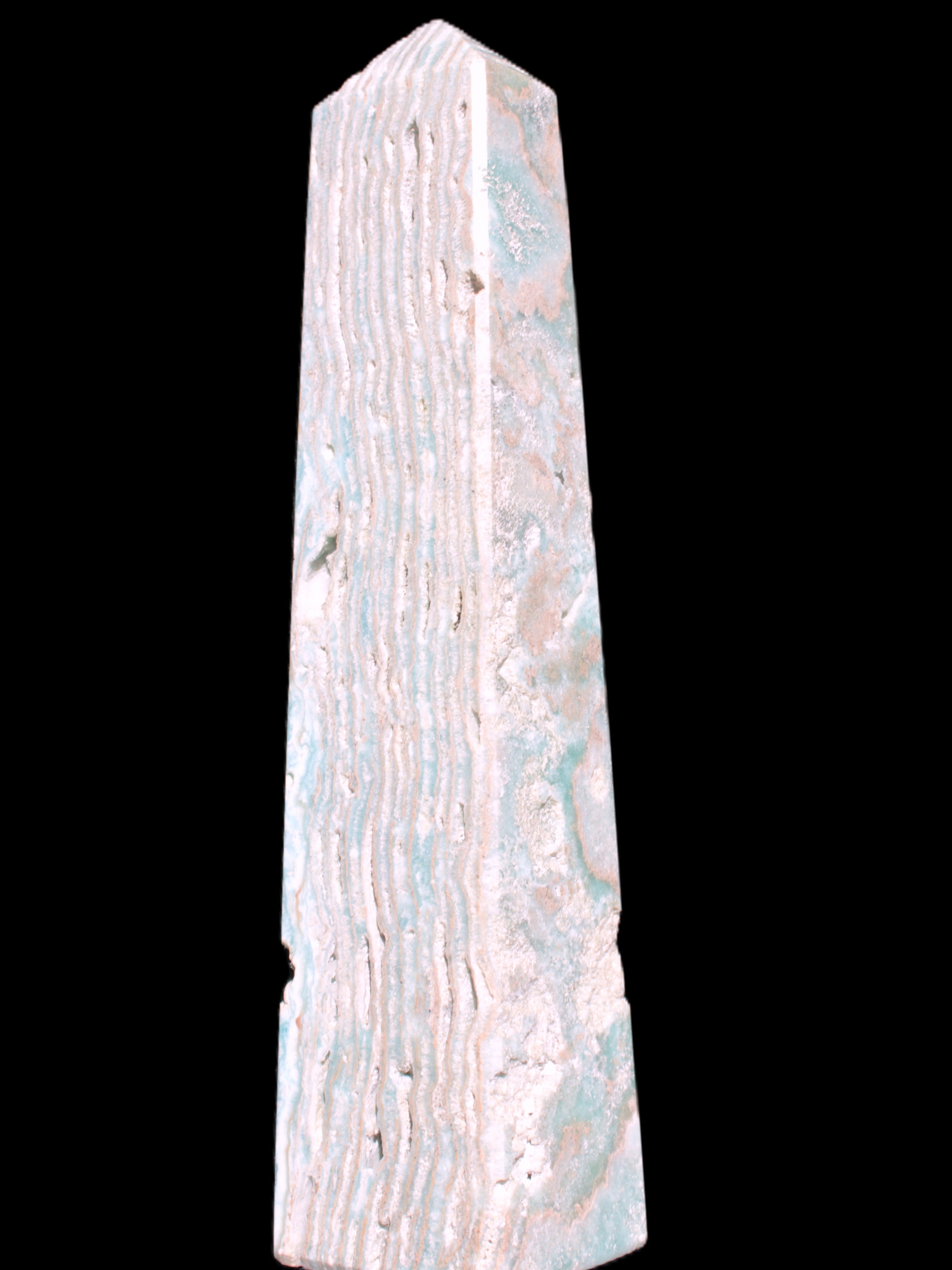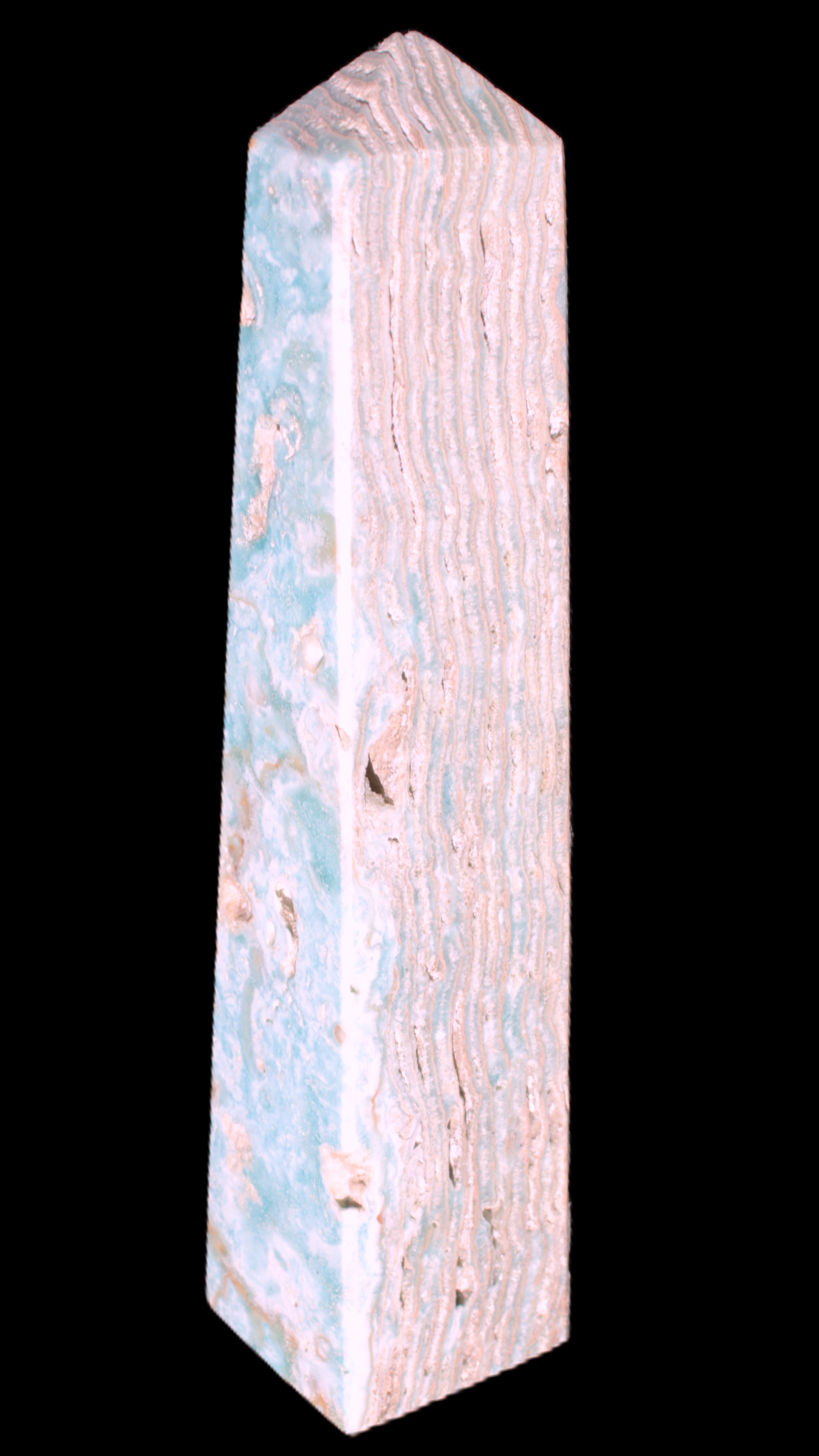 This Caribbean Calcite obelisk 95*40*44mm weighs 571g. This is a rectangular tower. It is 95mm tall and 44mm by 40mm wide at its base. Caribbean Calcite is a form of Aragonite.