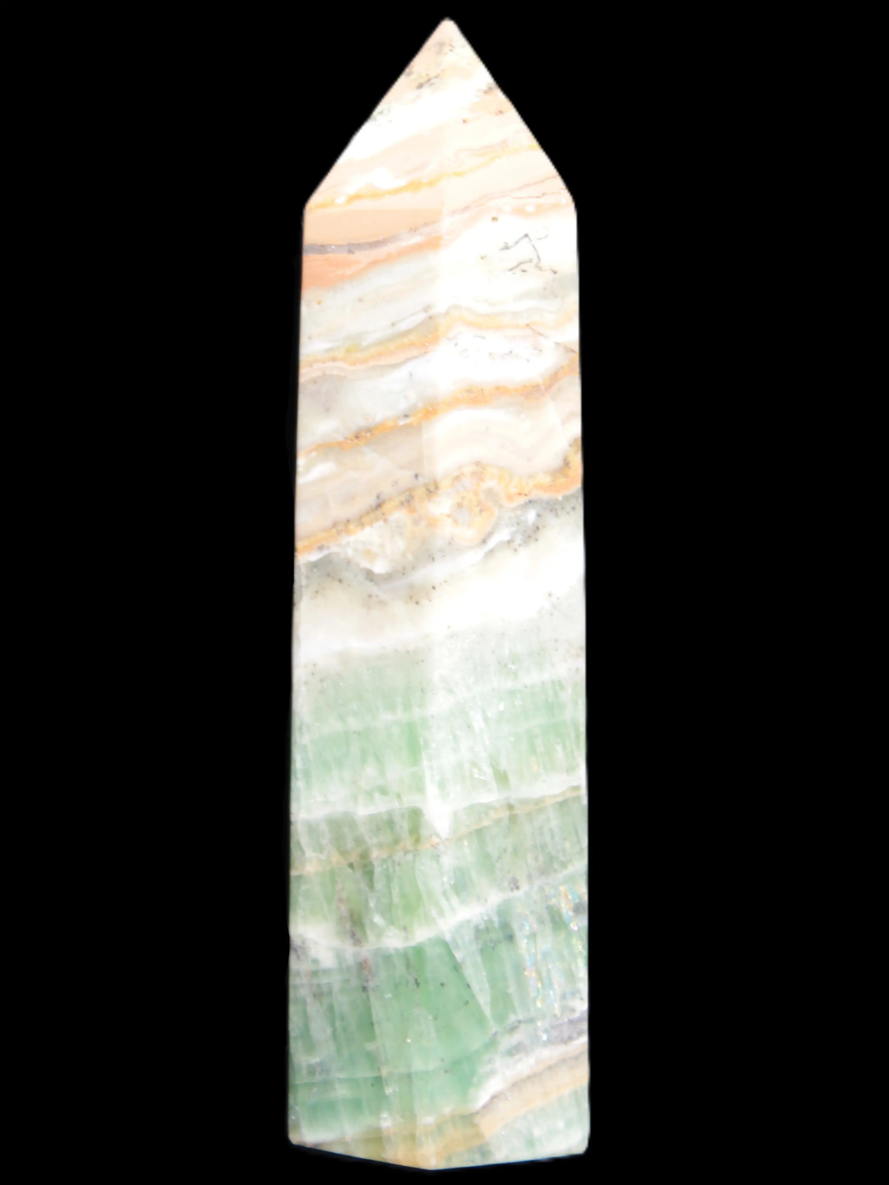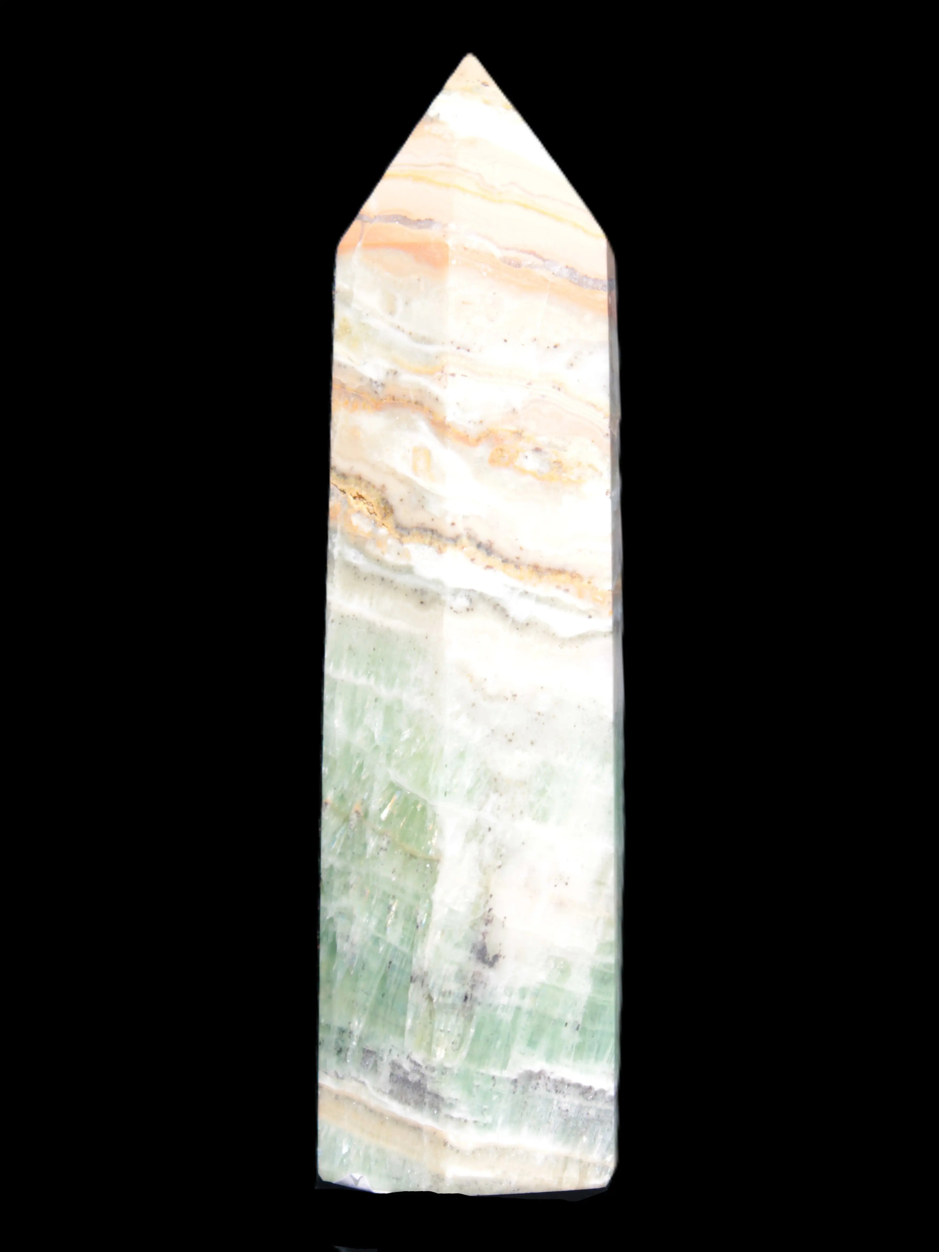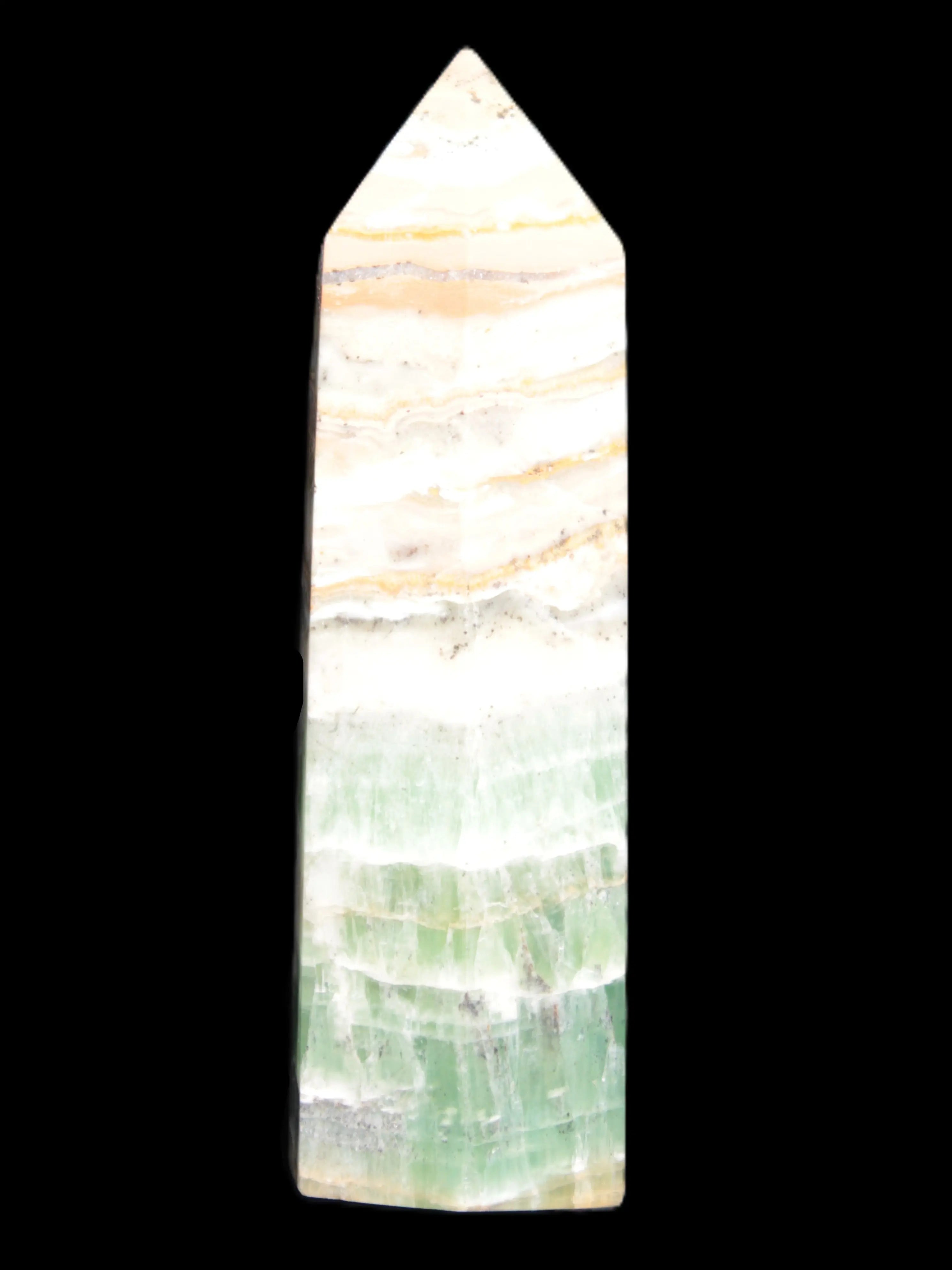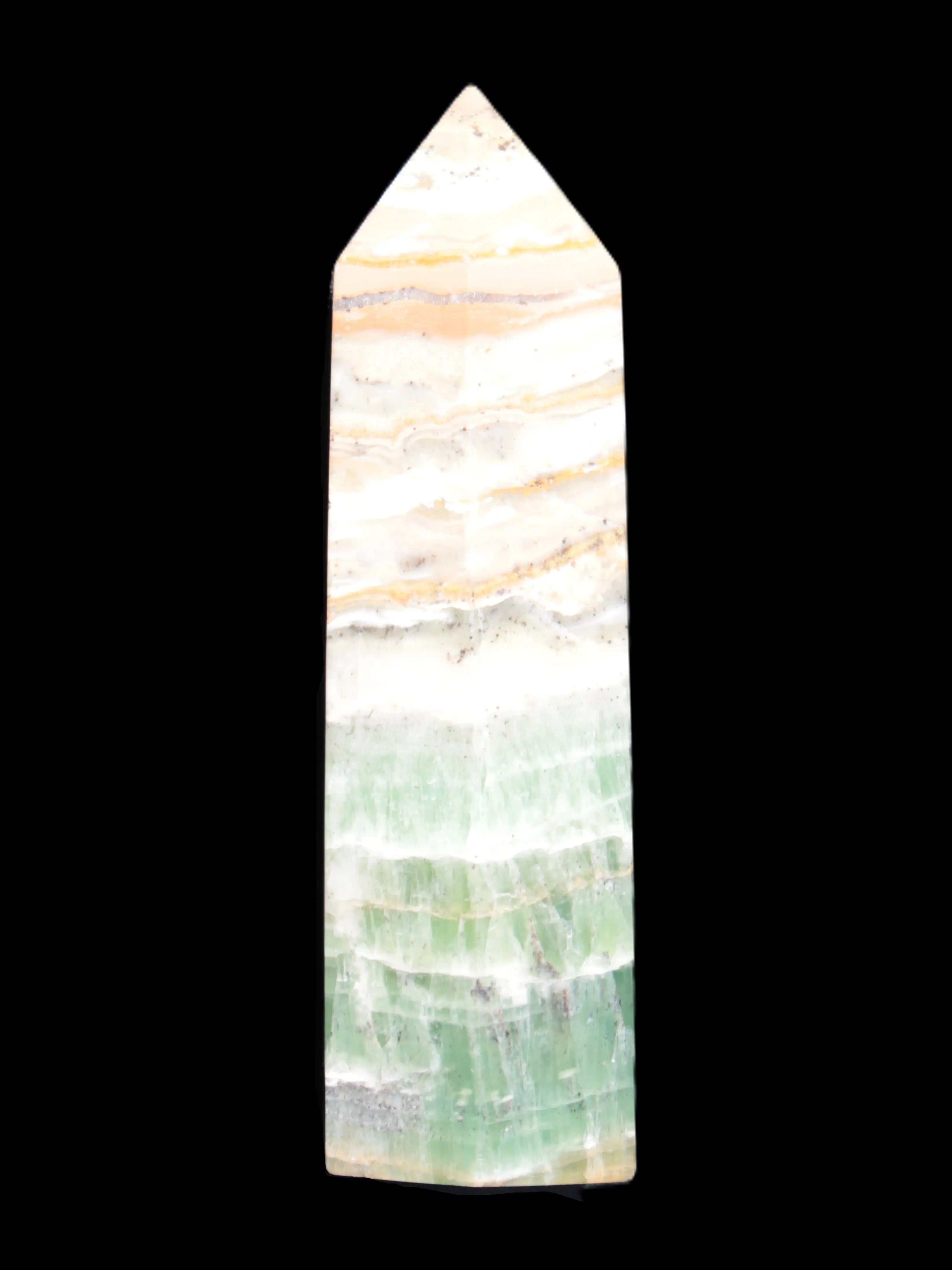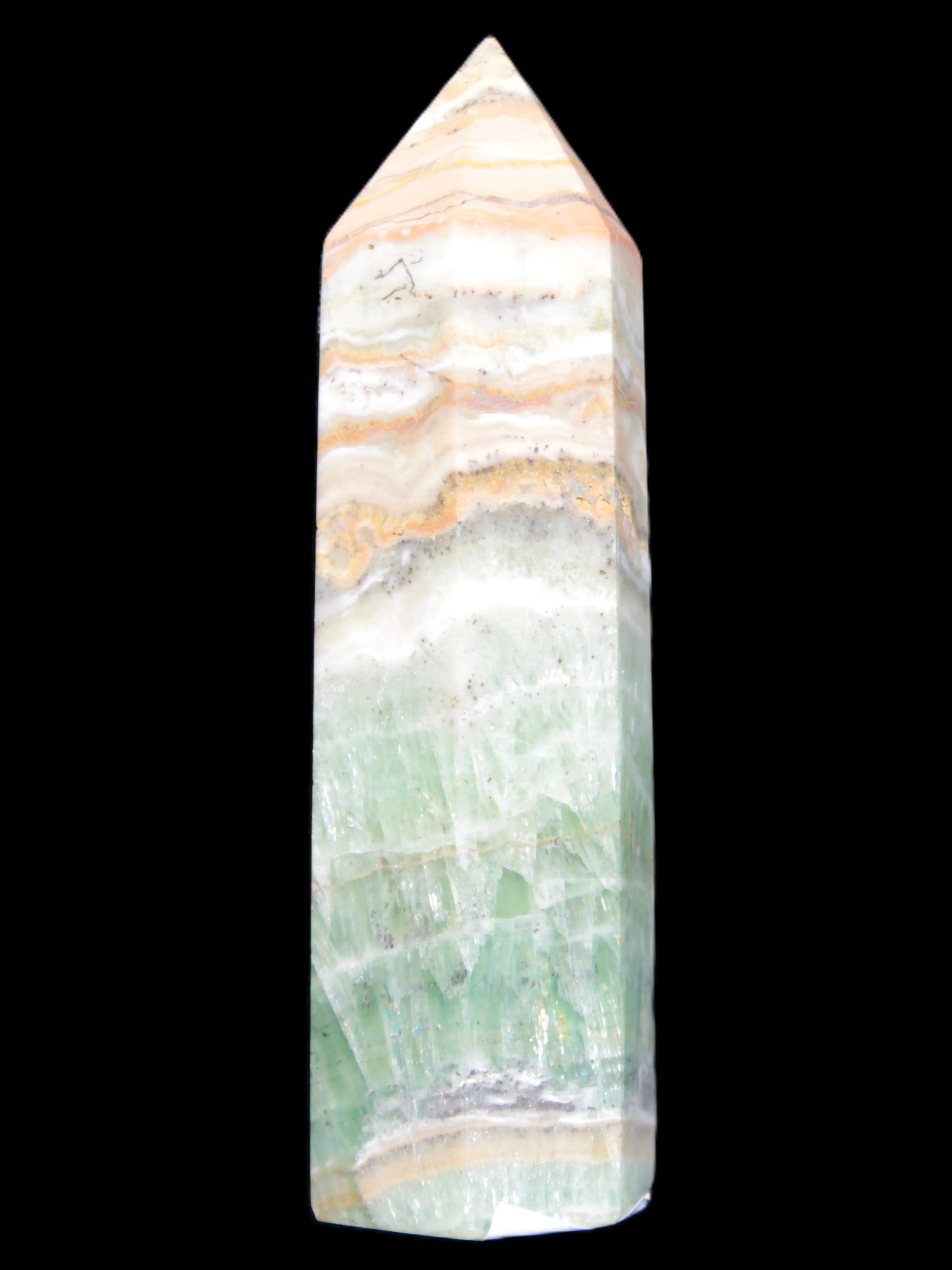 This Caribbean Calcite Pellucid wand 83mm weighs 83g. This wand is pellucid in its lower greenish formations. This term is used because these parts are quite clear and transparent, with the green tint lying deeper in the wand.