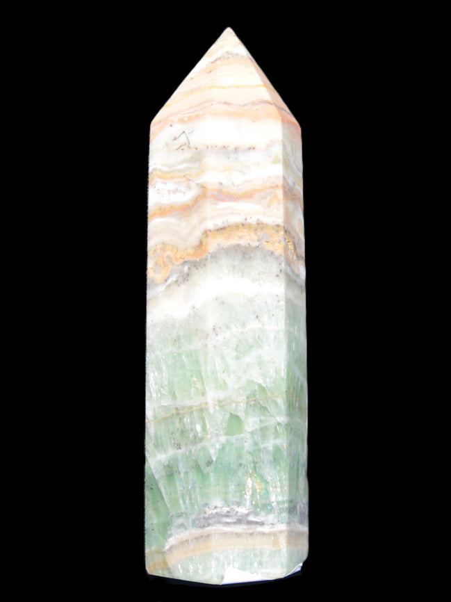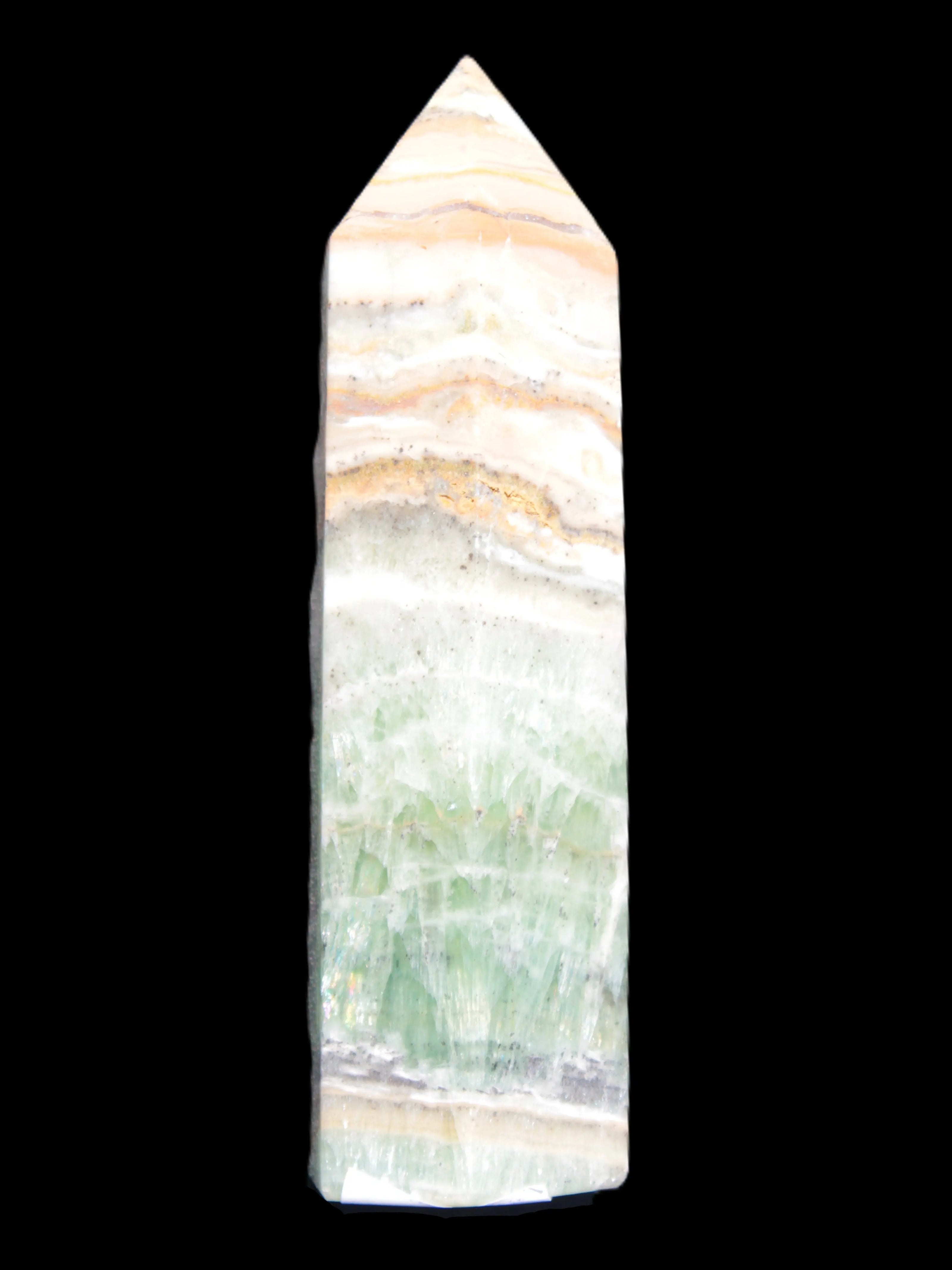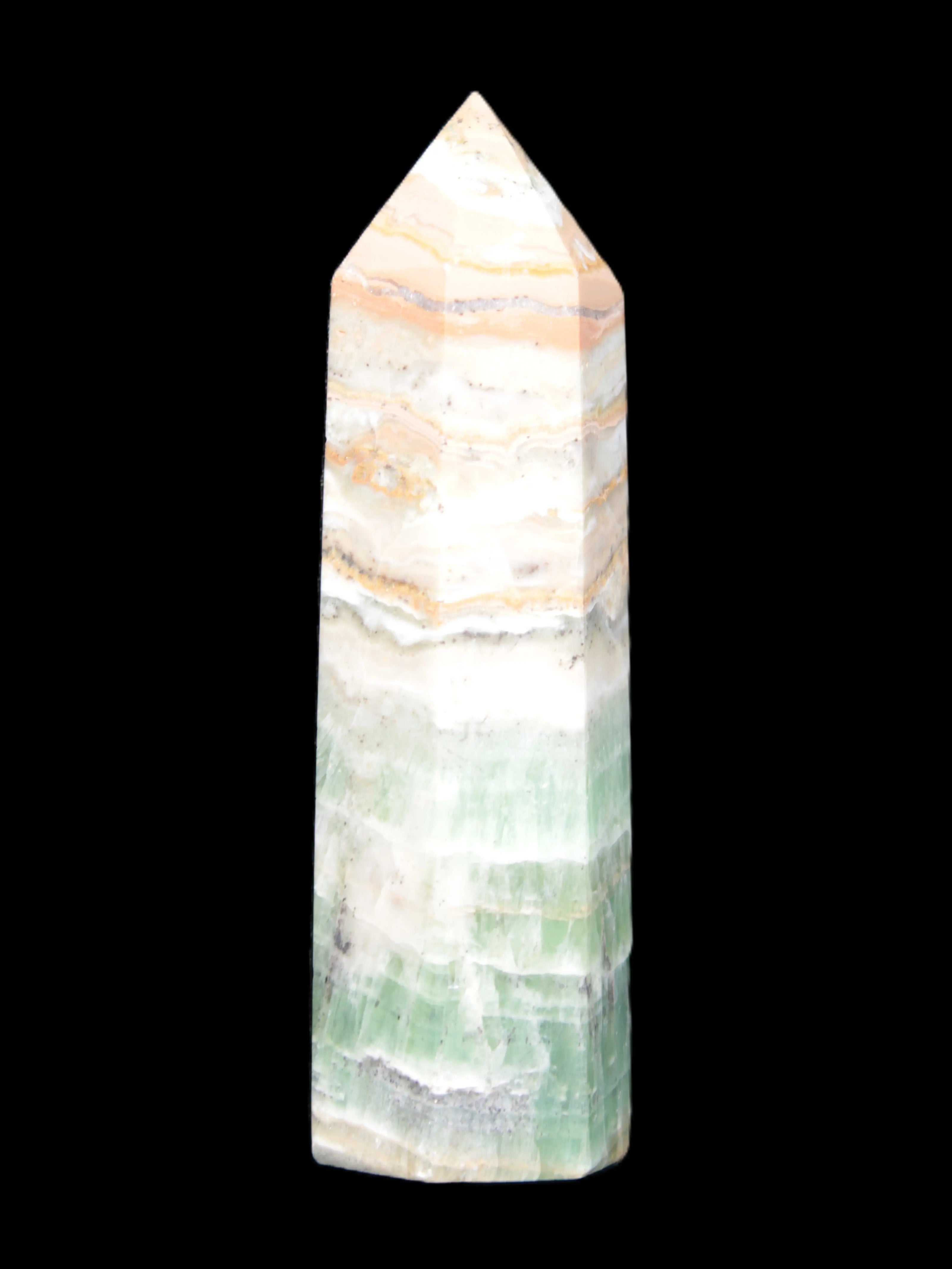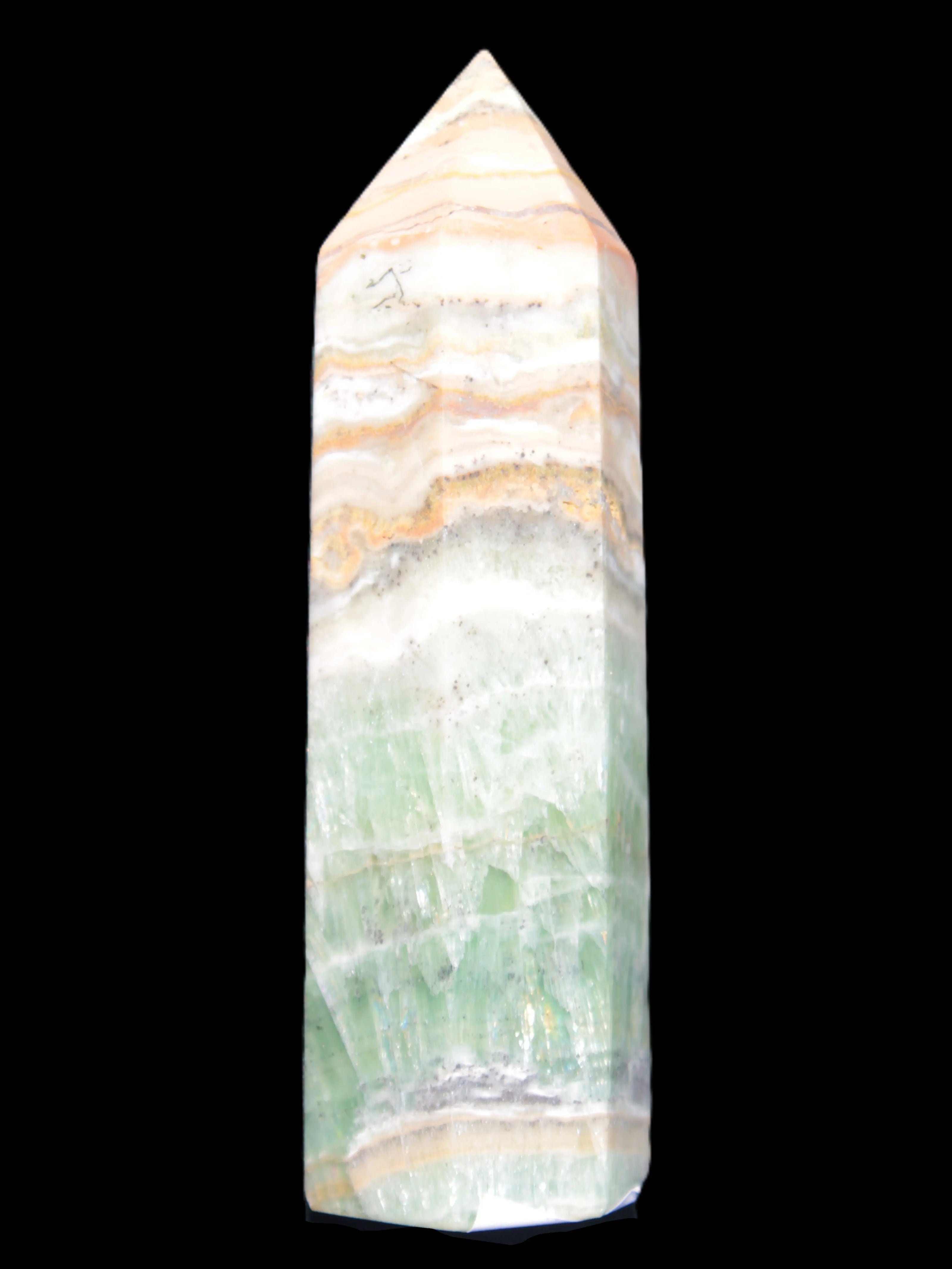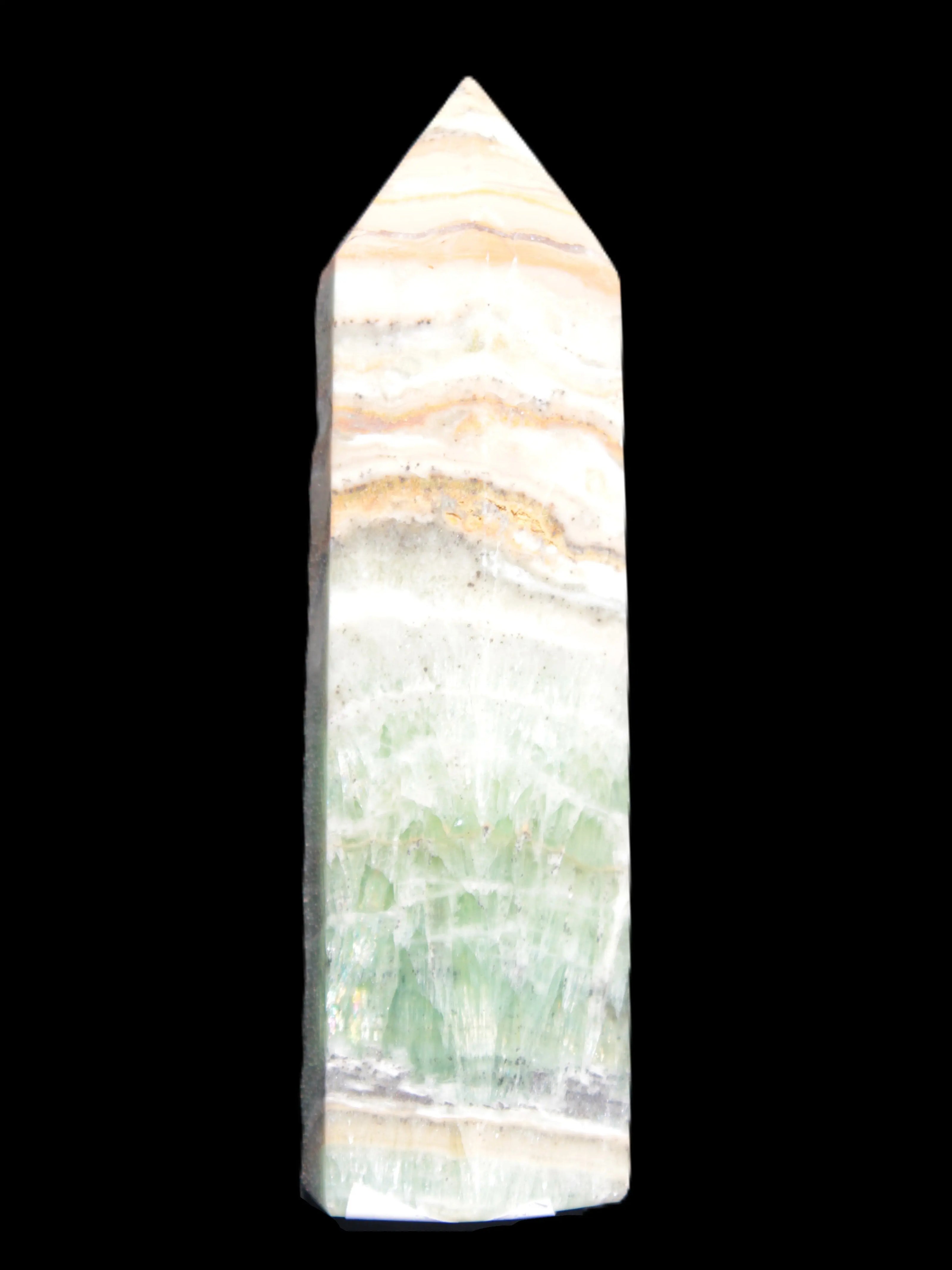 This Caribbean Calcite Pellucid wand 83mm weighs 83g. This wand is pellucid in its lower greenish formations. This term is used because these parts are quite clear and transparent, with the green tint lying deeper in the wand.