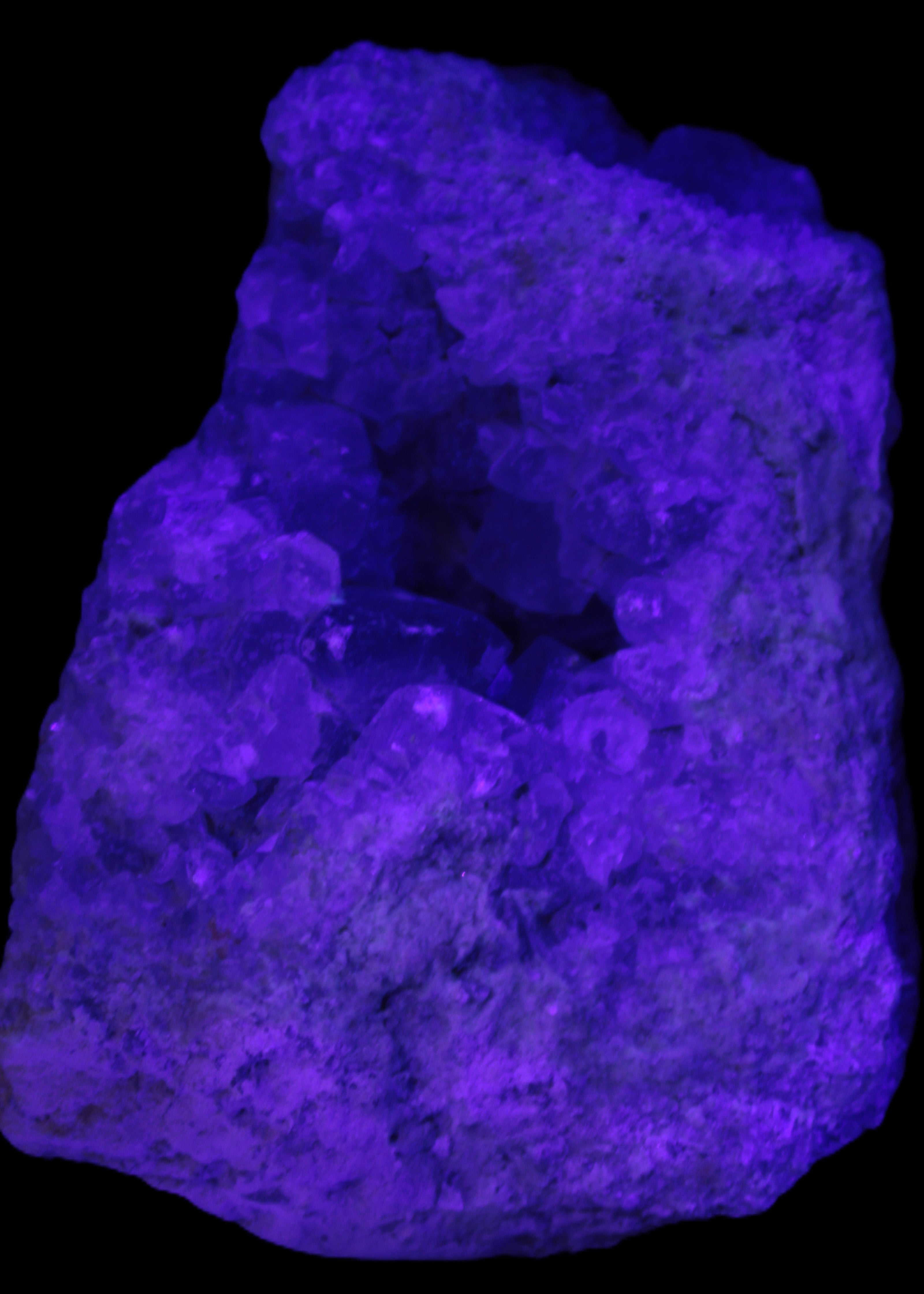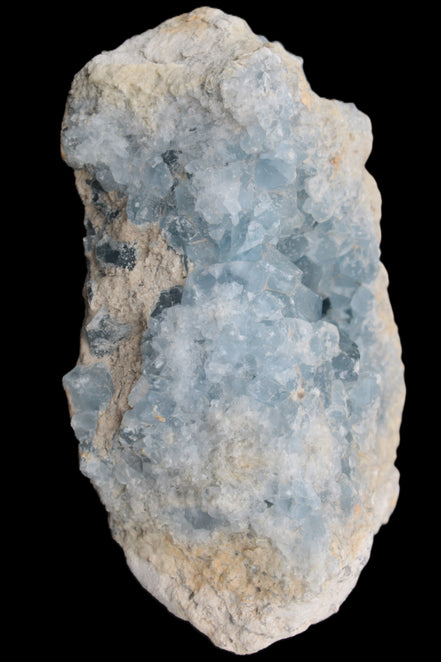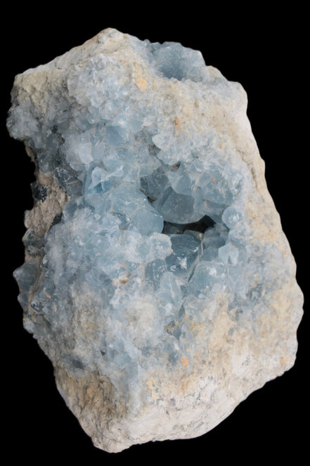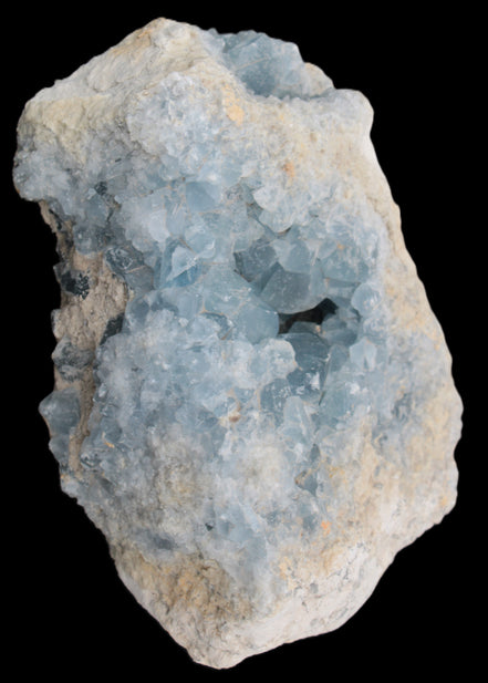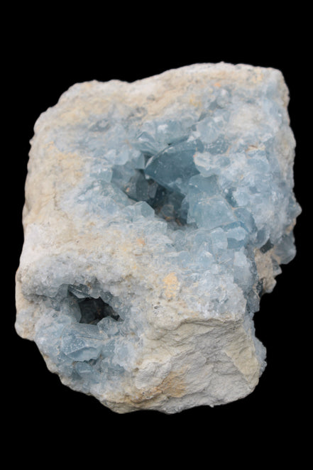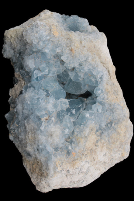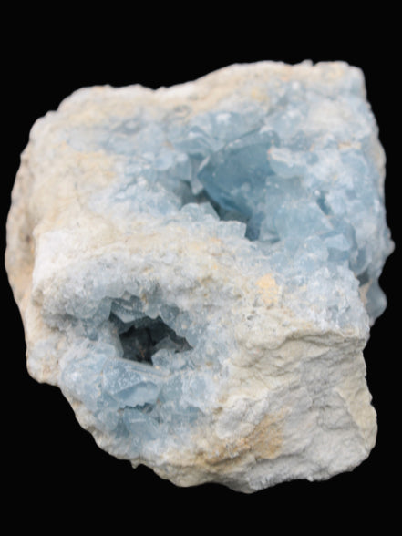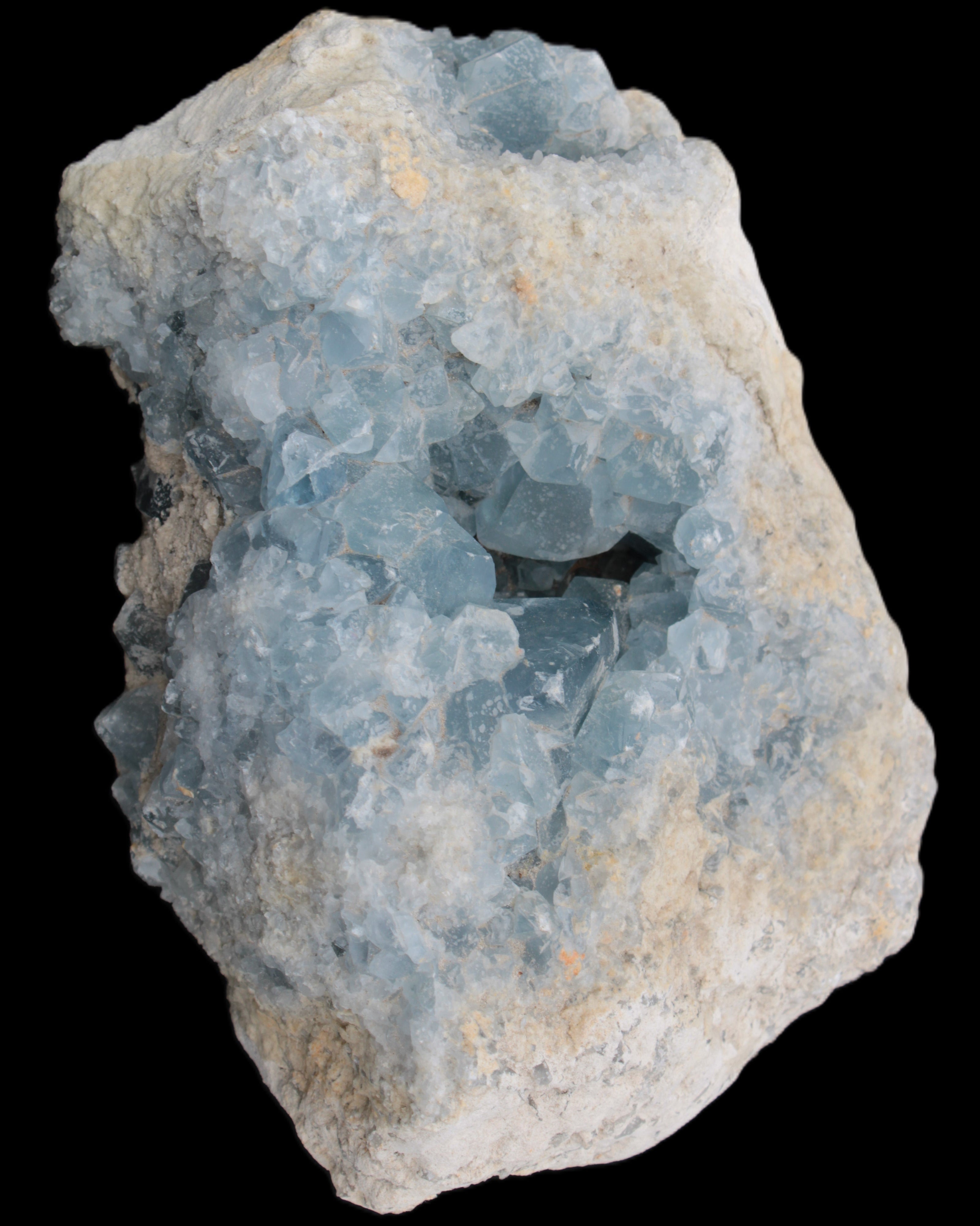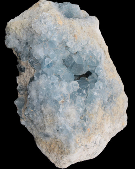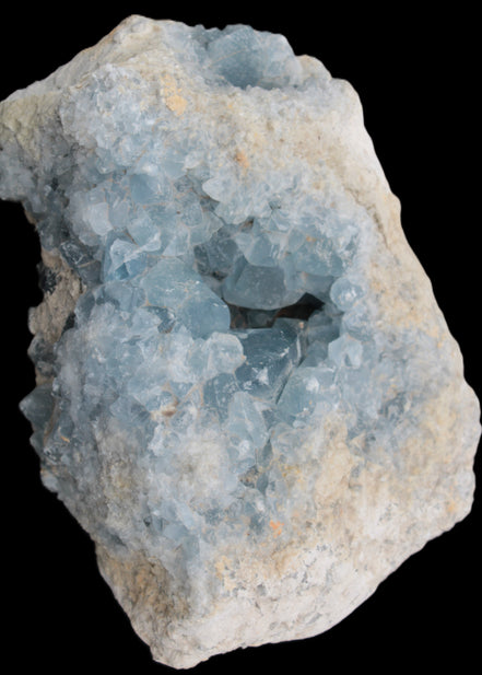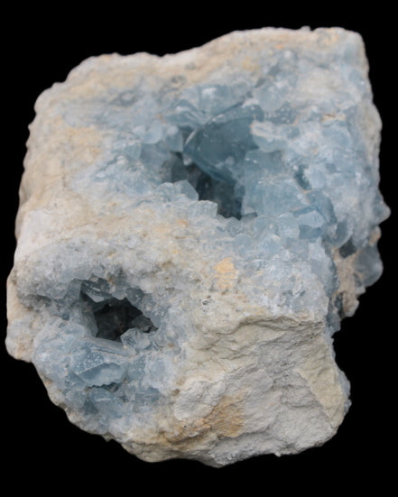 This Celestite geode cluster 3840g is a huge example of this wonderful crystal.  It has two openings into the inner cave of this geode. The surrounding matrix is UV reactive and goes yellow. The Celestite reacts too.